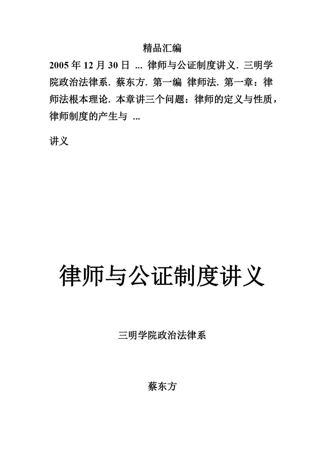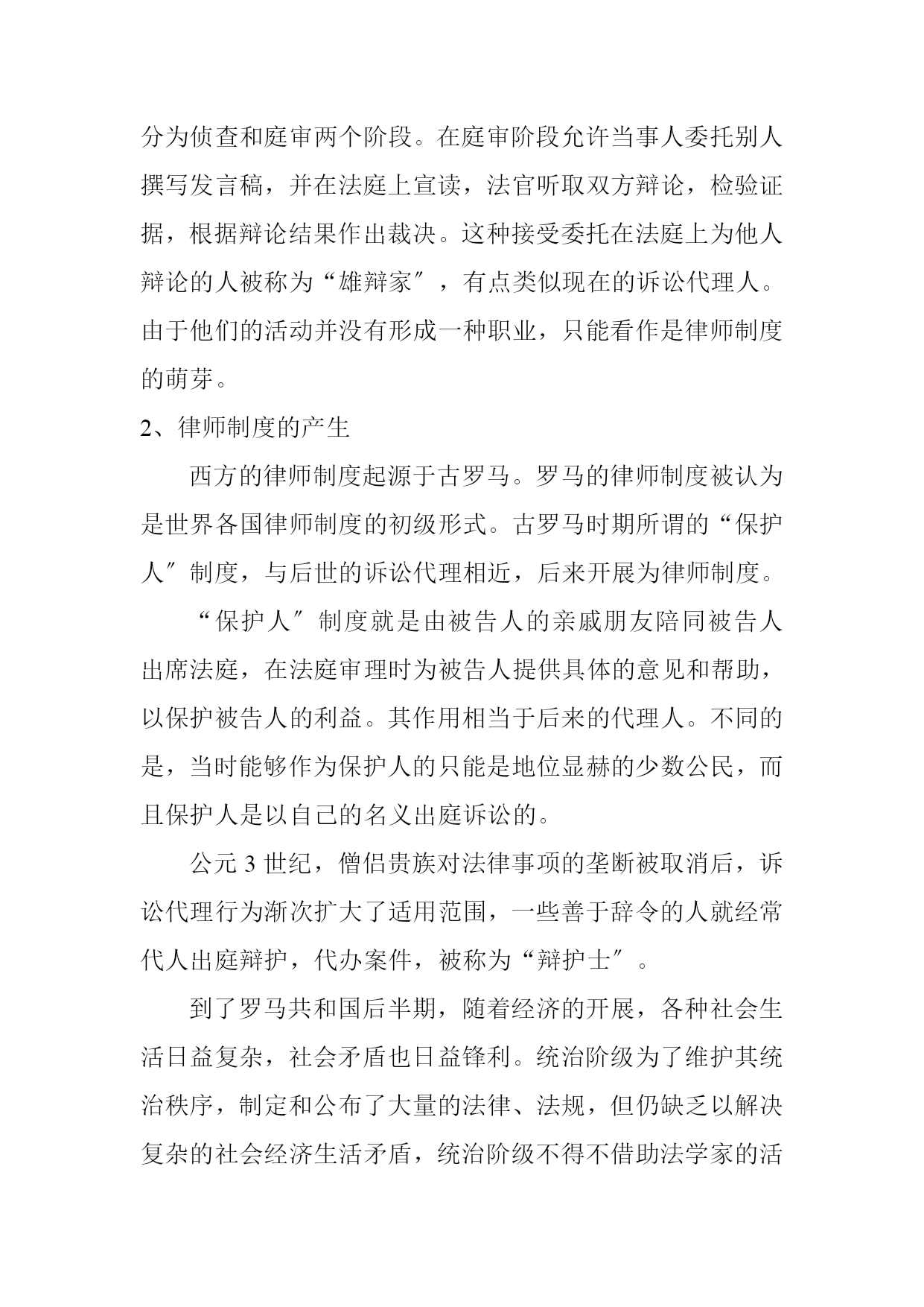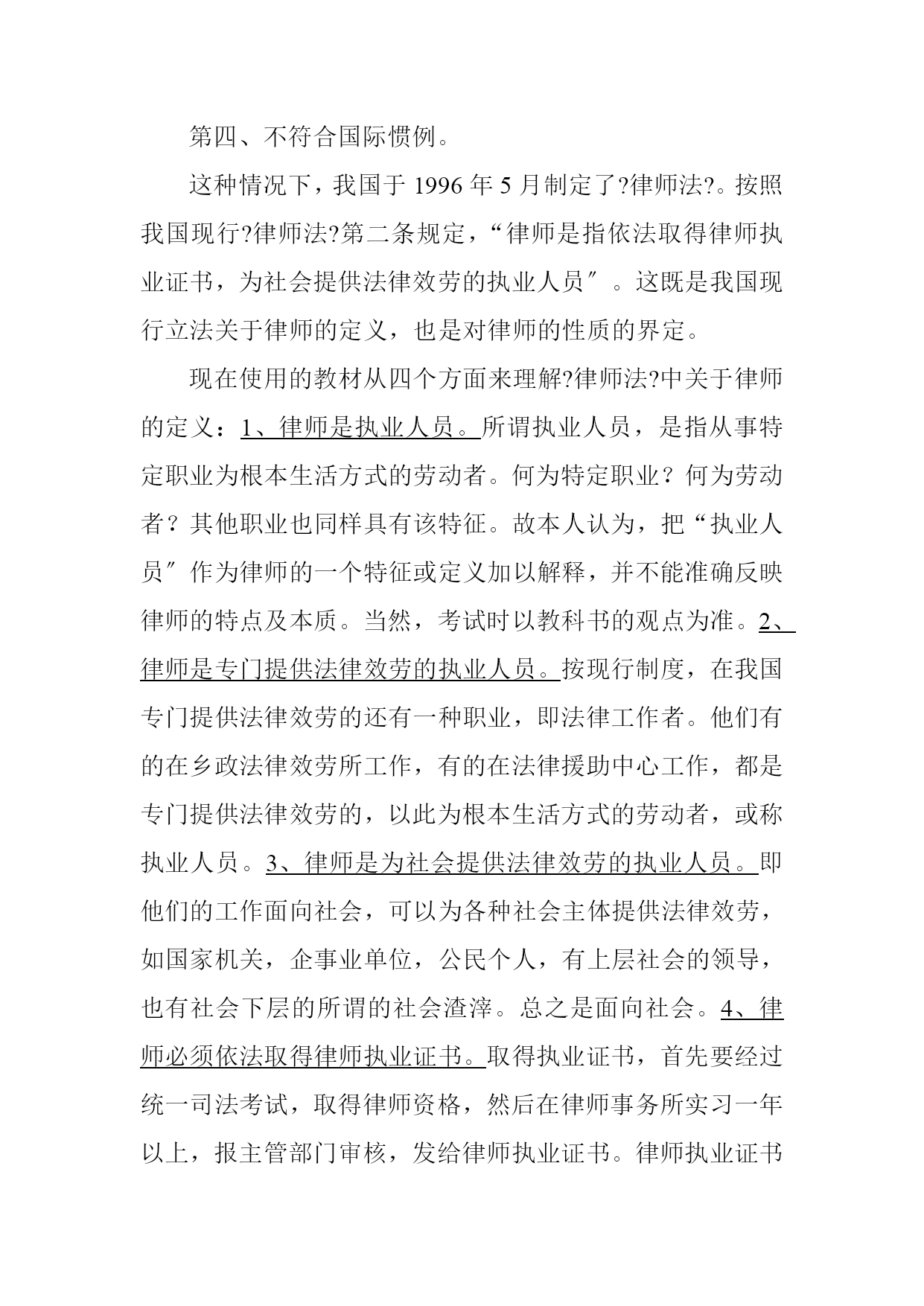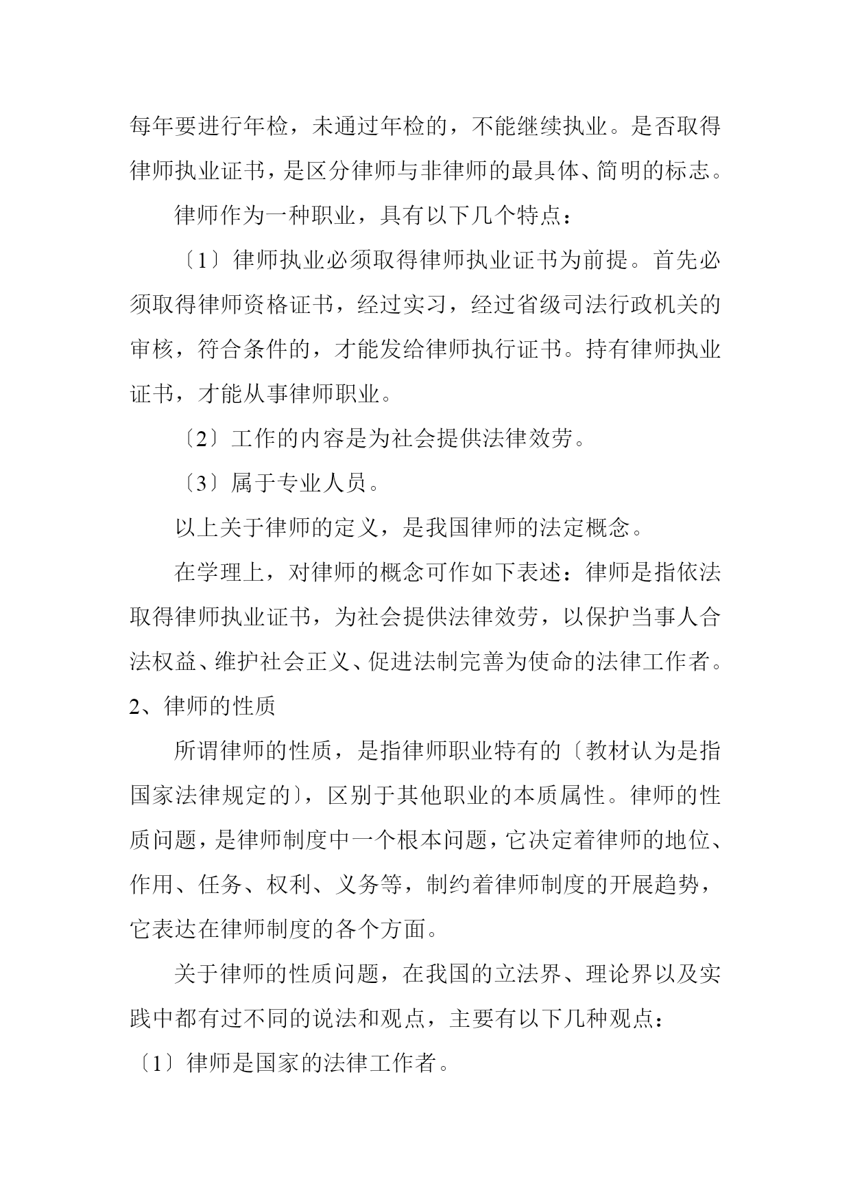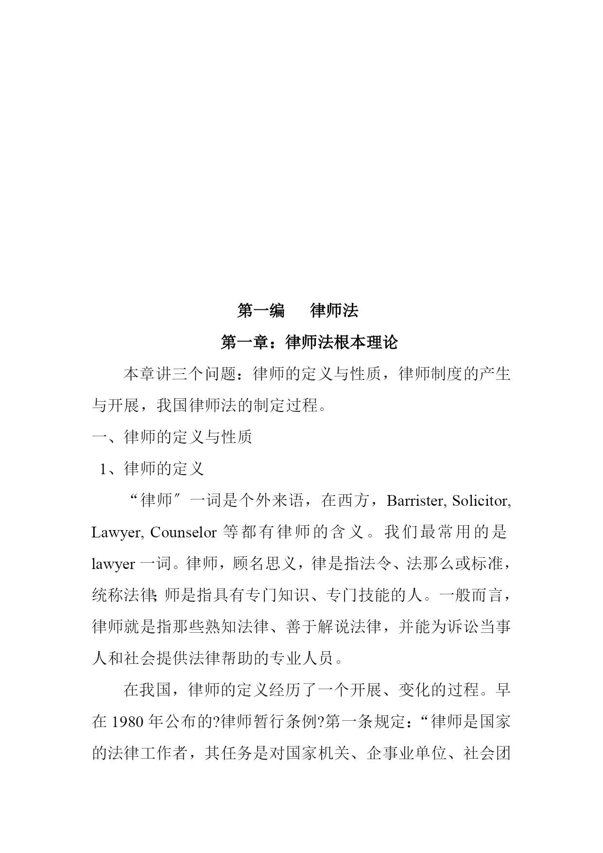 律师与公证制度讲义【完整版】(文档可以直接使用,也可根据实际需要修订后使用,可编辑放心下载)精品汇编2005年12月30日...律师与公证制度讲义.三明学院政治法律系.蔡东方.第一编律师法.第一章:律师法根本理论.本章讲三个问题:律师的定义与性质,律师制度的产生与...讲义律师与公证制度讲义三明学院政治法律系蔡东方第一编律师法第一章:律师法根本理论本章讲三个问题:律师的定义与性质,律师制度的产生与开展,我国律师法的制定过程。一、律师的定义与性质1、律师的定义“律师〞一词是个外来语,在西方,Barrister,Solicitor,Lawyer,Counselor等都有律师的含义。我们最常用的是lawyer一词。律师,顾名思义,律是指法令、法那么或标准,统称法律;师是指具有专门知识、专门技能的人。一般而言,律师就是指那些熟知法律、善于解说法律,并能为诉讼当事人和社会提供法律帮助的专业人员。在我国,律师的定义经历了一个开展、变化的过程。早在1980年公布的?律师暂行条例?第一条规定:“律师是国家的法律工作者,其任务是对国家机关、企事业单位、社会团体、人民公社和公民提供法律效劳,以维护法律的正确实施,维护国家、集体的利益和公民的合法权益。〞按照这一规定,律师的定义包含以下含义:〔1〕律师是国家公职人员。律师的工作性质,实际上肩负着国家赋予的使命。律师应当站在公正的立场上,从维护法律的正确实施出发,来维护当事人的合法权益,律师是国家政治、经济领域和社会开展中一支维护法制的重要力量。〔2〕律师是司法行政机关的内部编制人员。律师工作为非营利性的,律师收费统一上交国库,律师经费列入国家事业预算。在律师制度刚刚恢复期间,将律师的性质界定为“国家法律工作者〞,对律师制度的建立和开展,对于健全社会主义法制有着重要的历史意义。但随着经济、政治体制改革和对外开放的不断深入,特别是随着社会主义市场经济的建立和开展,律师的国家法律工作者性质越来越显示出在律师制度开展战略上的局限性,如不加以改变,将影响律师事业的开展。第一、这一定义难以表达律师向社会提供法律效劳的职业特点。第二、不利于律师管理体制的完善,不符合市场经济的运作规那么。第三、合作律师事务所的大量出现,个人律师事务所也产生了,原有的管理模式不适应形势的需要。第四、不符合国际惯例。这种情况下,我国于1996年5月制定了?律师法?。按照我国现行?律师法?第二条规定,“律师是指依法取得律师执业证书,为社会提供法律效劳的执业人员〞。这既是我国现行立法关于律师的定义,也是对律师的性质的界定。现在使用的教材从四个方面来理解?律师法?中关于律师的定义:1、律师是执业人员。所谓执业人员,是指从事特定职业为根本生活方式的劳动者。何为特定职业?何为劳动者?其他职业也同样具有该特征。故本人认为,把“执业人员〞作为律师的一个特征或定义加以解释,并不能准确反映律师的特点及本质。当然,考试时以教科书的观点为准。2、律师是专门提供法律效劳的执业人员。按现行制度,在我国专门提供法律效劳的还有一种职业,即法律工作者。他们有的在乡政法律效劳所工作,有的在法律援助中心工作,都是专门提供法律效劳的,以此为根本生活方式的劳动者,或称执业人员。3、律师是为社会提供法律效劳的执业人员。即他们的工作面向社会,可以为各种社会主体提供法律效劳,如国家机关,企事业单位,公民个人,有上层社会的领导,也有社会下层的所谓的社会渣滓。总之是面向社会。4、律师必须依法取得律师执业证书。取得执业证书,首先要经过统一司法考试,取得律师资格,然后在律师事务所实习一年以上,报主管部门审核,发给律师执业证书。律师执业证书每年要进行年检,未通过年检的,不能继续执业。是否取得律师执业证书,是区分律师与非律师的最具体、简明的标志。律师作为一种职业,具有以下几个特点:〔1〕律师执业必须取得律师执业证书为前提。首先必须取得律师资格证书,经过实习,经过省级司法行政机关的审核,符合条件的,才能发给律师执行证书。持有律师执业证书,才能从事律师职业。〔2〕工作的内容是为社会提供法律效劳。〔3〕属于专业人员。以上关于律师的定义,是我国律师的法定概念。在学理上,对律师的概念可作如下表述:律师是指依法取得律师执业证书,为社会提供法律效劳,以保护当事人合法权益、维护社会正义、促进法制完善为使命的法律工作者。2、律师的性质所谓律师的性质,是指律师职业特有的〔教材认为是指国家法律规定的〕,区别于其他职业的本质属性。律师的性质问题,是律师制度中一个根本问题,它决定着律师的地位、作用、任务、权利、义务等,制约着律师制度的开展趋势,它表达在律师制度的各个方面。关于律师的性质问题,在我国的立法界、理论界以及实践