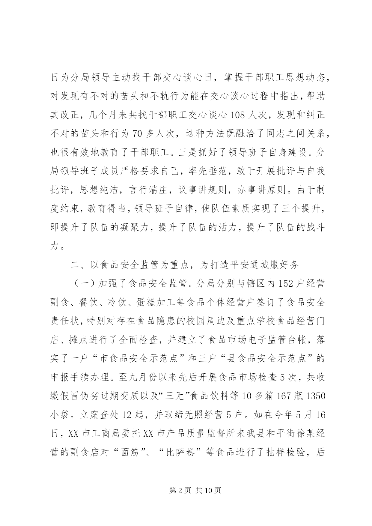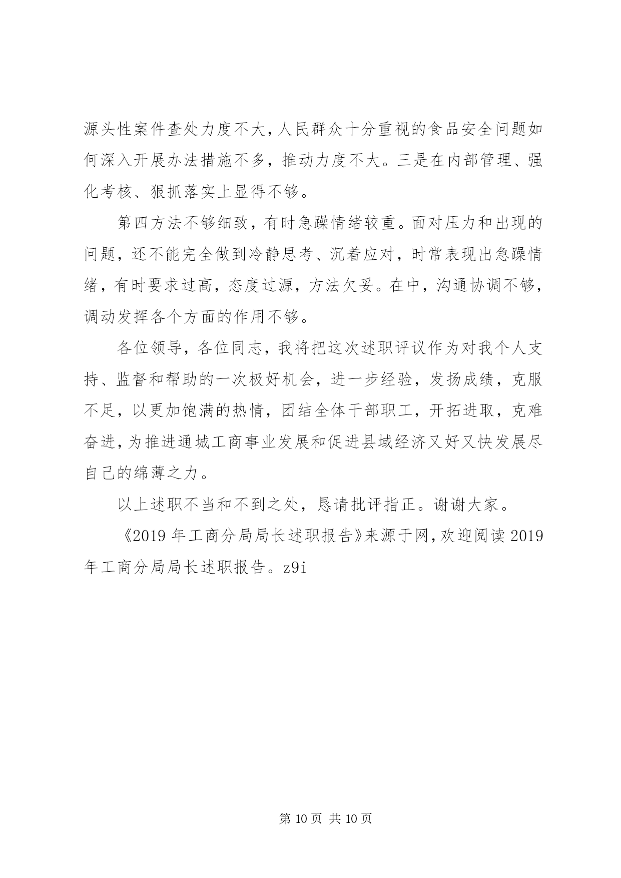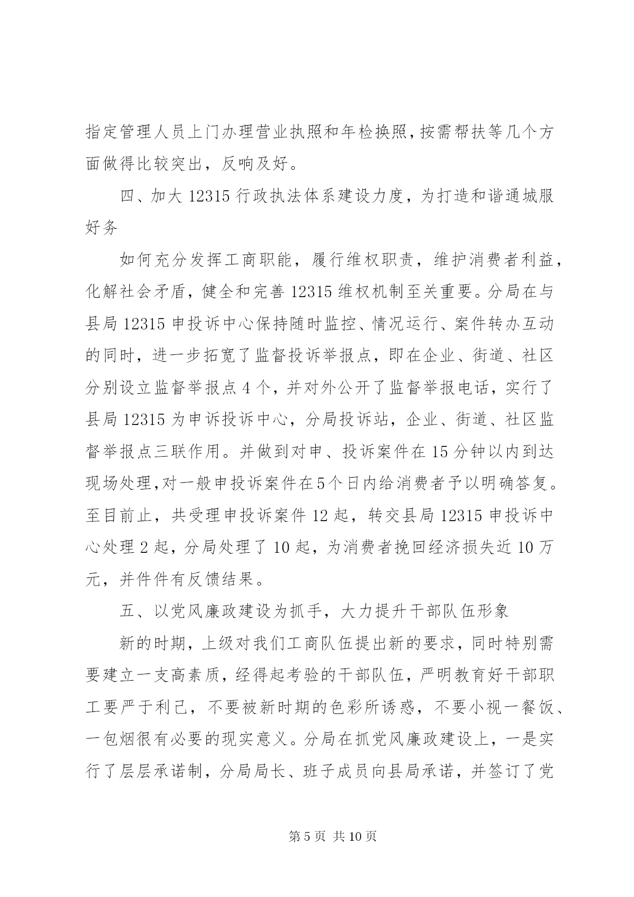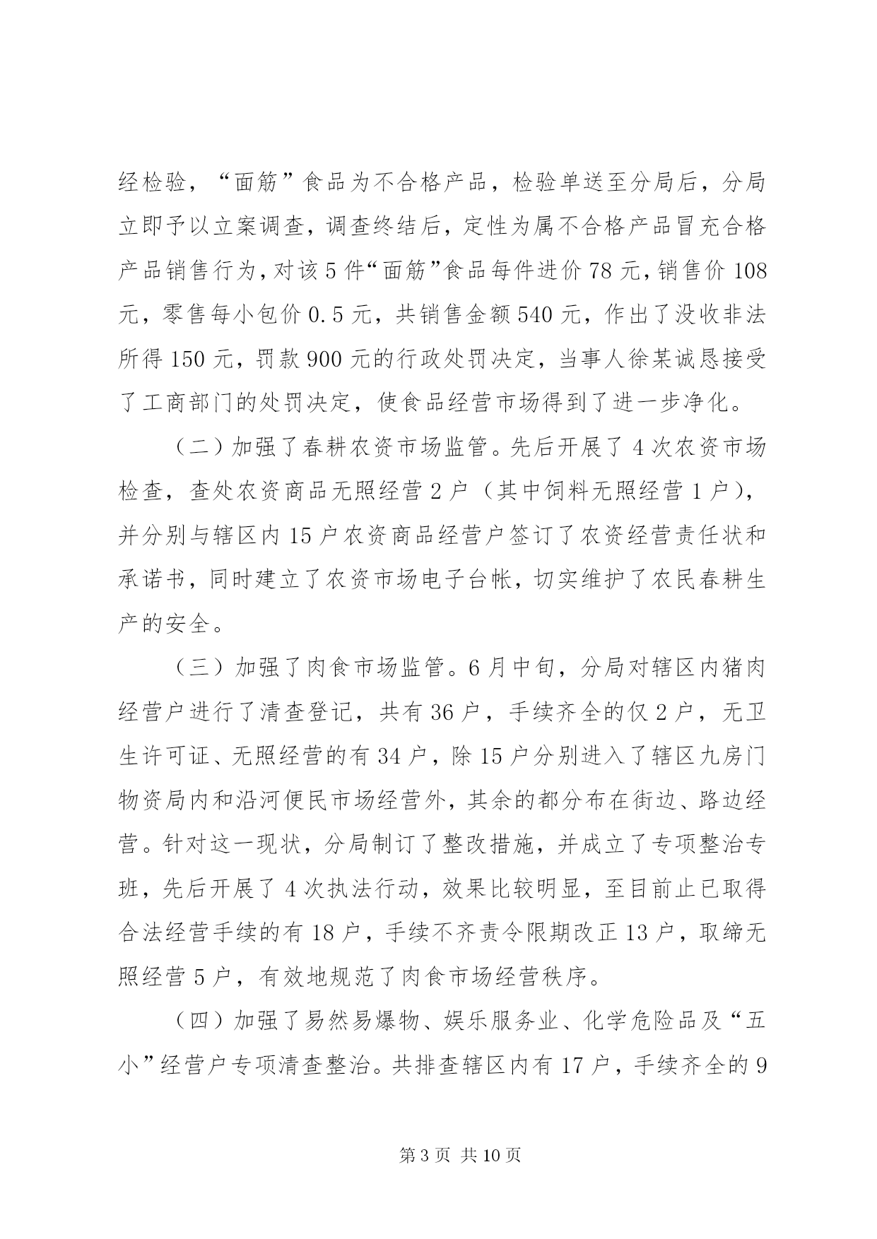 第PAGE\*Arabic\*MERGEFORMAT10页共NUMPAGES\*MERGEFORMAT10页XX年工商分局局长述职报告文章标题:2019年工商分局局长述职报告[文秘网站的龙头__网__述职报告:/article/bgzj/szbg/index.html]尊敬的各位领导、各位代表、各位来宾:我叫***,今年3月份到城南工商分局任职。任职以来,我始终坚持“以人为本、立足本职、求真务实、改革创新”的理念和作风,凝聚和团结分局一班人,以群众满意和社会满意为衡量我们的一把尺子,以党风廉政建设和队伍建设为基础,依法行政,切实履行监管职能,服务于县局及党委政府的领导,服务于地方经济的建设和发展,较好地完成了各项任务。现将今年来的作如下述职,请予评议。一、着力提高队伍素质,夯实发展基础各项的好坏,关键在人,关键在我们分局这支队伍。今年来,我们在队伍建设上,着力抓好三个方面:一是抓好了建章立制。先后制订了上班签到制度、上岗着装制度、例会、会议学习制度,程序制度,公开承诺制度,廉政勤政制度和行政执法责任追究制度等十多项管理制度,对干部职工有了约束力。二是加强了学习与教育相结合。坚持了每星期一上午为分局例会学习“雷打不动”,例会上少不了学习上级文件精神,法律法规政策,典型执法管理经验等,坚持了每月15日和28日为分局领导主动找干部交心谈心日,掌握干部职工思想动态,对发现有不对的苗头和不轨行为能在交心谈心过程中指出,帮助其改正,几个月来共找干部职工交心谈心108人次,发现和纠正不对的苗头和行为70多人次,这种方法既融洽了同志之间关系,也很有效地教育了干部职工。三是抓好了领导班子自身建设。分局领导班子成员严格要求自己,率先垂范,敢于开展批评与自我批评,思想纯洁,言行端庄,议事讲规则,办事讲原则。由于制度约束,教育得当,领导班子自律,使队伍素质实现了三个提升,即提升了队伍的凝聚力,提升了队伍的活力,提升了队伍的战斗力。二、以食品安全监管为重点,为打造平安通城服好务(一)加强了食品安全监管。分局分别与辖区内152户经营副食、餐饮、冷饮、蛋糕加工等食品个体经营户签订了食品安全责任状,特别对存在食品隐患的校园周边及重点学校食品经营门店、摊点进行了全面检查,并建立了食品市场电子监管台帐,落实了一户“市食品安全示范点”和三户“县食品安全示范点”的申报手续办理。至九月份以来先后开展食品市场检查5次,共收缴假冒伪劣过期变质以及“三无”食品饮料等10多箱167瓶1350小袋。立案查处12起,并取缔无照经营5户。如在今年5月16日,XX市工商局委托XX市产品质量监督所来我县和平街徐某经营的副食店对“面筋”、“比萨卷”等食品进行了抽样检验,后经检验,“面筋”食品为不合格产品,检验单送至分局后,分局立即予以立案调查,调查终结后,定性为属不合格产品冒充合格产品销售行为,对该5件“面筋”食品每件进价78元,销售价108元,零售每小包价0.5元,共销售金额540元,作出了没收非法所得150元,罚款900元的行政处罚决定,当事人徐某诚恳接受了工商部门的处罚决定,使食品经营市场得到了进一步净化。(二)加强了春耕农资市场监管。先后开展了4次农资市场检查,查处农资商品无照经营2户(其中饲料无照经营1户),并分别与辖区内15户农资商品经营户签订了农资经营责任状和承诺书,同时建立了农资市场电子台帐,切实维护了农民春耕生产的安全。(三)加强了肉食市场监管。6月中旬,分局对辖区内猪肉经营户进行了清查登记,共有36户,手续齐全的仅2户,无卫生许可证、无照经营的有34户,除15户分别进入了辖区九房门物资局内和沿河便民市场经营外,其余的都分布在街边、路边经营。针对这一现状,分局制订了整改措施,并成立了专项整治专班,先后开展了4次执法行动,效果比较明显,至目前止已取得合法经营手续的有18户,手续不齐责令限期改正13户,取缔无照经营5户,有效地规范了肉食市场经营秩序。(四)加强了易然易爆物、娱乐服务业、化学危险品及“五小”经营户专项清查整治。共排查辖区内有17户,手续齐全的9户,对6户手续不齐的进行了行政处罚并责令限期改正,取缔无照经营2户。(五)加强了对黑网吧打击力度。共排查辖区内网吧数9户,手续都齐全,但在平常监管中发现违法违规现象有6件,查处电子游戏厅无照经营2户,取缔黑网吧1户,有效地推进了社会综合治理,维护了社会风气,基本消除了网吧隐患,保护了青少年身心健康成长。(六)加强了其他专项检查。如对非法拼装汽车、非法回收报废汽车、假冒“朵彩”棉内衣、兜售“巫毒娃娃”、拉人头传销,查缴假冒“完美”出版物,易中天、于丹作品盗版本、盗版光碟、光盘等违法行为的专项整治,有力的净化了市场环境,社会反响较好,深受广大消费者赞扬。三、以贯彻落实省局51条措施为重点,为促进通城