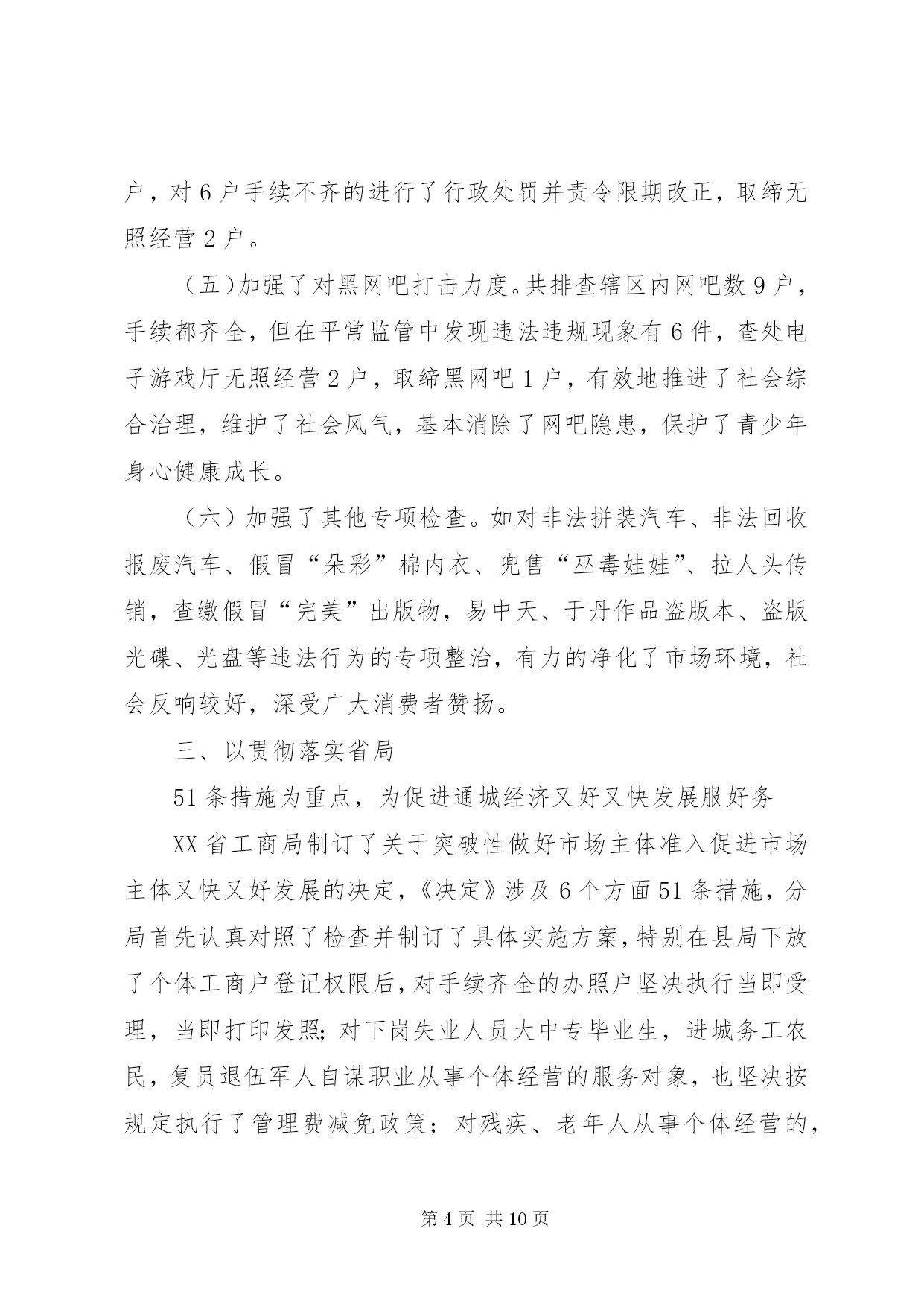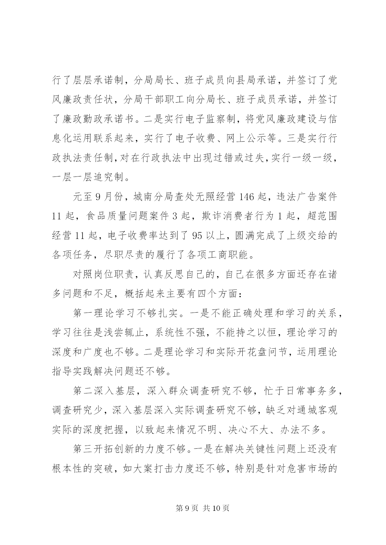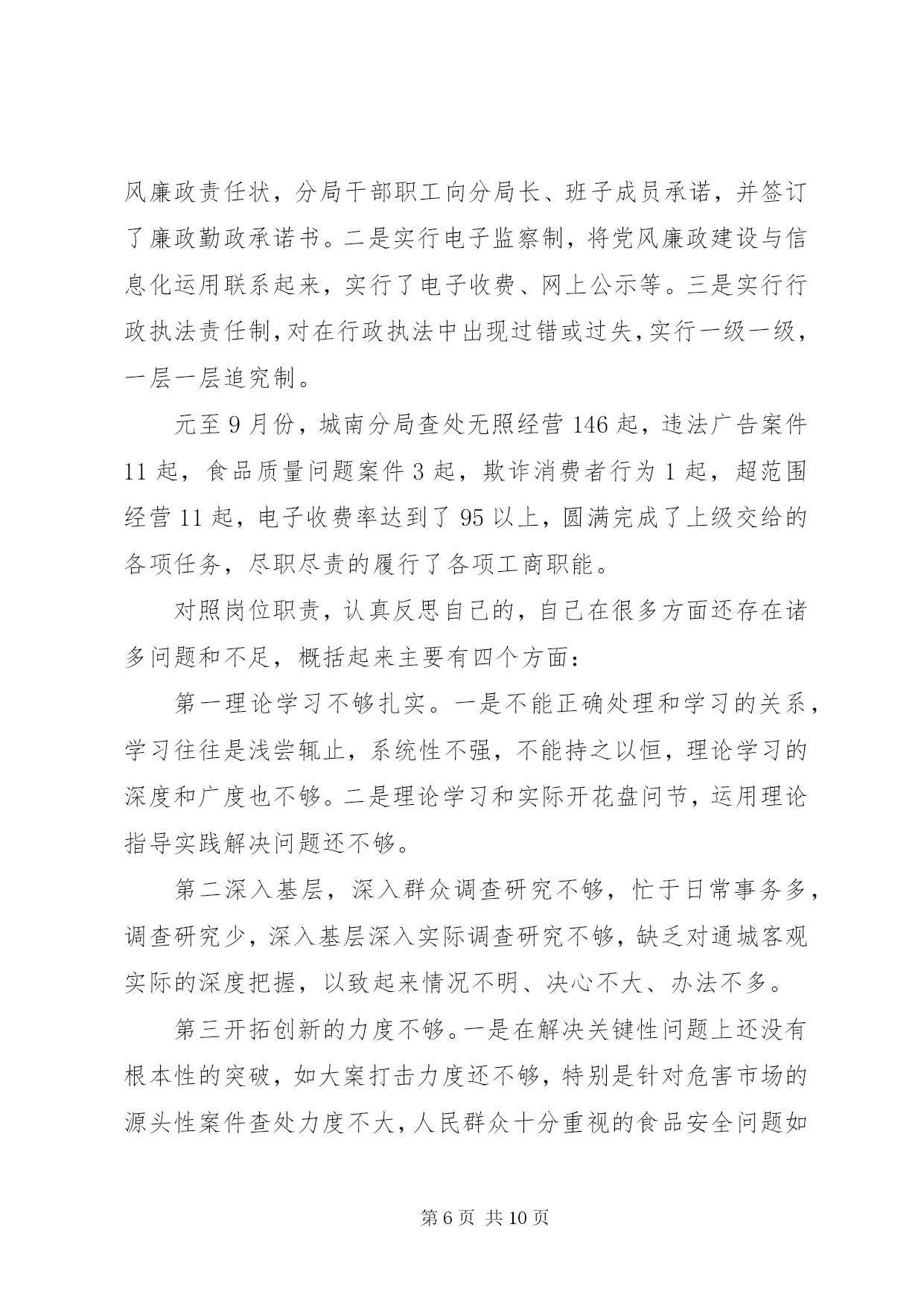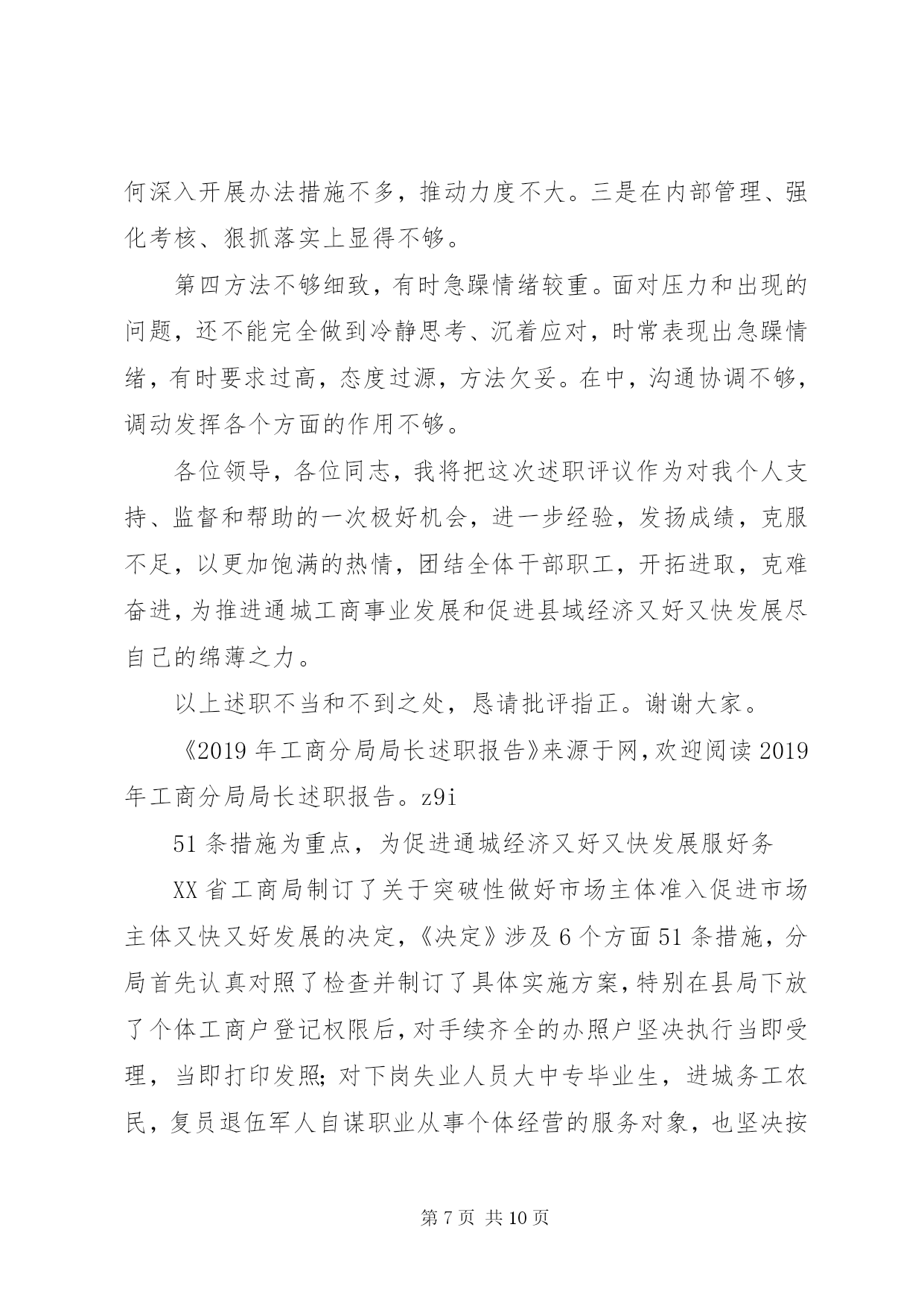 第PAGE\*Arabic\*MERGEFORMAT10页共NUMPAGES\*MERGEFORMAT10页XX年工商分局局长述职报告文章标题:2019年工商分局局长述职报告[文秘网站的龙头__网__述职报告:/article/bgzj/szbg/index.html]尊敬的各位领导、各位代表、各位来宾:我叫***,今年3月份到城南工商分局任职。任职以来,我始终坚持“以人为本、立足本职、求真务实、改革创新”的理念和作风,凝聚和团结分局一班人,以群众满意和社会满意为衡量我们的一把尺子,以党风廉政建设和队伍建设为基础,依法行政,切实履行监管职能,服务于县局及党委政府的领导,服务于地方经济的建设和发展,较好地完成了各项任务。现将今年来的作如下述职,请予评议。一、着力提高队伍素质,夯实发展基础各项的好坏,关键在人,关键在我们分局这支队伍。今年来,我们在队伍建设上,着力抓好三个方面:一是抓好了建章立制。先后制订了上班签到制度、上岗着装制度、例会、会议学习制度,程序制度,公开承诺制度,廉政勤政制度和行政执法责任追究制度等十多项管理制度,对干部职工有了约束力。二是加强了学习与教育相结合。坚持了每星期一上午为分局例会学习“雷打不动”,例会上少不了学习上级文件精神,法律法规政策,典型执法管理经验等,坚持了每月15日和28日为分局领导主动找干部交心谈心日,掌握干部职工思想动态,对发现有不对的苗头和不轨行为能在交心谈心过程中指出,帮助其改正,几个月来共找干部职工交心谈心108人次,发现和纠正不对的苗头和行为70多人次,这种方法既融洽了同志之间关系,也很有效地教育了干部职工。三是抓好了领导班子自身建设。分局领导班子成员严格要求自己,率先垂范,敢于开展批评与自我批评,思想纯洁,言行端庄,议事讲规则,办事讲原则。由于制度约束,教育得当,领导班子自律,使队伍素质实现了三个提升,即提升了队伍的凝聚力,提升了队伍的活力,提升了队伍的战斗力。二、以食品安全监管为重点,为打造平安通城服好务(一)加强了食品安全监管。分局分别与辖区内152户经营副食、餐饮、冷饮、蛋糕加工等食品个体经营户签订了食品安全责任状,特别对存在食品隐患的校园周边及重点学校食品经营门店、摊点进行了全面检查,并建立了食品市场电子监管台帐,落实了一户“市食品安全示范点”和三户“县食品安全示范点”的申报手续办理。至九月份以来先后开展食品市场检查5次,共收缴假冒伪劣过期变质以及“三无”食品饮料等10多箱167瓶1350小袋。立案查处12起,并取缔无照经营5户。如在今年5月16日,XX市工商局委托XX市产品质量监督所来我县和平街徐某经营的副食店对“面筋”、“比萨卷”等食品进行了抽样检验,后经检验,“面筋”食品为不合格产品,检验单送至分局后,分局立即予以立案调查,调查终结后,定性为属不合格产品冒充合格产品销售行为,对该5件“面筋”食品每件进价78元,销售价108元,零售每小包价0.5元,共销售金额540元,作出了没收非法所得150元,罚款900元的行政处罚决定,当事人徐某诚恳接受了工商部门的处罚决定,使食品经营市场得到了进一步净化。(二)加强了春耕农资市场监管。先后开展了4次农资市场检查,查处农资商品无照经营2户(其中饲料无照经营1户),并分别与辖区内15户农资商品经营户签订了农资经营责任状和承诺书,同时建立了农资市场电子台帐,切实维护了农民春耕生产的安全。(三)加强了肉食市场监管。6月中旬,分局对辖区内猪肉经营户进行了清查登记,共有36户,手续齐全的仅2户,无卫生许可证、无照经营的有34户,除15户分别进入了辖区九房门物资局内和沿河便民市场经营外,其余的都分布在街边、路边经营。针对这一现状,分局制订了整改措施,并成立了专项整治专班,先后开展了4次执法行动,效果比较明显,至目前止已取得合法经营手续的有18户,手续不齐责令限期改正13户,取缔无照经营5户,有效地规范了肉食市场经营秩序。(四)加强了易然易爆物、娱乐服务业、化学危险品及“五小”经营户专项清查整治。共排查辖区内有17户,手续齐全的9户,对6户手续不齐的进行了行政处罚并责令限期改正,取缔无照经营2户。(五)加强了对黑网吧打击力度。共排查辖区内网吧数9户,手续都齐全,但在平常监管中发现违法违规现象有6件,查处电子游戏厅无照经营2户,取缔黑网吧1户,有效地推进了社会综合治理,维护了社会风气,基本消除了网吧隐患,保护了青少年身心健康成长。(六)加强了其他专项检查。如对非法拼装汽车、非法回收报废汽车、假冒“朵彩”棉内衣、兜售“巫毒娃娃”、拉人头传销,查缴假冒“完美”出版物,易中天、于丹作品盗版本、盗版光碟、光盘等违法行为的专项整治,有力的净化了市场环境,社会反响较好,深受广大消费者赞扬。三、以贯彻落实省局51条措施为重点,为促进通城