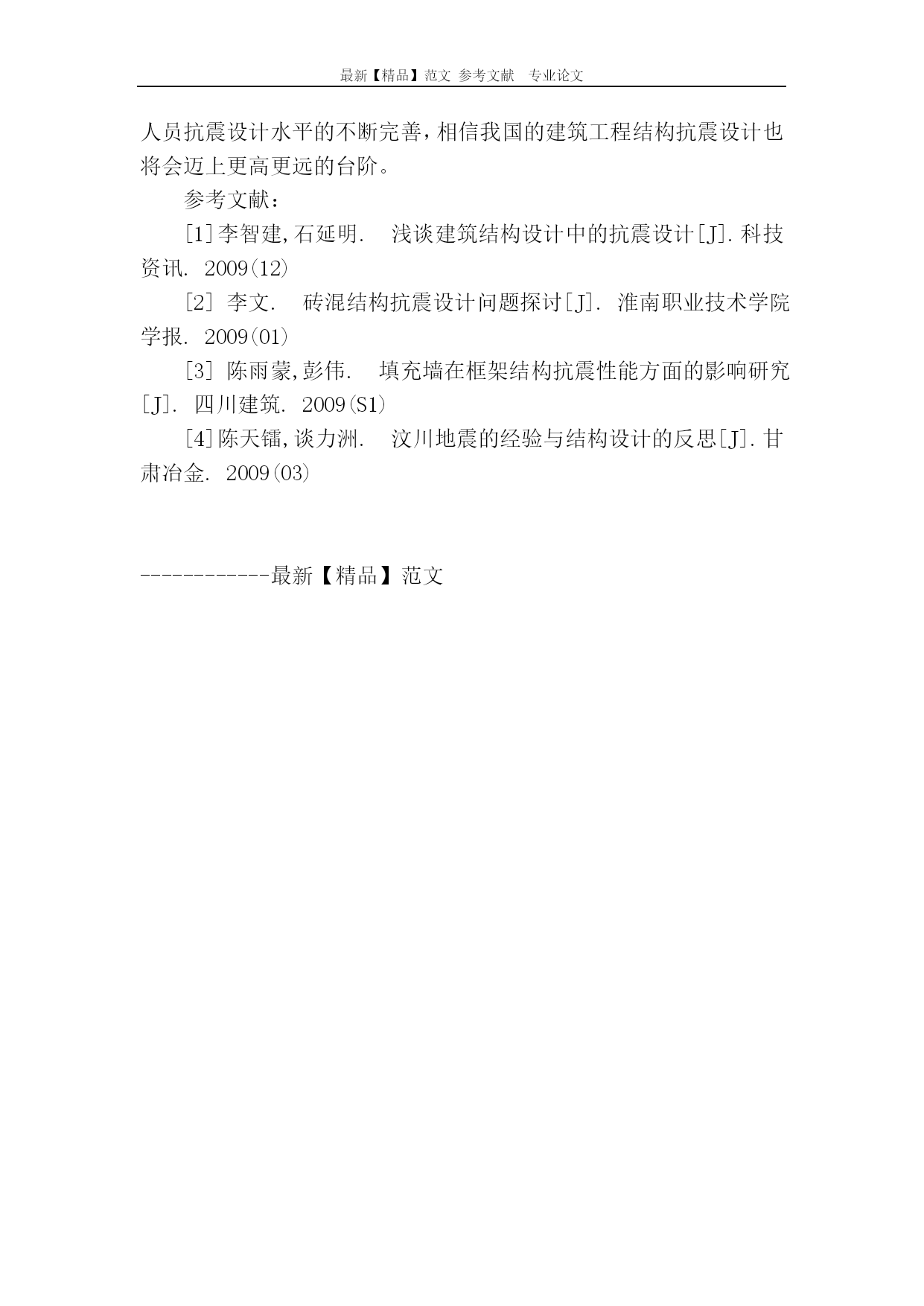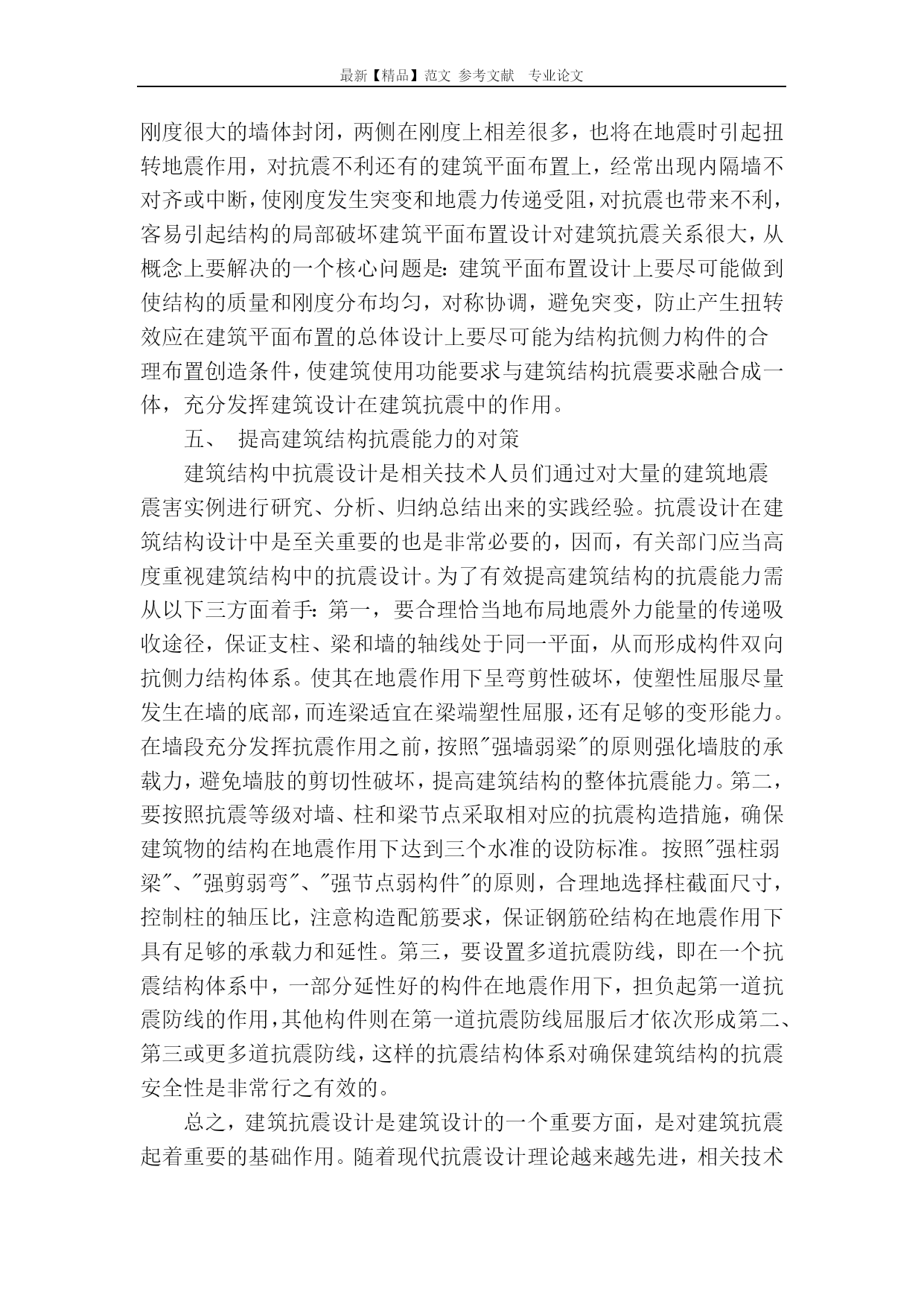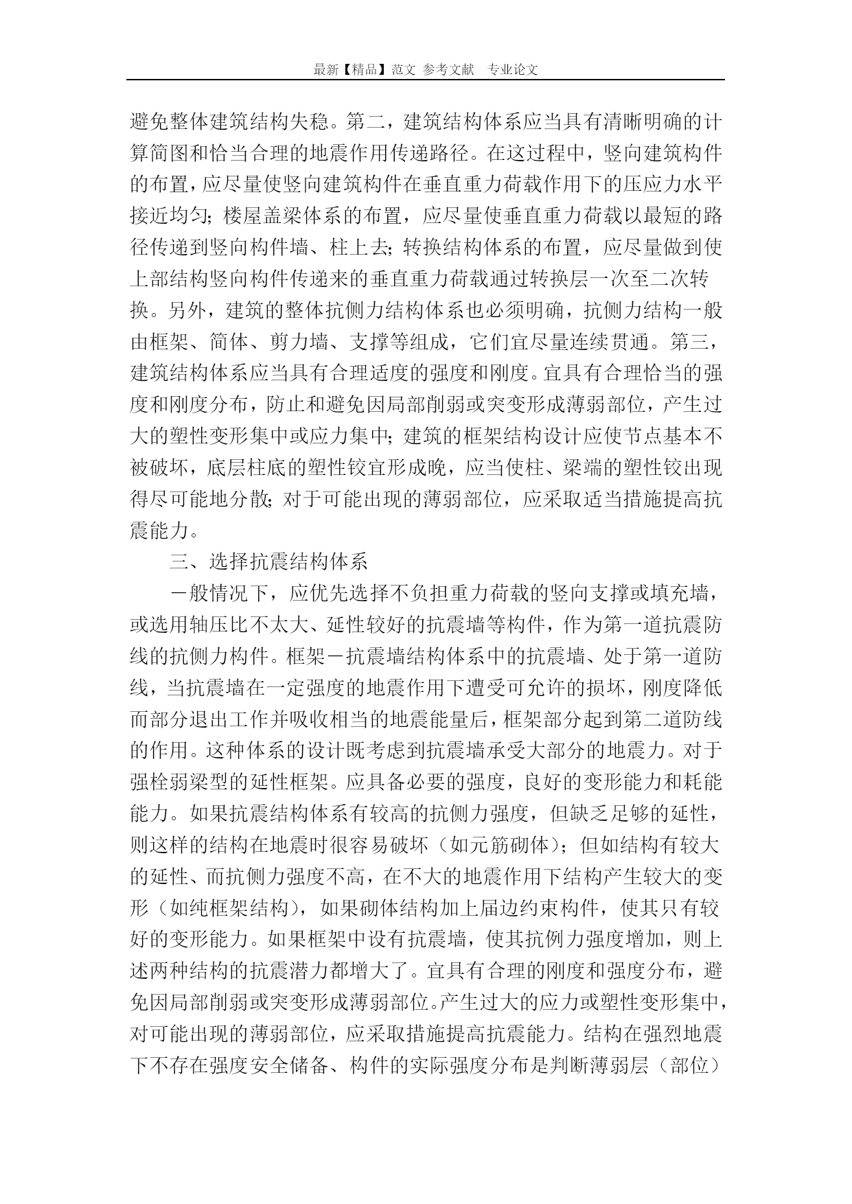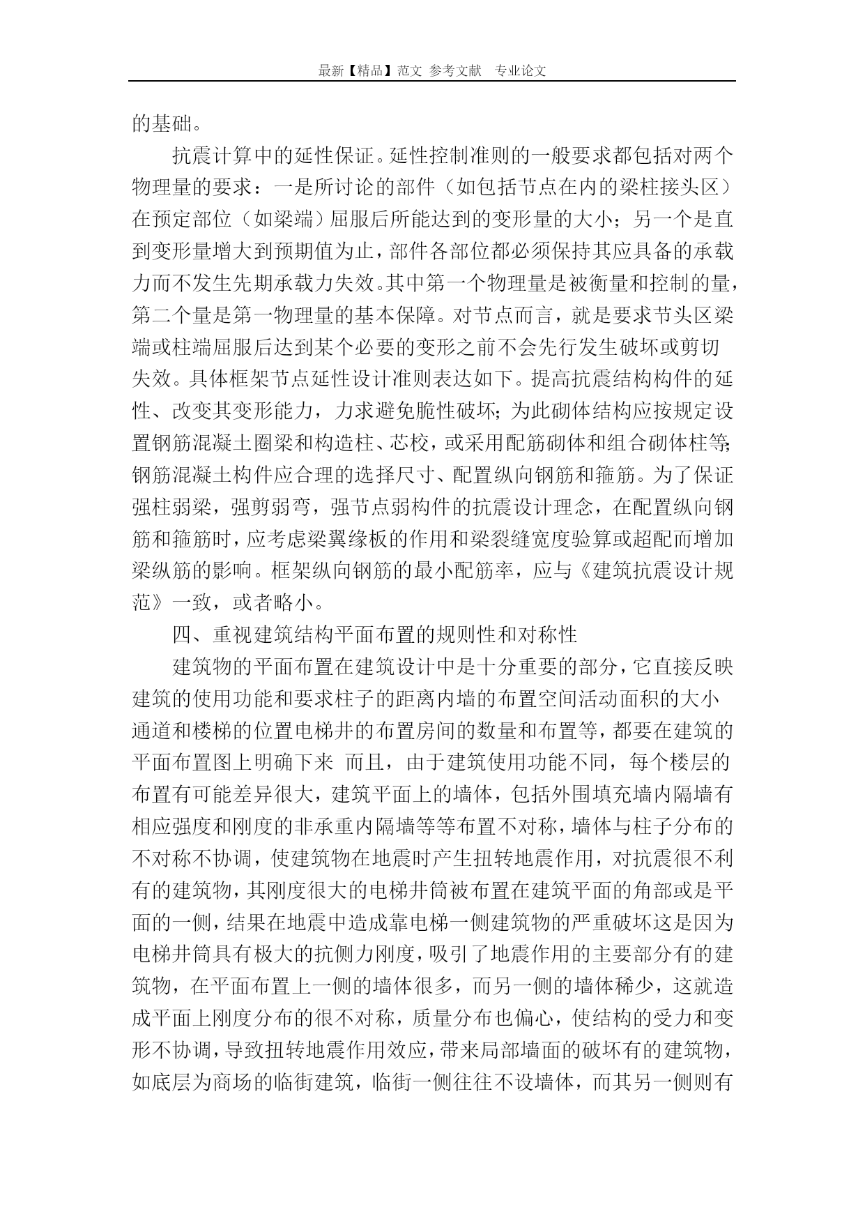 最新【精品】范文参考文献专业论文建筑结构设计中的抗震设计分析建筑结构设计中的抗震设计分析摘要:地震是一种自然现象,人们无法对它进行预测和防止,一旦发生强烈等级的地震,将会造成无法挽回的人员伤亡和财产损失。而面对无法预测和防止地震而言,人们只能从遇到地震时使损失降至最低方面入手进行控制,由于建筑结构设计在抗震设防中起着至关重要的作用。所以本文根据建筑结构中抗震设计存在的一些问题进行探讨,旨在不断提高建筑抗震等级,确保人民生命财产安全。关键词:建筑结构;抗震设计;存在的问题;对策中图分类号:TU973+.31文献标识码:A文章编号:工程质量的好坏直接影响着千家万户的生命安全,随着汶川地震和日本的311大地震的发生,当前,国内外工程界愈来愈重视建筑结构中的抗震设计。要设计出精确的建筑结构抗震这就要求相关技术人员充分认识地震破坏建筑物的原因和过程。一、建筑抗震场地的选择建筑场地的选择应根据工程需要,以及工程地质有关资料和地震活动情况和进行综合评价。根据不同的场地,对天然地基时的抗震承载力进行分析,对震陷、震动液化可能性与液化危害度进行分析。必要时,对其处理可采用规范的相应的地基来进行。根据地震烈度、场地土的厚度和断裂的地质历史来对避让距离进行确定,从而确定场地范围内的地震断裂。在选择场地地基时,要避开对建筑不利的地段,如果没法避开时,采用适当的抗震措施。二、选择抗震体系类型合理选择建筑的抗震结构体系决定了建筑结构的安全性和经济性。具体而言,应注重以下三方面的设计:第一,建筑结构体系应当避免因部分结构或构件的破坏而导致整个建筑结构丧失抗震能力或对重力荷载的承载能力。建筑结构抗震设计的一个重要原则就是结构应当具有必要的赘余度、良好的变形能力和内力重分配的功能,地震中,即使一部分构件退出工作,其余部分构件仍能承担起竖向荷载,避免整体建筑结构失稳。第二,建筑结构体系应当具有清晰明确的计算简图和恰当合理的地震作用传递路径。在这过程中,竖向建筑构件的布置,应尽量使竖向建筑构件在垂直重力荷载作用下的压应力水平接近均匀;楼屋盖梁体系的布置,应尽量使垂直重力荷载以最短的路径传递到竖向构件墙、柱上去;转换结构体系的布置,应尽量做到使上部结构竖向构件传递来的垂直重力荷载通过转换层一次至二次转换。另外,建筑的整体抗侧力结构体系也必须明确,抗侧力结构一般由框架、简体、剪力墙、支撑等组成,它们宜尽量连续贯通。第三,建筑结构体系应当具有合理适度的强度和刚度。宜具有合理恰当的强度和刚度分布,防止和避免因局部削弱或突变形成薄弱部位,产生过大的塑性变形集中或应力集中;建筑的框架结构设计应使节点基本不被破坏,底层柱底的塑性铰宜形成晚,应当使柱、梁端的塑性铰出现得尽可能地分散;对于可能出现的薄弱部位,应采取适当措施提高抗震能力。三、选择抗震结构体系―般情况下,应优先选择不负担重力荷载的竖向支撑或填充墙,或选用轴压比不太大、延性较好的抗震墙等构件,作为第一道抗震防线的抗侧力构件。框架―抗震墙结构体系中的抗震墙、处于第一道防线,当抗震墙在一定强度的地震作用下遭受可允许的损坏,刚度降低而部分退出工作并吸收相当的地震能量后,框架部分起到第二道防线的作用。这种体系的设计既考虑到抗震墙承受大部分的地震力。对于强栓弱梁型的延性框架。应具备必要的强度,良好的变形能力和耗能能力。如果抗震结构体系有较高的抗侧力强度,但缺乏足够的延性,则这样的结构在地震时很容易破坏(如元筋砌体);但如结构有较大的延性、而抗侧力强度不高,在不大的地震作用下结构产生较大的变形(如纯框架结构),如果砌体结构加上届边约束构件,使其只有较好的变形能力。如果框架中设有抗震墙,使其抗例力强度增加,则上述两种结构的抗震潜力都增大了。宜具有合理的刚度和强度分布,避免因局部削弱或突变形成薄弱部位。产生过大的应力或塑性变形集中,对可能出现的薄弱部位,应采取措施提高抗震能力。结构在强烈地震下不存在强度安全储备、构件的实际强度分布是判断薄弱层(部位)的基础。抗震计算中的延性保证。延性控制准则的一般要求都包括对两个物理量的要求:一是所讨论的部件(如包括节点在内的梁柱接头区)在预定部位(如梁端)屈服后所能达到的变形量的大小;另一个是直到变形量增大到预期值为止,部件各部位都必须保持其应具备的承载力而不发生先期承载力失效。其中第一个物理量是被衡量和控制的量,第二个量是第一物理量的基本保障。对节点而言,就是要求节头区梁端或柱端屈服后达到某个必要的变形之前不会先行发生破坏或剪切失效。具体框架节点延性设计准则表达如下。提高抗震结构构件的延性、改变其变形能力,力求避免脆性破坏;为此砌体结构应按规定设置钢筋混凝土圈梁和构造柱、芯校,或采用配筋砌体和组合砌体柱等;钢筋混凝土构件应合理的选择尺寸、配置纵向钢筋和箍筋。为了保证强柱