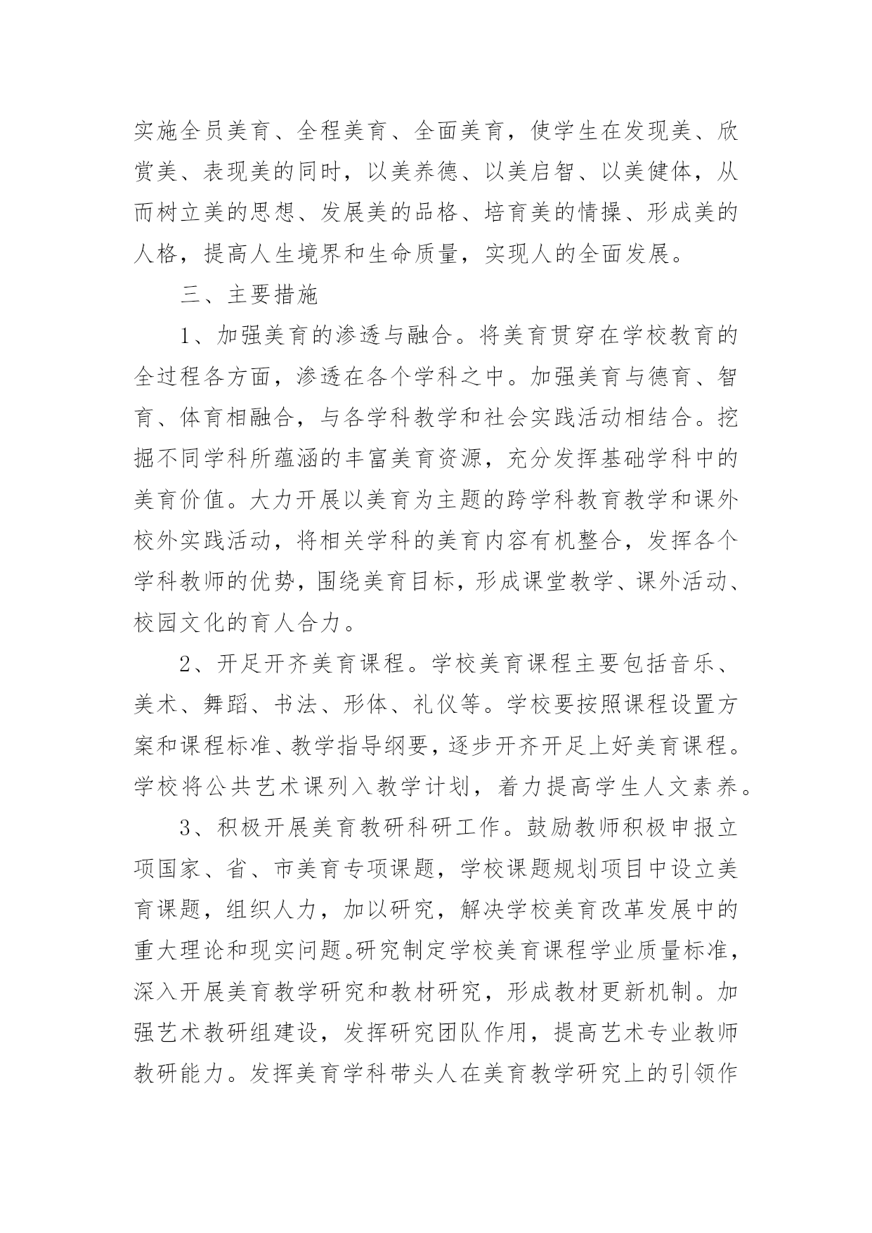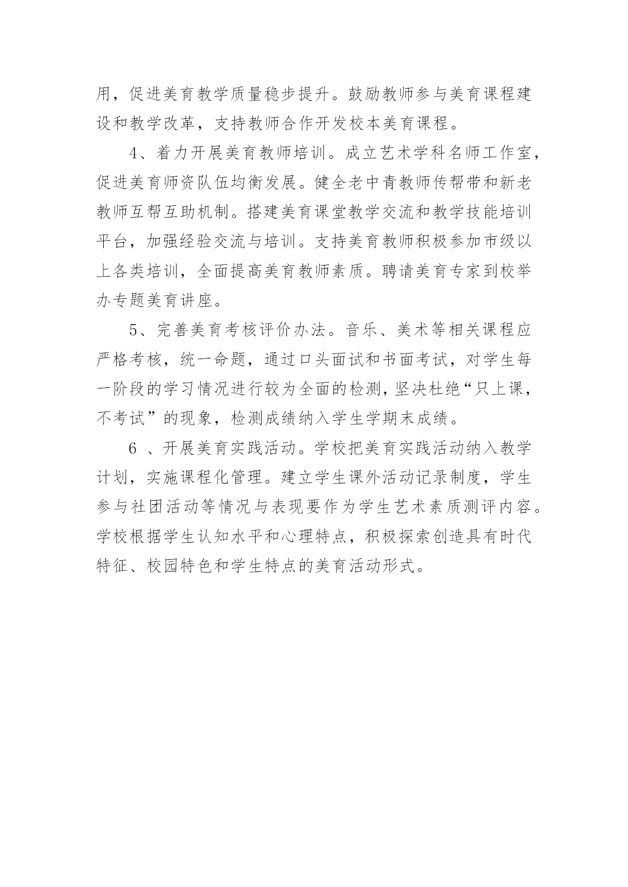 南昌汽车机电学校美育工作实施方案为了确保我们的努力取得实效,我们需要事先制定方案,方案是阐明行动的时间,地点,目的,预期效果,预算及方法等的书面计划。那么制定方案需要注意哪些问题呢?以下是小编收集整理的南昌汽车机电学校美育工作实施方案,欢迎大家分享。为深入贯彻《国务院办公厅关于全面加强和改进学校美育工作的意见》精神,全面加强和改进我校美育工作,大力提高学生审美和人文素养,促进学生德智体美全面发展,结合我校实际,制定本方案。一、指导思想以党的教育方针为基本遵循,以立德树人为根本任务,全面贯彻落实《国务院办公厅关于全面加强和改进学校美育工作的意见》文件精神,把培育和践行社会主义核心价值观融入学校美育全过程,引领学生树立正确的审美观念,提升学生审美能力。坚持美育工作与教育教学融合原则,完善课程实施、科研支撑、文化引领、活动推动、环境熏陶的美育工作机制,实行全员美育、全程美育、全面美育,构建学校大美育格局,提高学校美育工作水平,促进学生健康成长,培养造就德智体美全面发展的职校学生。二、工作目标通过科学构建美育工作机制,创新美育工作举措,深入实施全员美育、全程美育、全面美育,使学生在发现美、欣赏美、表现美的同时,以美养德、以美启智、以美健体,从而树立美的思想、发展美的品格、培育美的情操、形成美的人格,提高人生境界和生命质量,实现人的全面发展。三、主要措施1、加强美育的渗透与融合。将美育贯穿在学校教育的全过程各方面,渗透在各个学科之中。加强美育与德育、智育、体育相融合,与各学科教学和社会实践活动相结合。挖掘不同学科所蕴涵的丰富美育资源,充分发挥基础学科中的美育价值。大力开展以美育为主题的跨学科教育教学和课外校外实践活动,将相关学科的美育内容有机整合,发挥各个学科教师的优势,围绕美育目标,形成课堂教学、课外活动、校园文化的育人合力。2、开足开齐美育课程。学校美育课程主要包括音乐、美术、舞蹈、书法、形体、礼仪等。学校要按照课程设置方案和课程标准、教学指导纲要,逐步开齐开足上好美育课程。学校将公共艺术课列入教学计划,着力提高学生人文素养。3、积极开展美育教研科研工作。鼓励教师积极申报立项国家、省、市美育专项课题,学校课题规划项目中设立美育课题,组织人力,加以研究,解决学校美育改革发展中的重大理论和现实问题。研究制定学校美育课程学业质量标准,深入开展美育教学研究和教材研究,形成教材更新机制。加强艺术教研组建设,发挥研究团队作用,提高艺术专业教师教研能力。发挥美育学科带头人在美育教学研究上的引领作用,促进美育教学质量稳步提升。鼓励教师参与美育课程建设和教学改革,支持教师合作开发校本美育课程。4、着力开展美育教师培训。成立艺术学科名师工作室,促进美育师资队伍均衡发展。健全老中青教师传帮带和新老教师互帮互助机制。搭建美育课堂教学交流和教学技能培训平台,加强经验交流与培训。支持美育教师积极参加市级以上各类培训,全面提高美育教师素质。聘请美育专家到校举办专题美育讲座。5、完善美育考核评价办法。音乐、美术等相关课程应严格考核,统一命题,通过口头面试和书面考试,对学生每一阶段的学习情况进行较为全面的检测,坚决杜绝“只上课,不考试”的现象,检测成绩纳入学生学期末成绩。6、开展美育实践活动。学校把美育实践活动纳入教学计划,实施课程化管理。建立学生课外活动记录制度,学生参与社团活动等情况与表现要作为学生艺术素质测评内容。学校根据学生认知水平和心理特点,积极探索创造具有时代特征、校园特色和学生特点的美育活动形式。
