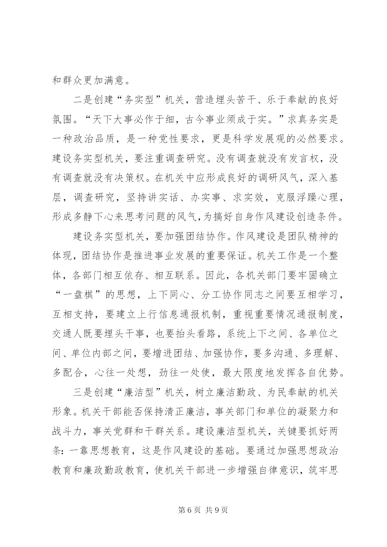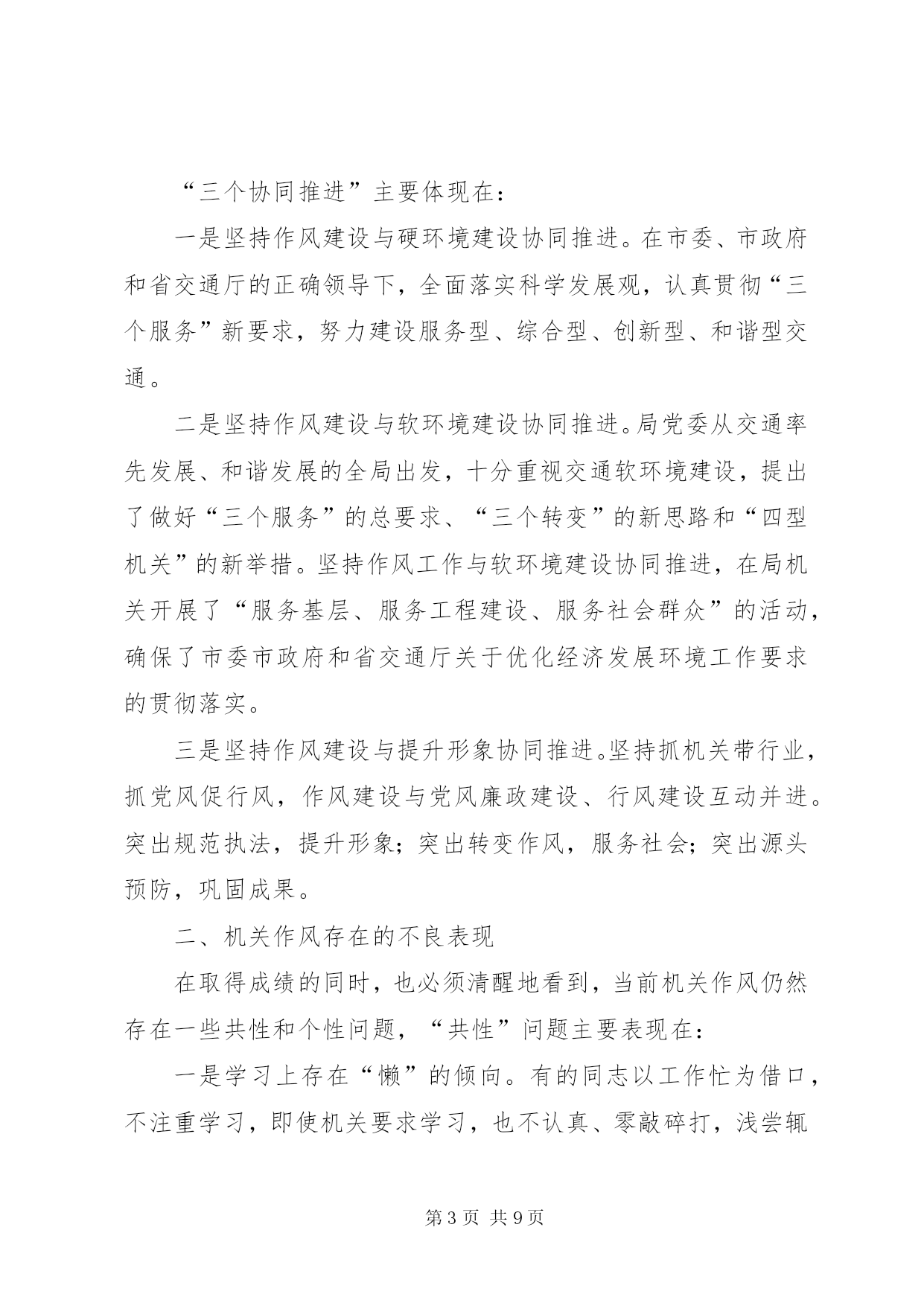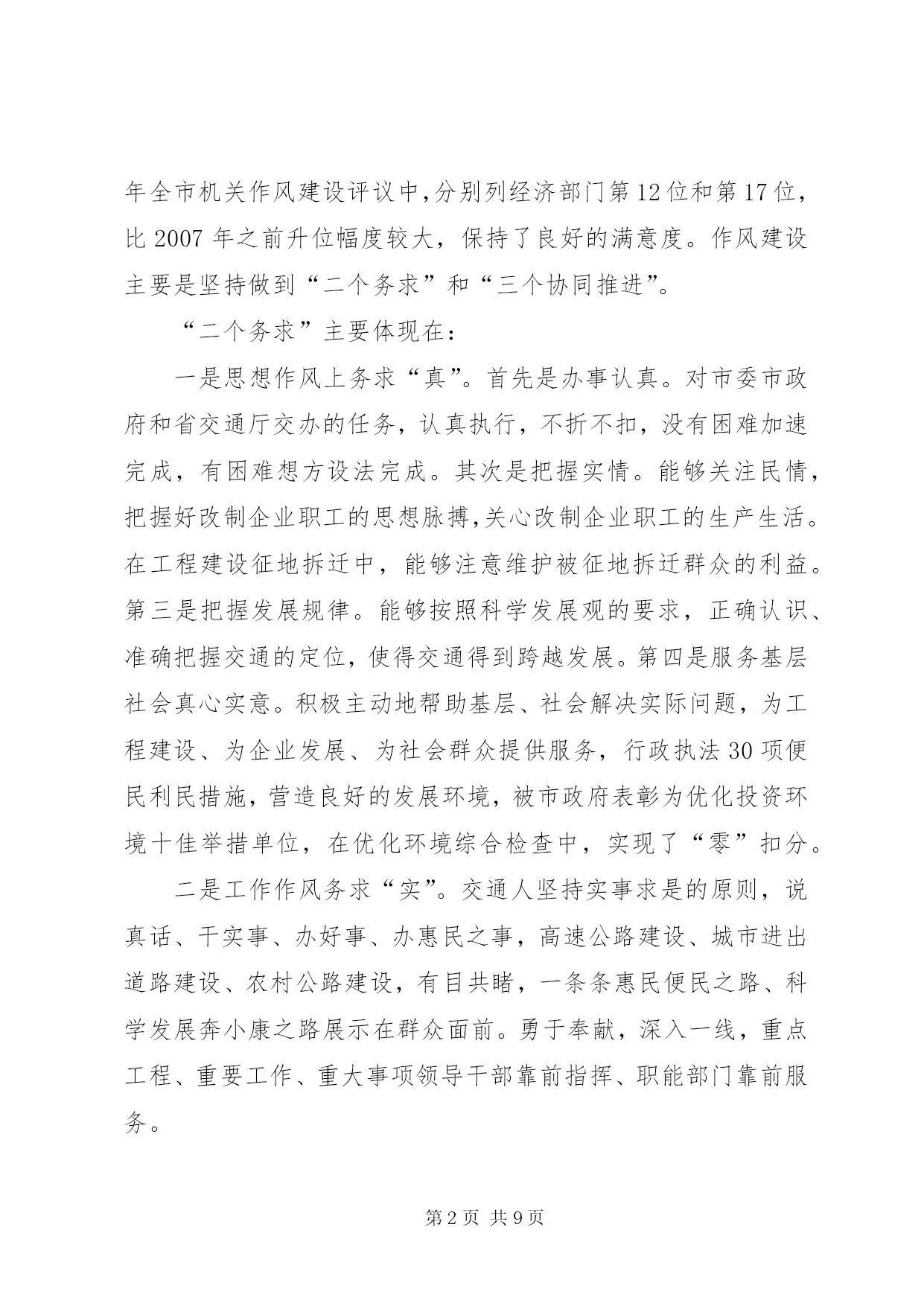 第PAGE\*Arabic\*MERGEFORMAT9页共NUMPAGES\*MERGEFORMAT9页交通机关作风建设调研报告当前,全党上下正深入开展学习科学发展观活动,面对新形势新任务新要求,加强和改进机关作风建设,努力营造清新的工作作风,积极探索培育新作风的有效途径,是新形势下机关建设和贯彻落实科学发展观的一个重大课题。现结合2007年和2008年我局在所在地区作风评议结果以及到基层的调研和平时了解,将调研情况报告如下:一、交通作风建设的总体评价局作风办于去年下半年在全社会开展了“优化发展,加速提升”为主题的“征求百企意见、提升交通服务形象”企业、社会评议交通活动。对市交通局机关“优化发展环境,提升服务能力”总体评价;领导干部廉政建设情况;交通局机关服务发展、服务基层、服务群众的水平、态度、效率和质量情况;交通行政执法总体情况等8个方面进行了评议,共发放评议票250张,收回有效票222张,好和较好所占比率都在94%以上。对下属的公路、航道、海事、运管、XX县区分局等行政执法单位就行政许可、服务承诺、行政处罚规范情况和廉政建设等14项内容进行了评议,总体情况较好。市局和各行政执法单位坚持以“服务发展、服务基层和服务群众”为目标,以加强作风和行风建设为抓手,坚持“抓机关带行业、抓作风促行风”,不断提升服务水平,改善服务形象,促进了交通事业更好更快的发展。在2007年和2008年全市机关作风建设评议中,分别列经济部门第12位和第17位,比2007年之前升位幅度较大,保持了良好的满意度。作风建设主要是坚持做到“二个务求”和“三个协同推进”。“二个务求”主要体现在:一是思想作风上务求“真”。首先是办事认真。对市委市政府和省交通厅交办的任务,认真执行,不折不扣,没有困难加速完成,有困难想方设法完成。其次是把握实情。能够关注民情,把握好改制企业职工的思想脉搏,关心改制企业职工的生产生活。在工程建设征地拆迁中,能够注意维护被征地拆迁群众的利益。第三是把握发展规律。能够按照科学发展观的要求,正确认识、准确把握交通的定位,使得交通得到跨越发展。第四是服务基层社会真心实意。积极主动地帮助基层、社会解决实际问题,为工程建设、为企业发展、为社会群众提供服务,行政执法30项便民利民措施,营造良好的发展环境,被市政府表彰为优化投资环境十佳举措单位,在优化环境综合检查中,实现了“零”扣分。二是工作作风务求“实”。交通人坚持实事求是的原则,说真话、干实事、办好事、办惠民之事,高速公路建设、城市进出道路建设、农村公路建设,有目共睹,一条条惠民便民之路、科学发展奔小康之路展示在群众面前。勇于奉献,深入一线,重点工程、重要工作、重大事项领导干部靠前指挥、职能部门靠前服务。“三个协同推进”主要体现在:一是坚持作风建设与硬环境建设协同推进。在市委、市政府和省交通厅的正确领导下,全面落实科学发展观,认真贯彻“三个服务”新要求,努力建设服务型、综合型、创新型、和谐型交通。二是坚持作风建设与软环境建设协同推进。局党委从交通率先发展、和谐发展的全局出发,十分重视交通软环境建设,提出了做好“三个服务”的总要求、“三个转变”的新思路和“四型机关”的新举措。坚持作风工作与软环境建设协同推进,在局机关开展了“服务基层、服务工程建设、服务社会群众”的活动,确保了市委市政府和省交通厅关于优化经济发展环境工作要求的贯彻落实。三是坚持作风建设与提升形象协同推进。坚持抓机关带行业,抓党风促行风,作风建设与党风廉政建设、行风建设互动并进。突出规范执法,提升形象;突出转变作风,服务社会;突出源头预防,巩固成果。二、机关作风存在的不良表现在取得成绩的同时,也必须清醒地看到,当前机关作风仍然存在一些共性和个性问题,“共性”问题主要表现在:一是学习上存在“懒”的倾向。有的同志以工作忙为借口,不注重学习,即使机关要求学习,也不认真、零敲碎打,浅尝辄止,满足于一知半解。学习兴趣不浓,学习目的不明,学习深度不够。有些干部学风不正,理论与实际脱节;有些干部不愿向群众学习,不愿向实践学习,不适应新时期新时代的要求。二是工作上存在“旧”的倾向。面对新形势下的矛盾和问题,有的同志不肯动脑筋,不愿闯新路。创业激情不足,拼劲闯劲不够,服务发展的新思路、新办法不多,满足于凭老经验、照老套路,不从服务对象角度考虑问题,不主动地出主意、想办法,缺乏为基层群众服务的责任心,缺乏为经济发展服务的热情。三是作风上存在“虚”的倾向。有的热衷于开会、发文件,满足于应付一般事务,工作抓而不紧、抓而不实,工作落实不到位。缺乏围绕中心、服务大局的自觉性和主动性。“个性”问题主要表现在。一是动多静少。即整天忙于工作,静下心来思考问题不够;二是感性认识多理性思考少。即感性的工作做得多,循规蹈矩、老老实实执行的多,理性