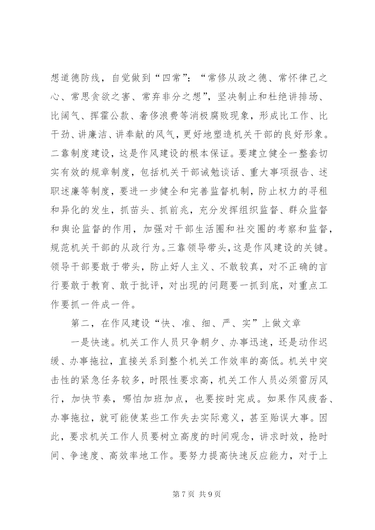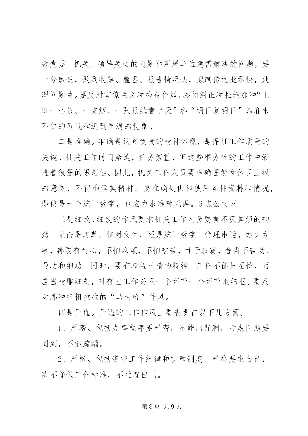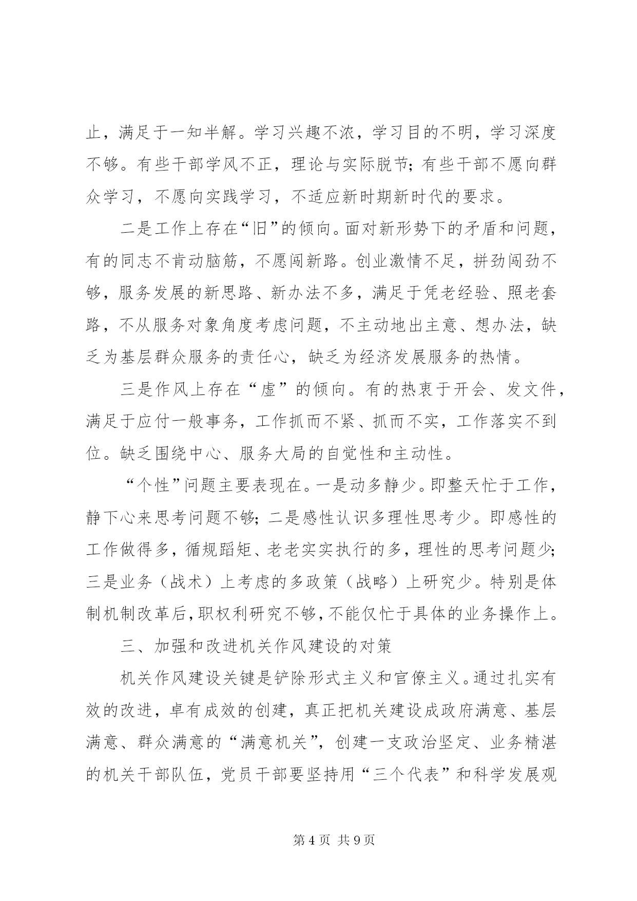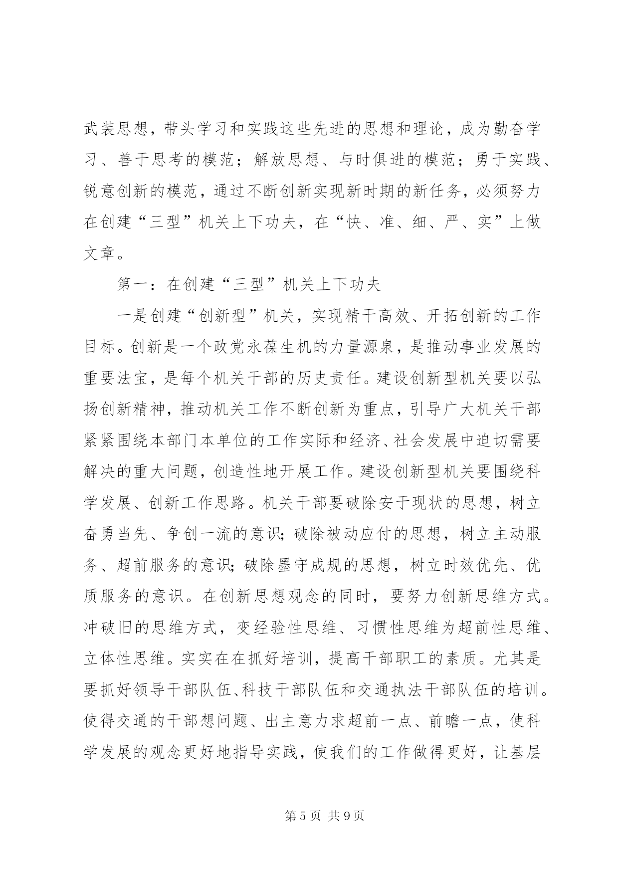第PAGE\*Arabic\*MERGEFORMAT9页共NUMPAGES\*MERGEFORMAT9页交通机关作风建设调研报告当前,全党上下正深入开展学习科学发展观活动,面对新形势新任务新要求,加强和改进机关作风建设,努力营造清新的工作作风,积极探索培育新作风的有效途径,是新形势下机关建设和贯彻落实科学发展观的一个重大课题。现结合2007年和2008年我局在所在地区作风评议结果以及到基层的调研和平时了解,将调研情况报告如下:一、交通作风建设的总体评价局作风办于去年下半年在全社会开展了“优化发展,加速提升”为主题的“征求百企意见、提升交通服务形象”企业、社会评议交通活动。对市交通局机关“优化发展环境,提升服务能力”总体评价;领导干部廉政建设情况;交通局机关服务发展、服务基层、服务群众的水平、态度、效率和质量情况;交通行政执法总体情况等8个方面进行了评议,共发放评议票250张,收回有效票222张,好和较好所占比率都在94%以上。对下属的公路、航道、海事、运管、XX县区分局等行政执法单位就行政许可、服务承诺、行政处罚规范情况和廉政建设等14项内容进行了评议,总体情况较好。市局和各行政执法单位坚持以“服务发展、服务基层和服务群众”为目标,以加强作风和行风建设为抓手,坚持“抓机关带行业、抓作风促行风”,不断提升服务水平,改善服务形象,促进了交通事业更好更快的发展。在2007年和2008年全市机关作风建设评议中,分别列经济部门第12位和第17位,比2007年之前升位幅度较大,保持了良好的满意度。作风建设主要是坚持做到“二个务求”和“三个协同推进”。“二个务求”主要体现在:一是思想作风上务求“真”。首先是办事认真。对市委市政府和省交通厅交办的任务,认真执行,不折不扣,没有困难加速完成,有困难想方设法完成。其次是把握实情。能够关注民情,把握好改制企业职工的思想脉搏,关心改制企业职工的生产生活。在工程建设征地拆迁中,能够注意维护被征地拆迁群众的利益。第三是把握发展规律。能够按照科学发展观的要求,正确认识、准确把握交通的定位,使得交通得到跨越发展。第四是服务基层社会真心实意。积极主动地帮助基层、社会解决实际问题,为工程建设、为企业发展、为社会群众提供服务,行政执法30项便民利民措施,营造良好的发展环境,被市政府表彰为优化投资环境十佳举措单位,在优化环境综合检查中,实现了“零”扣分。二是工作作风务求“实”。交通人坚持实事求是的原则,说真话、干实事、办好事、办惠民之事,高速公路建设、城市进出道路建设、农村公路建设,有目共睹,一条条惠民便民之路、科学发展奔小康之路展示在群众面前。勇于奉献,深入一线,重点工程、重要工作、重大事项领导干部靠前指挥、职能部门靠前服务。“三个协同推进”主要体现在:一是坚持作风建设与硬环境建设协同推进。在市委、市政府和省交通厅的正确领导下,全面落实科学发展观,认真贯彻“三个服务”新要求,努力建设服务型、综合型、创新型、和谐型交通。二是坚持作风建设与软环境建设协同推进。局党委从交通率先发展、和谐发展的全局出发,十分重视交通软环境建设,提出了做好“三个服务”的总要求、“三个转变”的新思路和“四型机关”的新举措。坚持作风工作与软环境建设协同推进,在局机关开展了“服务基层、服务工程建设、服务社会群众”的活动,确保了市委市政府和省交通厅关于优化经济发展环境工作要求的贯彻落实。三是坚持作风建设与提升形象协同推进。坚持抓机关带行业,抓党风促行风,作风建设与党风廉政建设、行风建设互动并进。突出规范执法,提升形象;突出转变作风,服务社会;突出源头预防,巩固成果。二、机关作风存在的不良表现在取得成绩的同时,也必须清醒地看到,当前机关作风仍然存在一些共性和个性问题,“共性”问题主要表现在:一是学习上存在“懒”的倾向。有的同志以工作忙为借口,不注重学习,即使机关要求学习,也不认真、零敲碎打,浅尝辄止,满足于一知半解。学习兴趣不浓,学习目的不明,学习深度不够。有些干部学风不正,理论与实际脱节;有些干部不愿向群众学习,不愿向实践学习,不适应新时期新时代的要求。二是工作上存在“旧”的倾向。面对新形势下的矛盾和问题,有的同志不肯动脑筋,不愿闯新路。创业激情不足,拼劲闯劲不够,服务发展的新思路、新办法不多,满足于凭老经验、照老套路,不从服务对象角度考虑问题,不主动地出主意、想办法,缺乏为基层群众服务的责任心,缺乏为经济发展服务的热情。三是作风上存在“虚”的倾向。有的热衷于开会、发文件,满足于应付一般事务,工作抓而不紧、抓而不实,工作落实不到位。缺乏围绕中心、服务大局的自觉性和主动性。“个性”问题主要表现在。一是动多静少。即整天忙于工作,静下心来思考问题不够;二是感性认识多理性思考少。即感性的工作做得多,循规蹈矩、老老实实执行的多,理性