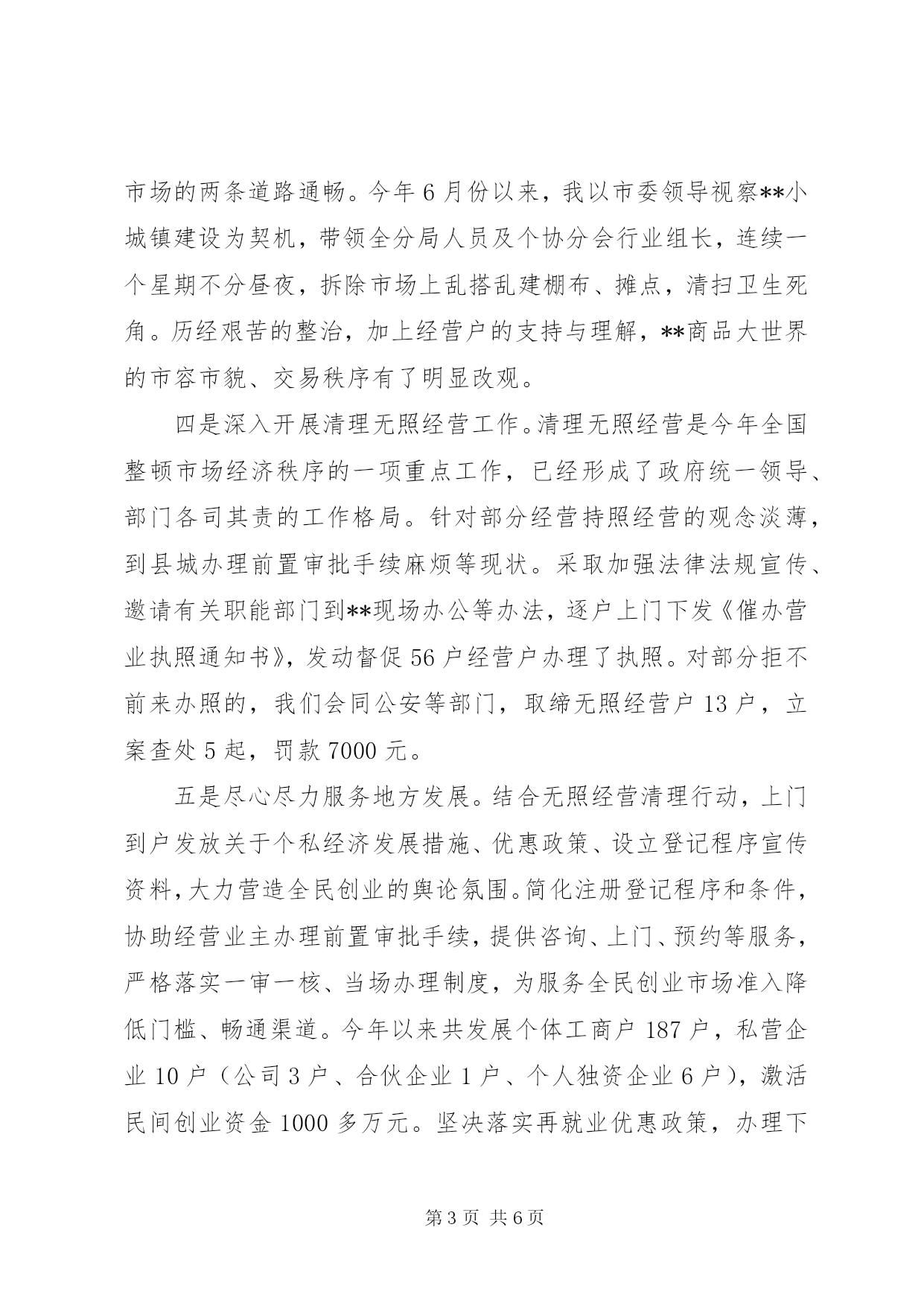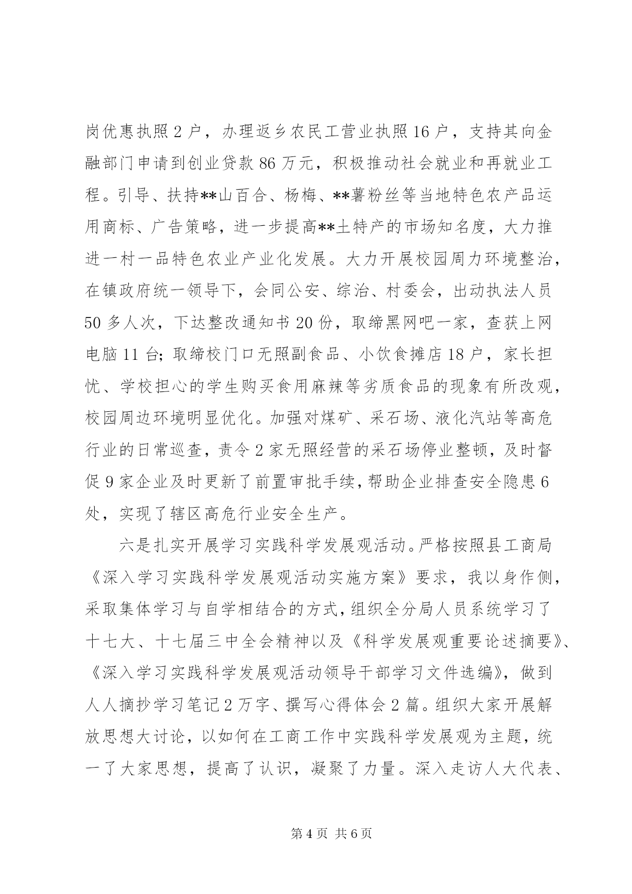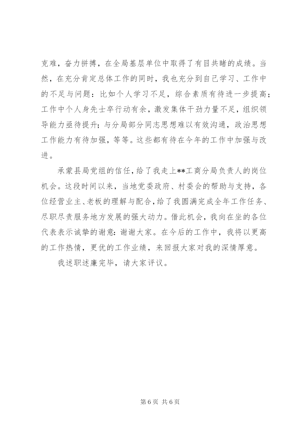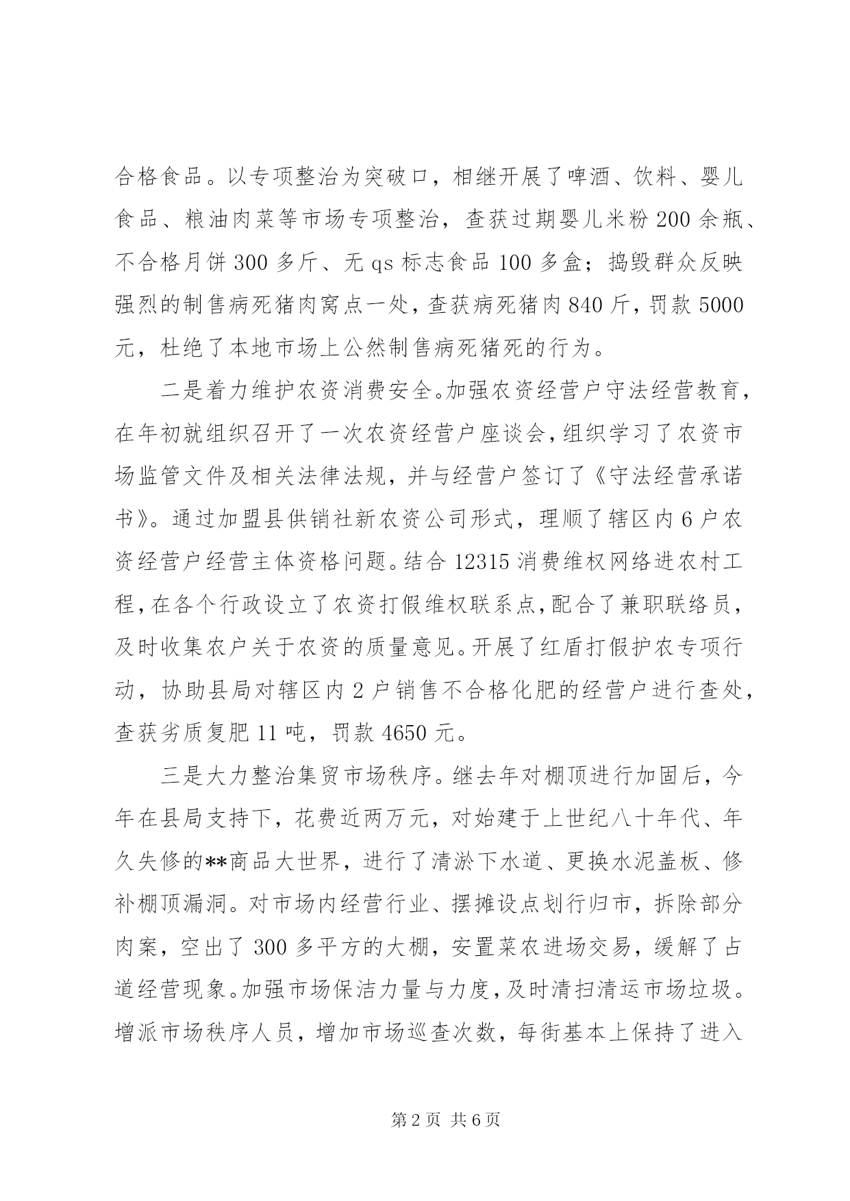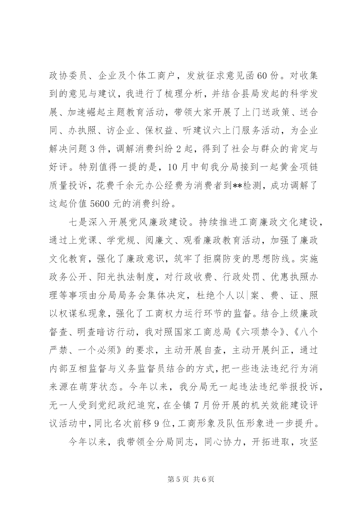 第PAGE\*Arabic\*MERGEFORMAT6页共NUMPAGES\*MERGEFORMAT6页工商局长述职述廉报告根据安排,县局今天到我们这里开展述职述廉活动。所以,有机会荣幸地把大家请到这里来,对我们的工作进行指导、评议。在此,我代表**工商分局对大家的到来表示热烈的欢迎。今年以来,**工商分局切实实践科学发展观,按照国家工商总局监管与发展、服务、维权、执法四个统一的要求,严格落实县局工作部署,与地方合力合拍、同轴共转,深入整顿和规范市场秩序,有效维护消费者合法权益,积极服务**地方经济社会发展,大力加强队伍及工商廉政文化建设,我团结带领全分局工作人员,拼搏进取,恪尽职守,在同志们的共同努下,取得了提前完成年度工作目标、效能建设名次大幅前移的良好成绩,其中商品大世界市场整顿、食品安全监管等几项工作,得到了镇党委政府的肯定与表扬。下面,我就今年以来主要工作分七个方面向大家汇报如下:一是狠抓食品市场监管。由于历史传统饮食习惯的原因,**一直是食品安全监管的重点地区,食品安全监管责任重大,来不得丝毫懈怠。我从构建食品市场监管长效机制入手,以超市、食品批发店、奶粉店为主,扎实落实市场主体准入制、进销货台帐制、不合格商品退市等制度,进一步完善了商品上市安全过滤网。实行食品监管定人员、定辖区、定责任,每两人负责一个片区,在当街日以六查六看为标准开展市场巡查,及时清查市场上的不合格食品。以专项整治为突破口,相继开展了啤酒、饮料、婴儿食品、粮油肉菜等市场专项整治,查获过期婴儿米粉200余瓶、不合格月饼300多斤、无qs标志食品100多盒;捣毁群众反映强烈的制售病死猪肉窝点一处,查获病死猪肉840斤,罚款5000元,杜绝了本地市场上公然制售病死猪死的行为。二是着力维护农资消费安全。加强农资经营户守法经营教育,在年初就组织召开了一次农资经营户座谈会,组织学习了农资市场监管文件及相关法律法规,并与经营户签订了《守法经营承诺书》。通过加盟县供销社新农资公司形式,理顺了辖区内6户农资经营户经营主体资格问题。结合12315消费维权网络进农村工程,在各个行政设立了农资打假维权联系点,配合了兼职联络员,及时收集农户关于农资的质量意见。开展了红盾打假护农专项行动,协助县局对辖区内2户销售不合格化肥的经营户进行查处,查获劣质复肥11吨,罚款4650元。三是大力整治集贸市场秩序。继去年对棚顶进行加固后,今年在县局支持下,花费近两万元,对始建于上世纪八十年代、年久失修的**商品大世界,进行了清淤下水道、更换水泥盖板、修补棚顶漏洞。对市场内经营行业、摆摊设点划行归市,拆除部分肉案,空出了300多平方的大棚,安置菜农进场交易,缓解了占道经营现象。加强市场保洁力量与力度,及时清扫清运市场垃圾。增派市场秩序人员,增加市场巡查次数,每街基本上保持了进入市场的两条道路通畅。今年6月份以来,我以市委领导视察**小城镇建设为契机,带领全分局人员及个协分会行业组长,连续一个星期不分昼夜,拆除市场上乱搭乱建棚布、摊点,清扫卫生死角。历经艰苦的整治,加上经营户的支持与理解,**商品大世界的市容市貌、交易秩序有了明显改观。四是深入开展清理无照经营工作。清理无照经营是今年全国整顿市场经济秩序的一项重点工作,已经形成了政府统一领导、部门各司其责的工作格局。针对部分经营持照经营的观念淡薄,到县城办理前置审批手续麻烦等现状。采取加强法律法规宣传、邀请有关职能部门到**现场办公等办法,逐户上门下发《催办营业执照通知书》,发动督促56户经营户办理了执照。对部分拒不前来办照的,我们会同公安等部门,取缔无照经营户13户,立案查处5起,罚款7000元。五是尽心尽力服务地方发展。结合无照经营清理行动,上门到户发放关于个私经济发展措施、优惠政策、设立登记程序宣传资料,大力营造全民创业的舆论氛围。简化注册登记程序和条件,协助经营业主办理前置审批手续,提供咨询、上门、预约等服务,严格落实一审一核、当场办理制度,为服务全民创业市场准入降低门槛、畅通渠道。今年以来共发展个体工商户187户,私营企业10户(公司3户、合伙企业1户、个人独资企业6户),激活民间创业资金1000多万元。坚决落实再就业优惠政策,办理下岗优惠执照2户,办理返乡农民工营业执照16户,支持其向金融部门申请到创业贷款86万元,积极推动社会就业和再就业工程。引导、扶持**山百合、杨梅、**薯粉丝等当地特色农产品运用商标、广告策略,进一步提高**土特产的市场知名度,大力推进一村一品特色农业产业化发展。大力开展校园周力环境整治,在镇政府统一领导下,会同公安、综治、村委会,出动执法人员50多人次,下达整改通知书20份,取缔黑网吧一家,查获上网电脑11台;取缔校门口无照副食品、小饮食摊店18户,家长担忧、学校担心的学生购买食