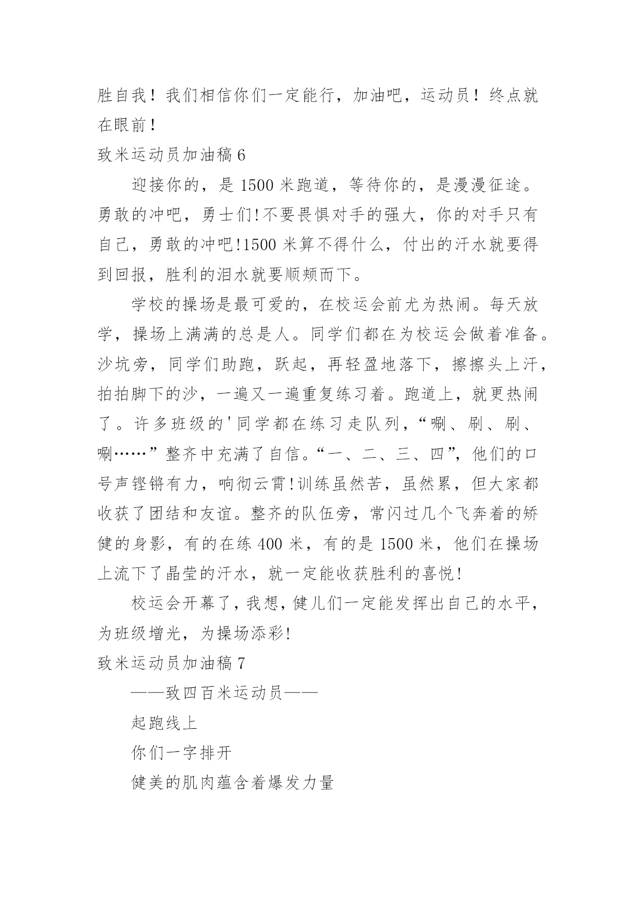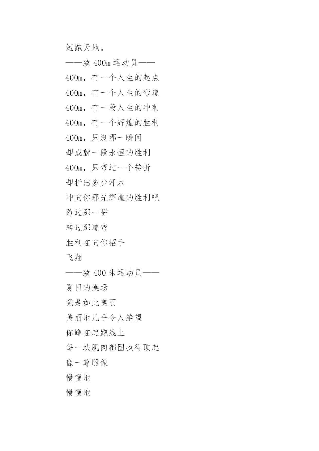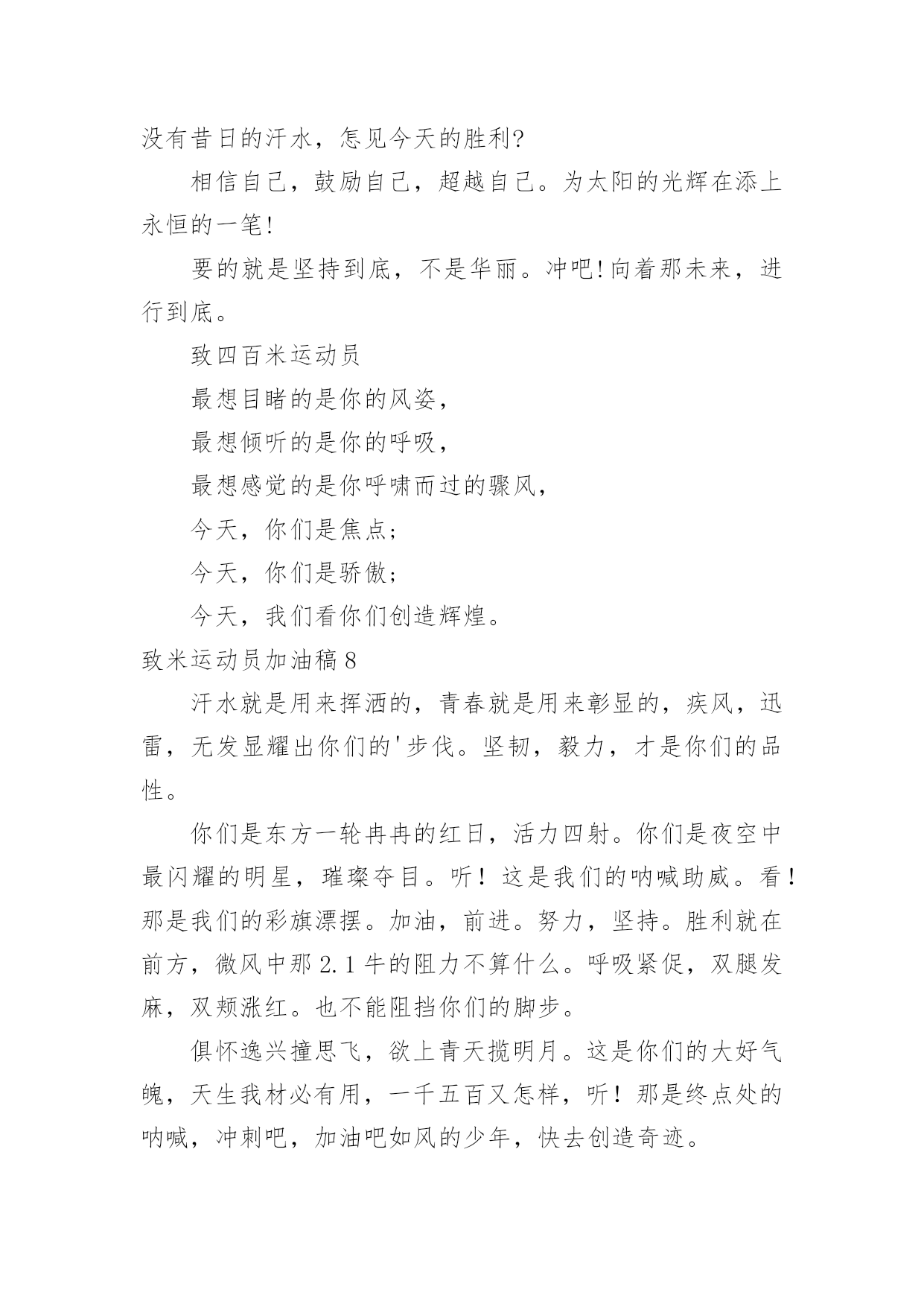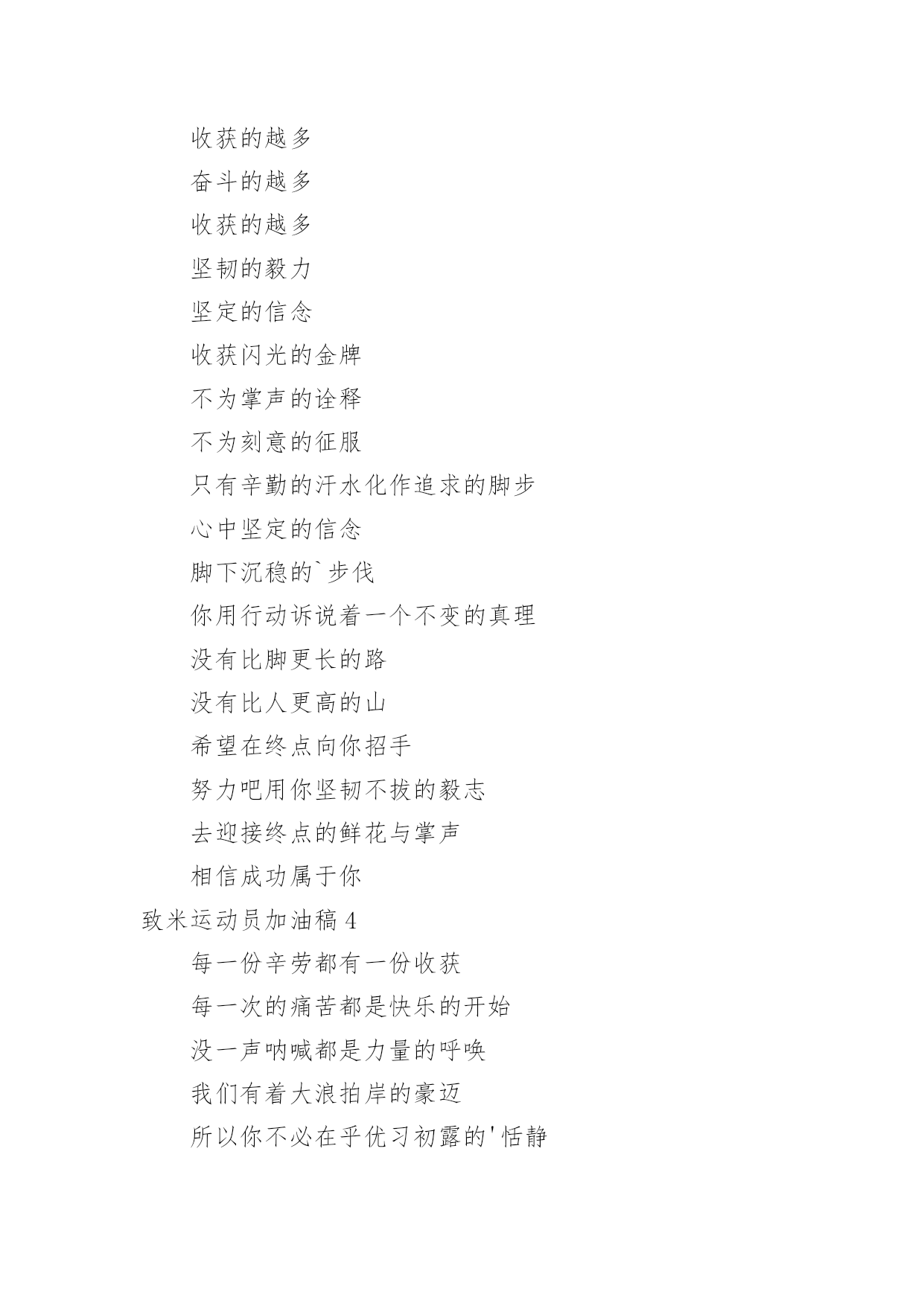 致米运动员加油稿致米运动员加油稿在现实社会中,用到加油稿的地方越来越多,加油稿可以激励对方更好地参加活动。还是对加油稿一筹莫展吗?下面是小编为大家收集的致米运动员加油稿,欢迎阅读与收藏。致米运动员加油稿1倘若力量来自呼吸,呼吸来自生命,生命的真谛注释力量的永恒,呼吸的瞬间注释生命的价值,南无呼吸的艰难,力量的渐逝在此刻都可得到最美的解释,将这美坚持到底,即使失败,也觉得无怨无悔。将这美永驻心底,即使深锁,也永不会退色,所有的这一切,都将在心灵的空中,如彩虹一般,留下美的而永恒的瞬间,此生无悔、人类的.力量在那一刹那展现,拼搏在那一瞬间化为生命的起点,在那一须臾万物化为虚有,只知道,胜利并不遥远,抬起头望望前面,终点线已依稀可见,无数个日日夜夜的辛劳,将在今日兑现。洒一把艰辛的汗水,继续抬起疲倦的脚步,爆发的一吼气贯长虹,继续向前,不论成功与否,你已曾经拥有,曾记否,在终点欢呼,震惊四周。深深的呼吸,等待你的是艰难的1500米。相信胜利会属于你们。但在这征途上,需要你勇敢的心去面对。我们在为你加油,你是否听到了我们发自心中的呐喊?困难和胜利都在向你招手,去呀,快去呀,不要犹豫。快去击败困难、快去夺取胜利!相信你会送给我们一个汗水浸湿的微笑!致800米运动员磨炼的是非凡的毅力。致米运动员加油稿2在那一瞬间,你们像离了弦的箭似流星,如闪电。比赛场上上你们最坚韧,不懈地追求,无悔地跑比赛场上上你们最风采,你追我赶到终点随着一阵热烈的掌声,比赛胜负已分出。胜者继续加油,败者不要气馁互取长补短,相信你们都会收获,加油吧!致米运动员加油稿3在运动场上,有你矫健的生姿!在我们心里,有你欢快的笑容!在跑道上,有你的汗水!1500,是多么的长!在你看来只是小菜一碟!我们为你喝彩!为你加油!YOUarebest!运动会1500米广播稿四:这1500米的跑道,得一气跑完呢?给予的越多收获的越多奋斗的越多收获的越多坚韧的毅力坚定的信念收获闪光的金牌不为掌声的诠释不为刻意的征服只有辛勤的汗水化作追求的脚步心中坚定的信念脚下沉稳的`步伐你用行动诉说着一个不变的真理没有比脚更长的路没有比人更高的山希望在终点向你招手努力吧用你坚韧不拔的毅志去迎接终点的鲜花与掌声相信成功属于你致米运动员加油稿4每一份辛劳都有一份收获每一次的痛苦都是快乐的开始没一声呐喊都是力量的呼唤我们有着大浪拍岸的豪迈所以你不必在乎优习初露的'恬静我们有着春日的阳光明媚所以不用去羡慕冬日乱玉碎琼我们是雨天的一把伞是寒冷冬日里的一盆碳火温暖的不只是你我而是大家的心运动场上的健儿掌声属于你们鲜花属于你们成功也是属于你们致米运动员加油稿5一、磨炼的是非凡的毅力,较量的是超常的体力,拼搏的是出类拔萃的耐力。把长长的跑道跑成一段漫漫的征途,听!呼啸的风在为你喝彩,看!猎猎的彩旗在为你加油,加油吧!为了到达终点时那一刻的辉煌!二、前进的道路上,布满了从生的荆棘,如铁的雄关,如铺霜涌雪,令人想叫苦连天,而我们的运动员们精神可佳、立争第一。健儿们,爆发出自己的潜力,燃烧起心中那炽热的火焰,向第一发起猛攻。“人贵有志”,相信自己,定会成功。三、有多少次挥汗如雨,伤痛曾添满记忆,只因为始终相信,去拼搏才能胜利。总在鼓舞自己,要成功就得努力。热血在赛场沸腾,巨人在赛场升起。相信自己,你将赢得胜利,创造奇迹;相信自己,梦想在你手中,这是你的天地。当一切过去,你们将是第一。相信自己,你们将超越极限,超越自己!相信自己,加油吧,健儿们,相信你自己。四、光,是温暖的;月,是温馨的;星,是浪漫的;风,是清爽的;鱼,是滋润的;雪,是完美的;冰,是晶莹的;而我们的加油,是连绵不断的;希望你们能够加油,奋力拼搏!五、青春在飞扬,个性在张扬,运动场上的运动健儿们,拿出你们的热情,拿出你们的自信,让运动展现你们的风采吧!伴随着激动人心的音乐,你的心一定在跳跃着。让行动证明你们的魅力吧!我们永远支持你们,无论成败,无论结果如何,你们始终是我们心中的英雄。六、400只是一道过场,几秒钟转瞬即逝,但是这背后承载的.是多少成败,加油吧,少年。七、百米战场,枪声炸响,你抬头是勇气是自信,低头是深沉是内敛,只需几秒,那就是永恒。八、400米的跑道上,你正在飞驰,面对如此遥远的路途,你也许腿脚发麻,你也许有些茫然。但你可知道,在你身后,有同学们一双双期待的眼睛;在你身后,是你日日苦练的汗水。鼓起勇气,奋勇向前吧!为了集体的荣誉,为了祖国的明天!九、胜负只在转瞬之间,不管结果怎么样,你们都走到了最后,你们都是最后的胜利者。十、青春的脚步,青春的速度,青春的活力,青春的激情,将会在你们的身上尽情体现。迎接自我,挑战自我,战胜自我!我们相信你们一定能行,加油吧,运动员!终点就在眼前!致米运动员加油稿6迎接你的,是1500米跑道,等待你的,是漫漫征途。