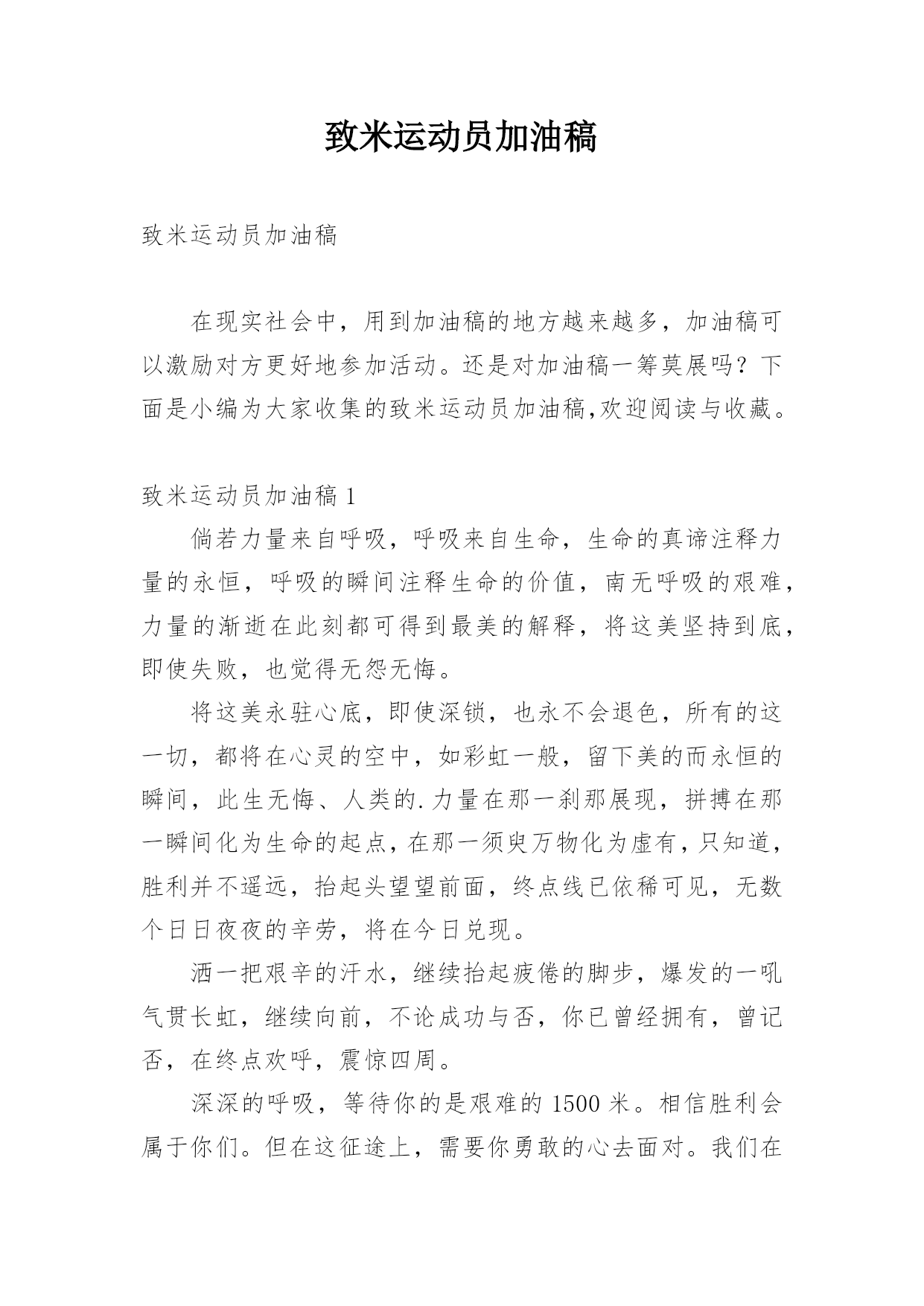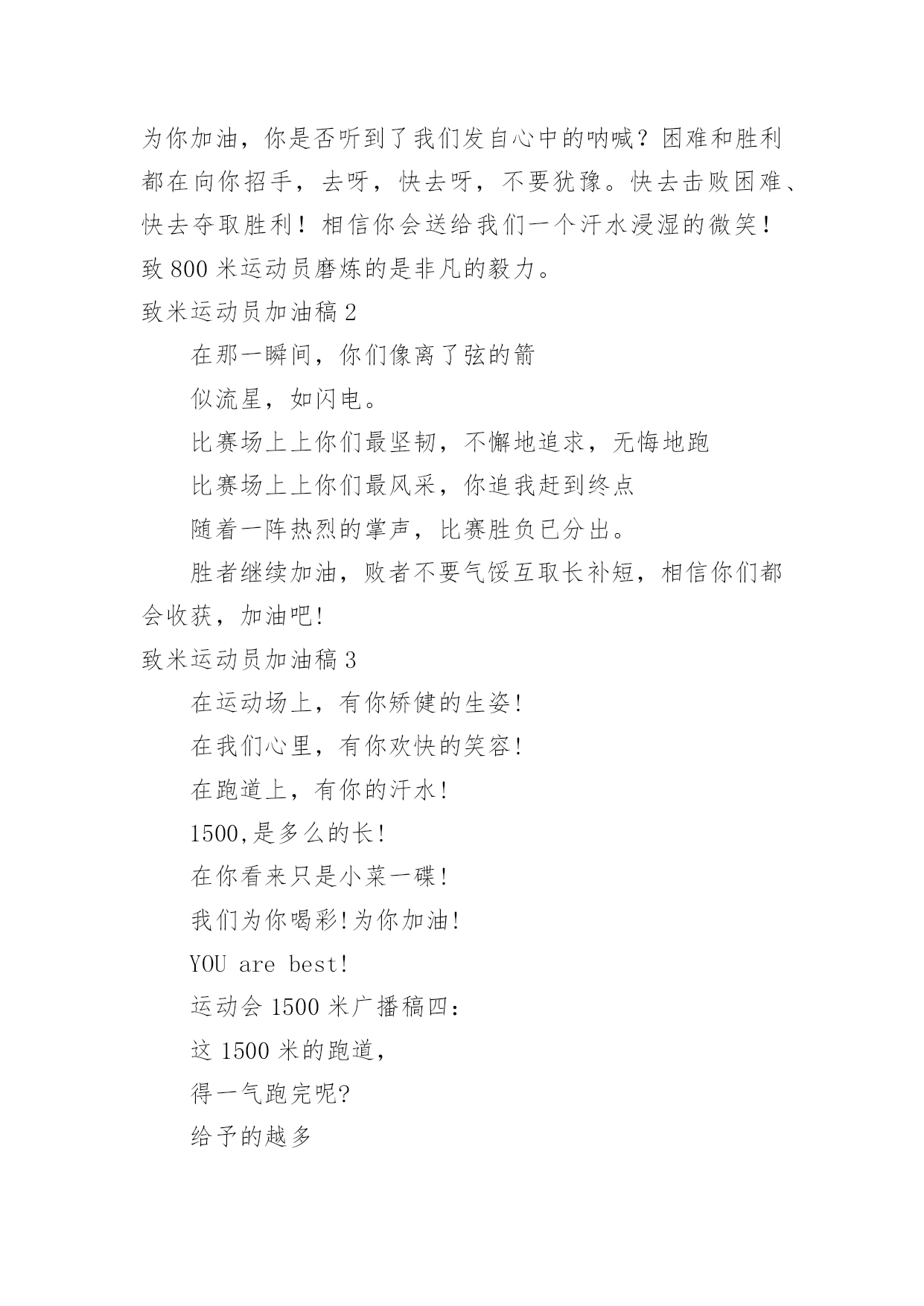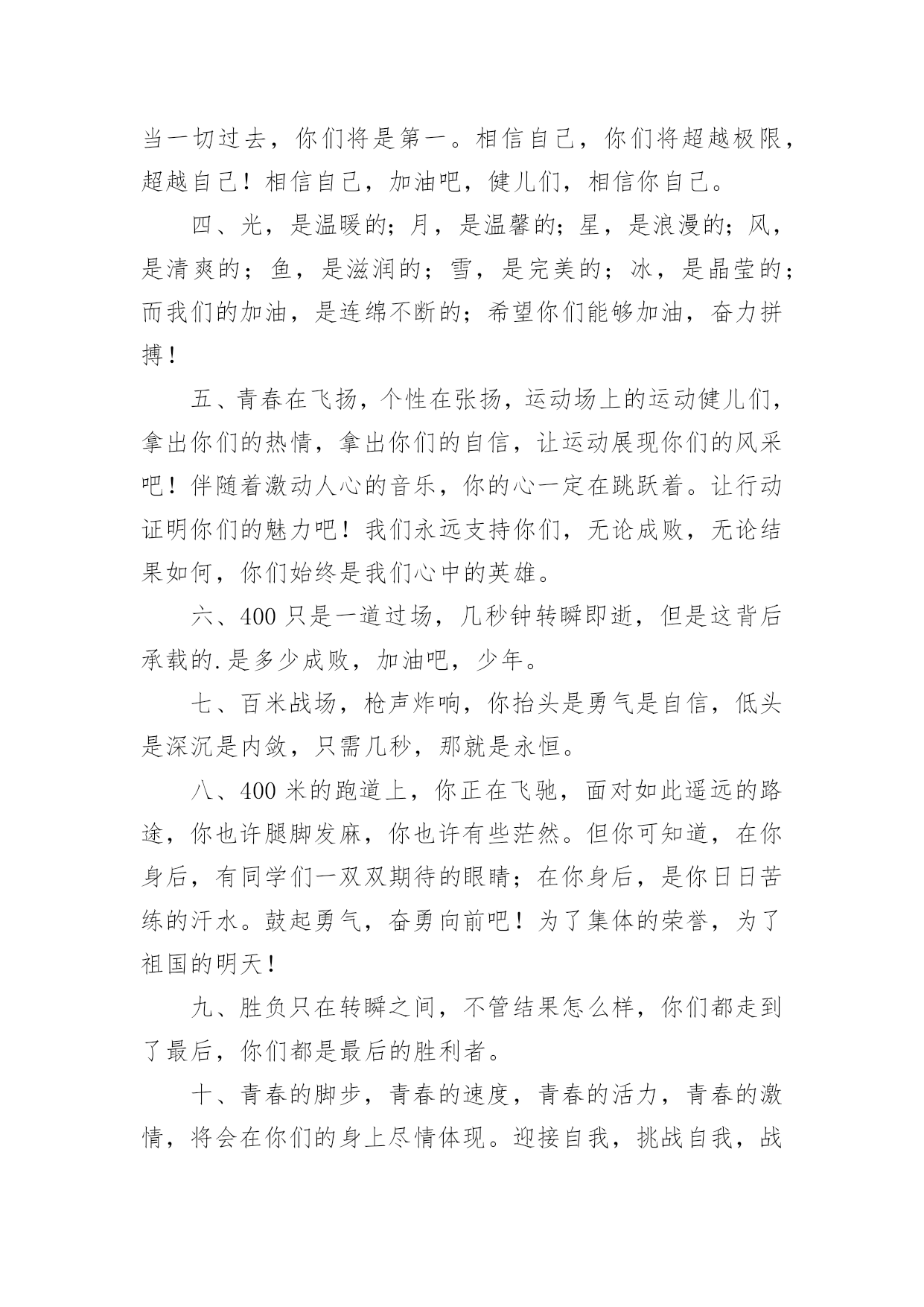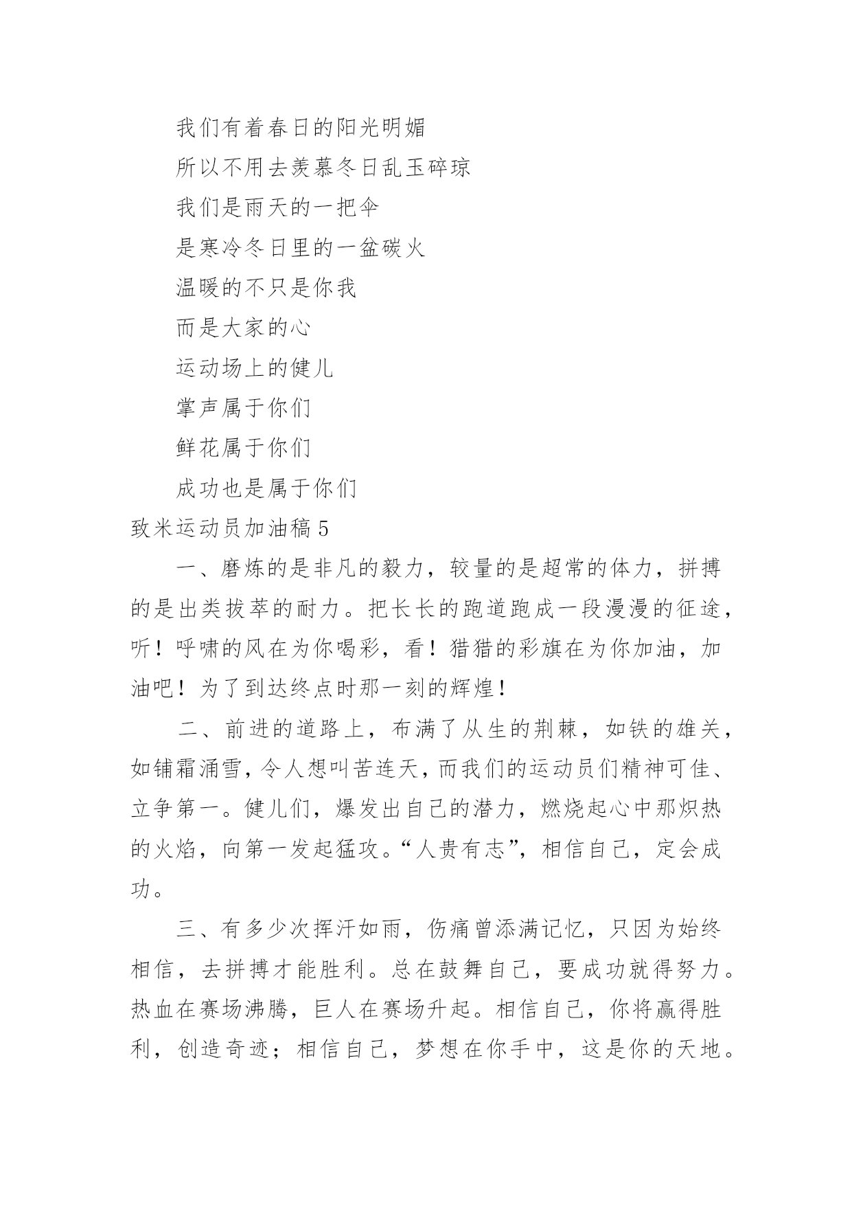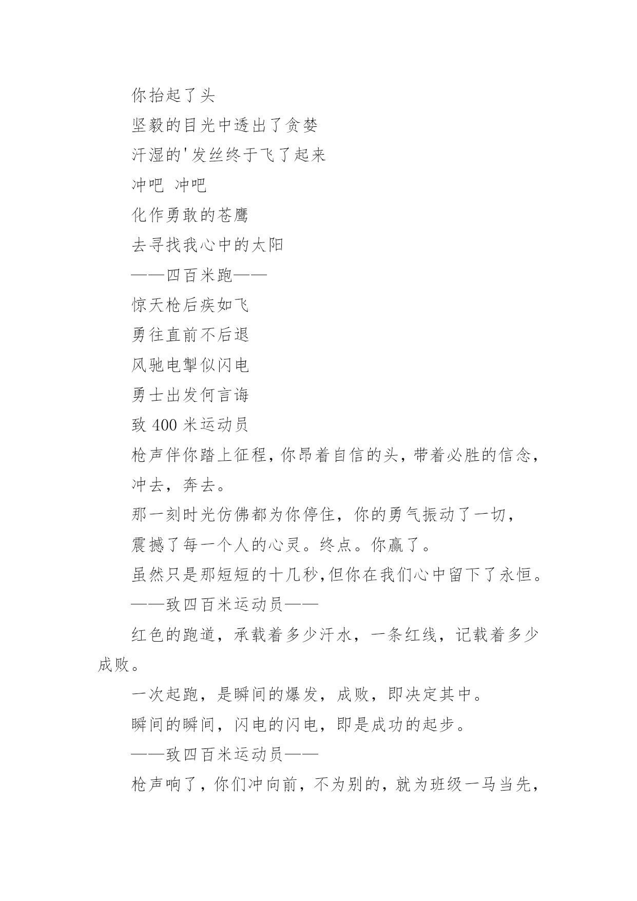 致米运动员加油稿致米运动员加油稿在现实社会中,用到加油稿的地方越来越多,加油稿可以激励对方更好地参加活动。还是对加油稿一筹莫展吗?下面是小编为大家收集的致米运动员加油稿,欢迎阅读与收藏。致米运动员加油稿1倘若力量来自呼吸,呼吸来自生命,生命的真谛注释力量的永恒,呼吸的瞬间注释生命的价值,南无呼吸的艰难,力量的渐逝在此刻都可得到最美的解释,将这美坚持到底,即使失败,也觉得无怨无悔。将这美永驻心底,即使深锁,也永不会退色,所有的这一切,都将在心灵的空中,如彩虹一般,留下美的而永恒的瞬间,此生无悔、人类的.力量在那一刹那展现,拼搏在那一瞬间化为生命的起点,在那一须臾万物化为虚有,只知道,胜利并不遥远,抬起头望望前面,终点线已依稀可见,无数个日日夜夜的辛劳,将在今日兑现。洒一把艰辛的汗水,继续抬起疲倦的脚步,爆发的一吼气贯长虹,继续向前,不论成功与否,你已曾经拥有,曾记否,在终点欢呼,震惊四周。深深的呼吸,等待你的是艰难的1500米。相信胜利会属于你们。但在这征途上,需要你勇敢的心去面对。我们在为你加油,你是否听到了我们发自心中的呐喊?困难和胜利都在向你招手,去呀,快去呀,不要犹豫。快去击败困难、快去夺取胜利!相信你会送给我们一个汗水浸湿的微笑!致800米运动员磨炼的是非凡的毅力。致米运动员加油稿2在那一瞬间,你们像离了弦的箭似流星,如闪电。比赛场上上你们最坚韧,不懈地追求,无悔地跑比赛场上上你们最风采,你追我赶到终点随着一阵热烈的掌声,比赛胜负已分出。胜者继续加油,败者不要气馁互取长补短,相信你们都会收获,加油吧!致米运动员加油稿3在运动场上,有你矫健的生姿!在我们心里,有你欢快的笑容!在跑道上,有你的汗水!1500,是多么的长!在你看来只是小菜一碟!我们为你喝彩!为你加油!YOUarebest!运动会1500米广播稿四:这1500米的跑道,得一气跑完呢?给予的越多收获的越多奋斗的越多收获的越多坚韧的毅力坚定的信念收获闪光的金牌不为掌声的诠释不为刻意的征服只有辛勤的汗水化作追求的脚步心中坚定的信念脚下沉稳的`步伐你用行动诉说着一个不变的真理没有比脚更长的路没有比人更高的山希望在终点向你招手努力吧用你坚韧不拔的毅志去迎接终点的鲜花与掌声相信成功属于你致米运动员加油稿4每一份辛劳都有一份收获每一次的痛苦都是快乐的开始没一声呐喊都是力量的呼唤我们有着大浪拍岸的豪迈所以你不必在乎优习初露的'恬静我们有着春日的阳光明媚所以不用去羡慕冬日乱玉碎琼我们是雨天的一把伞是寒冷冬日里的一盆碳火温暖的不只是你我而是大家的心运动场上的健儿掌声属于你们鲜花属于你们成功也是属于你们致米运动员加油稿5一、磨炼的是非凡的毅力,较量的是超常的体力,拼搏的是出类拔萃的耐力。把长长的跑道跑成一段漫漫的征途,听!呼啸的风在为你喝彩,看!猎猎的彩旗在为你加油,加油吧!为了到达终点时那一刻的辉煌!二、前进的道路上,布满了从生的荆棘,如铁的雄关,如铺霜涌雪,令人想叫苦连天,而我们的运动员们精神可佳、立争第一。健儿们,爆发出自己的潜力,燃烧起心中那炽热的火焰,向第一发起猛攻。“人贵有志”,相信自己,定会成功。三、有多少次挥汗如雨,伤痛曾添满记忆,只因为始终相信,去拼搏才能胜利。总在鼓舞自己,要成功就得努力。热血在赛场沸腾,巨人在赛场升起。相信自己,你将赢得胜利,创造奇迹;相信自己,梦想在你手中,这是你的天地。当一切过去,你们将是第一。相信自己,你们将超越极限,超越自己!相信自己,加油吧,健儿们,相信你自己。四、光,是温暖的;月,是温馨的;星,是浪漫的;风,是清爽的;鱼,是滋润的;雪,是完美的;冰,是晶莹的;而我们的加油,是连绵不断的;希望你们能够加油,奋力拼搏!五、青春在飞扬,个性在张扬,运动场上的运动健儿们,拿出你们的热情,拿出你们的自信,让运动展现你们的风采吧!伴随着激动人心的音乐,你的心一定在跳跃着。让行动证明你们的魅力吧!我们永远支持你们,无论成败,无论结果如何,你们始终是我们心中的英雄。六、400只是一道过场,几秒钟转瞬即逝,但是这背后承载的.是多少成败,加油吧,少年。七、百米战场,枪声炸响,你抬头是勇气是自信,低头是深沉是内敛,只需几秒,那就是永恒。八、400米的跑道上,你正在飞驰,面对如此遥远的路途,你也许腿脚发麻,你也许有些茫然。但你可知道,在你身后,有同学们一双双期待的眼睛;在你身后,是你日日苦练的汗水。鼓起勇气,奋勇向前吧!为了集体的荣誉,为了祖国的明天!九、胜负只在转瞬之间,不管结果怎么样,你们都走到了最后,你们都是最后的胜利者。十、青春的脚步,青春的速度,青春的活力,青春的激情,将会在你们的身上尽情体现。迎接自我,挑战自我,战胜自我!我们相信你们一定能行,加油吧,运动员!终点就在眼前!致米运动员加油稿6迎接你的,是1500米跑道,等待你的,是漫漫征途。