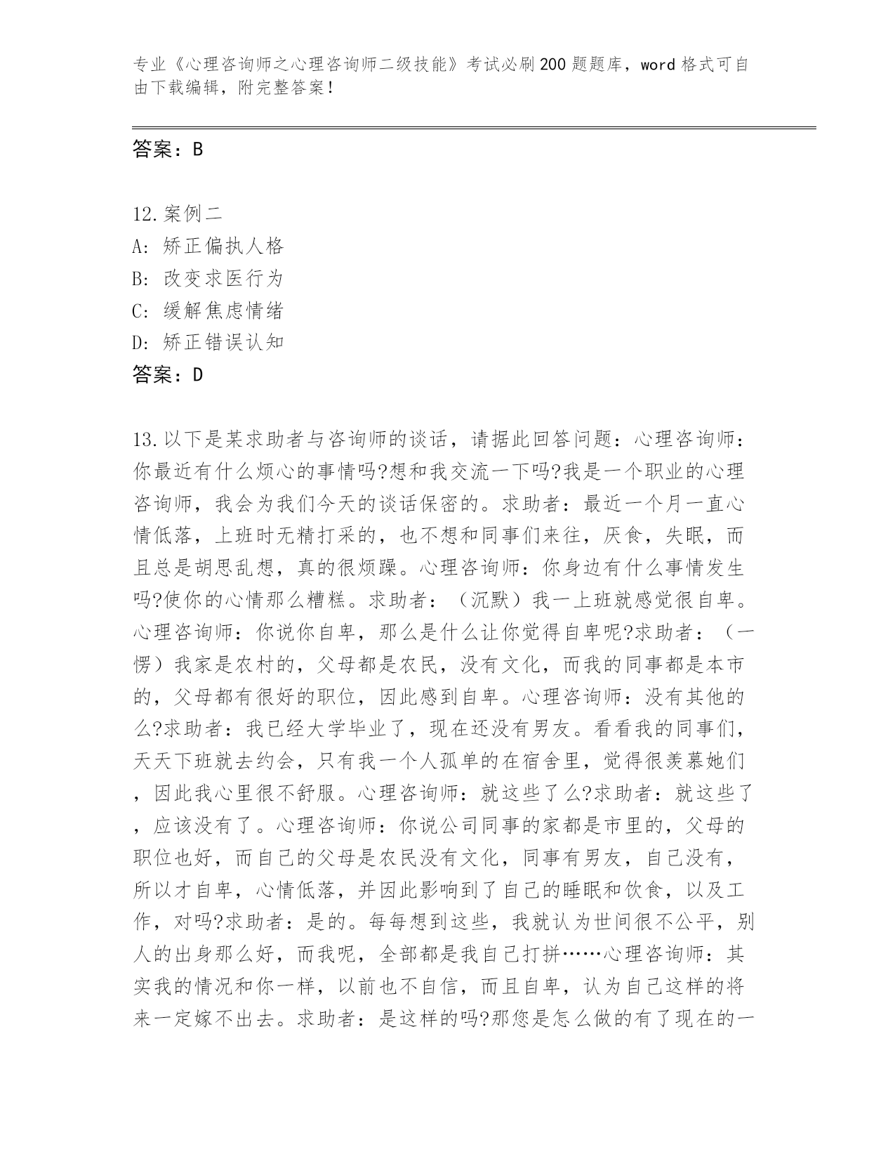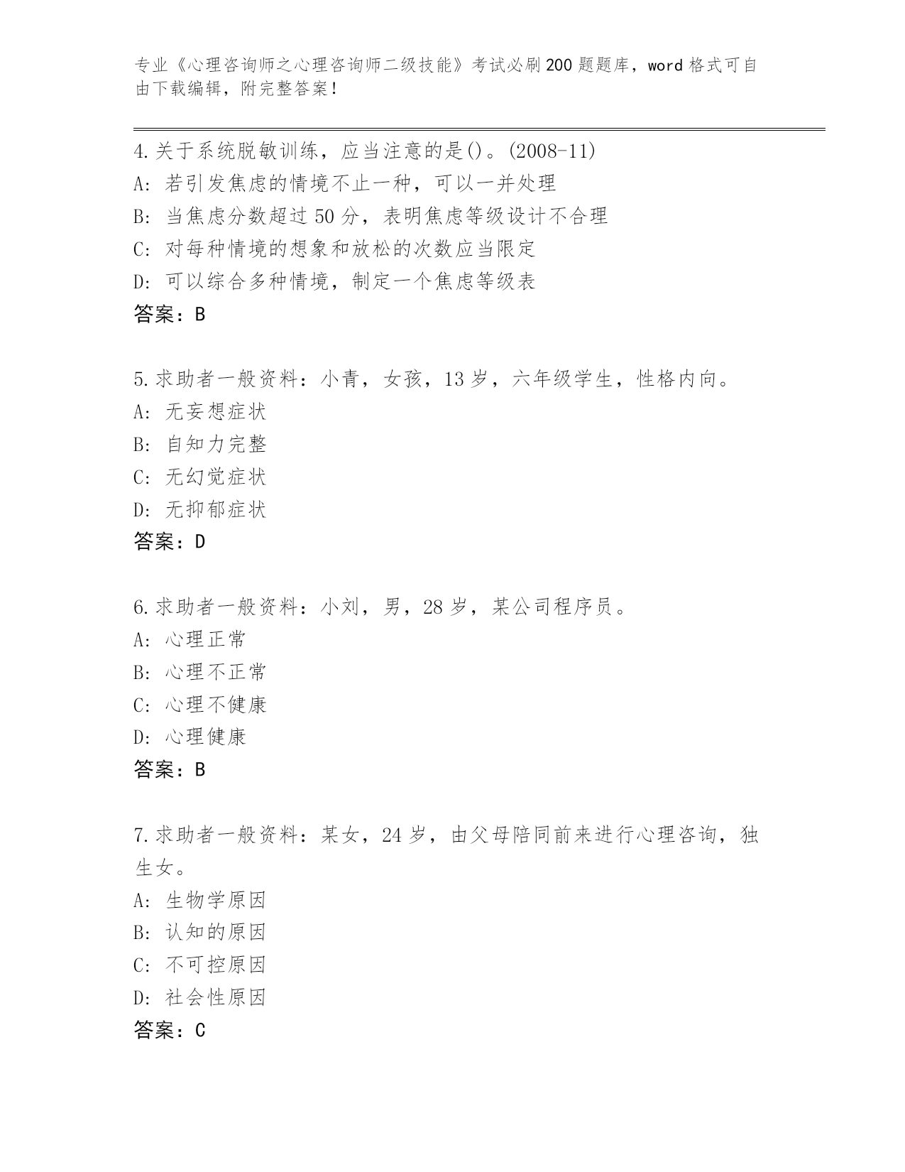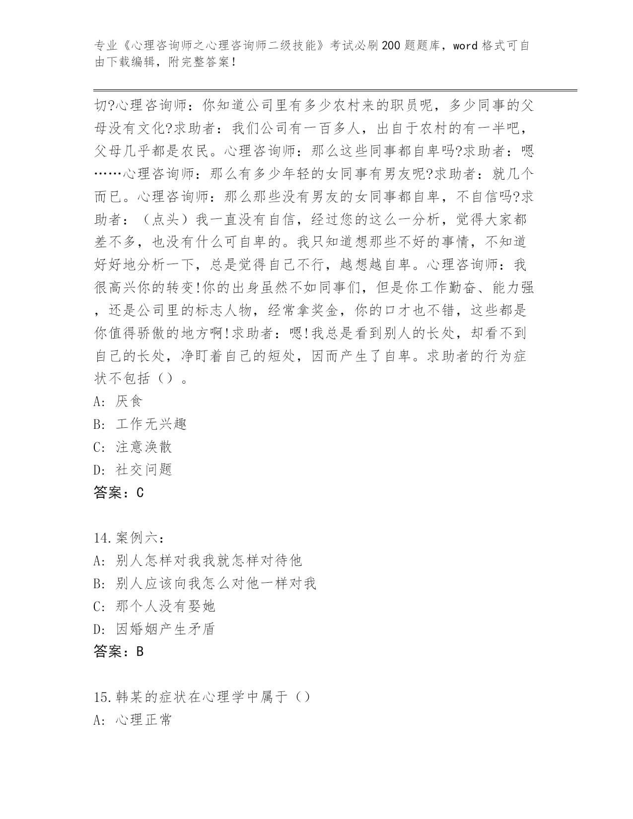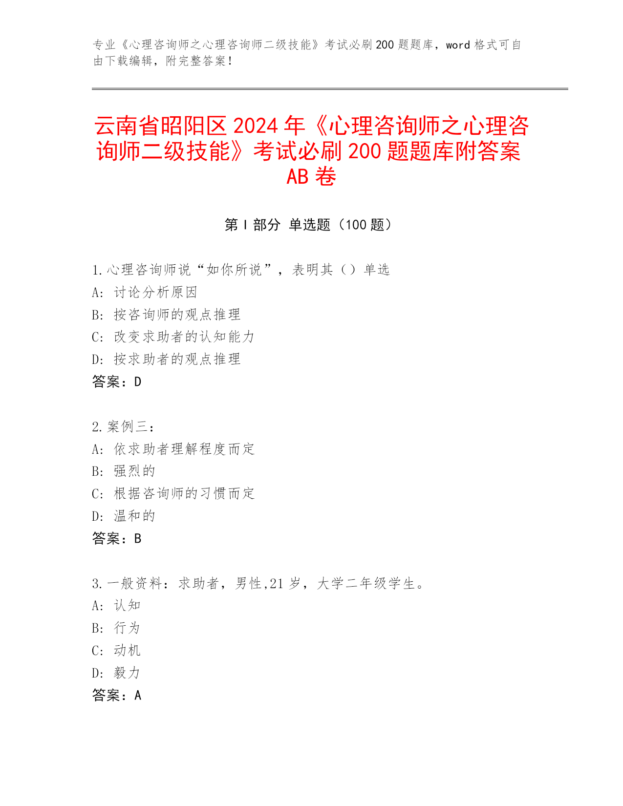 云南省昭阳区2024年《心理咨询师之心理咨询师二级技能》资格考试必背200题附参考答案(综合卷)