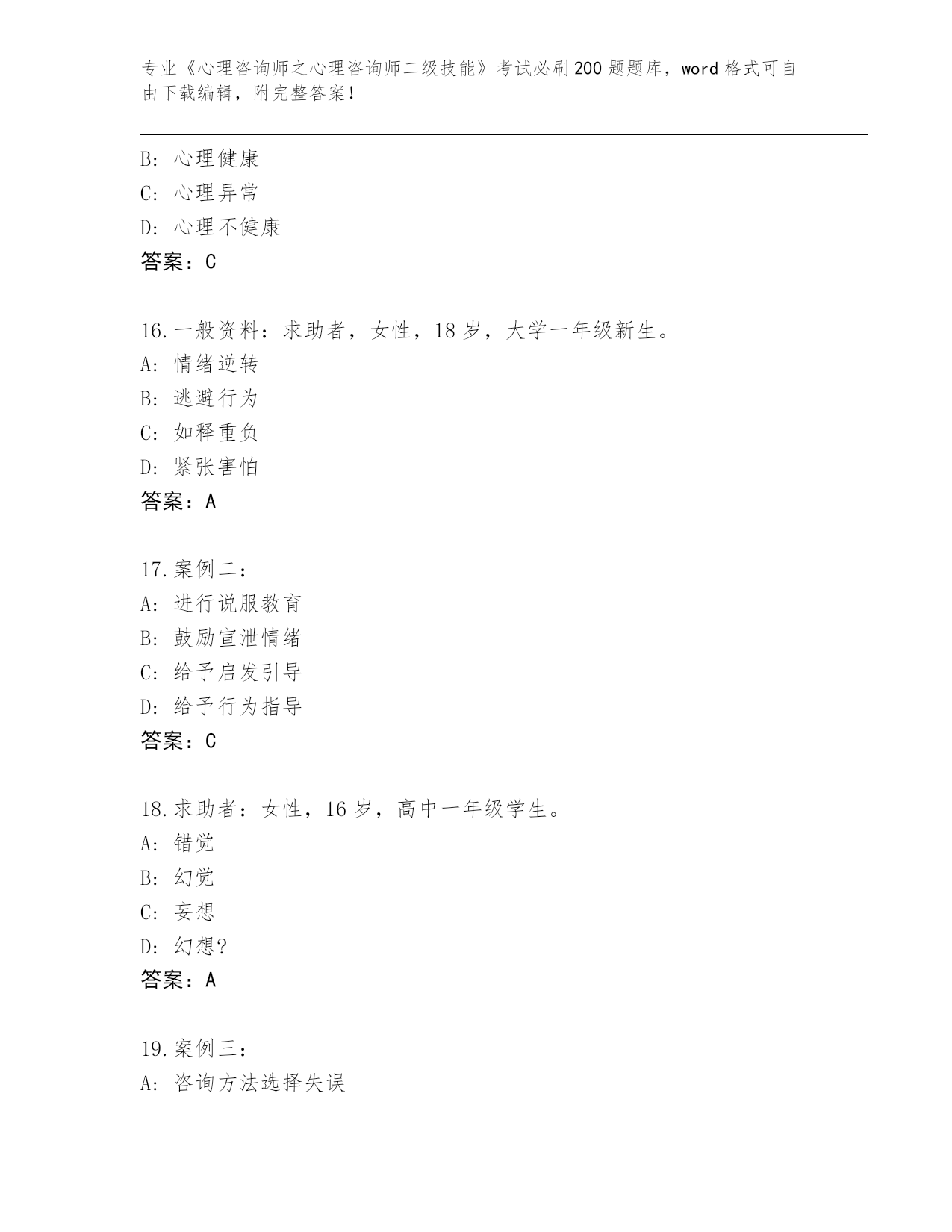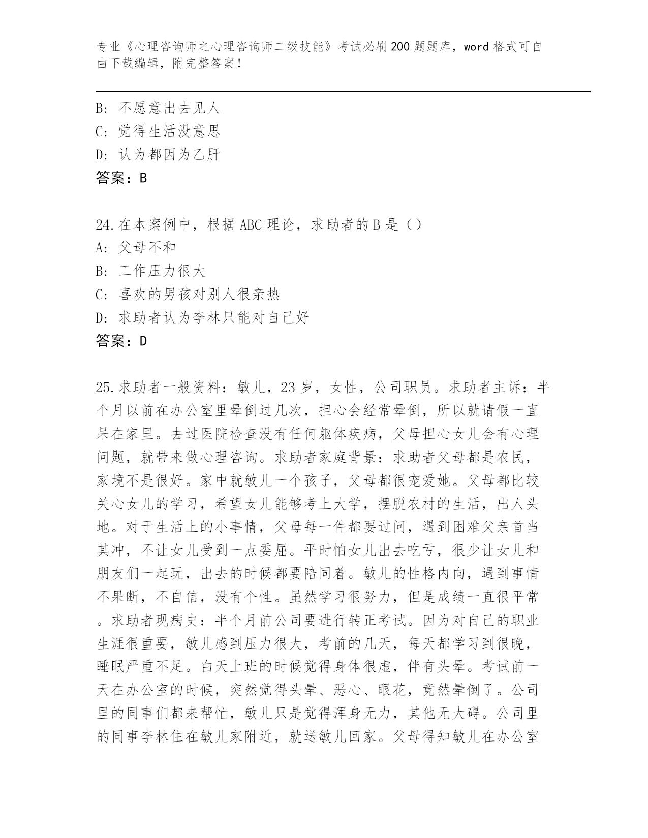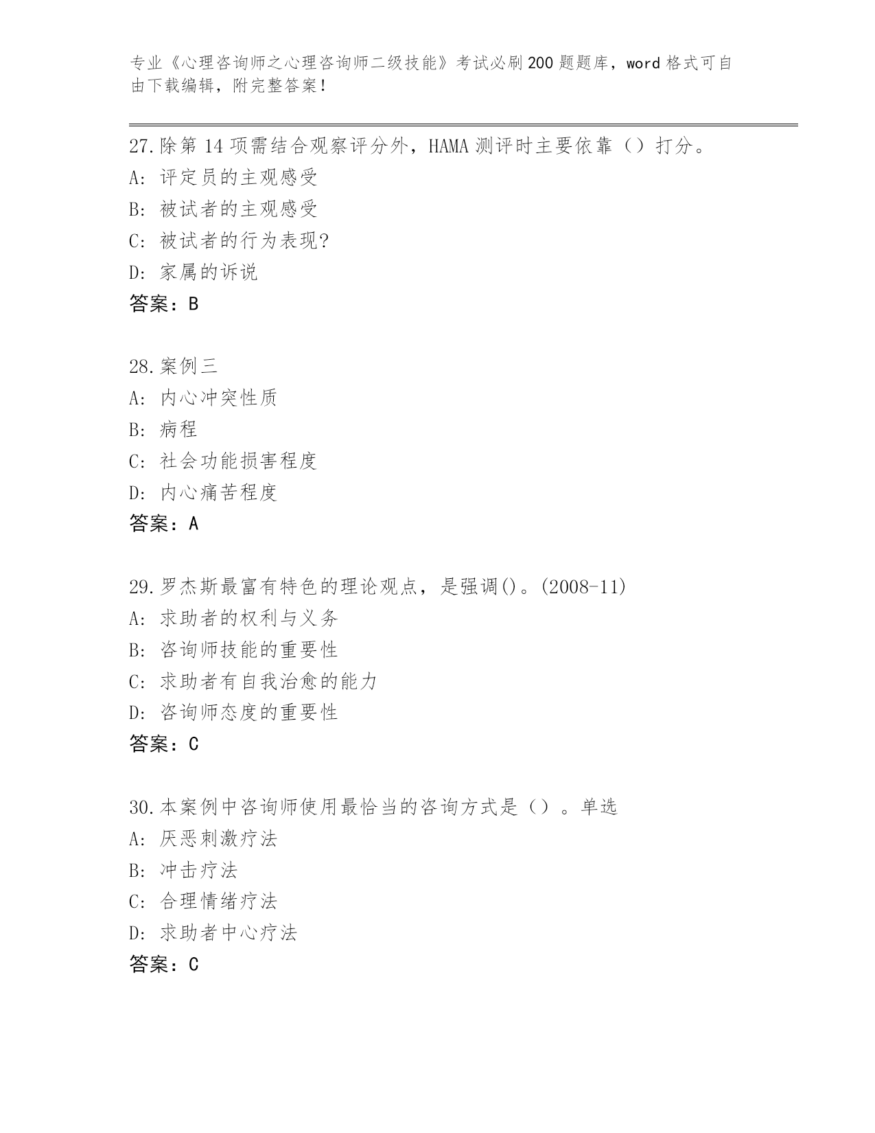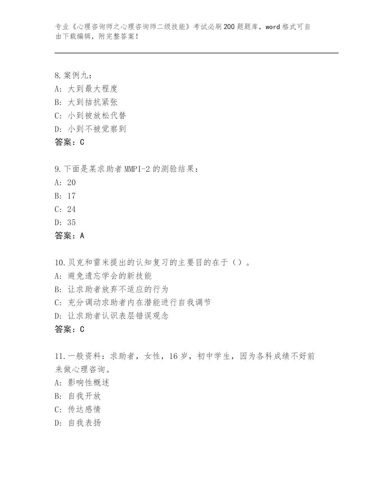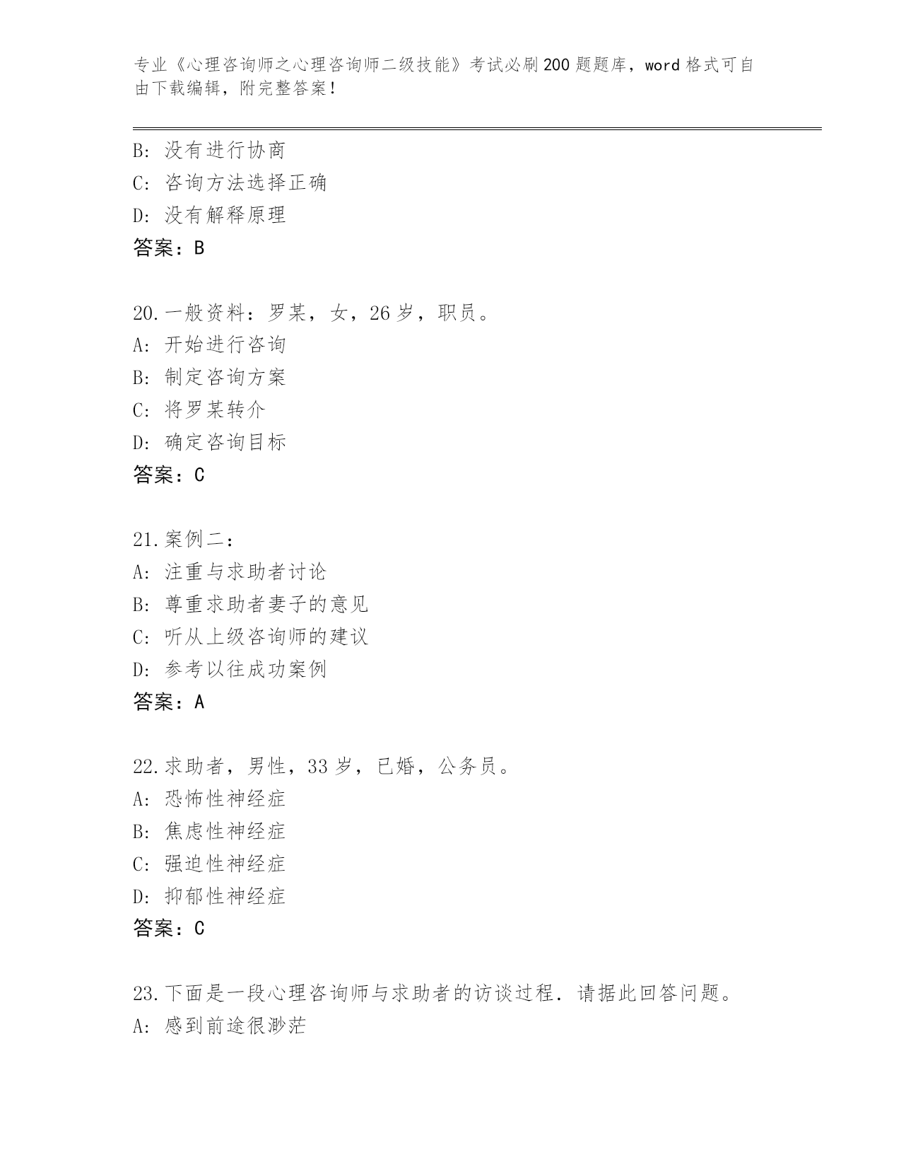 云南省昭阳区2024年《心理咨询师之心理咨询师二级技能》资格考试必背200题附参考答案(综合卷)