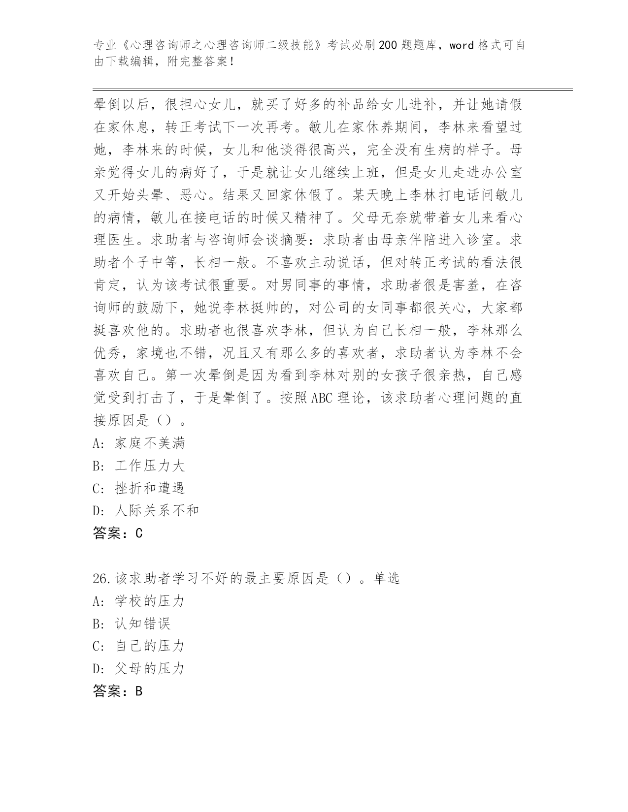 云南省2024《心理咨询师之心理咨询师二级技能》考试必刷200题王牌题库(A卷)