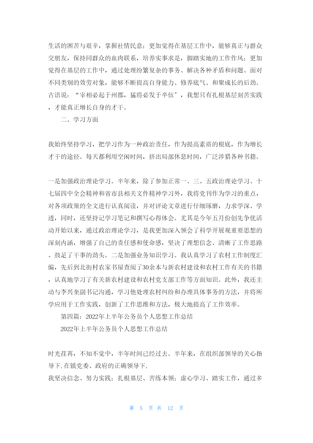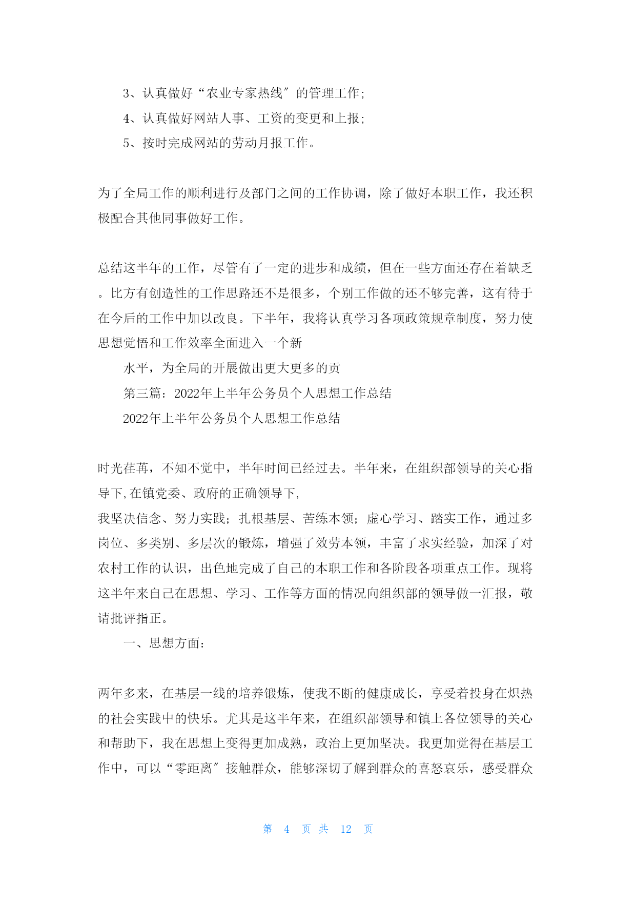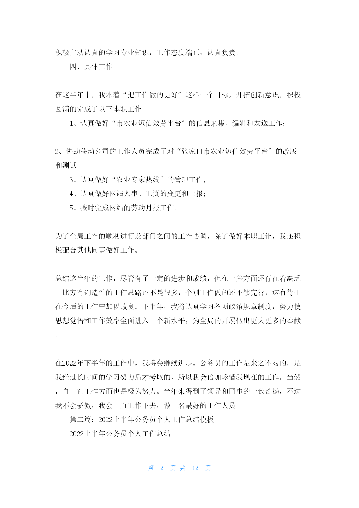 第PAGE12页共NUMPAGES12页上半年公务员工作(gōngzuò)个人总结第一篇:2022年上半年公务员工作(gōngzuò)个人总结自从我成为公务员已经(yǐjing)有半年的时间了,在2022年上半年,我开始(kāishǐ)了我的工作。虽然是我刚刚成为公务员,对自己的工作不是很熟悉,不过在成为公务员之前,我已经工作几年了,所以对工作没有任何的陌生感。我在上半年的工作已经结束了,总之回味起来就是刚开始的时候不是很适应,在经过一个月的工作后,我已经对自己的工作十分的内行了。半年的时间(shíjiān)很快过去了,在这半年中(更多请关注:bsmz.net),我在局领导和同事们的关心与帮助下圆满的完成了各项工作,在思想觉悟方面有了更进一步的提高。为今后取得更大的成绩,纠正缺乏,现将这半年的工作情况汇报如下:一、工作态度和勤奋敬业方面热爱自己的本职工作,能够正确认真的对待每一项工作,工作投入,热心为大家效劳,认真遵守劳动纪律,有效利用工作时间,坚守岗位,需要加班完成工作时加班加点,保证工作能按时完成。二、工作质量成绩、效益和奉献在开展工作之前做好个人工作方案,有主次的先后及时的完成各项工作,到达预期的效果,保质保量的完成工作;同时在工作中学习了很多东西,也锻炼了自己。经过不懈的努力,使工作水平有了长足的进步,开创了工作的新局面,为全局及部门工作做出了应有的奉献。三、思想政治表现、品德素质修养及职业道德能够认真贯彻党的根本路线方针政策,通过报纸、杂志、书籍积极学习政治理论;遵纪守法,认真学习法律知识;爱岗敬业,具有强烈的责任感和事业心,积极主动认真的学习专业知识,工作态度端正,认真负责。四、具体工作在这半年中,我本着“把工作做的更好〞这样一个目标,开拓创新意识,积极圆满的完成了以下本职工作:1、认真做好“市农业短信效劳平台〞的信息采集、编辑和发送工作;2、协助移动公司的工作人员完成了对“张家口市农业短信效劳平台〞的改版和测试;3、认真做好“农业专家热线〞的管理工作;4、认真做好网站人事、工资的变更和上报;5、按时完成网站的劳动月报工作。为了全局工作的顺利进行及部门之间的工作协调,除了做好本职工作,我还积极配合其他同事做好工作。总结这半年的工作,尽管有了一定的进步和成绩,但在一些方面还存在着缺乏。比方有创造性的工作思路还不是很多,个别工作做的还不够完善,这有待于在今后的工作中加以改良。下半年,我将认真学习各项政策规章制度,努力使思想觉悟和工作效率全面进入一个新水平,为全局的开展做出更大更多的奉献。在2022年下半年的工作中,我将会继续进步。公务员的工作是来之不易的,是我经过长时间的学习努力后才考取的,所以我会倍加珍惜我现在的工作。当然,自己在工作方面也是极为努力。半年来得到了领导和同事的一致赞扬,不过我不会骄傲,我会一直工作下去,做一名最好的工作人员。第二篇:2022上半年公务员个人工作总结模板2022上半年公务员个人工作总结半年的时间很快过去了,在这半年中,我在局领导和同事们的关心与帮助下圆满的完成了各项工作,在思想觉悟方面有了更进一步的提高。为今后取得更大的成绩,纠正缺乏,现将这半年的工作情况汇报如下:一、工作态度和勤奋敬业方面热爱自己的本职工作,能够正确认真的对待每一项工作,工作投入,热心为大家效劳,认真遵守劳动纪律,有效利用工作时间,坚守岗位,需要加班完成工作时加班加点,保证工作能按时完成。二、工作质量成绩、效益和奉献在开展工作之前做好个人工作方案,有主次的先后及时的完成各项工作,到达预期的效果,保质保量的完成工作;同时在工作中学习了很多东西,也锻炼了自己。经过不懈的努力,使工作水平有了长足的进步,开创了工作的新局面,为全局及部门工作做出了应有的奉献。三、思想政治表现、品德素质修养及职业道德能够认真贯彻党的根本路线方针政策,通过报纸、杂志、书籍积极学习政治理论;遵纪守法,认真学习法律知识;爱岗敬业,具有强烈的责任感和事业心,积极主动认真的学习专业知识,工作态度端正,认真负责。四、具体工作在这半年中,我本着“把工作做的更好〞这样一个目标,开拓创新意识,积极圆满的完成了以下本职工作:1、认真做好“市农业短信效劳平台〞的信息采集、编辑和发送工作;2、协助移动公司的工作人员完成了对“某某市农业短信效劳平台〞的改版和测试;3、认真做好“农业专家热线〞的管理工作;4、认真做好网站人事、工资的变更和上报;5、按时完成网站的劳动月报工作。为了全局工作的顺利进行及部门之间的工作协调,除了做好本职工作,我还积极配合其他同事做好工作。总结这半年的工作,尽管有了一定的进步和成绩,但在一些方面还存在着缺乏。比方有创造性的工作思路还不是很多,个别工作做的还不够完善,这有待于在今后的工作中加以改良。下半年,我将认真学