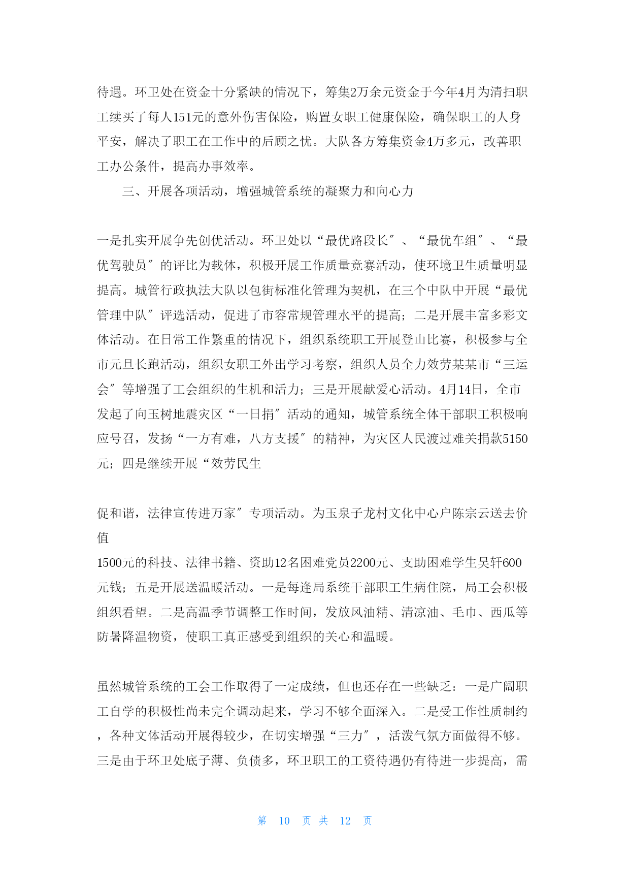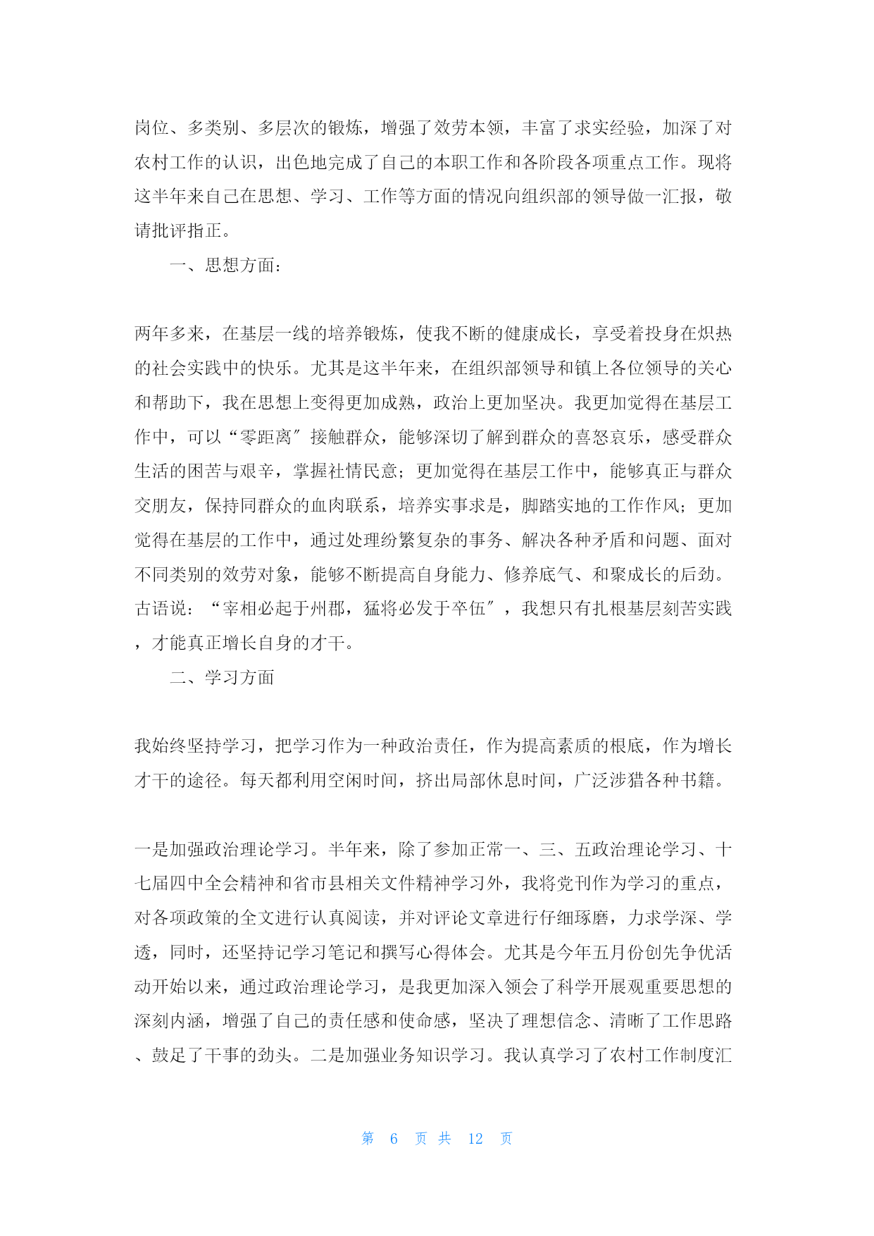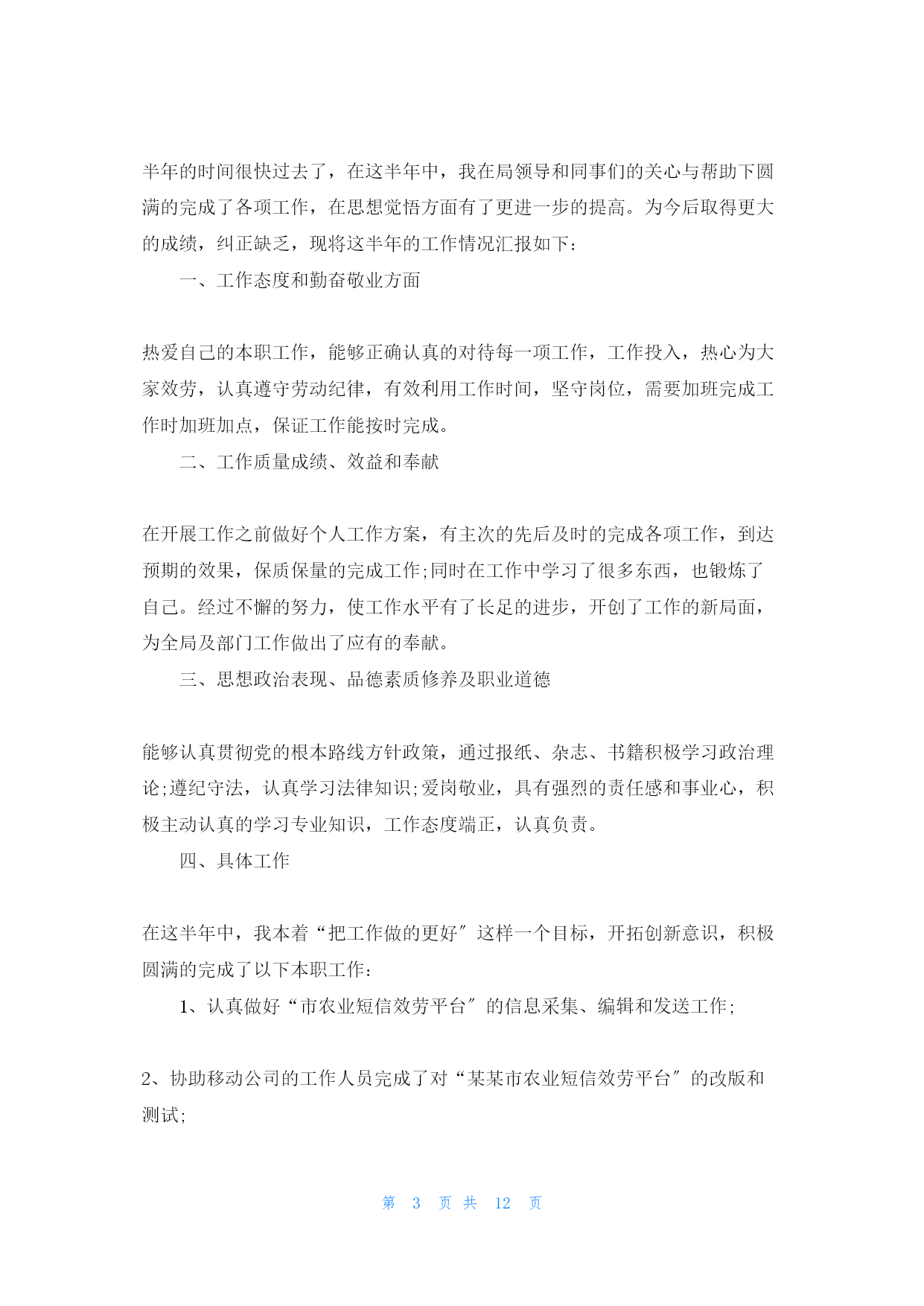 第PAGE12页共NUMPAGES12页上半年公务员工作(gōngzuò)个人总结第一篇:2022年上半年公务员工作(gōngzuò)个人总结自从我成为公务员已经(yǐjing)有半年的时间了,在2022年上半年,我开始(kāishǐ)了我的工作。虽然是我刚刚成为公务员,对自己的工作不是很熟悉,不过在成为公务员之前,我已经工作几年了,所以对工作没有任何的陌生感。我在上半年的工作已经结束了,总之回味起来就是刚开始的时候不是很适应,在经过一个月的工作后,我已经对自己的工作十分的内行了。半年的时间(shíjiān)很快过去了,在这半年中(更多请关注:bsmz.net),我在局领导和同事们的关心与帮助下圆满的完成了各项工作,在思想觉悟方面有了更进一步的提高。为今后取得更大的成绩,纠正缺乏,现将这半年的工作情况汇报如下:一、工作态度和勤奋敬业方面热爱自己的本职工作,能够正确认真的对待每一项工作,工作投入,热心为大家效劳,认真遵守劳动纪律,有效利用工作时间,坚守岗位,需要加班完成工作时加班加点,保证工作能按时完成。二、工作质量成绩、效益和奉献在开展工作之前做好个人工作方案,有主次的先后及时的完成各项工作,到达预期的效果,保质保量的完成工作;同时在工作中学习了很多东西,也锻炼了自己。经过不懈的努力,使工作水平有了长足的进步,开创了工作的新局面,为全局及部门工作做出了应有的奉献。三、思想政治表现、品德素质修养及职业道德能够认真贯彻党的根本路线方针政策,通过报纸、杂志、书籍积极学习政治理论;遵纪守法,认真学习法律知识;爱岗敬业,具有强烈的责任感和事业心,积极主动认真的学习专业知识,工作态度端正,认真负责。四、具体工作在这半年中,我本着“把工作做的更好〞这样一个目标,开拓创新意识,积极圆满的完成了以下本职工作:1、认真做好“市农业短信效劳平台〞的信息采集、编辑和发送工作;2、协助移动公司的工作人员完成了对“张家口市农业短信效劳平台〞的改版和测试;3、认真做好“农业专家热线〞的管理工作;4、认真做好网站人事、工资的变更和上报;5、按时完成网站的劳动月报工作。为了全局工作的顺利进行及部门之间的工作协调,除了做好本职工作,我还积极配合其他同事做好工作。总结这半年的工作,尽管有了一定的进步和成绩,但在一些方面还存在着缺乏。比方有创造性的工作思路还不是很多,个别工作做的还不够完善,这有待于在今后的工作中加以改良。下半年,我将认真学习各项政策规章制度,努力使思想觉悟和工作效率全面进入一个新水平,为全局的开展做出更大更多的奉献。在2022年下半年的工作中,我将会继续进步。公务员的工作是来之不易的,是我经过长时间的学习努力后才考取的,所以我会倍加珍惜我现在的工作。当然,自己在工作方面也是极为努力。半年来得到了领导和同事的一致赞扬,不过我不会骄傲,我会一直工作下去,做一名最好的工作人员。第二篇:2022上半年公务员个人工作总结模板2022上半年公务员个人工作总结半年的时间很快过去了,在这半年中,我在局领导和同事们的关心与帮助下圆满的完成了各项工作,在思想觉悟方面有了更进一步的提高。为今后取得更大的成绩,纠正缺乏,现将这半年的工作情况汇报如下:一、工作态度和勤奋敬业方面热爱自己的本职工作,能够正确认真的对待每一项工作,工作投入,热心为大家效劳,认真遵守劳动纪律,有效利用工作时间,坚守岗位,需要加班完成工作时加班加点,保证工作能按时完成。二、工作质量成绩、效益和奉献在开展工作之前做好个人工作方案,有主次的先后及时的完成各项工作,到达预期的效果,保质保量的完成工作;同时在工作中学习了很多东西,也锻炼了自己。经过不懈的努力,使工作水平有了长足的进步,开创了工作的新局面,为全局及部门工作做出了应有的奉献。三、思想政治表现、品德素质修养及职业道德能够认真贯彻党的根本路线方针政策,通过报纸、杂志、书籍积极学习政治理论;遵纪守法,认真学习法律知识;爱岗敬业,具有强烈的责任感和事业心,积极主动认真的学习专业知识,工作态度端正,认真负责。四、具体工作在这半年中,我本着“把工作做的更好〞这样一个目标,开拓创新意识,积极圆满的完成了以下本职工作:1、认真做好“市农业短信效劳平台〞的信息采集、编辑和发送工作;2、协助移动公司的工作人员完成了对“某某市农业短信效劳平台〞的改版和测试;3、认真做好“农业专家热线〞的管理工作;4、认真做好网站人事、工资的变更和上报;5、按时完成网站的劳动月报工作。为了全局工作的顺利进行及部门之间的工作协调,除了做好本职工作,我还积极配合其他同事做好工作。总结这半年的工作,尽管有了一定的进步和成绩,但在一些方面还存在着缺乏。比方有创造性的工作思路还不是很多,个别工作做的还不够完善,这有待于在今后的工作中加以改良。下半年,我将认真学