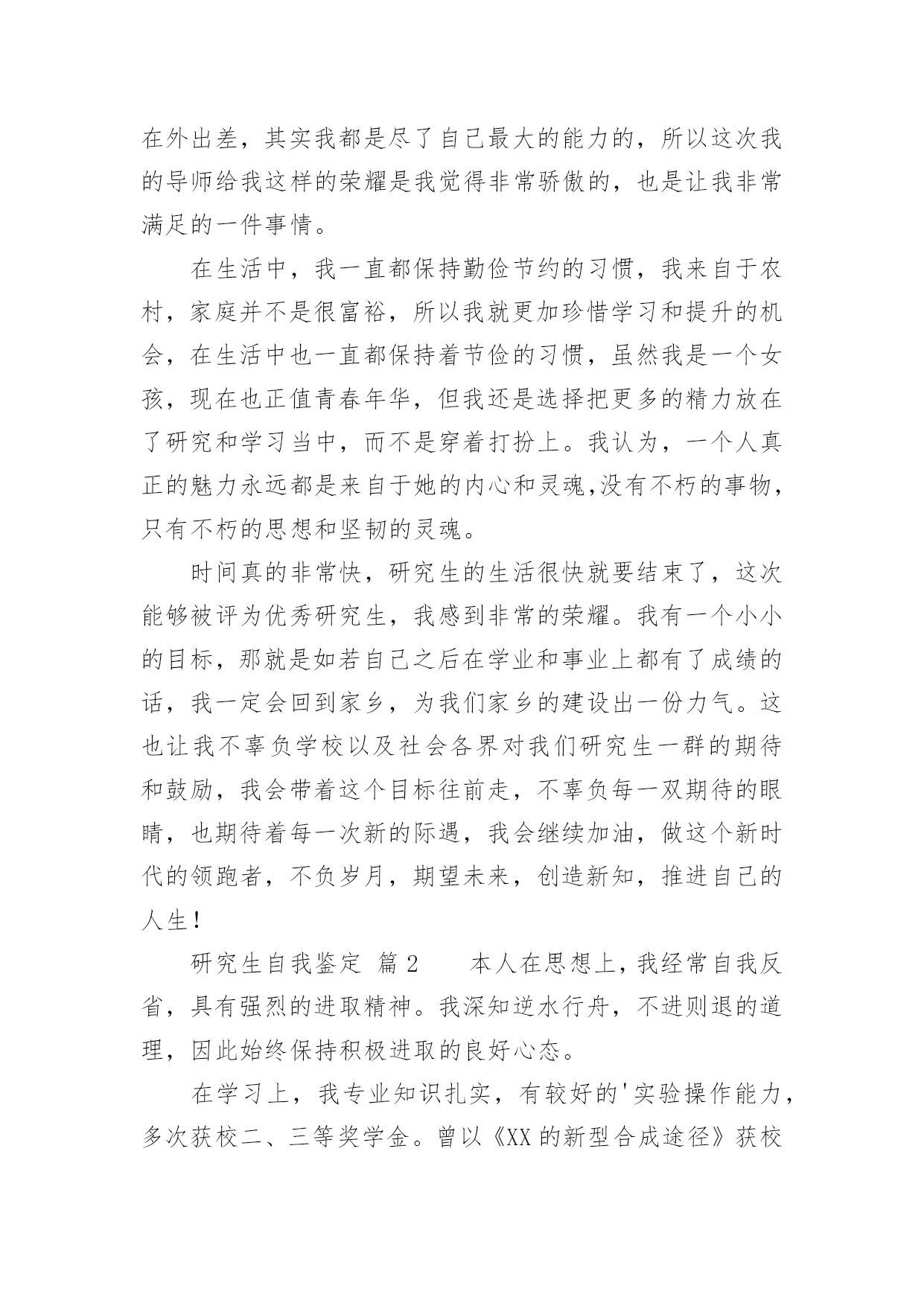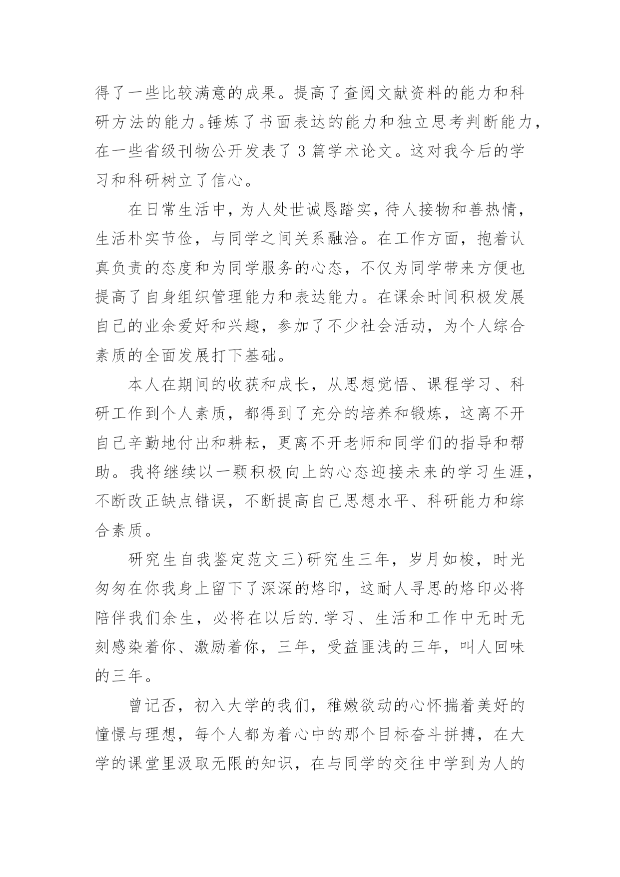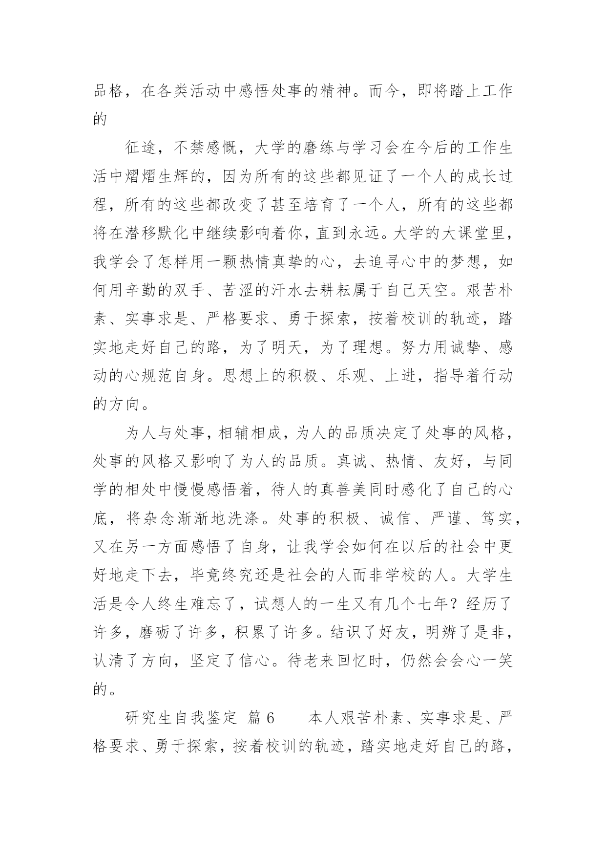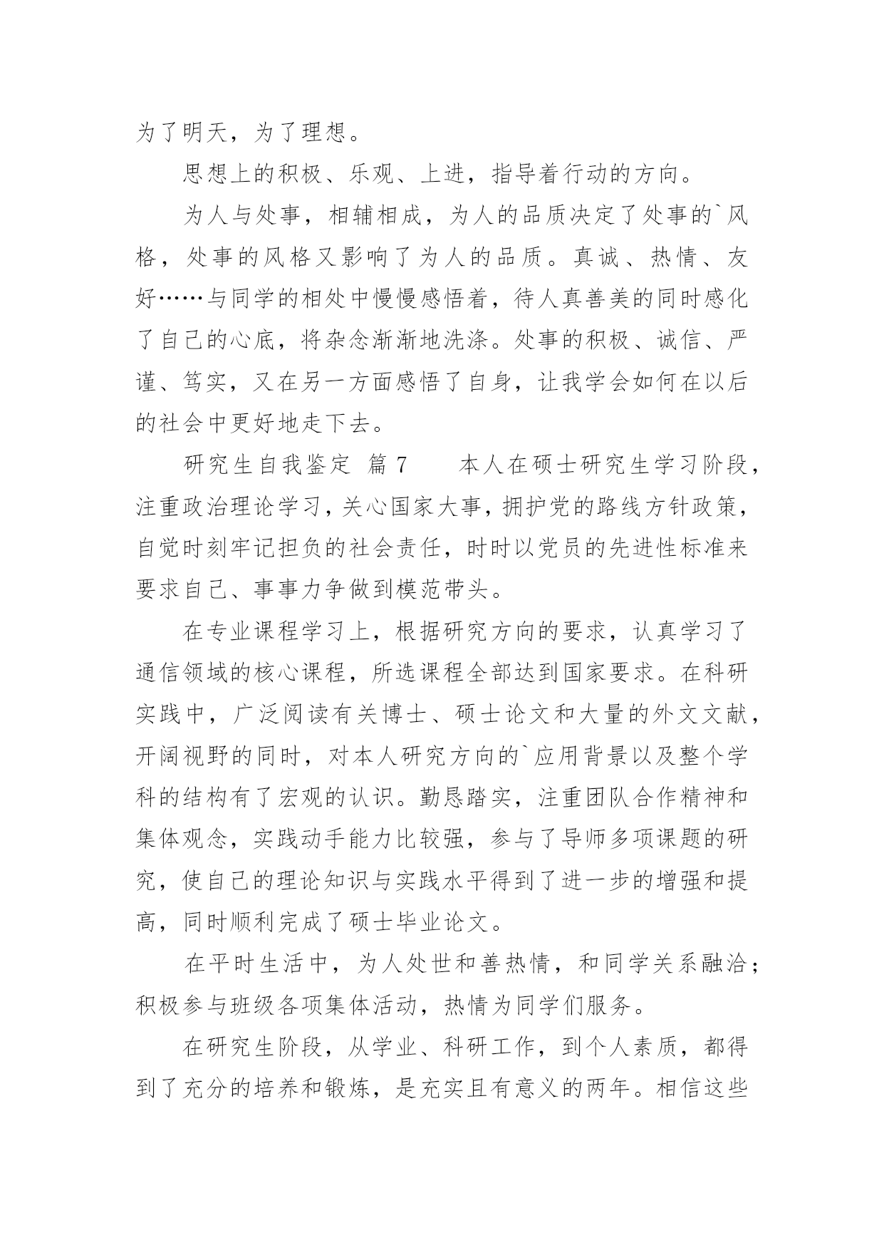 研究生自我鉴定研究生自我鉴定(精选)自我鉴定是个人对一个时期的学习或工作进行自我总结,它可以帮助我们了解自己的优点和缺点,让我们一起认真地写一份自我鉴定吧。自我鉴定怎么写才不会千篇一律呢?下面是小编整理的研究生自我鉴定,欢迎大家分享。研究生自我鉴定篇1进入研究生阶段以来,我一直以自勤、自勉、自强、自重来要求自己。在之前考取研究生之时,我就意识到,其实在追求知识的路上,并不是只为了一个结果,而是为了找到一个关于我们每个人一生的真理。有时候想一想其实就会发现,当我们真正回顾过去的时候,我们看到的都是不同的自己,人的一生为了一个真理而拼搏努力,我认为这也是一件非常伟大的事情。就像我这一次读研一样,其实在平时的学习中,困难有很多,不知有多少个夜晚曾辗转反侧,但是当我走到了如今的时候,觉得眼前甚是明亮,我的`时光甚是可恋、可期。在学习上,我保持一个非常明确的态度,那就是不断去完善自我。已经进入研究生阶段了,我不再是曾经的那个小孩,也不是大学的那个懵懂青年了,我的身上承载了更多的东西,也需要去创造更多的东西。研究生,这三个字听起来让人崇拜和向往,但是想要真正做好这三个字是何其难呢?这几年,我一直跟着导师不断的奔波,不管是在校学习还是在外出差,其实我都是尽了自己最大的能力的,所以这次我的导师给我这样的荣耀是我觉得非常骄傲的,也是让我非常满足的一件事情。在生活中,我一直都保持勤俭节约的习惯,我来自于农村,家庭并不是很富裕,所以我就更加珍惜学习和提升的机会,在生活中也一直都保持着节俭的习惯,虽然我是一个女孩,现在也正值青春年华,但我还是选择把更多的精力放在了研究和学习当中,而不是穿着打扮上。我认为,一个人真正的魅力永远都是来自于她的内心和灵魂,没有不朽的事物,只有不朽的思想和坚韧的灵魂。时间真的非常快,研究生的生活很快就要结束了,这次能够被评为优秀研究生,我感到非常的荣耀。我有一个小小的目标,那就是如若自己之后在学业和事业上都有了成绩的话,我一定会回到家乡,为我们家乡的建设出一份力气。这也让我不辜负学校以及社会各界对我们研究生一群的期待和鼓励,我会带着这个目标往前走,不辜负每一双期待的眼睛,也期待着每一次新的际遇,我会继续加油,做这个新时代的领跑者,不负岁月,期望未来,创造新知,推进自己的人生!研究生自我鉴定篇2本人在思想上,我经常自我反省,具有强烈的进取精神。我深知逆水行舟,不进则退的道理,因此始终保持积极进取的良好心态。在学习上,我专业知识扎实,有较好的'实验操作能力,多次获校二、三等奖学金。曾以《XX的新型合成途径》获校课外科技作品大赛一等奖。在生活上,我积极参与学院、学校组织的活动,篮球赛、XX湖泛灯、厨艺大赛等等,丰富自己的课余生活。我为人正直善良,有良好的生活作风,乐于帮助他人,与同学相处融洽,受同学欢迎。三年的研究生生活,我通过学业学习、社会实践和工作来不断地充实自我,完善自我,为日后的人生道路打下良好的基础。研究生自我鉴定篇3尊敬的领导:您好!我是20xx级博士研究生,现应聘思想理论教育研究岗位,我叫高xx。从20xx年9月至今的两年时间里,我担任政治辅导员工作,负责经济与管理学院将近1200名学生的综合测评、困难生、奖助学和学风建设工作,参与学院学生工作刊物《财经人》和《经济与管理学院学生工作简报》的编辑出版工作,热爱新闻报道,具有一定的新闻敏感性。本人写作能力较强,基本能够胜任新闻报道、通讯等采写工作。我先后指导的毕业论文有5篇,从奥运会到广东省宏观经济变革,从管理培训生制度到大学生网络创业,从大学生成长成才到我所建立的全校独一无二的“辅导员半月谈”博客,我都有广泛的涉猎和一定的研究。先后对建国六十周年的启示、考研、毕业、恋爱、读书、辩论、科学发展观等影响大学生发展的重大问题进行了阐述,其中《论落实个人的科学发展观》等数篇文章被《中国高校辅导员》电子杂志全文转载。本人热爱中国共产党,热爱社会主义祖国,爱憎分明,有坚定的政治信念。20xx年9月,我进入中共广东省委党校攻读经济学硕士学位,研究方向为社会主义市场经济。20xx年9月,中央建设和谐社会的决策刚正式提出,我就在《广州日报》上发表文章,为之欢呼呐喊,并于20xx年11月光荣加入中国共产党。我在20xx年研究生毕业后的工作都直接与学生管理相关,先是在肇庆医学高等专科学校思想政治理论部担任教师,主要担任《形势与政策》、《思想道德修养和法律基础》的教学工作,同时兼任班主任工作。我本着对党的教育事业负责任的态度,努力学习领会党的理论、特别是xx大等重要会议的精神,努力实现书本理论和现实生活相结合,先后作了北京奥运会、思想大解放推动大发展、WTO和中东问题等国际、国内热点问题,学生反映热烈,达到了启蒙、甚至发人深省的作用。本人具有一定的政治理论功底。我所讲授过《形势与政策》课