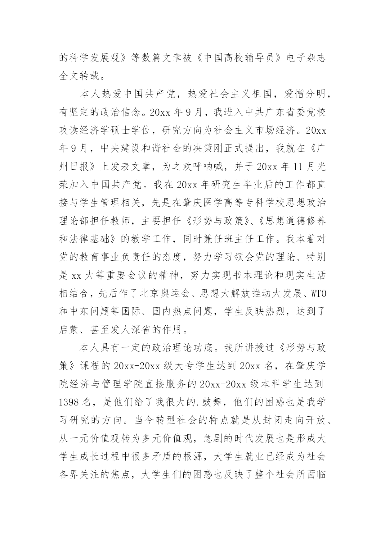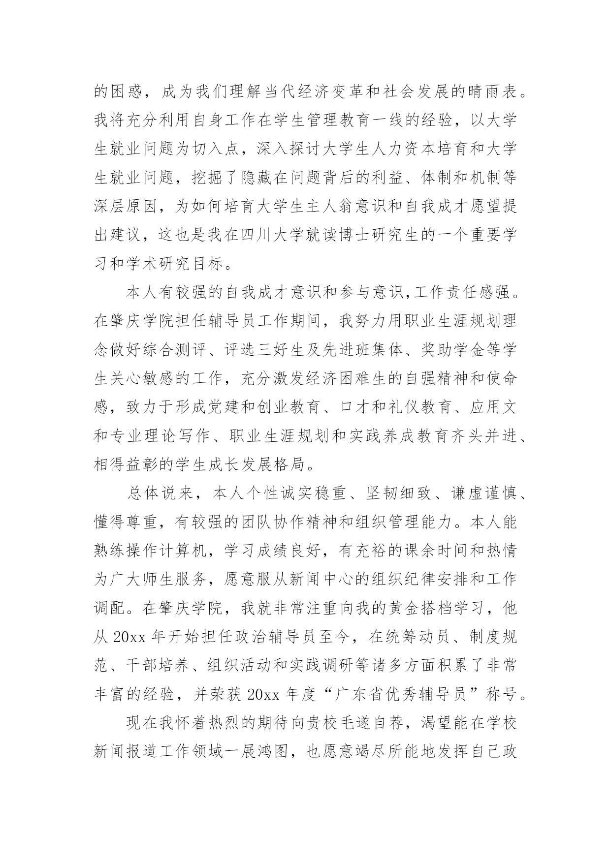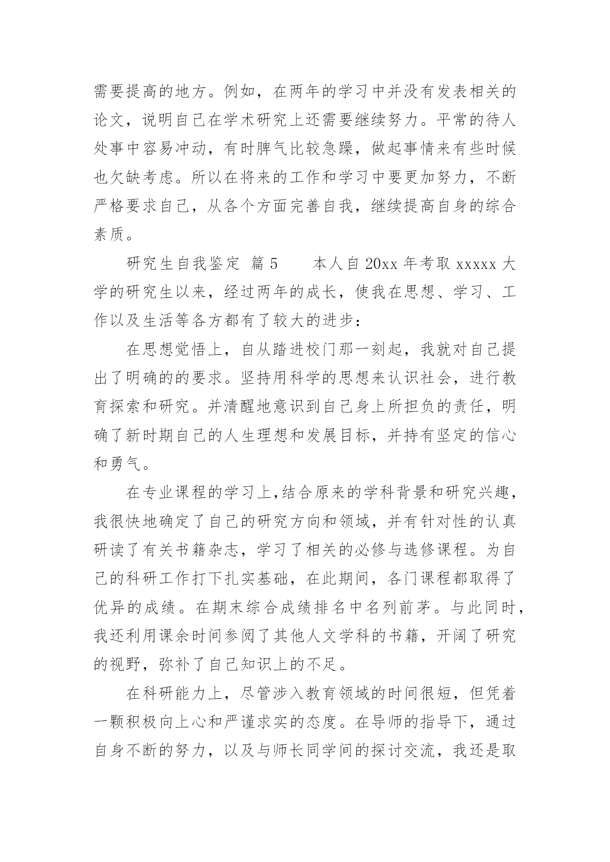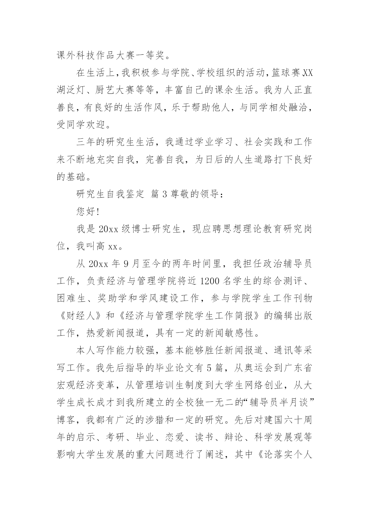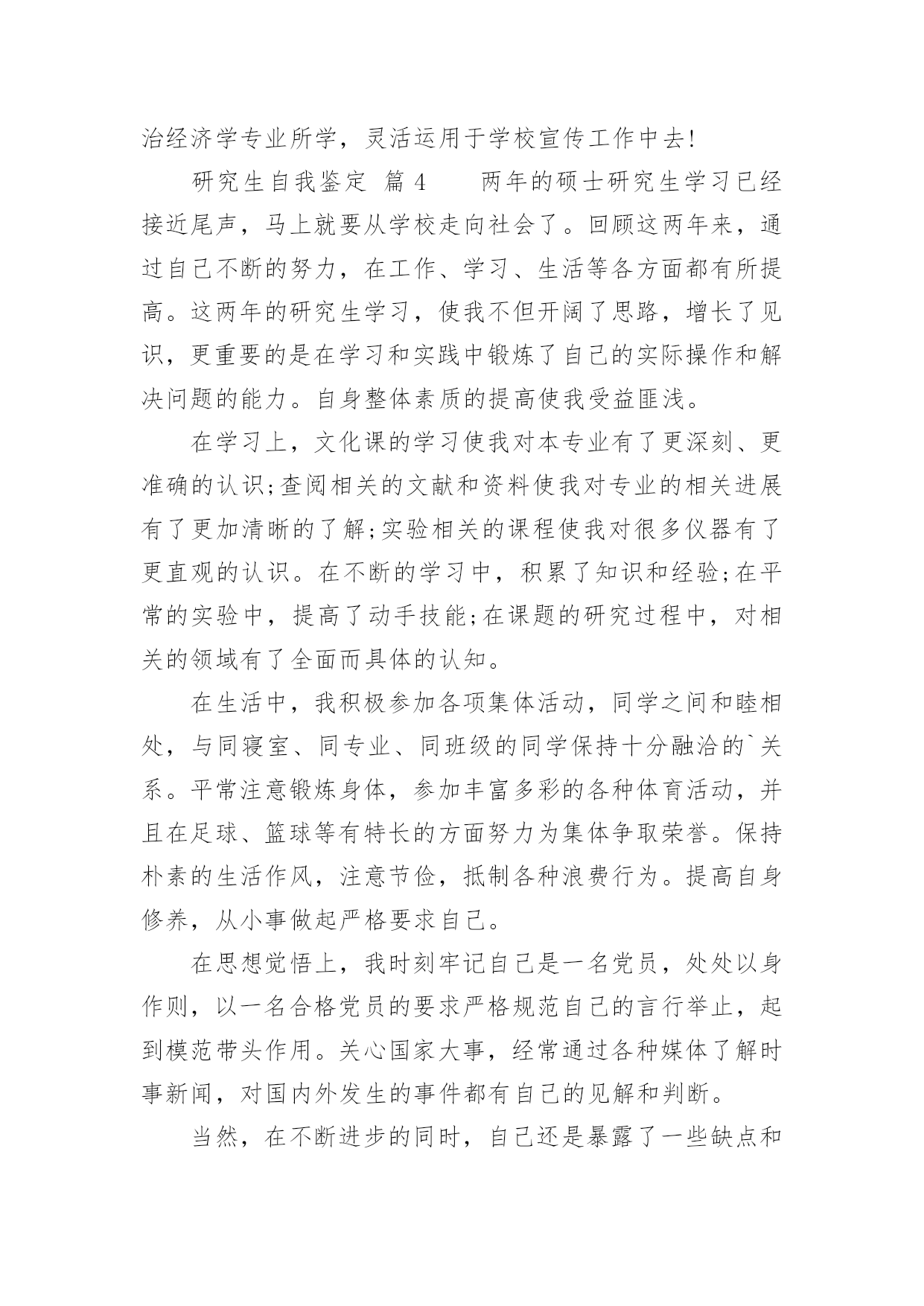 研究生自我鉴定研究生自我鉴定(精选)自我鉴定是个人对一个时期的学习或工作进行自我总结,它可以帮助我们了解自己的优点和缺点,让我们一起认真地写一份自我鉴定吧。自我鉴定怎么写才不会千篇一律呢?下面是小编整理的研究生自我鉴定,欢迎大家分享。研究生自我鉴定篇1进入研究生阶段以来,我一直以自勤、自勉、自强、自重来要求自己。在之前考取研究生之时,我就意识到,其实在追求知识的路上,并不是只为了一个结果,而是为了找到一个关于我们每个人一生的真理。有时候想一想其实就会发现,当我们真正回顾过去的时候,我们看到的都是不同的自己,人的一生为了一个真理而拼搏努力,我认为这也是一件非常伟大的事情。就像我这一次读研一样,其实在平时的学习中,困难有很多,不知有多少个夜晚曾辗转反侧,但是当我走到了如今的时候,觉得眼前甚是明亮,我的`时光甚是可恋、可期。在学习上,我保持一个非常明确的态度,那就是不断去完善自我。已经进入研究生阶段了,我不再是曾经的那个小孩,也不是大学的那个懵懂青年了,我的身上承载了更多的东西,也需要去创造更多的东西。研究生,这三个字听起来让人崇拜和向往,但是想要真正做好这三个字是何其难呢?这几年,我一直跟着导师不断的奔波,不管是在校学习还是在外出差,其实我都是尽了自己最大的能力的,所以这次我的导师给我这样的荣耀是我觉得非常骄傲的,也是让我非常满足的一件事情。在生活中,我一直都保持勤俭节约的习惯,我来自于农村,家庭并不是很富裕,所以我就更加珍惜学习和提升的机会,在生活中也一直都保持着节俭的习惯,虽然我是一个女孩,现在也正值青春年华,但我还是选择把更多的精力放在了研究和学习当中,而不是穿着打扮上。我认为,一个人真正的魅力永远都是来自于她的内心和灵魂,没有不朽的事物,只有不朽的思想和坚韧的灵魂。时间真的非常快,研究生的生活很快就要结束了,这次能够被评为优秀研究生,我感到非常的荣耀。我有一个小小的目标,那就是如若自己之后在学业和事业上都有了成绩的话,我一定会回到家乡,为我们家乡的建设出一份力气。这也让我不辜负学校以及社会各界对我们研究生一群的期待和鼓励,我会带着这个目标往前走,不辜负每一双期待的眼睛,也期待着每一次新的际遇,我会继续加油,做这个新时代的领跑者,不负岁月,期望未来,创造新知,推进自己的人生!研究生自我鉴定篇2本人在思想上,我经常自我反省,具有强烈的进取精神。我深知逆水行舟,不进则退的道理,因此始终保持积极进取的良好心态。在学习上,我专业知识扎实,有较好的'实验操作能力,多次获校二、三等奖学金。曾以《XX的新型合成途径》获校课外科技作品大赛一等奖。在生活上,我积极参与学院、学校组织的活动,篮球赛、XX湖泛灯、厨艺大赛等等,丰富自己的课余生活。我为人正直善良,有良好的生活作风,乐于帮助他人,与同学相处融洽,受同学欢迎。三年的研究生生活,我通过学业学习、社会实践和工作来不断地充实自我,完善自我,为日后的人生道路打下良好的基础。研究生自我鉴定篇3尊敬的领导:您好!我是20xx级博士研究生,现应聘思想理论教育研究岗位,我叫高xx。从20xx年9月至今的两年时间里,我担任政治辅导员工作,负责经济与管理学院将近1200名学生的综合测评、困难生、奖助学和学风建设工作,参与学院学生工作刊物《财经人》和《经济与管理学院学生工作简报》的编辑出版工作,热爱新闻报道,具有一定的新闻敏感性。本人写作能力较强,基本能够胜任新闻报道、通讯等采写工作。我先后指导的毕业论文有5篇,从奥运会到广东省宏观经济变革,从管理培训生制度到大学生网络创业,从大学生成长成才到我所建立的全校独一无二的“辅导员半月谈”博客,我都有广泛的涉猎和一定的研究。先后对建国六十周年的启示、考研、毕业、恋爱、读书、辩论、科学发展观等影响大学生发展的重大问题进行了阐述,其中《论落实个人的科学发展观》等数篇文章被《中国高校辅导员》电子杂志全文转载。本人热爱中国共产党,热爱社会主义祖国,爱憎分明,有坚定的政治信念。20xx年9月,我进入中共广东省委党校攻读经济学硕士学位,研究方向为社会主义市场经济。20xx年9月,中央建设和谐社会的决策刚正式提出,我就在《广州日报》上发表文章,为之欢呼呐喊,并于20xx年11月光荣加入中国共产党。我在20xx年研究生毕业后的工作都直接与学生管理相关,先是在肇庆医学高等专科学校思想政治理论部担任教师,主要担任《形势与政策》、《思想道德修养和法律基础》的教学工作,同时兼任班主任工作。我本着对党的教育事业负责任的态度,努力学习领会党的理论、特别是xx大等重要会议的精神,努力实现书本理论和现实生活相结合,先后作了北京奥运会、思想大解放推动大发展、WTO和中东问题等国际、国内热点问题,学生反映热烈,达到了启蒙、甚至发人深省的作用。本人具有一定的政治理论功底。我所讲授过《形势与政策》课