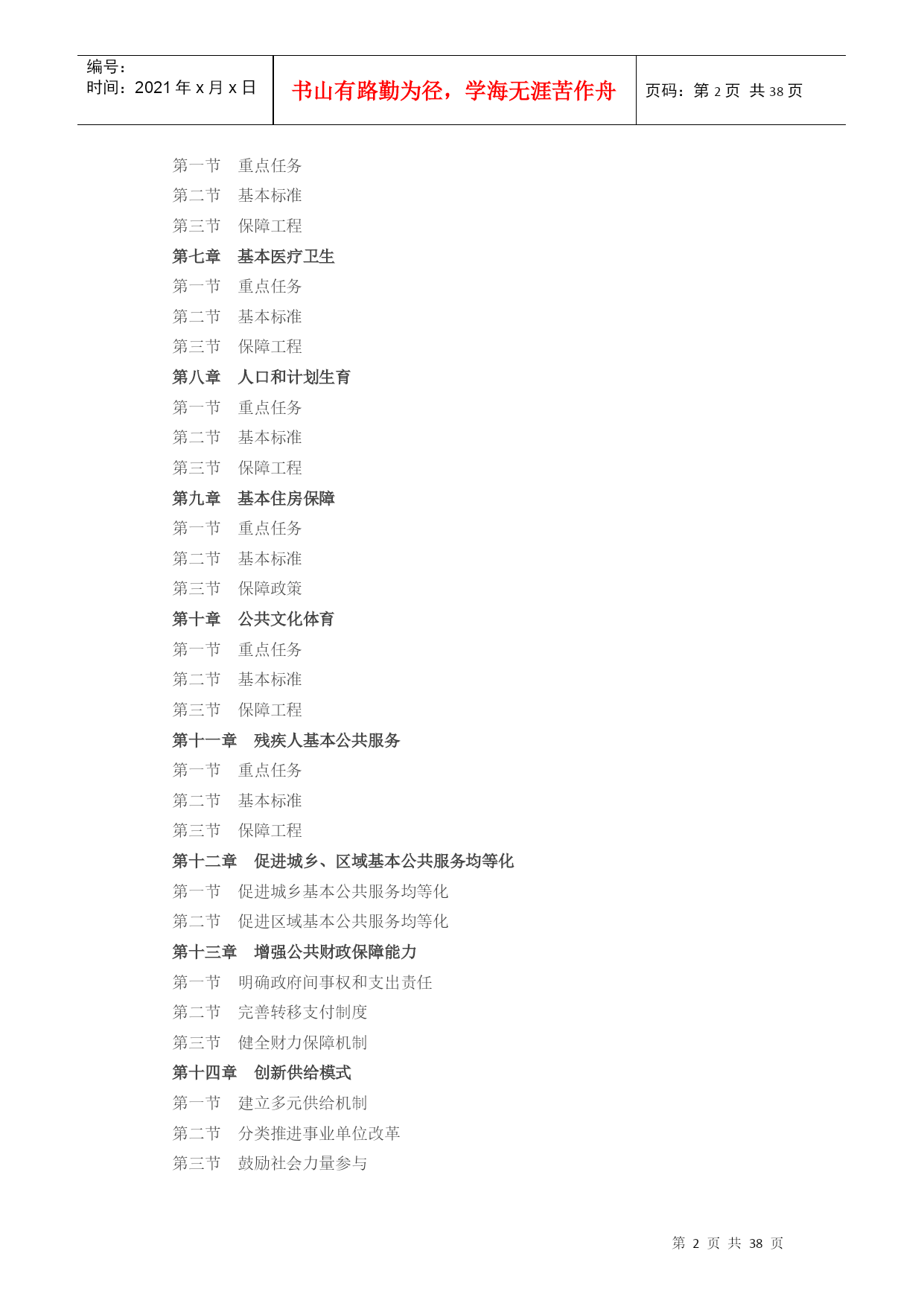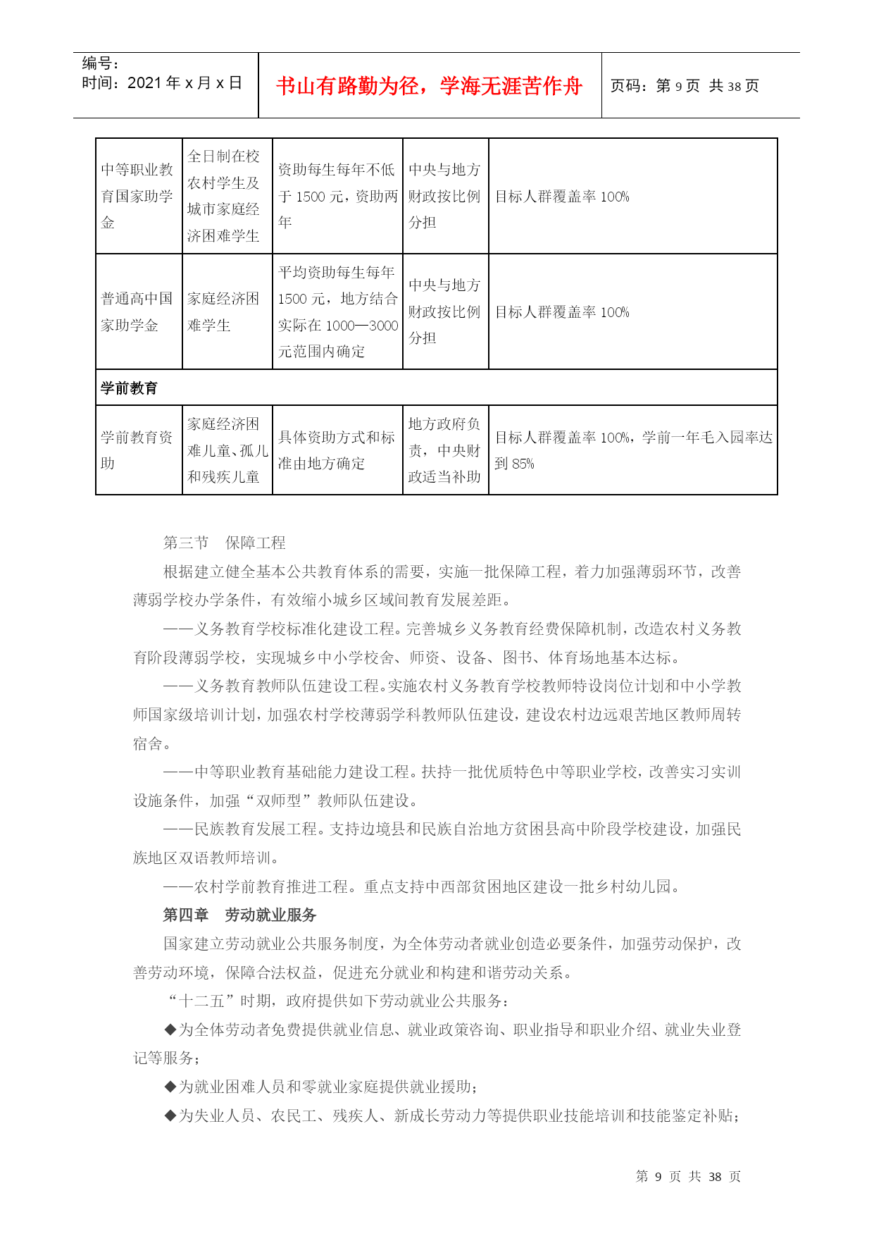 编号:时间:2021年x月x日书山有路勤为径,学海无涯苦作舟页码:第PAGE38页共NUMPAGES38页第PAGE\*MERGEFORMAT38页共NUMPAGES\*MERGEFORMAT38页国务院关于印发国家基本公共服务体系“十二五”规划的通知国发〔2012〕29号各省、自治区、直辖市人民政府,国务院各部委、各直属机构:现将《国家基本公共服务体系“十二五”规划》印发给你们,请认真贯彻执行。国务院2012年7月11日国家基本公共服务体系“十二五”规划目录序言第一章规划背景第一节基本概念第二节规划范围第三节发展环境第二章指导思想和主要目标第一节指导思想第二节主要目标第三章基本公共教育第一节重点任务第二节基本标准第三节保障工程第四章劳动就业服务第一节重点任务第二节基本标准第三节保障工程第五章社会保险第一节重点任务第二节基本标准第三节保障工程第六章基本社会服务第一节重点任务第二节基本标准第三节保障工程第七章基本医疗卫生第一节重点任务第二节基本标准第三节保障工程第八章人口和计划生育第一节重点任务第二节基本标准第三节保障工程第九章基本住房保障第一节重点任务第二节基本标准第三节保障政策第十章公共文化体育第一节重点任务第二节基本标准第三节保障工程第十一章残疾人基本公共服务第一节重点任务第二节基本标准第三节保障工程第十二章促进城乡、区域基本公共服务均等化第一节促进城乡基本公共服务均等化第二节促进区域基本公共服务均等化第十三章增强公共财政保障能力第一节明确政府间事权和支出责任第二节完善转移支付制度第三节健全财力保障机制第十四章创新供给模式第一节建立多元供给机制第二节分类推进事业单位改革第三节鼓励社会力量参与第十五章规划实施第一节明确责任分工第二节加强监督问责序言“十二五”时期是我国全面建设小康社会的关键时期,是深化改革开放、加快转变经济发展方式的攻坚时期。建立健全基本公共服务体系,促进基本公共服务均等化,是深入贯彻落实科学发展观的重大举措,是构建社会主义和谐社会、维护社会公平正义的迫切需要,是全面建设服务型政府的内在要求,对于推进以保障和改善民生为重点的社会建设,对于切实保障人民群众最关心、最直接、最现实的利益,对于加快经济发展方式转变、扩大内需特别是消费需求,都具有十分重要的意义。本规划根据《中华人民共和国国民经济和社会发展第十二个五年规划纲要》(以下简称“十二五”规划纲要)的有关要求编制,主要阐明国家基本公共服务的制度安排,明确基本范围、标准和工作重点,引导公共资源配置,是“十二五”乃至更长一段时期构建国家基本公共服务体系的综合性、基础性和指导性文件,是政府履行公共服务职责的重要依据。第一章规划背景第一节基本概念基本公共服务,指建立在一定社会共识基础上,由政府主导提供的,与经济社会发展水平和阶段相适应,旨在保障全体公民生存和发展基本需求的公共服务。享有基本公共服务属于公民的权利,提供基本公共服务是政府的职责。基本公共服务范围,一般包括保障基本民生需求的教育、就业、社会保障、医疗卫生、计划生育、住房保障、文化体育等领域的公共服务,广义上还包括与人民生活环境紧密关联的交通、通信、公用设施、环境保护等领域的公共服务,以及保障安全需要的公共安全、消费安全和国防安全等领域的公共服务。基本公共服务标准,指在一定时期内为实现既定目标而对基本公共服务活动所制定的技术和管理等规范。基本公共服务均等化,指全体公民都能公平可及地获得大致均等的基本公共服务,其核心是机会均等,而不是简单的平均化和无差异化。基本公共服务体系,指由基本公共服务范围和标准、资源配置、管理运行、供给方式以及绩效评价等所构成的系统性、整体性的制度安排。第二节规划范围根据“十二五”规划纲要,为突出体现“学有所教、劳有所得、病有所医、老有所养、住有所居”的要求,本规划的范围确定为公共教育、劳动就业服务、社会保障、基本社会服务、医疗卫生、人口计生、住房保障、公共文化等领域的基本公共服务。“十二五”规划纲要还明确了基础设施、环境保护两个领域的基本公共服务重点任务,包括:行政村通公路和客运班车,城市建成区公共交通全覆盖;行政村通电,无电地区人口全部用上电;邮政服务做到乡乡设所、村村通邮;县县具备污水、垃圾无害化处理能力和环境监测评估能力;保障城乡饮用水水源地安全等。这些内容分别纳入综合交通运输、能源、邮政、环境保护等相关“十二五”专项规划中,不在本规划中予以阐述。第三节发展环境经过30多年的改革开放和发展建设,我国经济实力、综合国力和国际地位显著提高,人民生活明显改善。“十一五”以来,各地区、各有
