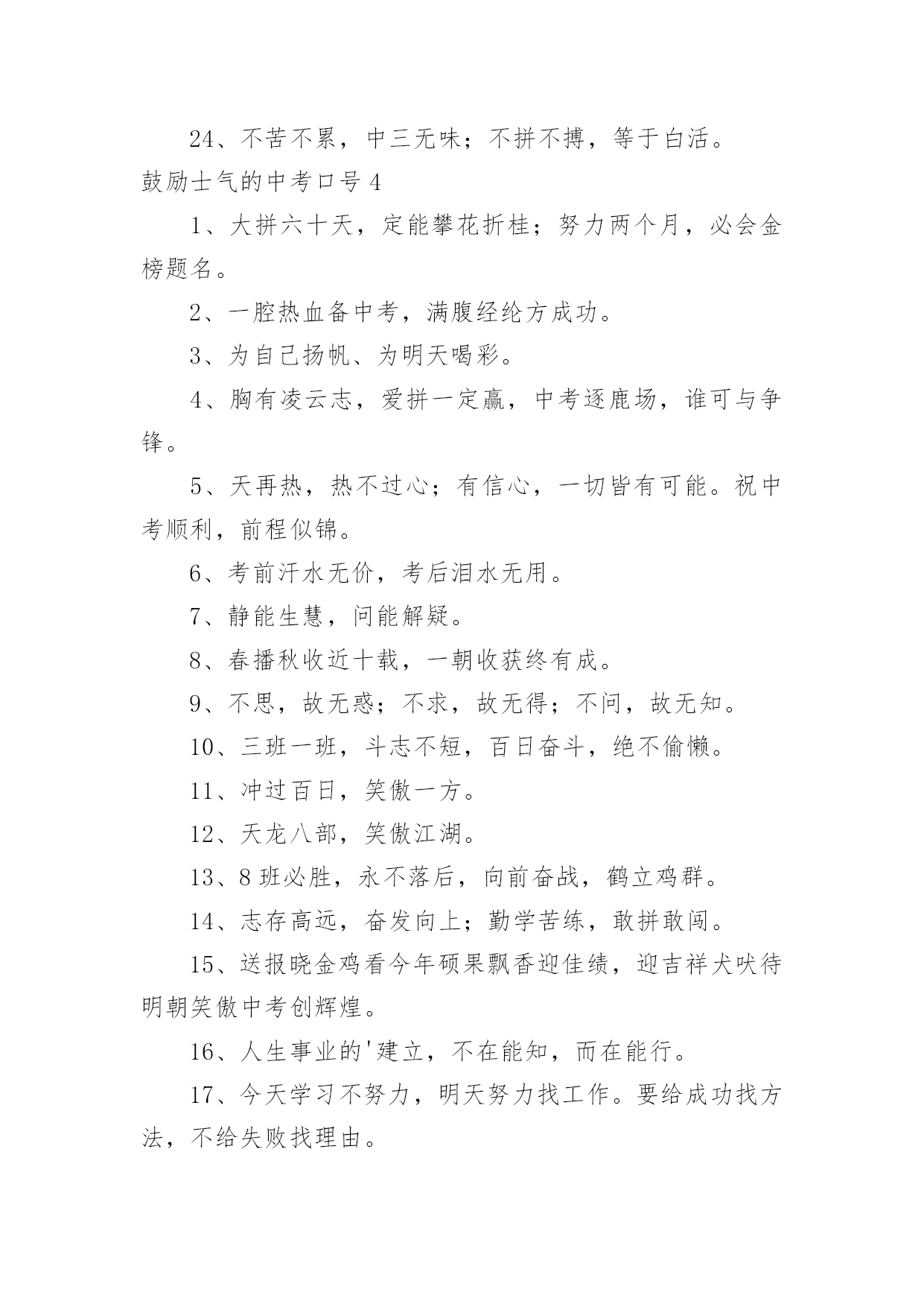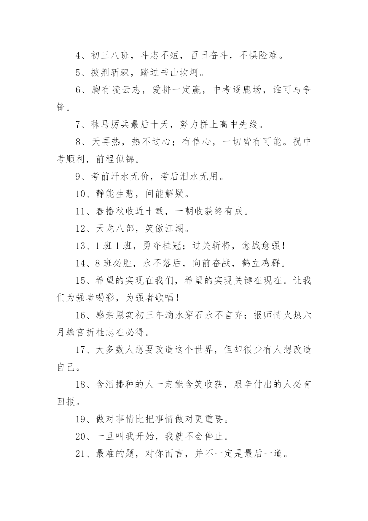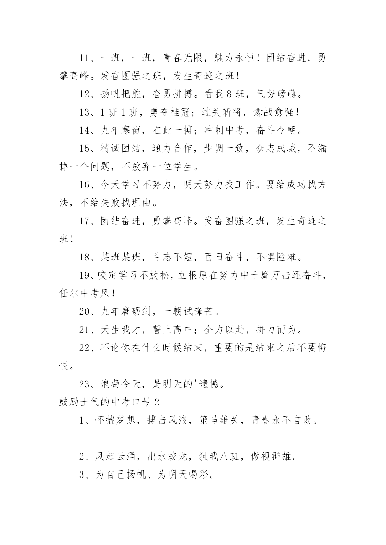 鼓励士气的中考口号鼓励士气的中考口号无论是身处学校还是步入社会,大家一定都接触过一些使用较为普遍的口号吧,口号是供口头呼喊的有纲领性和鼓动作用的简短句子。什么样的口号才经典呢?下面是小编整理的鼓励士气的中考口号,欢迎大家分享。鼓励士气的中考口号11、一腔热血备中考,满腹经纶方成功。2、风起云涌,出水蛟龙,独我八班,傲视群雄。3、为自己扬帆、为明天喝彩。4、心若在,梦就在,只要做,就能行,冲刺百日,百日冲刺,仰天大笑出门去,我辈岂是蓬蒿人。5、学无止境,爱拼才会赢。6、胸有凌云志,爱拼一定赢,中考逐鹿场,谁可与争锋。7、滴水穿石战中考如歌岁月应无悔,乘风破浪展雄才折桂蟾宫当有时。8、我会成功,因为我志在成功。9、天再热,热不过心;有信心,一切皆有可能。祝中考顺利,前程似锦。10、静能生慧,问能解疑。11、一班,一班,青春无限,魅力永恒!团结奋进,勇攀高峰。发奋图强之班,发生奇迹之班!12、扬帆把舵,奋勇拼搏。看我8班,气势磅礴。13、1班1班,勇夺桂冠;过关斩将,愈战愈强!14、九年寒窗,在此一搏;冲刺中考,奋斗今朝。15、精诚团结,通力合作,步调一致,众志成城,不漏掉一个问题,不放弃一位学生。16、今天学习不努力,明天努力找工作。要给成功找方法,不给失败找理由。17、团结奋进,勇攀高峰。发奋图强之班,发生奇迹之班!18、某班某班,斗志不短,百日奋斗,不惧险难。19、咬定学习不放松,立根原在努力中千磨万击还奋斗,任尔中考风!20、九年磨砺剑,一朝试锋芒。21、天生我才,誓上高中;全力以赴,拼力而为。22、不论你在什么时候结束,重要的是结束之后不要悔恨。23、浪费今天,是明天的'遗憾。鼓励士气的中考口号21、怀揣梦想,搏击风浪,策马雄关,青春永不言败。2、风起云涌,出水蛟龙,独我八班,傲视群雄。3、为自己扬帆、为明天喝彩。4、初三八班,斗志不短,百日奋斗,不惧险难。5、披荆斩棘,踏过书山坎坷。6、胸有凌云志,爱拼一定赢,中考逐鹿场,谁可与争锋。7、秣马厉兵最后十天,努力拼上高中先线。8、天再热,热不过心;有信心,一切皆有可能。祝中考顺利,前程似锦。9、考前汗水无价,考后泪水无用。10、静能生慧,问能解疑。11、春播秋收近十载,一朝收获终有成。12、天龙八部,笑傲江湖。13、1班1班,勇夺桂冠;过关斩将,愈战愈强!14、8班必胜,永不落后,向前奋战,鹤立鸡群。15、希望的实现在我们,希望的实现关键在现在。让我们为强者喝彩,为强者歌唱!16、感亲恩实初三年滴水穿石永不言弃;报师情火热六月蟾宫折桂志在必得。17、大多数人想要改造这个世界,但却很少有人想改造自己。18、含泪播种的人一定能含笑收获,艰辛付出的人必有回报。19、做对事情比把事情做对更重要。20、一旦叫我开始,我就不会停止。21、最难的题,对你而言,并不一定是最后一道。22、精诚团结,通力合作,步调一致,众志成城,不漏掉一个问题,不放弃一位学生。23、今天学习不努力,明天努力找工作。要给成功找方法,不给失败找理由。24、上好每一堂课,做好每一次作业,不错过每一个疑问,充实过好每一天。25、认真研究中考,突出基础性和针对性,严格把好教学案的'质量关。26、努力付出汗水,改变命运!!!27、天生我才,誓上高中;全力以赴,拼力而为。28、激流勇进,乘风踏浪我欲搏击沧海横流;傲视群雄,飞鞭催马吾将痛饮黄龙。29、不苦不累,中三无味;不拼不搏,等于白活。30、百炼成钢、百日留芳、拼搏进取,共创辉煌。鼓励士气的中考口号31、大拼六十天,定能攀花折桂;努力两个月,必会金榜题名。2、一腔热血备中考,满腹经纶方成功。3、风起云涌,出水蛟龙,独我八班,傲视群雄。4、为自己扬帆、为明天喝彩。5、披荆斩棘,踏过书山坎坷。6、秣马厉兵最后十天,努力拼上高中先线。7、决战中考,改变命运。8、我会成功,因为我志在成功。9、天再热,热不过心;有信心,一切皆有可能。祝中考顺利,前程似锦。10、考前汗水无价,考后泪水无用。11、静能生慧,问能解疑。12、冲刺高考,决胜未来。13、天龙八部,笑傲江湖。14、一班,一班,青春无限,魅力永恒!团结奋进,勇攀高峰。发奋图强之班,发生奇迹之班!15、扬帆把舵,奋勇拼搏。看我8班,气势磅礴。16、大多数人想要改造这个世界,但却很少有人想改造自己。17、失败是什么?只是更走近成功一步;成功是什么?就是走过了所有通向失败的路,只剩下一条路,那就是成功的路。18、刻苦钻研,潜心备课,努力完善教学方法,提高课堂45分钟效率,耐心指导每位同学的提问和质疑。19、精诚团结,通力合作,步调一致,众志成城,不漏掉一个问题,不放弃一位学生。20、认真研究中考,突出基础性和针对性,严格把好教学案的'质量关。21、惜光阴百日犹短,看众志成城拼搏第一;细布置一刻也长,比龙争虎斗谁为争锋?!22、