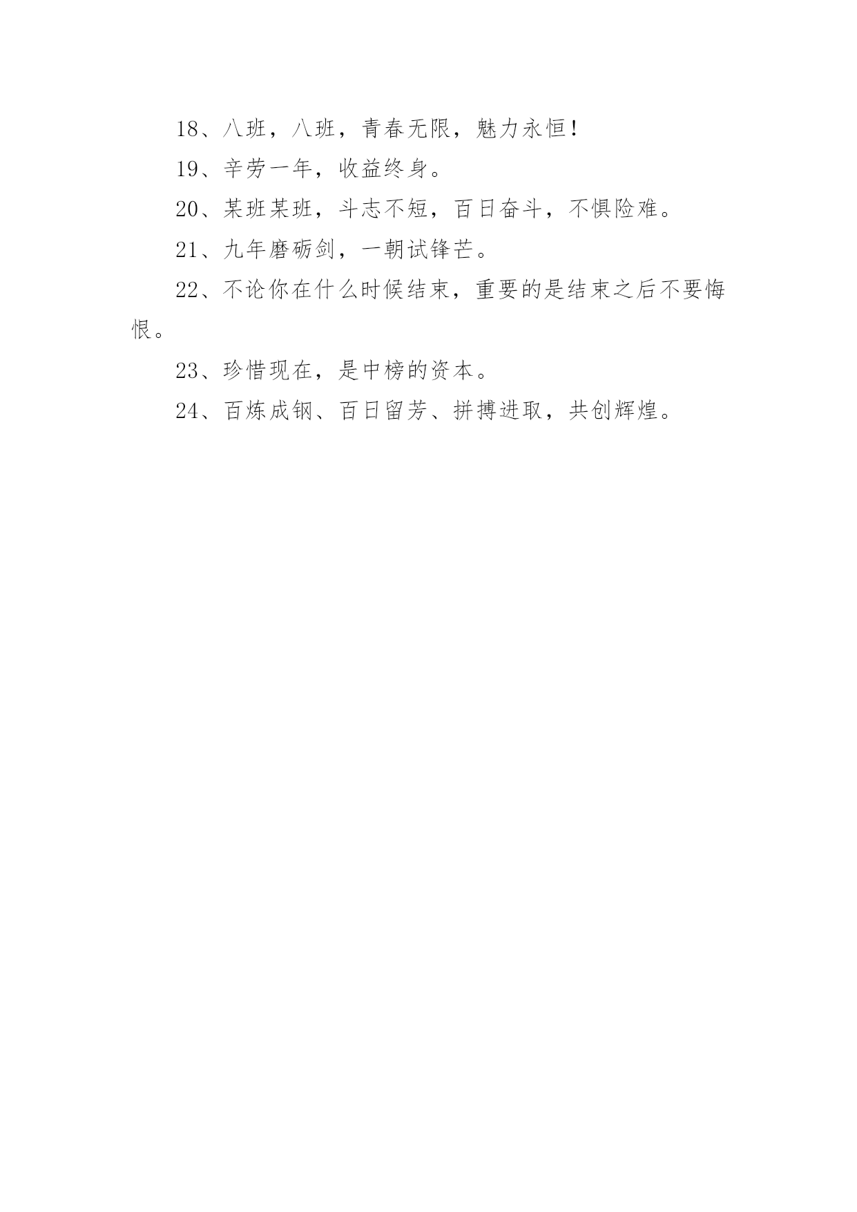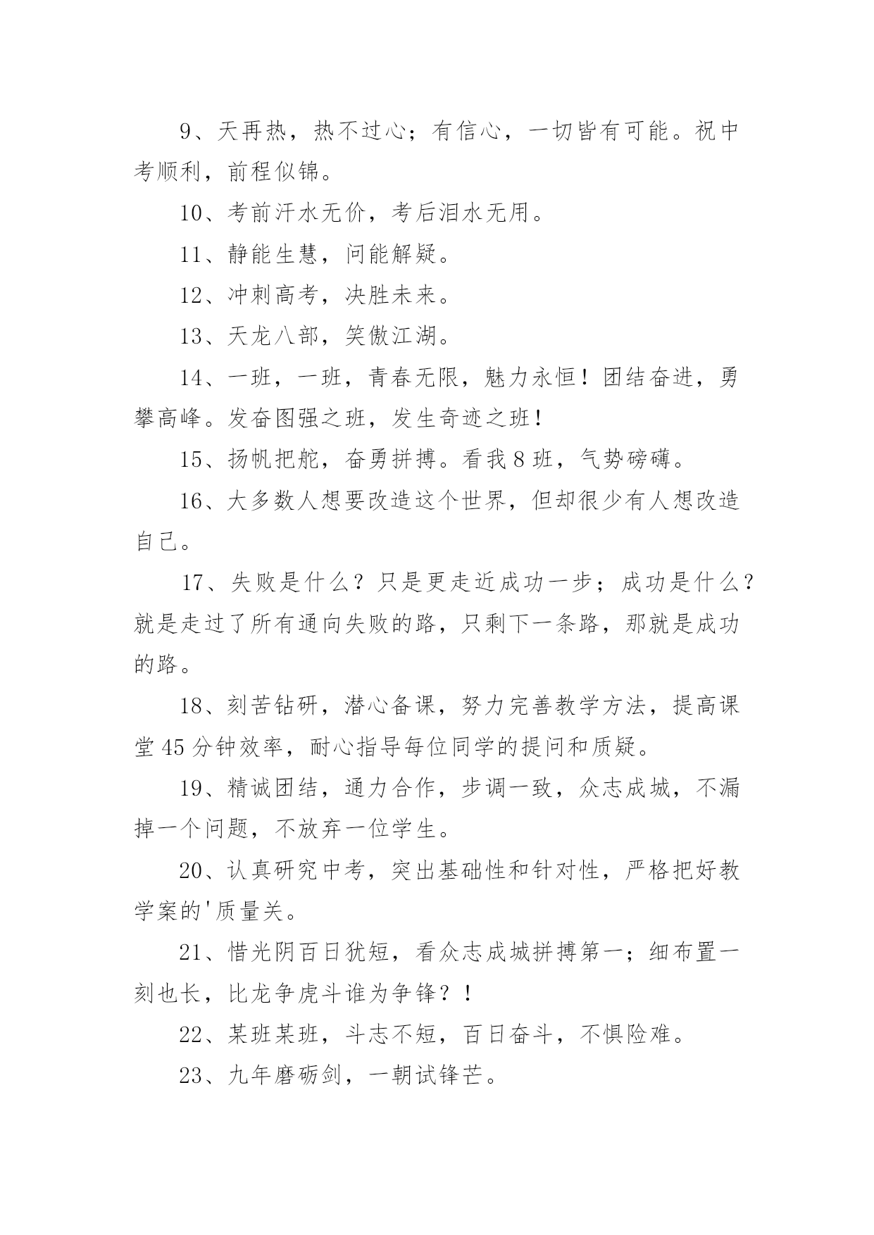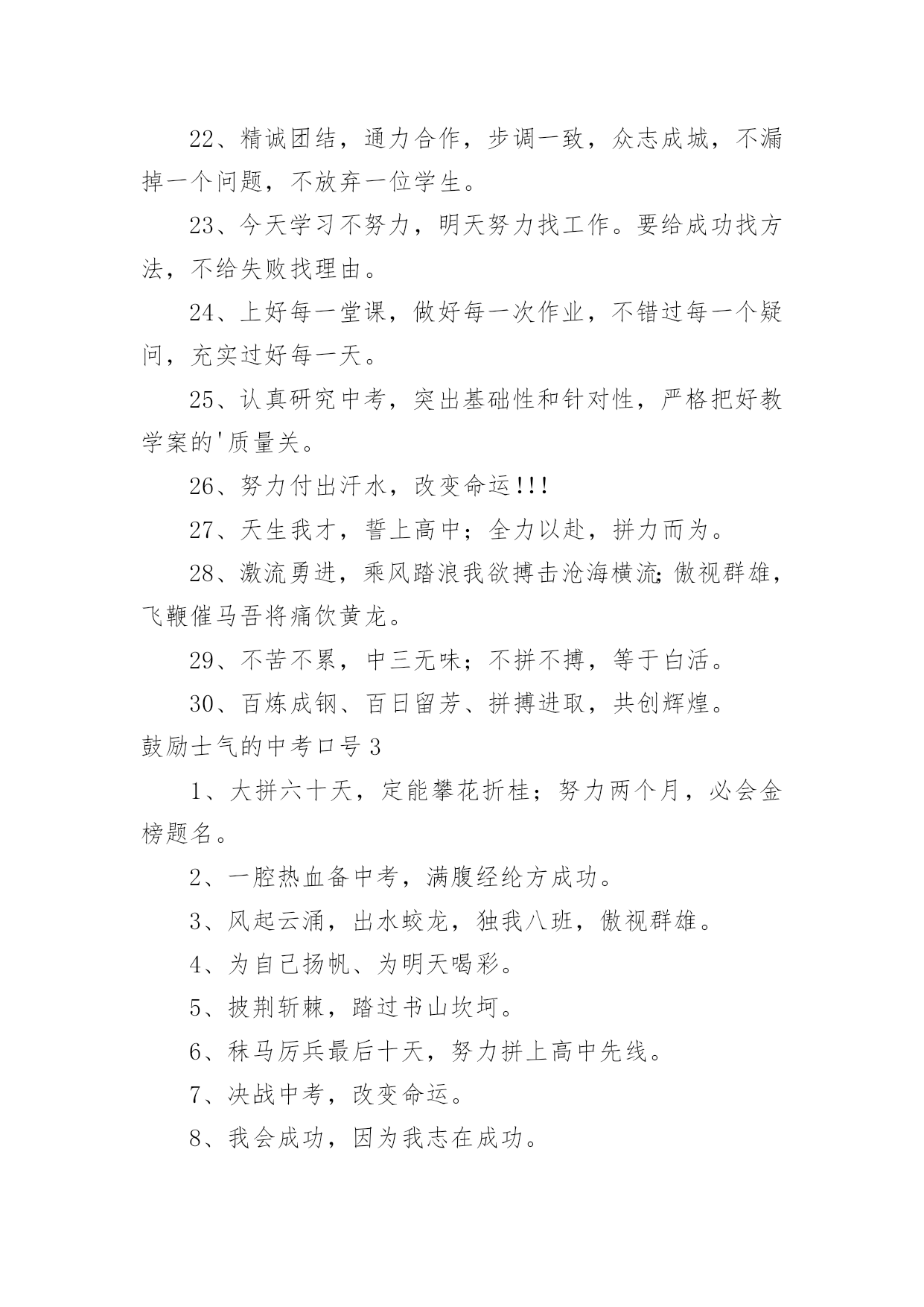 鼓励士气的中考口号鼓励士气的中考口号无论是身处学校还是步入社会,大家一定都接触过一些使用较为普遍的口号吧,口号是供口头呼喊的有纲领性和鼓动作用的简短句子。什么样的口号才经典呢?下面是小编整理的鼓励士气的中考口号,欢迎大家分享。鼓励士气的中考口号11、一腔热血备中考,满腹经纶方成功。2、风起云涌,出水蛟龙,独我八班,傲视群雄。3、为自己扬帆、为明天喝彩。4、心若在,梦就在,只要做,就能行,冲刺百日,百日冲刺,仰天大笑出门去,我辈岂是蓬蒿人。5、学无止境,爱拼才会赢。6、胸有凌云志,爱拼一定赢,中考逐鹿场,谁可与争锋。7、滴水穿石战中考如歌岁月应无悔,乘风破浪展雄才折桂蟾宫当有时。8、我会成功,因为我志在成功。9、天再热,热不过心;有信心,一切皆有可能。祝中考顺利,前程似锦。10、静能生慧,问能解疑。11、一班,一班,青春无限,魅力永恒!团结奋进,勇攀高峰。发奋图强之班,发生奇迹之班!12、扬帆把舵,奋勇拼搏。看我8班,气势磅礴。13、1班1班,勇夺桂冠;过关斩将,愈战愈强!14、九年寒窗,在此一搏;冲刺中考,奋斗今朝。15、精诚团结,通力合作,步调一致,众志成城,不漏掉一个问题,不放弃一位学生。16、今天学习不努力,明天努力找工作。要给成功找方法,不给失败找理由。17、团结奋进,勇攀高峰。发奋图强之班,发生奇迹之班!18、某班某班,斗志不短,百日奋斗,不惧险难。19、咬定学习不放松,立根原在努力中千磨万击还奋斗,任尔中考风!20、九年磨砺剑,一朝试锋芒。21、天生我才,誓上高中;全力以赴,拼力而为。22、不论你在什么时候结束,重要的是结束之后不要悔恨。23、浪费今天,是明天的'遗憾。鼓励士气的中考口号21、怀揣梦想,搏击风浪,策马雄关,青春永不言败。2、风起云涌,出水蛟龙,独我八班,傲视群雄。3、为自己扬帆、为明天喝彩。4、初三八班,斗志不短,百日奋斗,不惧险难。5、披荆斩棘,踏过书山坎坷。6、胸有凌云志,爱拼一定赢,中考逐鹿场,谁可与争锋。7、秣马厉兵最后十天,努力拼上高中先线。8、天再热,热不过心;有信心,一切皆有可能。祝中考顺利,前程似锦。9、考前汗水无价,考后泪水无用。10、静能生慧,问能解疑。11、春播秋收近十载,一朝收获终有成。12、天龙八部,笑傲江湖。13、1班1班,勇夺桂冠;过关斩将,愈战愈强!14、8班必胜,永不落后,向前奋战,鹤立鸡群。15、希望的实现在我们,希望的实现关键在现在。让我们为强者喝彩,为强者歌唱!16、感亲恩实初三年滴水穿石永不言弃;报师情火热六月蟾宫折桂志在必得。17、大多数人想要改造这个世界,但却很少有人想改造自己。18、含泪播种的人一定能含笑收获,艰辛付出的人必有回报。19、做对事情比把事情做对更重要。20、一旦叫我开始,我就不会停止。21、最难的题,对你而言,并不一定是最后一道。22、精诚团结,通力合作,步调一致,众志成城,不漏掉一个问题,不放弃一位学生。23、今天学习不努力,明天努力找工作。要给成功找方法,不给失败找理由。24、上好每一堂课,做好每一次作业,不错过每一个疑问,充实过好每一天。25、认真研究中考,突出基础性和针对性,严格把好教学案的'质量关。26、努力付出汗水,改变命运!!!27、天生我才,誓上高中;全力以赴,拼力而为。28、激流勇进,乘风踏浪我欲搏击沧海横流;傲视群雄,飞鞭催马吾将痛饮黄龙。29、不苦不累,中三无味;不拼不搏,等于白活。30、百炼成钢、百日留芳、拼搏进取,共创辉煌。鼓励士气的中考口号31、大拼六十天,定能攀花折桂;努力两个月,必会金榜题名。2、一腔热血备中考,满腹经纶方成功。3、风起云涌,出水蛟龙,独我八班,傲视群雄。4、为自己扬帆、为明天喝彩。5、披荆斩棘,踏过书山坎坷。6、秣马厉兵最后十天,努力拼上高中先线。7、决战中考,改变命运。8、我会成功,因为我志在成功。9、天再热,热不过心;有信心,一切皆有可能。祝中考顺利,前程似锦。10、考前汗水无价,考后泪水无用。11、静能生慧,问能解疑。12、冲刺高考,决胜未来。13、天龙八部,笑傲江湖。14、一班,一班,青春无限,魅力永恒!团结奋进,勇攀高峰。发奋图强之班,发生奇迹之班!15、扬帆把舵,奋勇拼搏。看我8班,气势磅礴。16、大多数人想要改造这个世界,但却很少有人想改造自己。17、失败是什么?只是更走近成功一步;成功是什么?就是走过了所有通向失败的路,只剩下一条路,那就是成功的路。18、刻苦钻研,潜心备课,努力完善教学方法,提高课堂45分钟效率,耐心指导每位同学的提问和质疑。19、精诚团结,通力合作,步调一致,众志成城,不漏掉一个问题,不放弃一位学生。20、认真研究中考,突出基础性和针对性,严格把好教学案的'质量关。21、惜光阴百日犹短,看众志成城拼搏第一;细布置一刻也长,比龙争虎斗谁为争锋?!22、