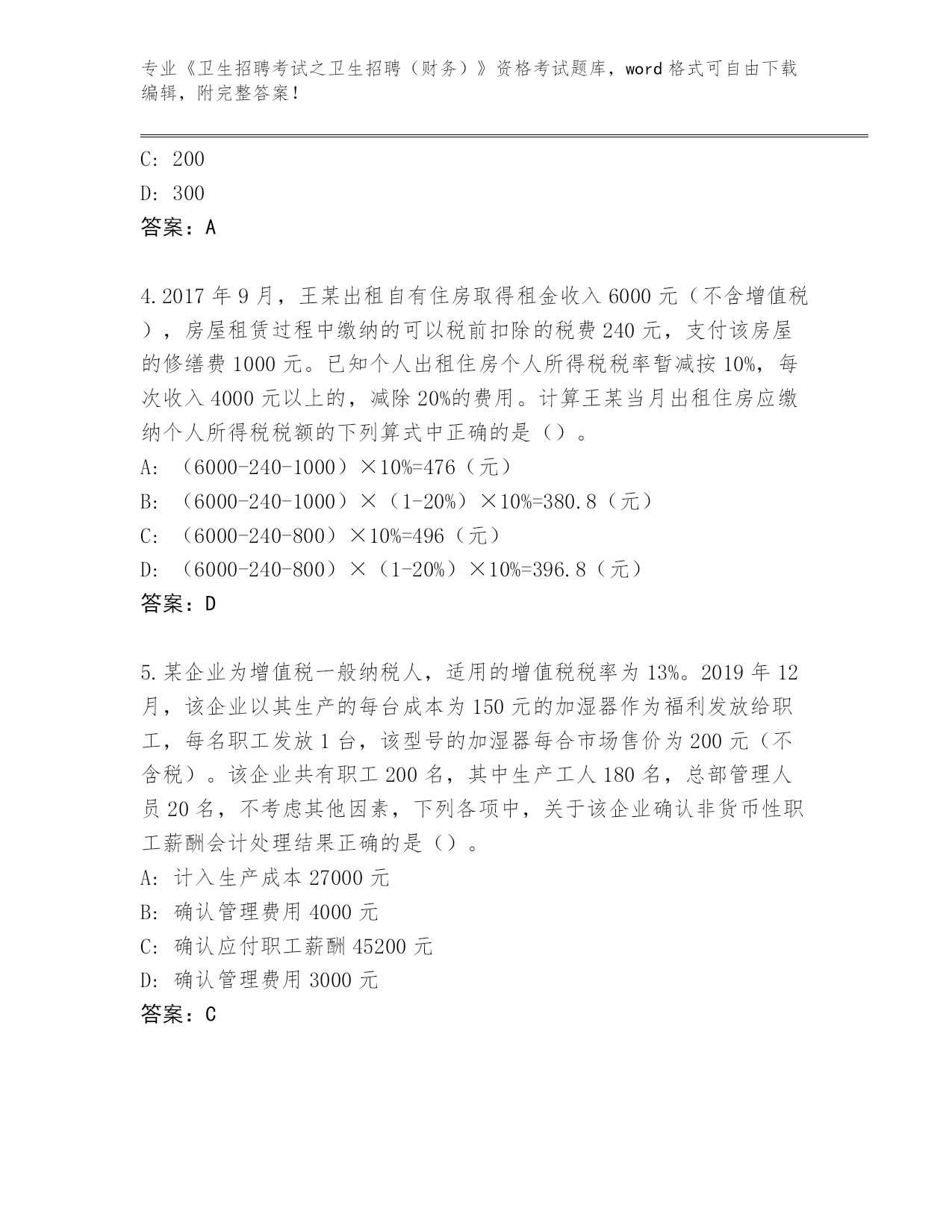 2024河南省郏县《卫生招聘考试之卫生招聘(财务)》资格考试必背200题王牌题库及答案