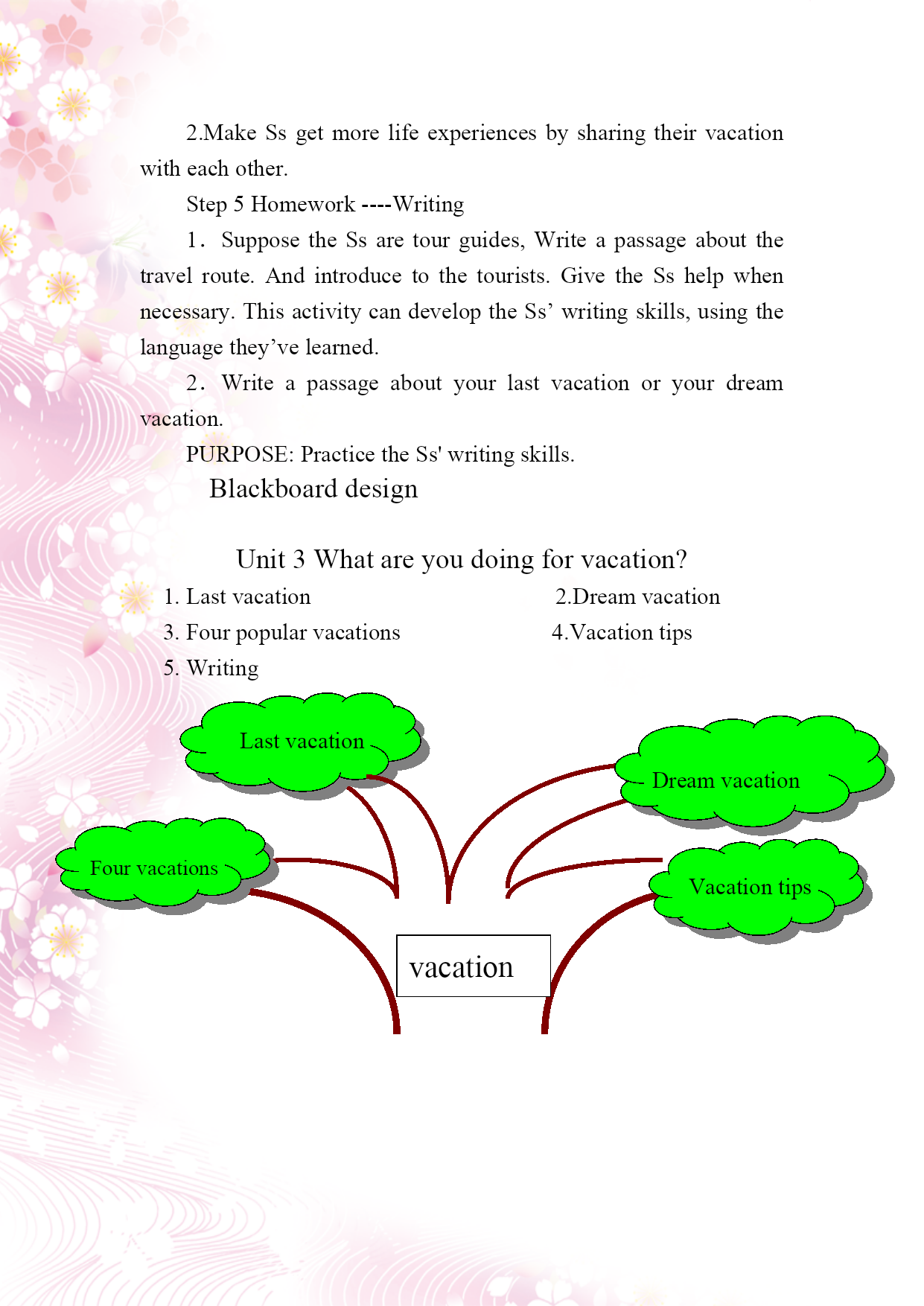 Unit8Whatareyoudoingforvacation?TeachingprocedureHuangJinYihuangNo.2MiddleSchoolStep1WarmingupShowsomepicturesandmakedialogueswiththeSs.PURPOSE:1.RevisetheSimplePastTense2.ProvidechancesforSstopracticetheiroralEnglish3.ImprovetheirinterestinlearningandusingEnglishStep2AskandanswerFirst,talkaboutmydreamvacation,thenlettheSstalkabouttheirs,lastfillintheblanks,shownintheCAI.PURPOSE:1.RevisethePresentContinuousTense2.TrainSs’abilitiesofimagination.Imaginationisveryimportant,becausewithoutit,everythingwillstopadvancing.Step3PresentationPresent4kindsofpopularholidaysinwesterncountries:Sightseeingholiday,Beachholiday,PartyvacationandAdventureholiday.PURPOSELettheSsknowmoreabouttheculturenotes.ThisactivitycanopenuptheSs’eyestotheworld.Encouragethemtogetmoreknowledgetheywanttoknowbyallkindsofmeans.Step4DiscussionLettheSsworkingroupstotalkabouttheirvacationexperiences.Thenmakeaconclusionofvacationtips.PURPOSE:PracticetheSs’spokenEnglishMakeSsgetmorelifeexperiencesbysharingtheirvacationwitheachother.Step5Homework----WritingSupposetheSsaretourguides,Writeapassageaboutthetravelroute.Andintroducetothetourists.GivetheSshelpwhennecessary.ThisactivitycandeveloptheSs’writingskills,usingthelanguagethey’velearned.Writeapassageaboutyourlastvacationoryourdreamvacation.PURPOSE:PracticetheSs'writingskills.BlackboarddesignUnit3Whatareyoudoingforvacation?1.Lastvacation2.Dreamvacation3.Fourpopularvacations4.Vacationtips5.WritingFourvacationsLastvacationDreamvacationVacationtipsvacation