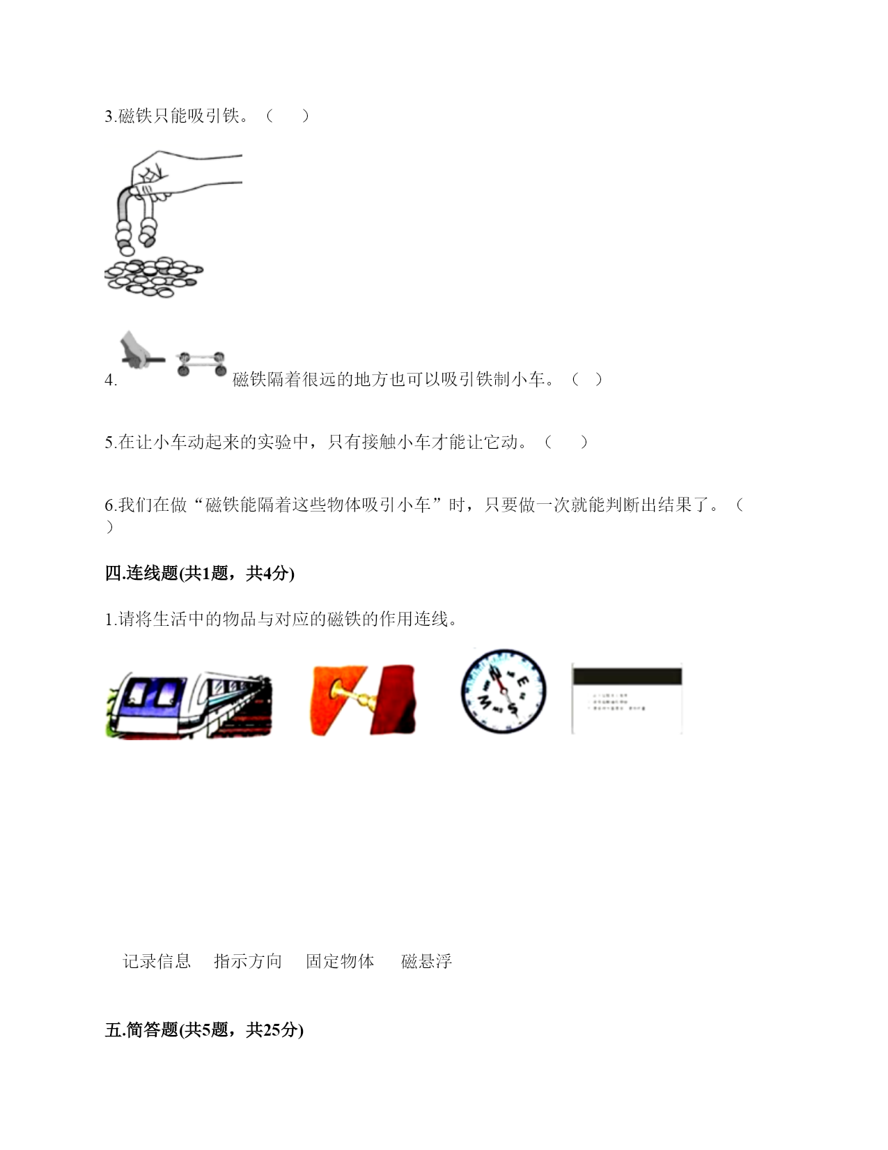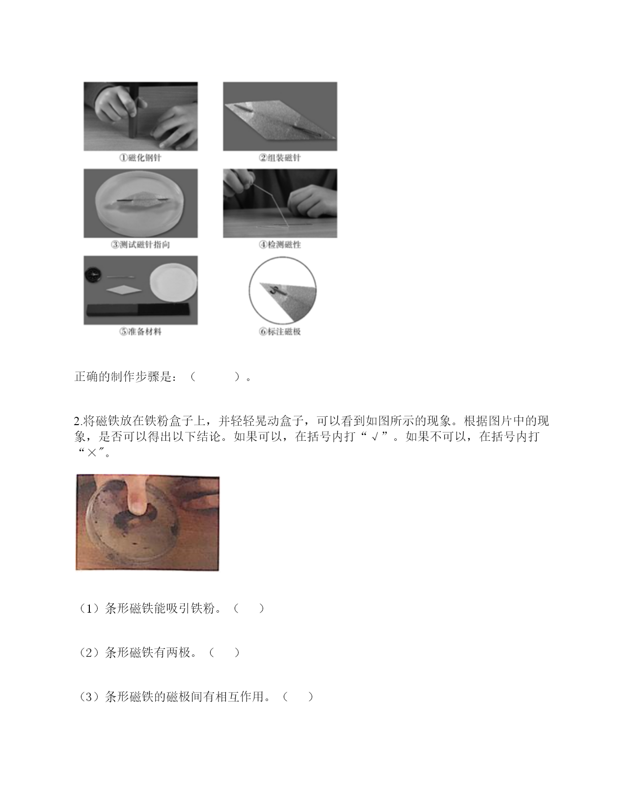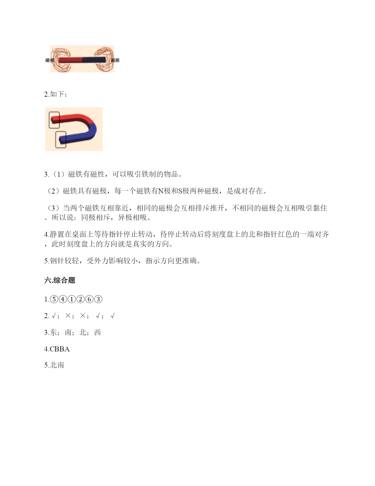 小学科学《磁铁》练习题一.选择题(共6题,共12分)1.如图所示,提出指南针的四种放置方法的科学家是()。A.张衡B.沈括C.祖冲之2.“司南”被称为世界上最早的“指南针”,它是()。A.B.C.3.一块磁铁有()磁极。A.没有B.2个C.不同的磁铁不一样4.下图中两块磁铁相互靠近时互相吸引的是()。A.甲、乙B.乙、丙C.丙、丁D.甲、丁5.我们可以用“支架法”给()磁铁进行指示方向的实验。A.蹄形B.环形C.条形6.下列材料中,能够吸引铁的是()。A.塑料B.磁铁C.木片D.铝盒二.填空题(共6题,共24分)1.磁铁能吸引物体的性质叫()。2.下面是一块红蓝磁铁,请你按照一般规律标出这个磁铁的磁极。()()3.写出三种生活中含有磁铁的物品:()、()、()。4.磁铁上()的部分叫磁极,磁铁有两个磁极。指北的磁极叫北极(用字母()表示),指南的磁极叫南极(用字母()表示)。5.两个相同的磁极叫同极,不相同的磁极叫异极。当两块磁铁相互靠近时,()。6.天然磁铁又叫()。三.判断题(共6题,共12分)1.磁铁都是天然形成的。()2.磁铁不接触小车,也能使小车运动。()3.磁铁只能吸引铁。()4.磁铁隔着很远的地方也可以吸引铁制小车。()5.在让小车动起来的实验中,只有接触小车才能让它动。()6.我们在做“磁铁能隔着这些物体吸引小车”时,只要做一次就能判断出结果了。()四.连线题(共1题,共4分)1.请将生活中的物品与对应的磁铁的作用连线。记录信息指示方向固定物体磁悬浮五.简答题(共5题,共25分)1.铁粉在条形磁铁上是怎样分布的?画一画,并标出磁极。2.在蹄形磁铁上用“○”标出磁极。3.磁铁具有什么性质?4.如何使用指南针辨认方向?5.制作水浮式指南针时,我们用被磁化的钢针指示南北的。我们是因为钢针具有怎样的特点才选择它的?六.综合题(共5题,共32分)1.按照制作指南针的方法,给下列步骤排序。正确的制作步骤是:()。2.将磁铁放在铁粉盒子上,并轻轻晃动盒子,可以看到如图所示的现象。根据图片中的现象,是否可以得出以下结论。如果可以,在括号内打“√”。如果不可以,在括号内打“×"。(1)条形磁铁能吸引铁粉。()(2)条形磁铁有两极。()(3)条形磁铁的磁极间有相互作用。()(4)条形磁铁不同部位的磁力大小不同。()(5)条形磁铁两端磁力大,中间磁力小。()3.指南针是我国的四大发明之一,它是利用磁铁能够指示南北方向的特点而制成的。请根据图中指南针所指示的方向,标出四个场所所在的方向。游泳馆()学校()邮局()书店()4.小欣的爸爸给她买了一个指南针,请你教她如何使用指南针吧!1.观察上图这个指南针,它的刻度盘上有()个方位。A.2B.4C.82.指南针刻度盘上的南方用字母()表示A.NB.SC.W3.正确使用指南针时,磁针静止后,白色的一端指向()方。A.东B.南C.北4.如果指南针附近有铁制品,()影响指南针正常工作。A.会B.不会C.不一定5.请根据图中的情况,判断蹄形磁铁的磁极。参考答案一.选择题1.B2.B3.B4.A5.C6.B二.填空题1.磁性2.北极;南极3.冰箱门;磁力扣;门吸4.磁力最强;N;S5.同极相斥,异极相吸6.磁石三.判断题1.×2.√3.×4.×5.×6.×四.连线题1.如下:五.简答题1.如下:2.如下:3.(1)磁铁有磁性,可以吸引铁制的物品。(2)磁铁具有磁极,每一个磁铁有N极和S极两种磁极,是成对存在。(3)当两个磁铁互相靠近,相同的磁极会互相排斥推开,不相同的磁极会互相吸引黏住。所以说:同极相斥,异极相吸。4.静置在桌面上等待指针停止转动,待停止转动后将刻度盘上的北和指针红色的一端对齐,此时刻度盘上的方向就是真实的方向。5.钢针较轻,受外力影响较小,指示方向更准确。六.综合题1.⑤④①②⑥③2.√;×;×;√;√3.东;南;北;西4.CBBA5.北南
