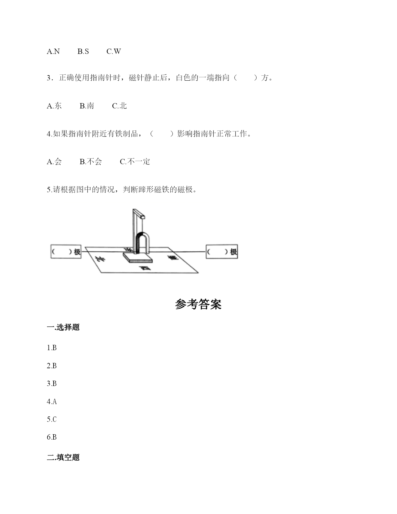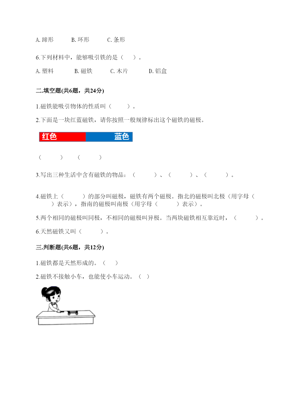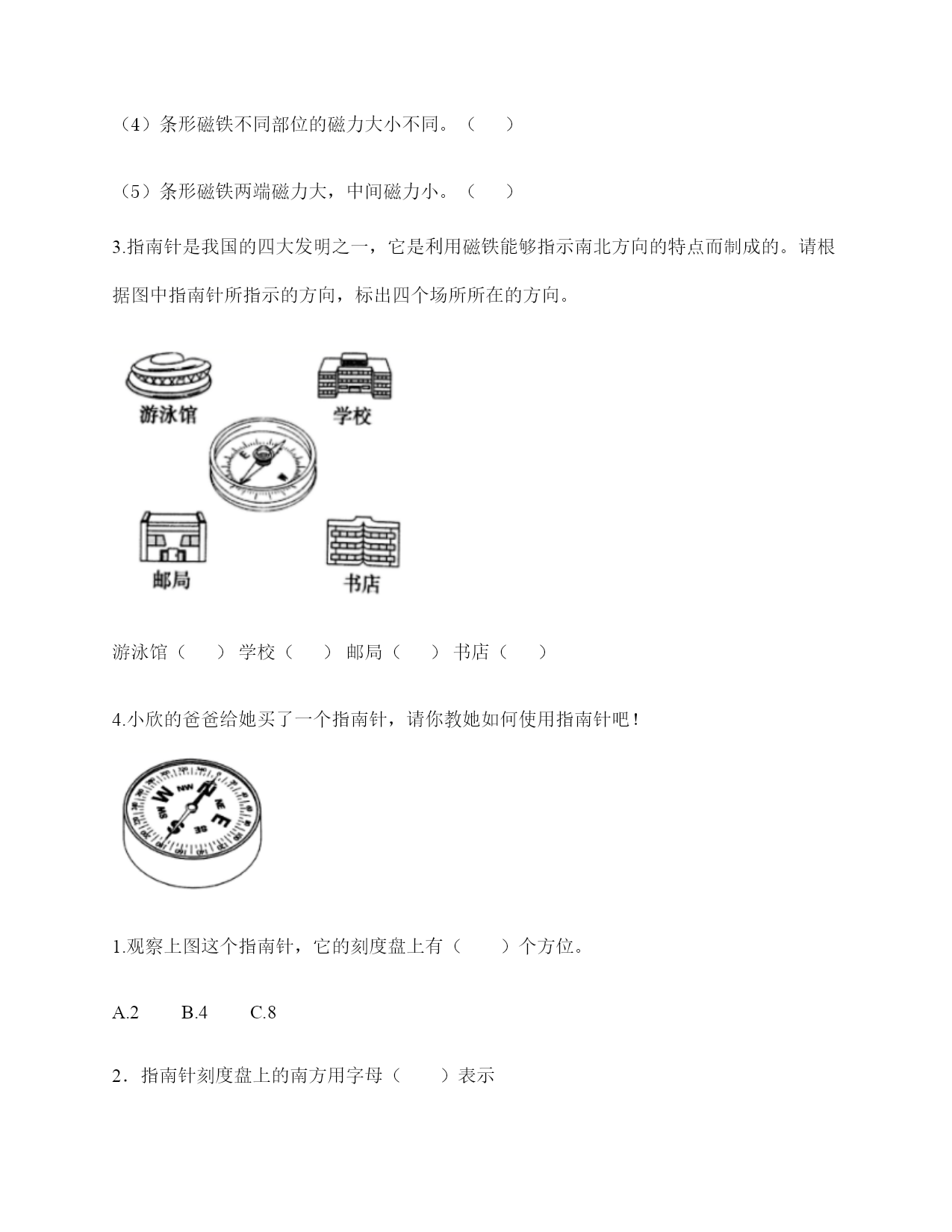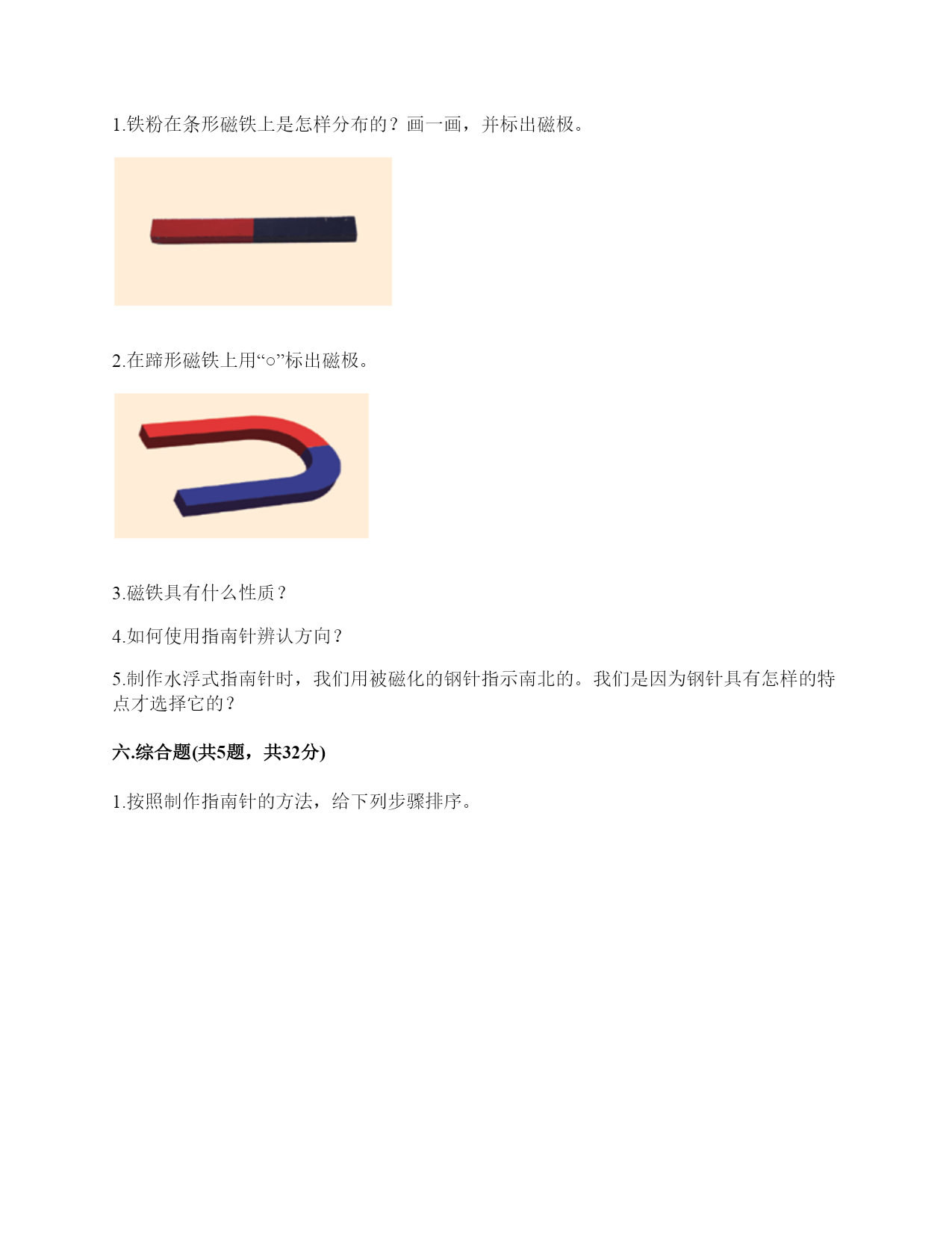 小学科学《磁铁》练习题一.选择题(共6题,共12分)1.如图所示,提出指南针的四种放置方法的科学家是()。A.张衡B.沈括C.祖冲之2.“司南”被称为世界上最早的“指南针”,它是()。A.B.C.3.一块磁铁有()磁极。A.没有B.2个C.不同的磁铁不一样4.下图中两块磁铁相互靠近时互相吸引的是()。A.甲、乙B.乙、丙C.丙、丁D.甲、丁5.我们可以用“支架法”给()磁铁进行指示方向的实验。A.蹄形B.环形C.条形6.下列材料中,能够吸引铁的是()。A.塑料B.磁铁C.木片D.铝盒二.填空题(共6题,共24分)1.磁铁能吸引物体的性质叫()。2.下面是一块红蓝磁铁,请你按照一般规律标出这个磁铁的磁极。()()3.写出三种生活中含有磁铁的物品:()、()、()。4.磁铁上()的部分叫磁极,磁铁有两个磁极。指北的磁极叫北极(用字母()表示),指南的磁极叫南极(用字母()表示)。5.两个相同的磁极叫同极,不相同的磁极叫异极。当两块磁铁相互靠近时,()。6.天然磁铁又叫()。三.判断题(共6题,共12分)1.磁铁都是天然形成的。()2.磁铁不接触小车,也能使小车运动。()3.磁铁只能吸引铁。()4.磁铁隔着很远的地方也可以吸引铁制小车。()5.在让小车动起来的实验中,只有接触小车才能让它动。()6.我们在做“磁铁能隔着这些物体吸引小车”时,只要做一次就能判断出结果了。()四.连线题(共1题,共4分)1.请将生活中的物品与对应的磁铁的作用连线。记录信息指示方向固定物体磁悬浮五.简答题(共5题,共25分)1.铁粉在条形磁铁上是怎样分布的?画一画,并标出磁极。2.在蹄形磁铁上用“○”标出磁极。3.磁铁具有什么性质?4.如何使用指南针辨认方向?5.制作水浮式指南针时,我们用被磁化的钢针指示南北的。我们是因为钢针具有怎样的特点才选择它的?六.综合题(共5题,共32分)1.按照制作指南针的方法,给下列步骤排序。正确的制作步骤是:()。2.将磁铁放在铁粉盒子上,并轻轻晃动盒子,可以看到如图所示的现象。根据图片中的现象,是否可以得出以下结论。如果可以,在括号内打“√”。如果不可以,在括号内打“×"。(1)条形磁铁能吸引铁粉。()(2)条形磁铁有两极。()(3)条形磁铁的磁极间有相互作用。()(4)条形磁铁不同部位的磁力大小不同。()(5)条形磁铁两端磁力大,中间磁力小。()3.指南针是我国的四大发明之一,它是利用磁铁能够指示南北方向的特点而制成的。请根据图中指南针所指示的方向,标出四个场所所在的方向。游泳馆()学校()邮局()书店()4.小欣的爸爸给她买了一个指南针,请你教她如何使用指南针吧!1.观察上图这个指南针,它的刻度盘上有()个方位。A.2B.4C.82.指南针刻度盘上的南方用字母()表示A.NB.SC.W3.正确使用指南针时,磁针静止后,白色的一端指向()方。A.东B.南C.北4.如果指南针附近有铁制品,()影响指南针正常工作。A.会B.不会C.不一定5.请根据图中的情况,判断蹄形磁铁的磁极。参考答案一.选择题1.B2.B3.B4.A5.C6.B二.填空题1.磁性2.北极;南极3.冰箱门;磁力扣;门吸4.磁力最强;N;S5.同极相斥,异极相吸6.磁石三.判断题1.×2.√3.×4.×5.×6.×四.连线题1.如下:五.简答题1.如下:2.如下:3.(1)磁铁有磁性,可以吸引铁制的物品。(2)磁铁具有磁极,每一个磁铁有N极和S极两种磁极,是成对存在。(3)当两个磁铁互相靠近,相同的磁极会互相排斥推开,不相同的磁极会互相吸引黏住。所以说:同极相斥,异极相吸。4.静置在桌面上等待指针停止转动,待停止转动后将刻度盘上的北和指针红色的一端对齐,此时刻度盘上的方向就是真实的方向。5.钢针较轻,受外力影响较小,指示方向更准确。六.综合题1.⑤④①②⑥③2.√;×;×;√;√3.东;南;北;西4.CBBA5.北南