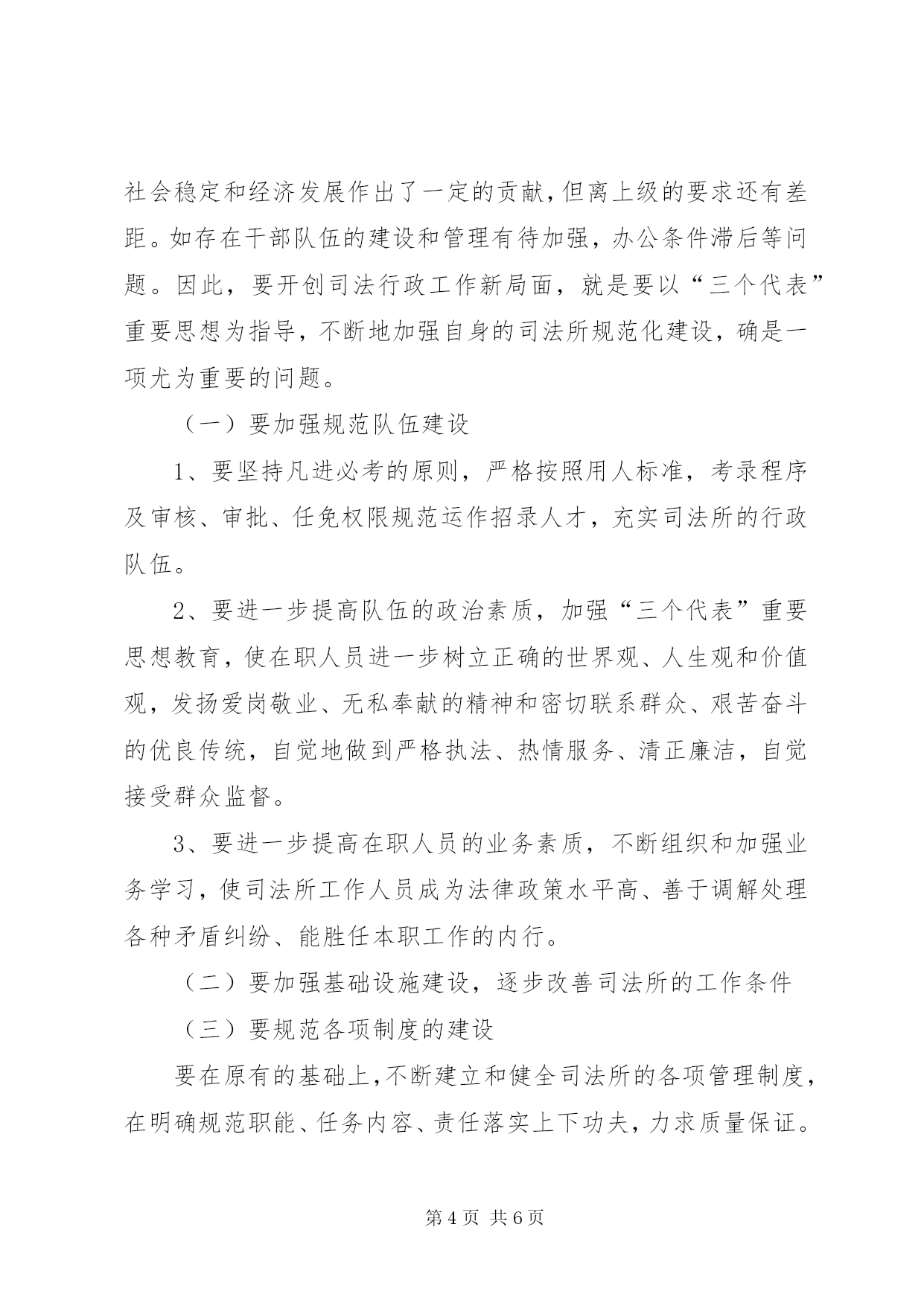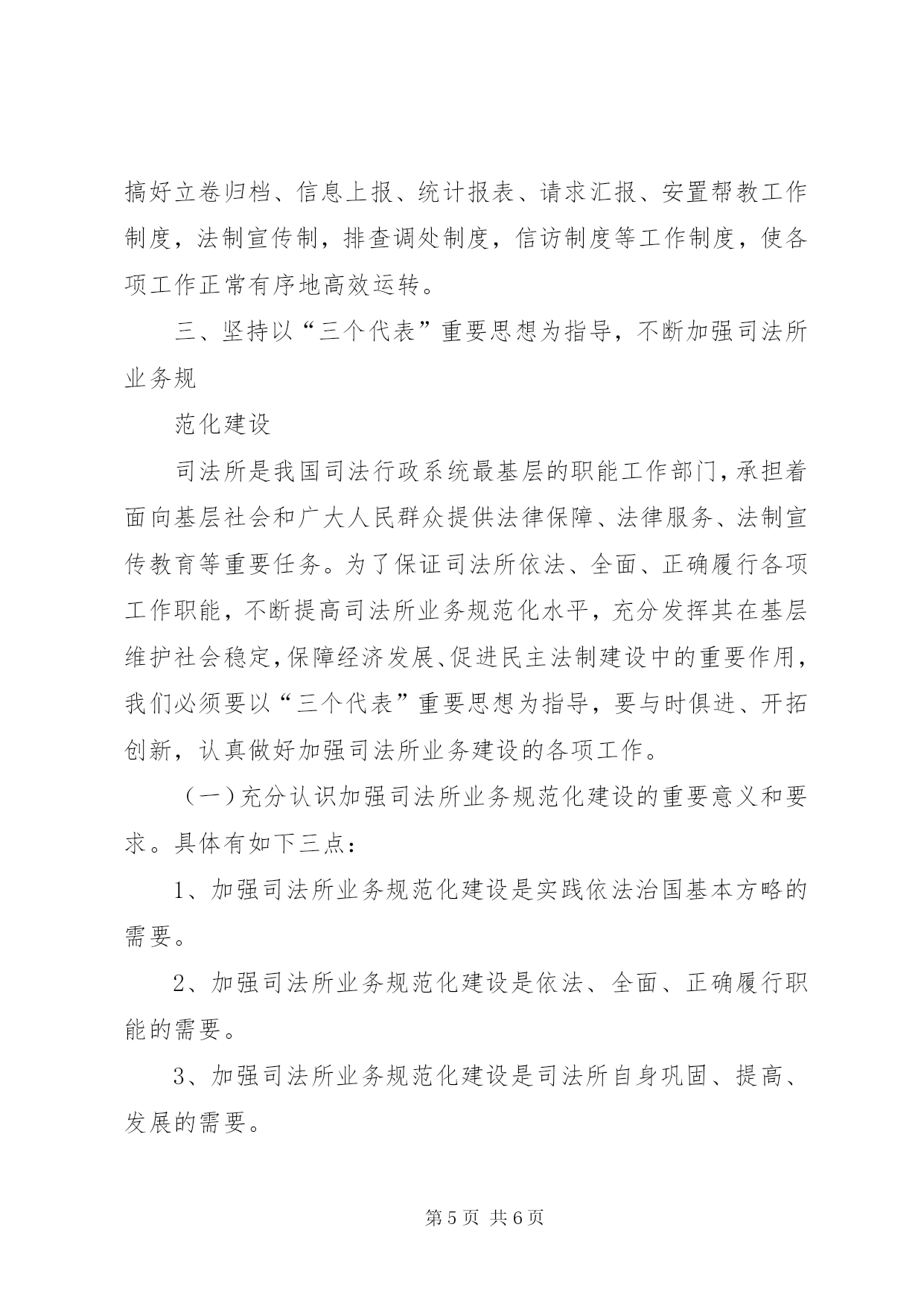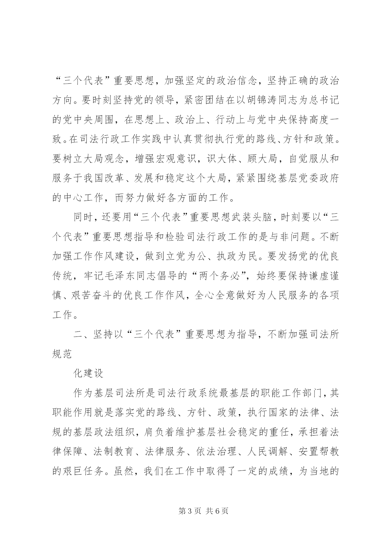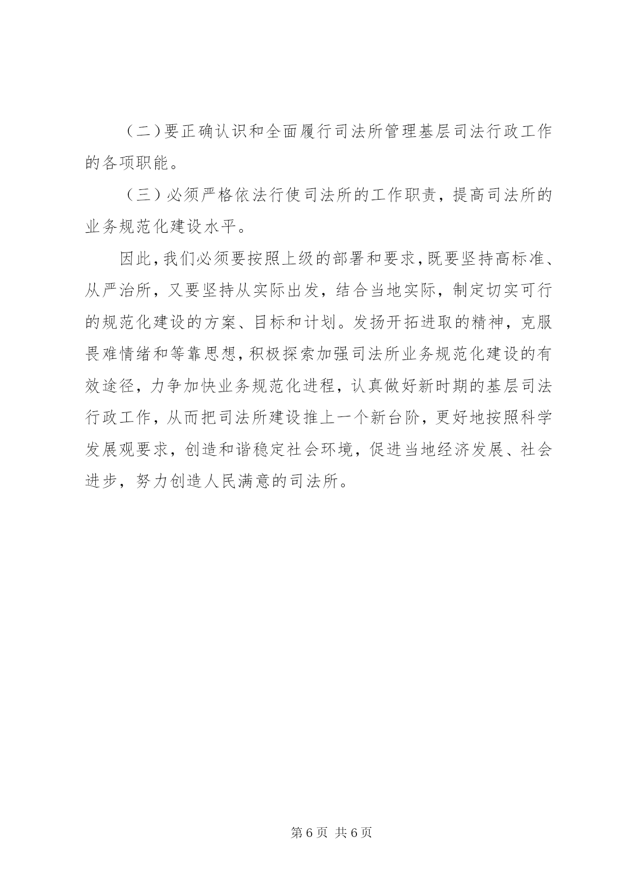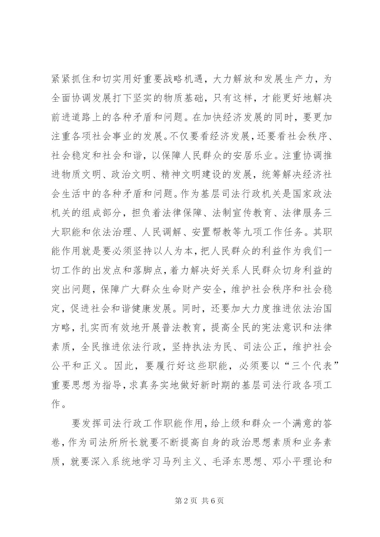 第PAGE\*Arabic\*MERGEFORMAT6页共NUMPAGES\*MERGEFORMAT6页新任司法所所长培训学习心得坚持以“三个代表”重要思想为指导认真做好新时期的基层司法行政工作在XX县区司法局和省司法厅领导的关心和培养下,本人幸会地参加到省司法厅组织的xx年第二期新任司法所所长培训班培训学习,聆听了省司法厅领导、警官学院的专家、导师们的授课,使我从政治思想素质和业务素质等方面都有较大的提高,受益匪浅,特别是增强了“内强素质,外树形象”、爱岗敬业的觉悟和信心。具体学习心得体会有如下三点:一、坚持以“三个代表”重要思想为指导,不断加强自身的政治素质党的十六大把“三个代表”重要思想确定为党必须长期坚持的指导思想,这是我们党高举邓小平理论伟大旗帜、继往开来、与时俱进,全面建设小康社会,加快实现社会主义现代化的目标的根本思想保证。胡锦涛总书记在“七一”讲话中指出:“三个代表”重要思想的本质是立党为公、执政为民,学习贯彻“三个代表”重要思想,必须以最广大人民的根本利益为根本出发点和落脚点,要坚持权为民所用、情为民所系、利为民所谋。同时,党的十六届三中全会提出要坚持科学发展观。科学发展观要求经济社会协调发展。这对于我们这个正处于并将长期处于社会主义初级阶段的大国来讲,首要问题还是必须坚持以经济建设为中心,紧紧抓住和切实用好重要战略机遇,大力解放和发展生产力,为全面协调发展打下坚实的物质基础,只有这样,才能更好地解决前进道路上的各种矛盾和问题。在加快经济发展的同时,要更加注重各项社会事业的发展。不仅要看经济发展,还要看社会秩序、社会稳定和社会和谐,以保障人民群众的安居乐业。注重协调推进物质文明、政治文明、精神文明建设的发展,统筹解决经济社会生活中的各种矛盾和问题。作为基层司法行政机关是国家政法机关的组成部分,担负着法律保障、法制宣传教育、法律服务三大职能和依法治理、人民调解、安置帮教等九项工作任务。其职能作用就是要必须坚持以人为本,把人民群众的利益作为我们一切工作的出发点和落脚点,着力解决好关系人民群众切身利益的突出问题,保障广大群众生命财产安全,维护社会秩序和社会稳定,促进社会和谐健康发展。同时,还要加大力度推进依法治国方略,扎实而有效地开展普法教育,提高全民的宪法意识和法律素质,全民推进依法行政,坚持执法为民、司法公正,维护社会公平和正义。因此,要履行好这些职能,必须要以“三个代表”重要思想为指导,求真务实地做好新时期的基层司法行政各项工作。要发挥司法行政工作职能作用,给上级和群众一个满意的答卷,作为司法所所长就要不断提高自身的政治思想素质和业务素质,就要深入系统地学习马列主义、毛泽东思想、邓小平理论和“三个代表”重要思想,加强坚定的政治信念,坚持正确的政治方向。要时刻坚持党的领导,紧密团结在以胡锦涛同志为总书记的党中央周围,在思想上、政治上、行动上与党中央保持高度一致。在司法行政工作实践中认真贯彻执行党的路线、方针和政策。要树立大局观念,增强宏观意识,识大体、顾大局,自觉服从和服务于我国改革、发展和稳定这个大局,紧紧围绕基层党委政府的中心工作,而努力做好各方面的工作。同时,还要用“三个代表”重要思想武装头脑,时刻要以“三个代表”重要思想指导和检验司法行政工作的是与非问题。不断加强工作作风建设,做到立党为公、执政为民。要发扬党的优良传统,牢记毛泽东同志倡导的“两个务必”,始终要保持谦虚谨慎、艰苦奋斗的优良工作作风,全心全意做好为人民服务的各项工作。二、坚持以“三个代表”重要思想为指导,不断加强司法所规范化建设作为基层司法所是司法行政系统最基层的职能工作部门,其职能作用就是落实党的路线、方针、政策,执行国家的法律、法规的基层政法组织,肩负着维护基层社会稳定的重任,承担着法律保障、法制教育、法律服务、依法治理、人民调解、安置帮教的艰巨任务。虽然,我们在工作中取得了一定的成绩,为当地的社会稳定和经济发展作出了一定的贡献,但离上级的要求还有差距。如存在干部队伍的建设和管理有待加强,办公条件滞后等问题。因此,要开创司法行政工作新局面,就是要以“三个代表”重要思想为指导,不断地加强自身的司法所规范化建设,确是一项尤为重要的问题。(一)要加强规范队伍建设1、要坚持凡进必考的原则,严格按照用人标准,考录程序及审核、审批、任免权限规范运作招录人才,充实司法所的行政队伍。2、要进一步提高队伍的政治素质,加强“三个代表”重要思想教育,使在职人员进一步树立正确的世界观、人生观和价值观,发扬爱岗敬业、无私奉献的精神和密切联系群众、艰苦奋斗的优良传统,自觉地做到严格执法、热情服务、清正廉洁,自觉接受群众监督。3、要进一步提高在职人员的业务素质,不断组织和加强业务学习,使司法所工作人员成为法律政策水平高、善于调解处理各种矛盾