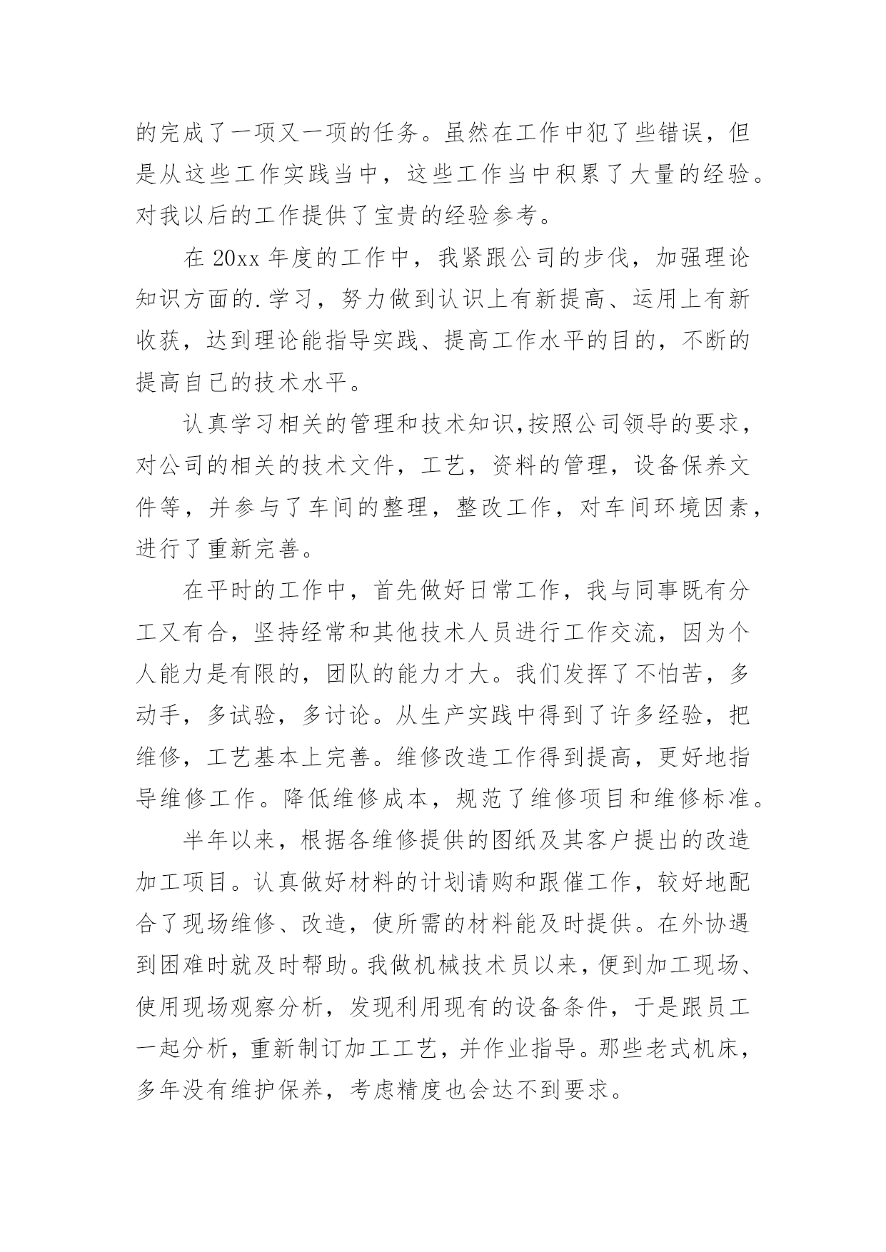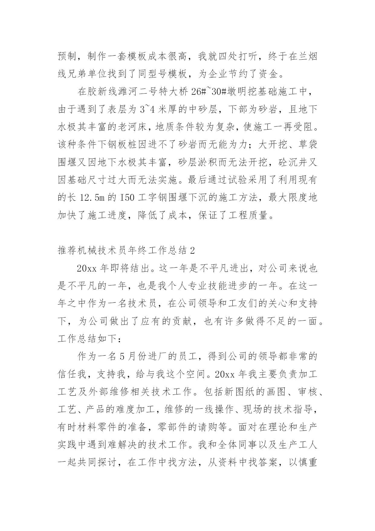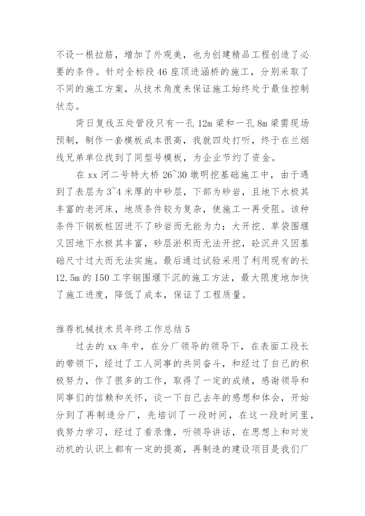 机械技术员年终工作总结推荐机械技术员年终工作总结总结是指对某一阶段的工作、学习或思想中的经验或情况加以总结和概括的书面材料,通过它可以正确认识以往学习和工作中的优缺点,不如立即行动起来写一份总结吧。总结一般是怎么写的呢?下面是小编整理的推荐机械技术员年终工作总结,欢迎阅读,希望大家能够喜欢。推荐机械技术员年终工作总结1本人1976年12月至1978年12月在哈尔滨铁路工程学校机械专业学习,后于84年9月至87年6月在哈尔滨职大铁道工程专业学习。1988年至1990年即在四川岷江大桥工地重点负责直径1.8m的大孔径钻孔桩施工的技术工作。并直接参与了加筋土路堤施工、双导梁架梁和20m后张法预应力梁的施工。三年中,由于自己的积极工作,为大桥的顺利完工做出了应有的贡献。特别是当1.5T重的钻头因突发洪水而被塌孔埋在孔内16m深处时,没有因此而变更设计,而是采取了一套特殊的处理方法,终于将钻头打捞上来,受到了业主的高度称赞。加筋土路堤施工中,我们发现了采取不同的设计理论就会有不同的设计结果,后经与设计单位联系,结合现场实际情况,重新进行了检算,部分管段的路堤内减少了大量的拉带数量,为企业增加了效益。岷江大桥被业主评为优质工程和优秀管理奖。由于本人的积极工作,90年被破格晋升为工程师。在济南北环二期工程中,我任九队技术主管,直接参与了铁道部科研项目16mSRC型钢梁的施工,积累了大量的资料和经验。特别是在济南东站(原北关站)站场改造中,设计要求在保证既有线通车的条件下,对既有桥墩台进行加高并撤换部分梁体,这是一项十分艰巨的工程。由于施组编制的合理,现场组织有力,即保证了安全质量,也保证了工期,创出了较好的'经济效益。在胶黄铁路胶州大桥施工中,我对墩帽模板采取了特殊设计,利用墩身上的预留螺栓建立工作平台,不设地面支撑,而且砼内不设一根拉筋,减少了劳动强度,提高了工作效率,增加了砼的表面光洁度。菏日复线施工中,身为总工程师,主持了全标段58.4km包括180座桥涵工程、路基工程、轨道工程、给排水工程、房建工程、通信信号工程、电力工程等全面的技术工作,主持编写了全标段的实施性施工组织设计和三个站场改造,三处换边的过渡方案的制定。在洙赵新河大桥板式墩身模板设计中,采用技术手段,砼内不设一根拉筋,增加了外观美,也为创建精品工程创造了必要的条件。针对全标段46座顶进涵桥的施工,分别采取了不同的施工方案,从技术角度来保证施工始终处于最佳控制状态。菏日复线五处管段只有一孔12m梁和一孔8m梁需现场预制,制作一套模板成本很高,我就四处打听,终于在兰烟线兄弟单位找到了同型号模板,为企业节约了资金。在胶新线潍河二号特大桥26#~30#墩明挖基础施工中,由于遇到了表层为3~4米厚的中砂层,下部为砂岩,且地下水极其丰富的老河床,地质条件较为复杂,使施工一再受阻。该种条件下钢板桩因进不了砂岩而无能为力;大开挖、草袋围堰又因地下水极其丰富,砂层淤积而无法开挖,砼沉井又因基础尺寸过大而无法实施。最后通过试验采用了利用现有的长12.5m的I50工字钢围堰下沉的施工方法,最大限度地加快了施工进度,降低了成本,保证了工程质量。推荐机械技术员年终工作总结220xx年即将结出。这一年是不平凡进出,对公司来说也是不平凡的一年,也是我个人专业技能进步的一年。在这一年之中作为一名技术员,在公司领导和工友们的关心和支持下,为公司做出了应有的贡献,也有许多做得不足的一面。工作总结如下:作为一名5月份进厂的员工,得到公司的领导都非常的信任我,支持我,给与我这个空间。20xx年我主要负责加工工艺及外部维修相关技术工作。包括新图纸的画图、审核、工艺、产品的难度加工,维修的一线操作、现场的技术指导,有时材料零件的准备,零部件的请购等。面对在理论和生产实践中遇到难解决的技术工作。我和全体同事以及生产工人一起共同探讨,在工作中找方法,从资料中找答案,以慎重的完成了一项又一项的任务。虽然在工作中犯了些错误,但是从这些工作实践当中,这些工作当中积累了大量的经验。对我以后的工作提供了宝贵的经验参考。在20xx年度的工作中,我紧跟公司的步伐,加强理论知识方面的.学习,努力做到认识上有新提高、运用上有新收获,达到理论能指导实践、提高工作水平的目的,不断的提高自己的技术水平。认真学习相关的管理和技术知识,按照公司领导的要求,对公司的相关的技术文件,工艺,资料的管理,设备保养文件等,并参与了车间的整理,整改工作,对车间环境因素,进行了重新完善。在平时的工作中,首先做好日常工作,我与同事既有分工又有合,坚持经常和其他技术人员进行工作交流,因为个人能力是有限的,团队的能力才大。我们发挥了不怕苦,多动手,多试验,多讨论。从生产实践中得到了许多经验,把维修,工艺基本上完善。维修改造工作得到提高,更好地指导维修工作。降低