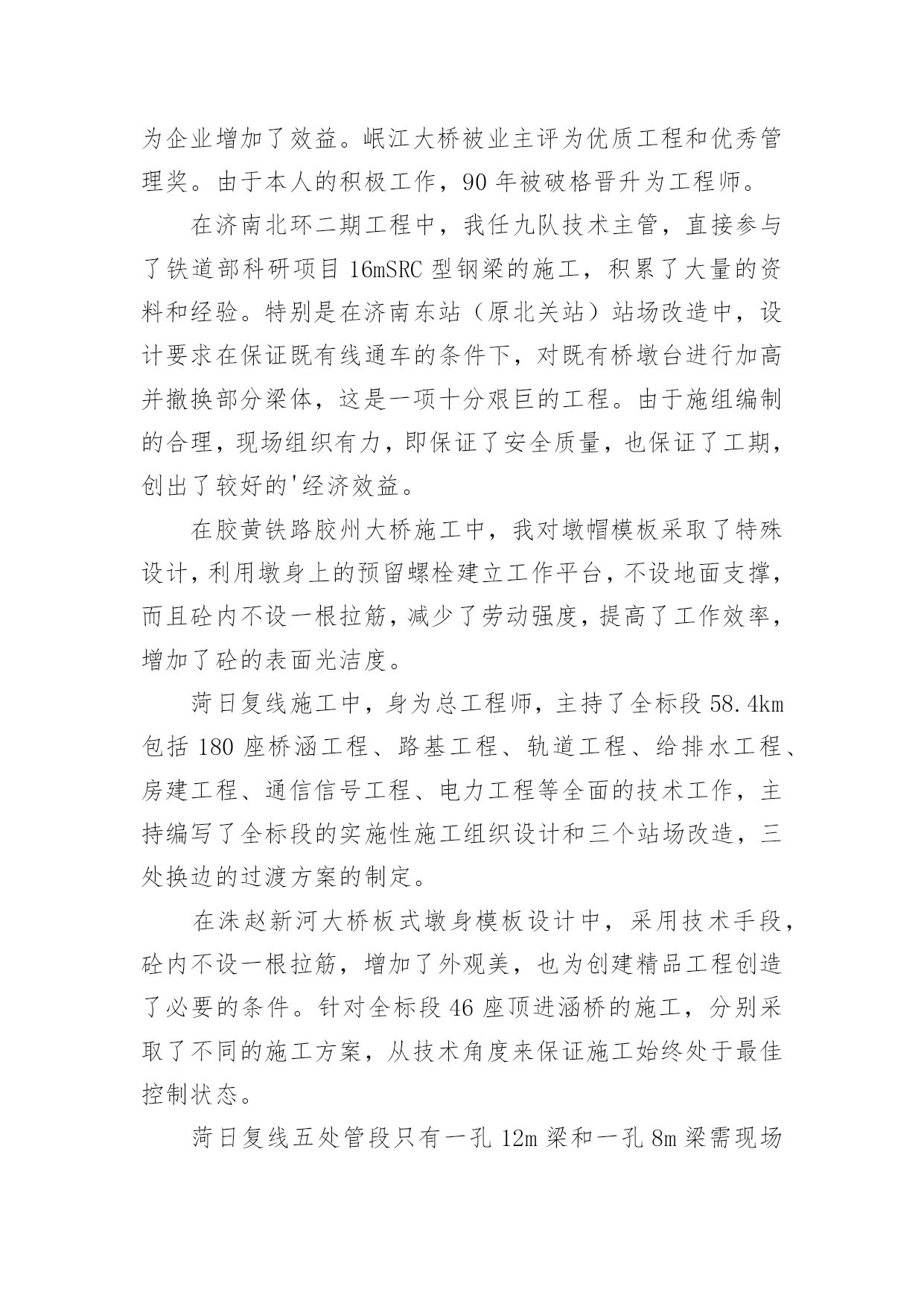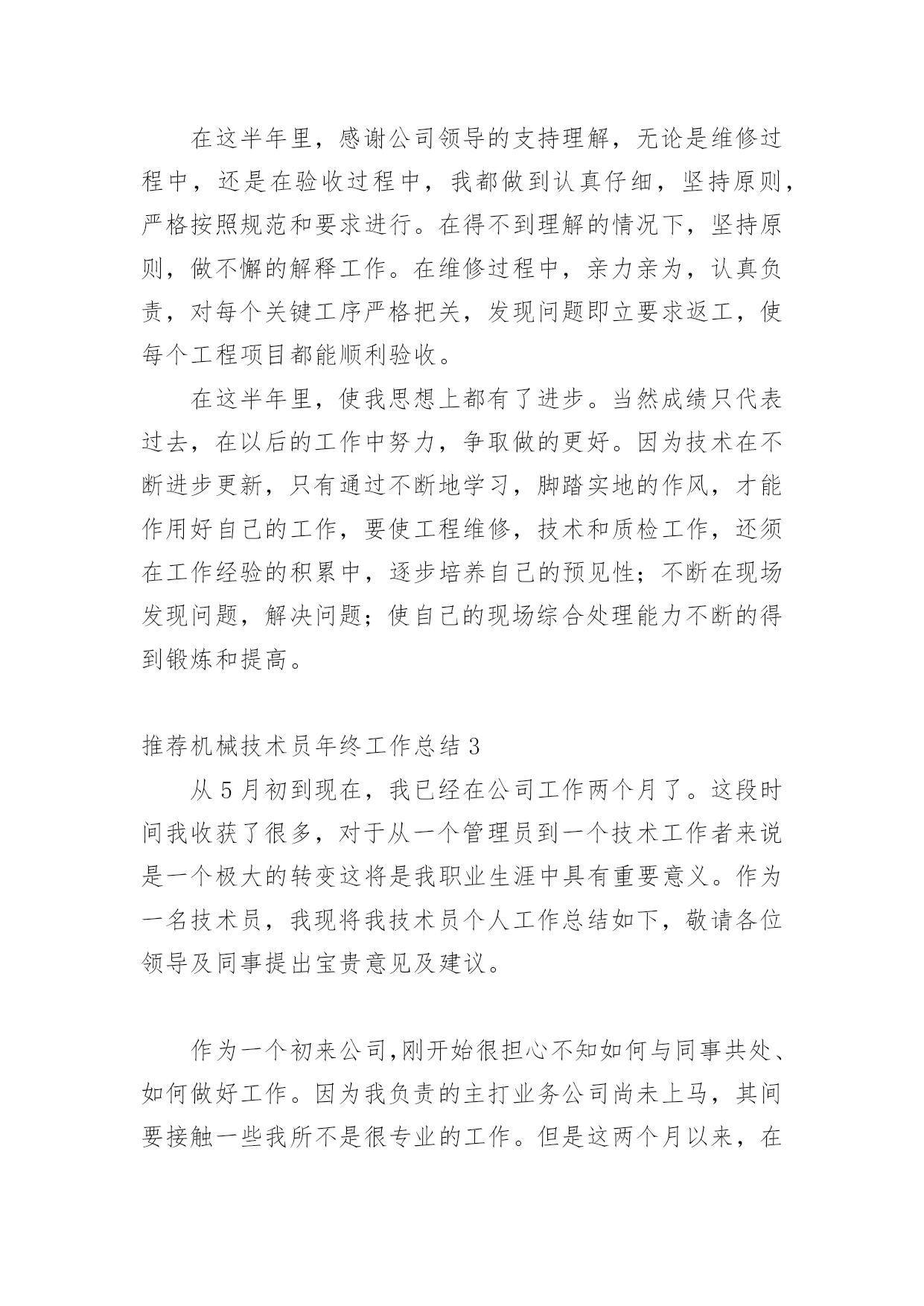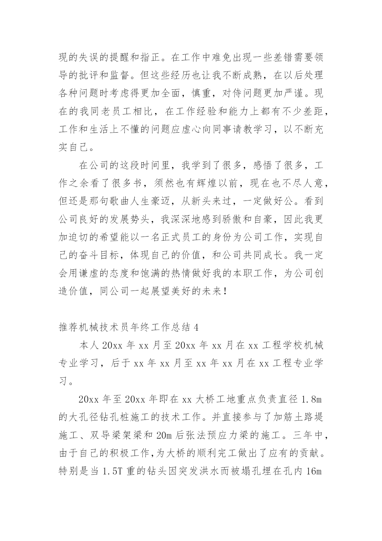 机械技术员年终工作总结推荐机械技术员年终工作总结总结是指对某一阶段的工作、学习或思想中的经验或情况加以总结和概括的书面材料,通过它可以正确认识以往学习和工作中的优缺点,不如立即行动起来写一份总结吧。总结一般是怎么写的呢?下面是小编整理的推荐机械技术员年终工作总结,欢迎阅读,希望大家能够喜欢。推荐机械技术员年终工作总结1本人1976年12月至1978年12月在哈尔滨铁路工程学校机械专业学习,后于84年9月至87年6月在哈尔滨职大铁道工程专业学习。1988年至1990年即在四川岷江大桥工地重点负责直径1.8m的大孔径钻孔桩施工的技术工作。并直接参与了加筋土路堤施工、双导梁架梁和20m后张法预应力梁的施工。三年中,由于自己的积极工作,为大桥的顺利完工做出了应有的贡献。特别是当1.5T重的钻头因突发洪水而被塌孔埋在孔内16m深处时,没有因此而变更设计,而是采取了一套特殊的处理方法,终于将钻头打捞上来,受到了业主的高度称赞。加筋土路堤施工中,我们发现了采取不同的设计理论就会有不同的设计结果,后经与设计单位联系,结合现场实际情况,重新进行了检算,部分管段的路堤内减少了大量的拉带数量,为企业增加了效益。岷江大桥被业主评为优质工程和优秀管理奖。由于本人的积极工作,90年被破格晋升为工程师。在济南北环二期工程中,我任九队技术主管,直接参与了铁道部科研项目16mSRC型钢梁的施工,积累了大量的资料和经验。特别是在济南东站(原北关站)站场改造中,设计要求在保证既有线通车的条件下,对既有桥墩台进行加高并撤换部分梁体,这是一项十分艰巨的工程。由于施组编制的合理,现场组织有力,即保证了安全质量,也保证了工期,创出了较好的'经济效益。在胶黄铁路胶州大桥施工中,我对墩帽模板采取了特殊设计,利用墩身上的预留螺栓建立工作平台,不设地面支撑,而且砼内不设一根拉筋,减少了劳动强度,提高了工作效率,增加了砼的表面光洁度。菏日复线施工中,身为总工程师,主持了全标段58.4km包括180座桥涵工程、路基工程、轨道工程、给排水工程、房建工程、通信信号工程、电力工程等全面的技术工作,主持编写了全标段的实施性施工组织设计和三个站场改造,三处换边的过渡方案的制定。在洙赵新河大桥板式墩身模板设计中,采用技术手段,砼内不设一根拉筋,增加了外观美,也为创建精品工程创造了必要的条件。针对全标段46座顶进涵桥的施工,分别采取了不同的施工方案,从技术角度来保证施工始终处于最佳控制状态。菏日复线五处管段只有一孔12m梁和一孔8m梁需现场预制,制作一套模板成本很高,我就四处打听,终于在兰烟线兄弟单位找到了同型号模板,为企业节约了资金。在胶新线潍河二号特大桥26#~30#墩明挖基础施工中,由于遇到了表层为3~4米厚的中砂层,下部为砂岩,且地下水极其丰富的老河床,地质条件较为复杂,使施工一再受阻。该种条件下钢板桩因进不了砂岩而无能为力;大开挖、草袋围堰又因地下水极其丰富,砂层淤积而无法开挖,砼沉井又因基础尺寸过大而无法实施。最后通过试验采用了利用现有的长12.5m的I50工字钢围堰下沉的施工方法,最大限度地加快了施工进度,降低了成本,保证了工程质量。推荐机械技术员年终工作总结220xx年即将结出。这一年是不平凡进出,对公司来说也是不平凡的一年,也是我个人专业技能进步的一年。在这一年之中作为一名技术员,在公司领导和工友们的关心和支持下,为公司做出了应有的贡献,也有许多做得不足的一面。工作总结如下:作为一名5月份进厂的员工,得到公司的领导都非常的信任我,支持我,给与我这个空间。20xx年我主要负责加工工艺及外部维修相关技术工作。包括新图纸的画图、审核、工艺、产品的难度加工,维修的一线操作、现场的技术指导,有时材料零件的准备,零部件的请购等。面对在理论和生产实践中遇到难解决的技术工作。我和全体同事以及生产工人一起共同探讨,在工作中找方法,从资料中找答案,以慎重的完成了一项又一项的任务。虽然在工作中犯了些错误,但是从这些工作实践当中,这些工作当中积累了大量的经验。对我以后的工作提供了宝贵的经验参考。在20xx年度的工作中,我紧跟公司的步伐,加强理论知识方面的.学习,努力做到认识上有新提高、运用上有新收获,达到理论能指导实践、提高工作水平的目的,不断的提高自己的技术水平。认真学习相关的管理和技术知识,按照公司领导的要求,对公司的相关的技术文件,工艺,资料的管理,设备保养文件等,并参与了车间的整理,整改工作,对车间环境因素,进行了重新完善。在平时的工作中,首先做好日常工作,我与同事既有分工又有合,坚持经常和其他技术人员进行工作交流,因为个人能力是有限的,团队的能力才大。我们发挥了不怕苦,多动手,多试验,多讨论。从生产实践中得到了许多经验,把维修,工艺基本上完善。维修改造工作得到提高,更好地指导维修工作。降低