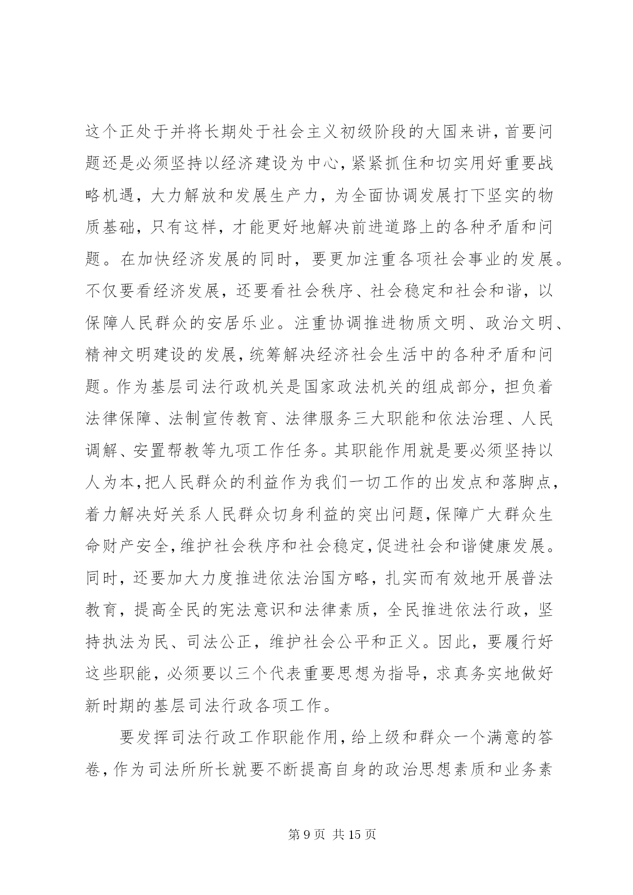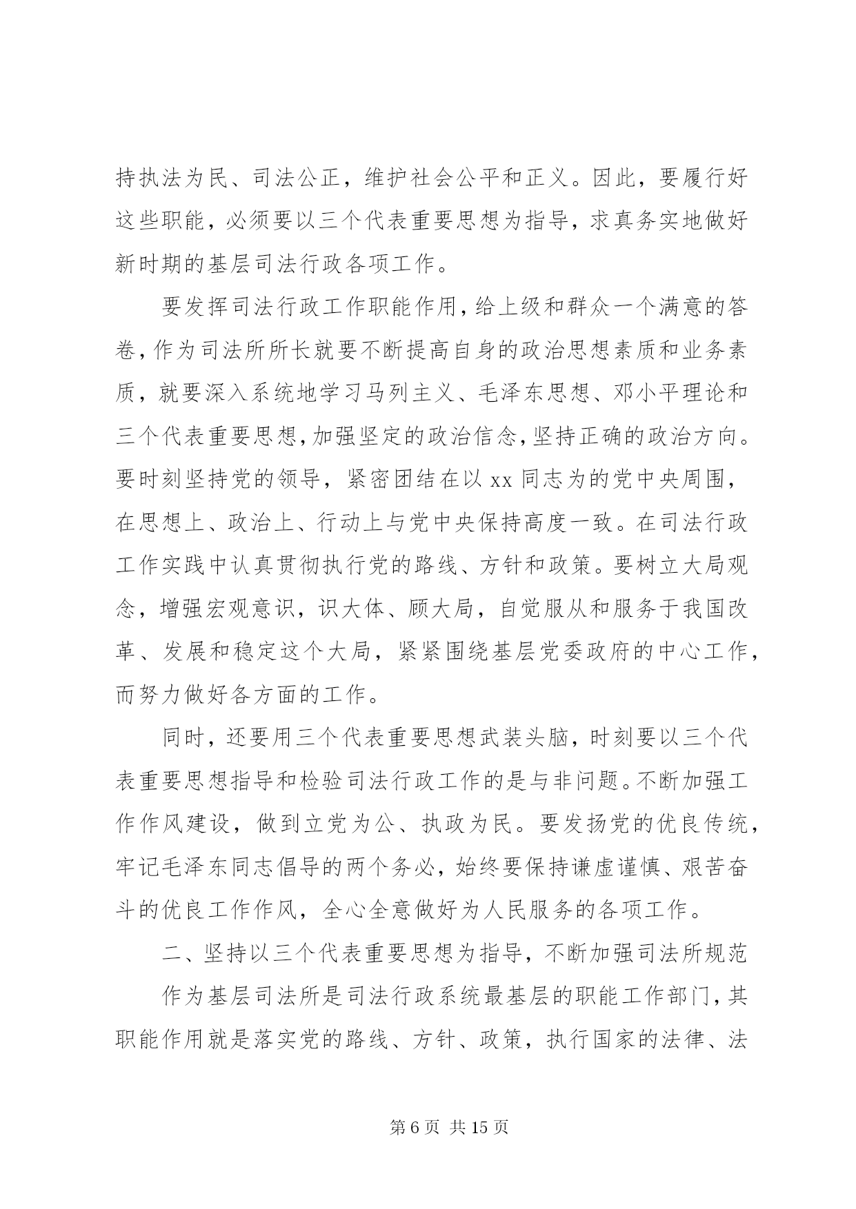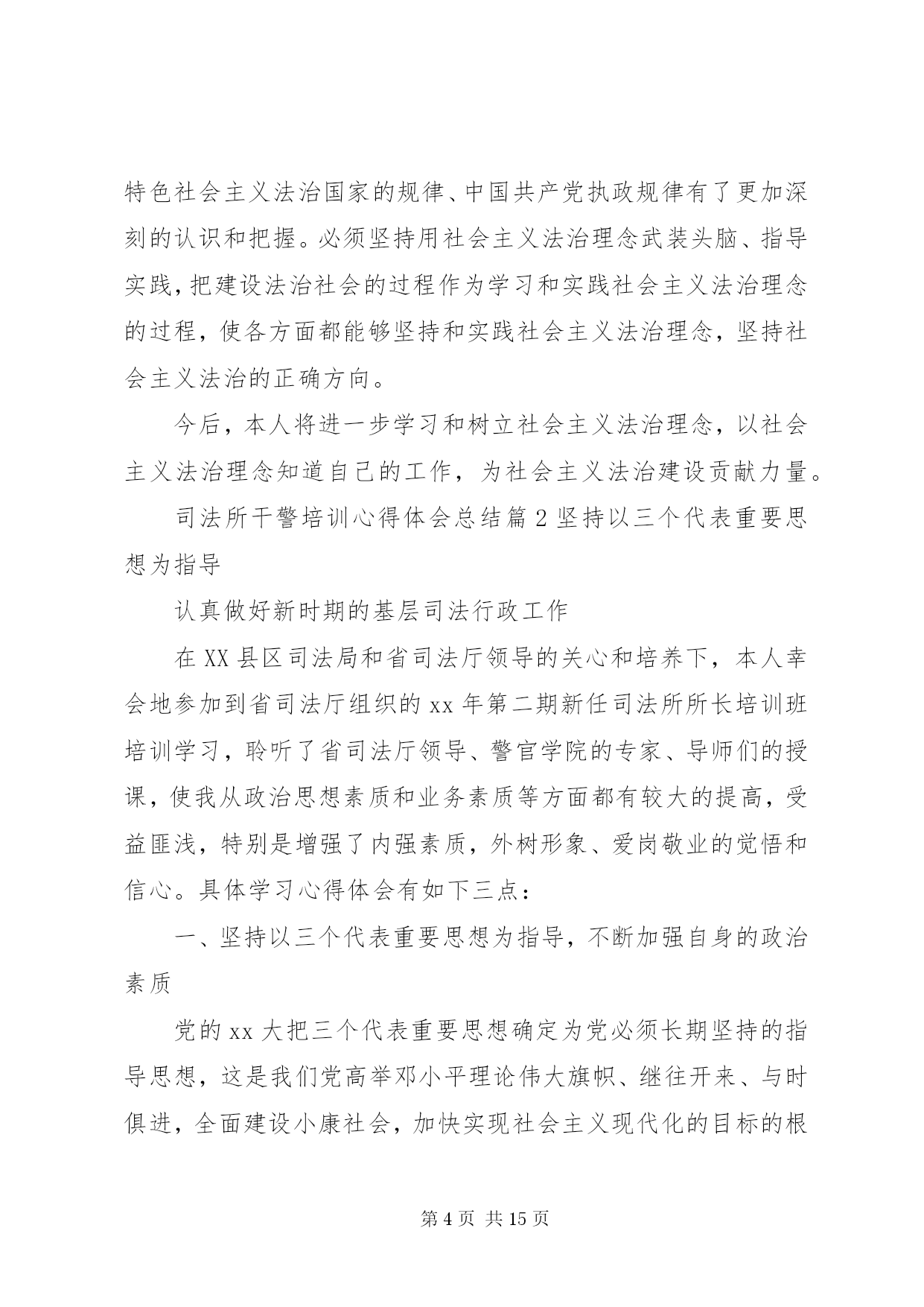 第PAGE\*Arabic\*MERGEFORMAT15页共NUMPAGES\*MERGEFORMAT15页司法所干警培训心得体会总结司法所干警培训心得体会总结篇1理念是行动的指南。建设法治社会,必须牢固树立和始终坚持社会主义法治理念。以社会主义法治理念指导法治社会建设,就要深刻理解和把握社会主义法治理念的本质要求,坚持依法治国、执法为民、公平正义、服务大局、党的领导。这五个方面相辅相成,体现了党的领导、人民当家作主和依法治国的有机统一。坚持社会主义法治理念,就要坚持依法治国。依法治国是社会主义法治的核心内容。依法治国就是把社会主义民主与社会主义法制紧密结合起来,实现民主的制度化、法律化,从而保障人民群众在党的领导下,依照宪法和法律的规定,通过各种途径和形式管理国家事务,管理经济文化事业,管理社会事务,保证国家各项工作都依法进行,维护和实现人民群众的根本利益。要确立和实现以宪法和法律治理国家的最具权威价值的取向,坚持法律面前人人平等,树立和维护法律权威,确立法律是人们生活的基本行为准则的观念,严格依法办事,做到有法可依、有法必依、执法必严、违法必究。依法治省是依法治国基本方略在我省的具体实践。建设法治社会,必须不断推进依法治省,把依法治国的理念体现在各个方面、贯穿于各个环节、落实到各项工作。坚持社会主义法治理念,就要坚持执法为民。执法为民是社会主义法治的本质要求。这是我们党全心全意为人民服务的根本宗旨和立党为公、执政为民的本质要求在法治上的体现。要确立一切权力属于人民、来自于人民的理念,把实现、维护和发展广大人民群众最根本的利益作为出发点和落脚点。要坚持以人为本的理念,在立法、执法、司法的各个环节上体现尊重和保障人权,做到为人民执法、靠人民执法,保证把权为民所用、情为民所系、利为民所谋的要求落到实处。坚持社会主义法治理念,就要坚持公平正义。公平正义是社会主义和谐社会的一个基本特征,也是社会主义法治的价值追求。在建设法治社会的实践中,要把公平正义作为制定法律和进行制度安排的重要依据,从源头上防止社会不公正现象的出现与扩大,并在执法、司法活动中坚持合理合法、及时高效、程序公正的原则,建立保障公平正义的防线;把公平正义作为协调社会各个阶层相互关系的基本准则,依法逐步建立以权利公平、机会公平、规则公平、分配公平为主要内容的社会公平保障体系;把公平正义贯穿于权利与义务的辩证统一之中,坚持权利与义务的对称,保证广大人民群众依法行使权利和履行义务,所有权利的享有都建立在履行义务的基础之上,使遵纪守法成为公民的自觉行为,使公民的合法权益不受侵犯。坚持社会主义法治理念,就要坚持服务大局。服务大局是社会主义法治的重要使命。要紧紧围绕党和国家工作大局开展立法、执法、司法工作,不断强化服务大局的各项措施,为社会主义经济建设、政治建设、文化建设、社会建设提供强有力的法治保障。我国是一个法制统一的国家,建设法治社会要在国家统一的法制框架下加以推进,保证国家宪法和法律在浙江的严格实施,保证党的路线方针政策在浙江的贯彻落实,确保我省的法治建设有利于维护国家利益,维护改革发展稳定的大局。要从讲政治的角度来想大局、谋大局、服务大局,正确处理服务大局与严格依法履行职责的关系,正确处理全局利益与局部利益的关系,正确处理执法的法律效果与社会效果之间的关系,追求法律效果与社会效果的统一。坚持社会主义法治理念,就要坚持党的领导。党的领导是社会主义法治的根本保证。法治建设绝不是要削弱党的领导,而是要从理念上更好地强化党的意识、执政意识、政权意识,通过改善党的领导来更有效地坚持党的领导、加强党的领导,通过完善党的执政方式来更有效地提高党的执政能力、保持党的先进性。建设法治社会,必须旗帜鲜明地坚持党的领导,在党的领导下发展社会主义民主、建设社会主义法治,把党依法执政的过程作为实现人民当家作主和实行依法治国的过程,作为巩固党的执政地位的过程,作为建设社会主义政治文明的过程,把加强党的政治、思想和组织领导贯穿于法治社会建设的全过程。以xx同志为的党中央提出的社会主义法治理念,是对马克思主义法学理论的继承、发展和创新,标志着我们党对建设中国特色社会主义法治国家的规律、中国共产党执政规律有了更加深刻的认识和把握。必须坚持用社会主义法治理念武装头脑、指导实践,把建设法治社会的过程作为学习和实践社会主义法治理念的过程,使各方面都能够坚持和实践社会主义法治理念,坚持社会主义法治的正确方向。今后,本人将进一步学习和树立社会主义法治理念,以社会主义法治理念知道自己的工作,为社会主义法治建设贡献力量。司法所干警培训心得体会总结篇2坚持以三个代表重要思想为指导认真做好新时期的基层司法行政工作在XX县区司法局和省司法厅领导的关心和培养下,本人幸会地参加到省司法厅组织的xx年第