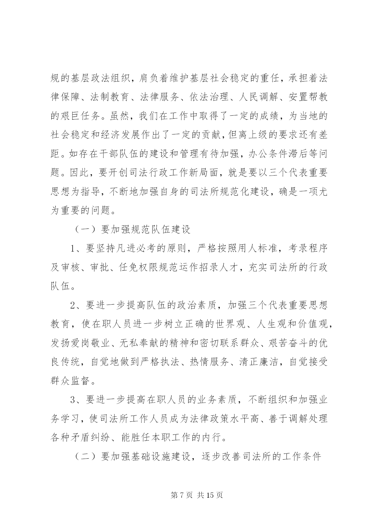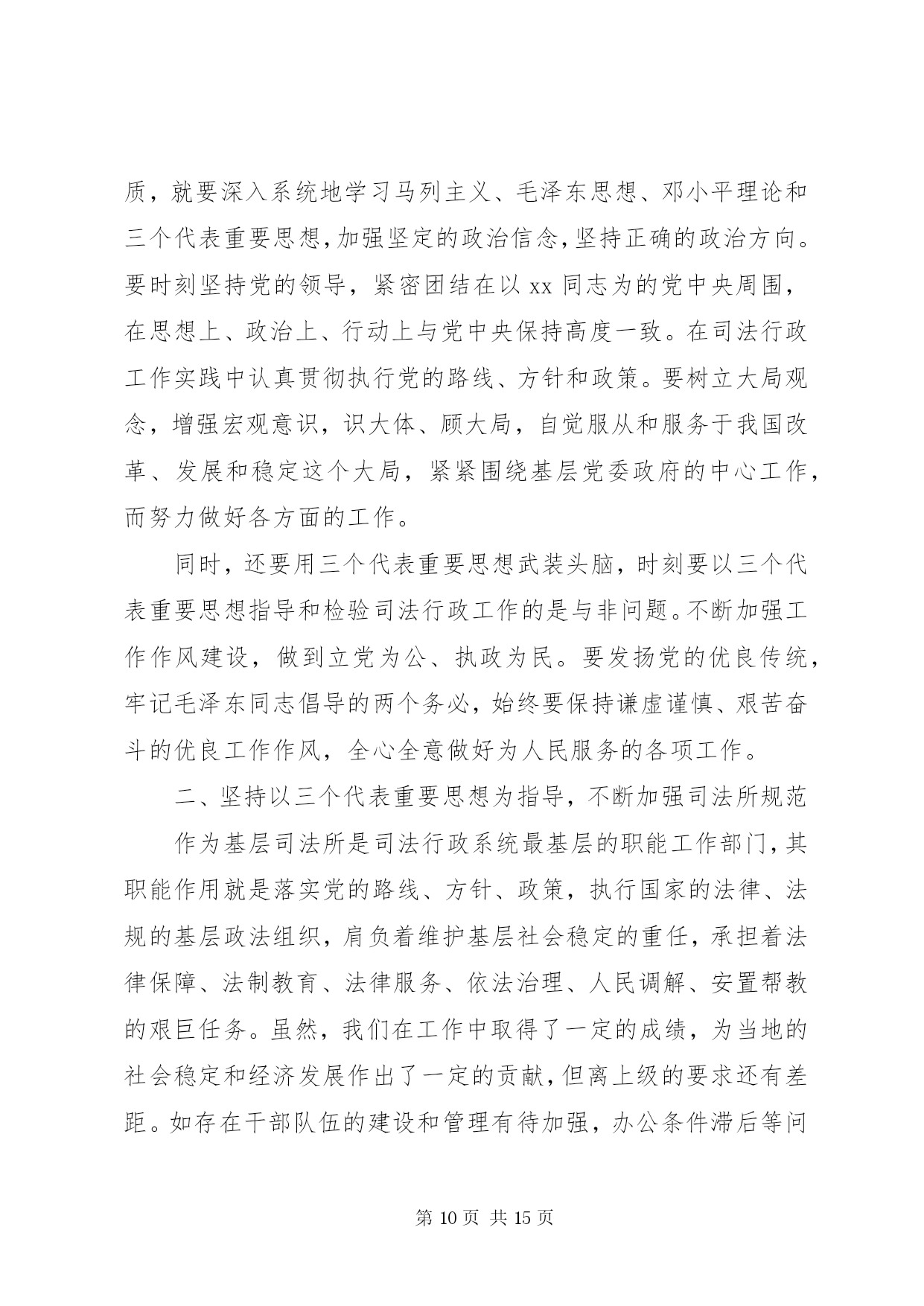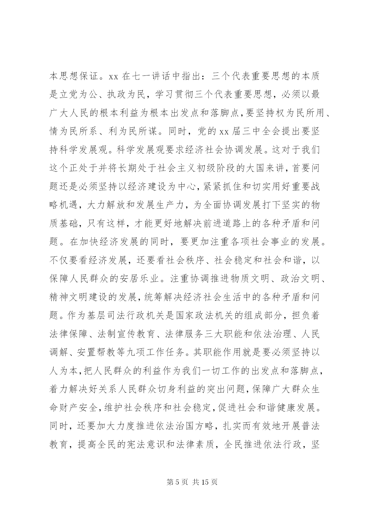 第PAGE\*Arabic\*MERGEFORMAT15页共NUMPAGES\*MERGEFORMAT15页司法所干警培训心得体会总结司法所干警培训心得体会总结篇1理念是行动的指南。建设法治社会,必须牢固树立和始终坚持社会主义法治理念。以社会主义法治理念指导法治社会建设,就要深刻理解和把握社会主义法治理念的本质要求,坚持依法治国、执法为民、公平正义、服务大局、党的领导。这五个方面相辅相成,体现了党的领导、人民当家作主和依法治国的有机统一。坚持社会主义法治理念,就要坚持依法治国。依法治国是社会主义法治的核心内容。依法治国就是把社会主义民主与社会主义法制紧密结合起来,实现民主的制度化、法律化,从而保障人民群众在党的领导下,依照宪法和法律的规定,通过各种途径和形式管理国家事务,管理经济文化事业,管理社会事务,保证国家各项工作都依法进行,维护和实现人民群众的根本利益。要确立和实现以宪法和法律治理国家的最具权威价值的取向,坚持法律面前人人平等,树立和维护法律权威,确立法律是人们生活的基本行为准则的观念,严格依法办事,做到有法可依、有法必依、执法必严、违法必究。依法治省是依法治国基本方略在我省的具体实践。建设法治社会,必须不断推进依法治省,把依法治国的理念体现在各个方面、贯穿于各个环节、落实到各项工作。坚持社会主义法治理念,就要坚持执法为民。执法为民是社会主义法治的本质要求。这是我们党全心全意为人民服务的根本宗旨和立党为公、执政为民的本质要求在法治上的体现。要确立一切权力属于人民、来自于人民的理念,把实现、维护和发展广大人民群众最根本的利益作为出发点和落脚点。要坚持以人为本的理念,在立法、执法、司法的各个环节上体现尊重和保障人权,做到为人民执法、靠人民执法,保证把权为民所用、情为民所系、利为民所谋的要求落到实处。坚持社会主义法治理念,就要坚持公平正义。公平正义是社会主义和谐社会的一个基本特征,也是社会主义法治的价值追求。在建设法治社会的实践中,要把公平正义作为制定法律和进行制度安排的重要依据,从源头上防止社会不公正现象的出现与扩大,并在执法、司法活动中坚持合理合法、及时高效、程序公正的原则,建立保障公平正义的防线;把公平正义作为协调社会各个阶层相互关系的基本准则,依法逐步建立以权利公平、机会公平、规则公平、分配公平为主要内容的社会公平保障体系;把公平正义贯穿于权利与义务的辩证统一之中,坚持权利与义务的对称,保证广大人民群众依法行使权利和履行义务,所有权利的享有都建立在履行义务的基础之上,使遵纪守法成为公民的自觉行为,使公民的合法权益不受侵犯。坚持社会主义法治理念,就要坚持服务大局。服务大局是社会主义法治的重要使命。要紧紧围绕党和国家工作大局开展立法、执法、司法工作,不断强化服务大局的各项措施,为社会主义经济建设、政治建设、文化建设、社会建设提供强有力的法治保障。我国是一个法制统一的国家,建设法治社会要在国家统一的法制框架下加以推进,保证国家宪法和法律在浙江的严格实施,保证党的路线方针政策在浙江的贯彻落实,确保我省的法治建设有利于维护国家利益,维护改革发展稳定的大局。要从讲政治的角度来想大局、谋大局、服务大局,正确处理服务大局与严格依法履行职责的关系,正确处理全局利益与局部利益的关系,正确处理执法的法律效果与社会效果之间的关系,追求法律效果与社会效果的统一。坚持社会主义法治理念,就要坚持党的领导。党的领导是社会主义法治的根本保证。法治建设绝不是要削弱党的领导,而是要从理念上更好地强化党的意识、执政意识、政权意识,通过改善党的领导来更有效地坚持党的领导、加强党的领导,通过完善党的执政方式来更有效地提高党的执政能力、保持党的先进性。建设法治社会,必须旗帜鲜明地坚持党的领导,在党的领导下发展社会主义民主、建设社会主义法治,把党依法执政的过程作为实现人民当家作主和实行依法治国的过程,作为巩固党的执政地位的过程,作为建设社会主义政治文明的过程,把加强党的政治、思想和组织领导贯穿于法治社会建设的全过程。以xx同志为的党中央提出的社会主义法治理念,是对马克思主义法学理论的继承、发展和创新,标志着我们党对建设中国特色社会主义法治国家的规律、中国共产党执政规律有了更加深刻的认识和把握。必须坚持用社会主义法治理念武装头脑、指导实践,把建设法治社会的过程作为学习和实践社会主义法治理念的过程,使各方面都能够坚持和实践社会主义法治理念,坚持社会主义法治的正确方向。今后,本人将进一步学习和树立社会主义法治理念,以社会主义法治理念知道自己的工作,为社会主义法治建设贡献力量。司法所干警培训心得体会总结篇2坚持以三个代表重要思想为指导认真做好新时期的基层司法行政工作在XX县区司法局和省司法厅领导的关心和培养下,本人幸会地参加到省司法厅组织的xx年第