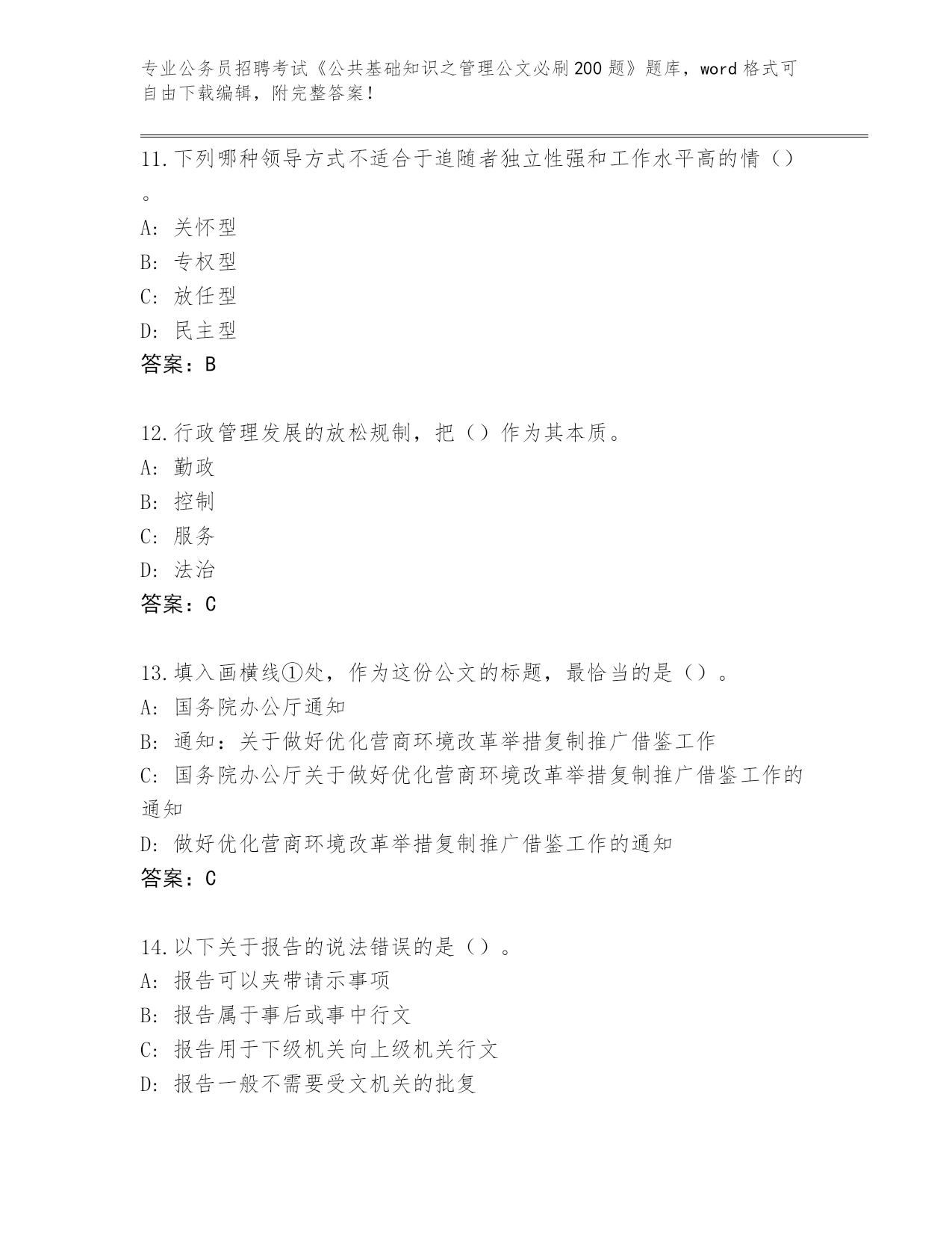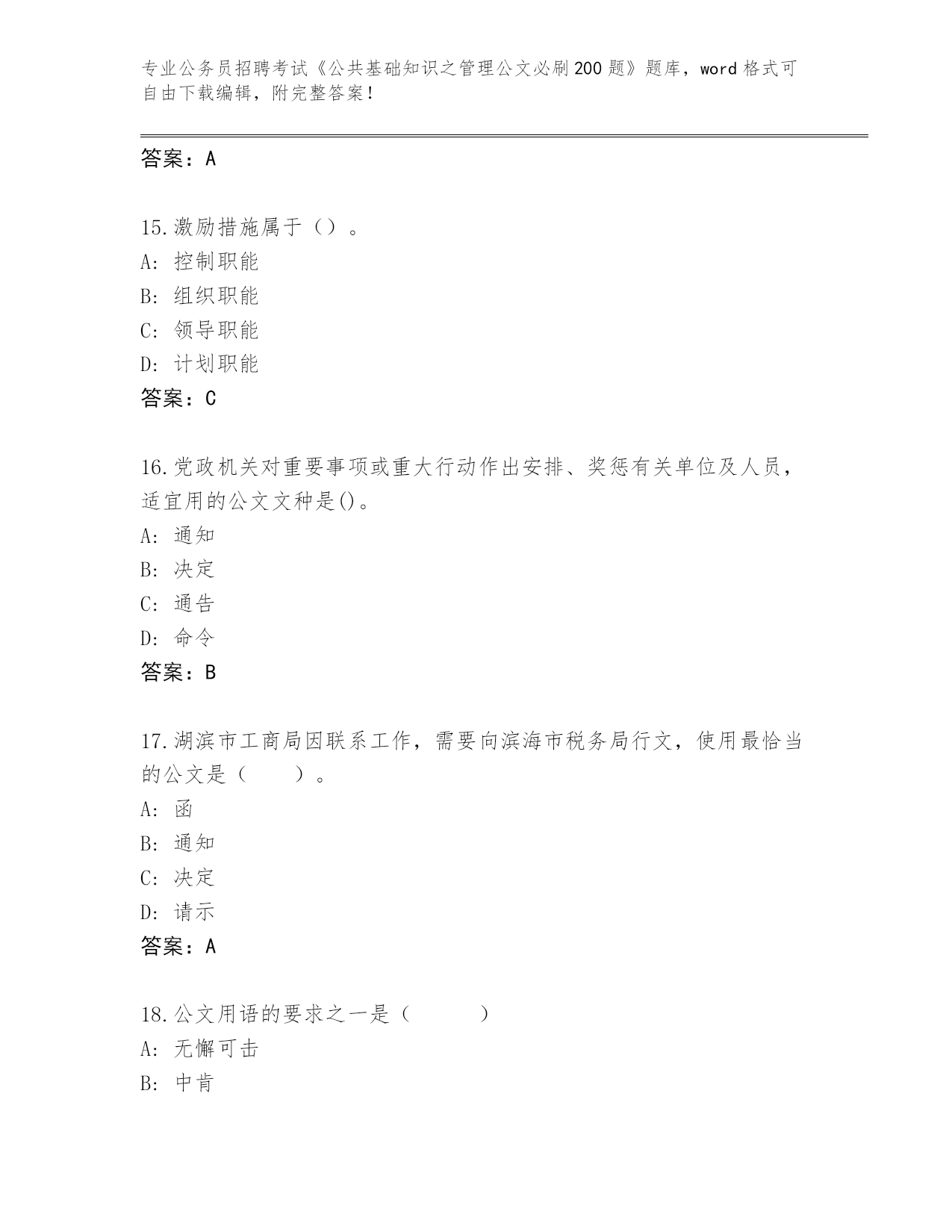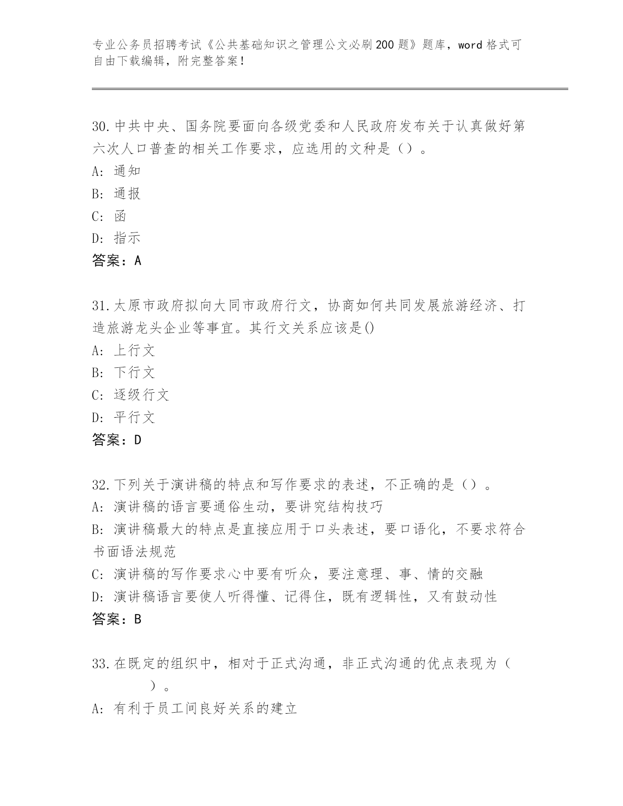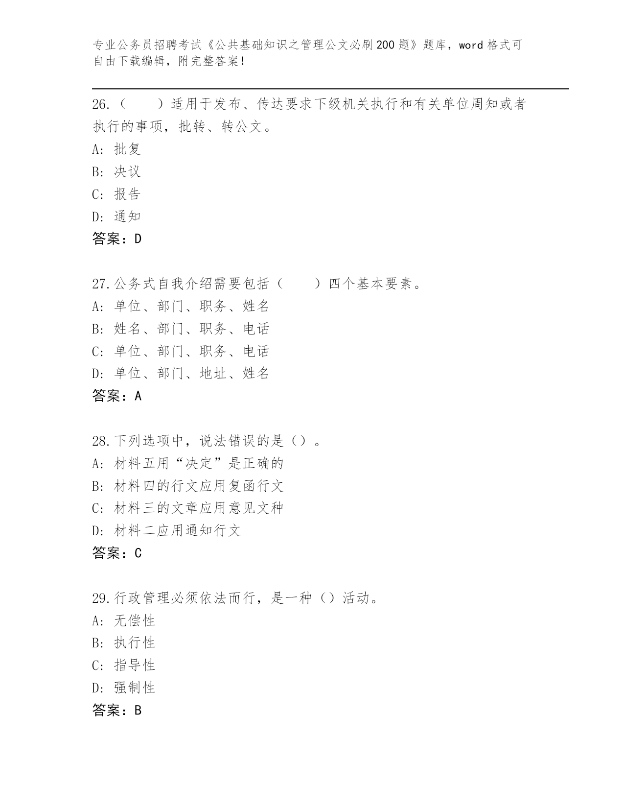 完整版甘肃省公务员招聘考试《公共基础知识之管理公文必刷200题》带答案(典型题)