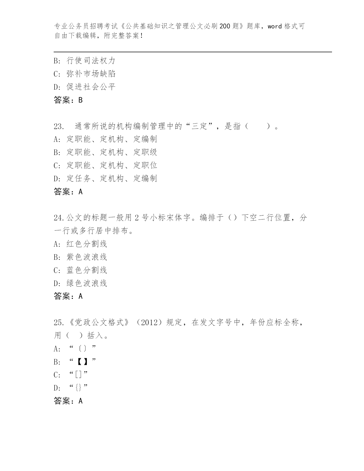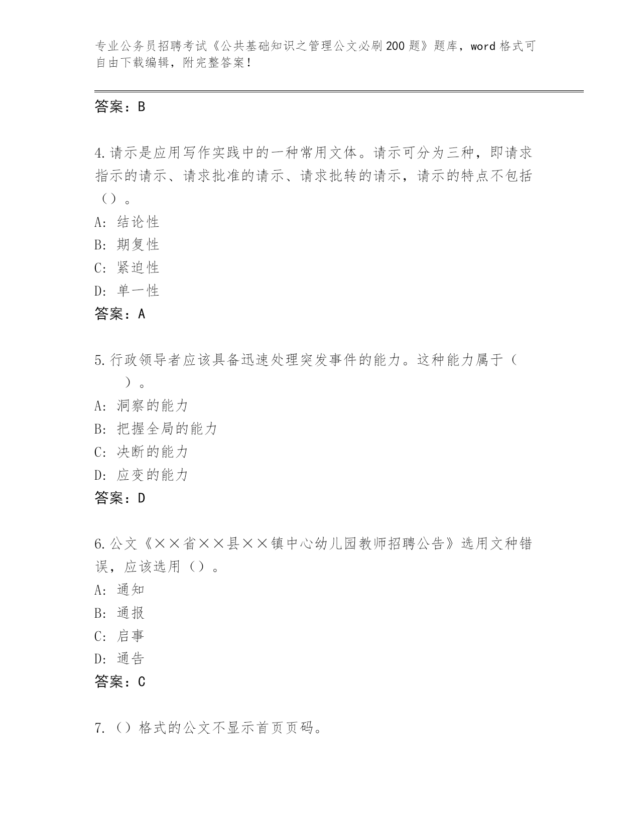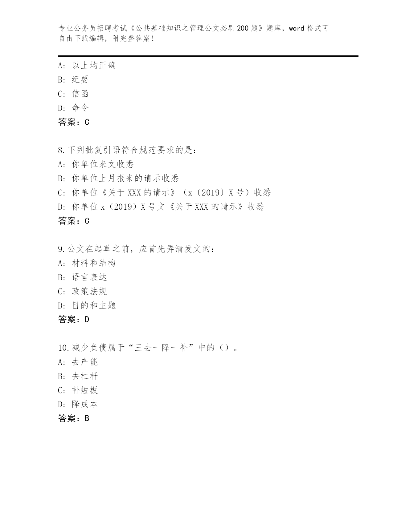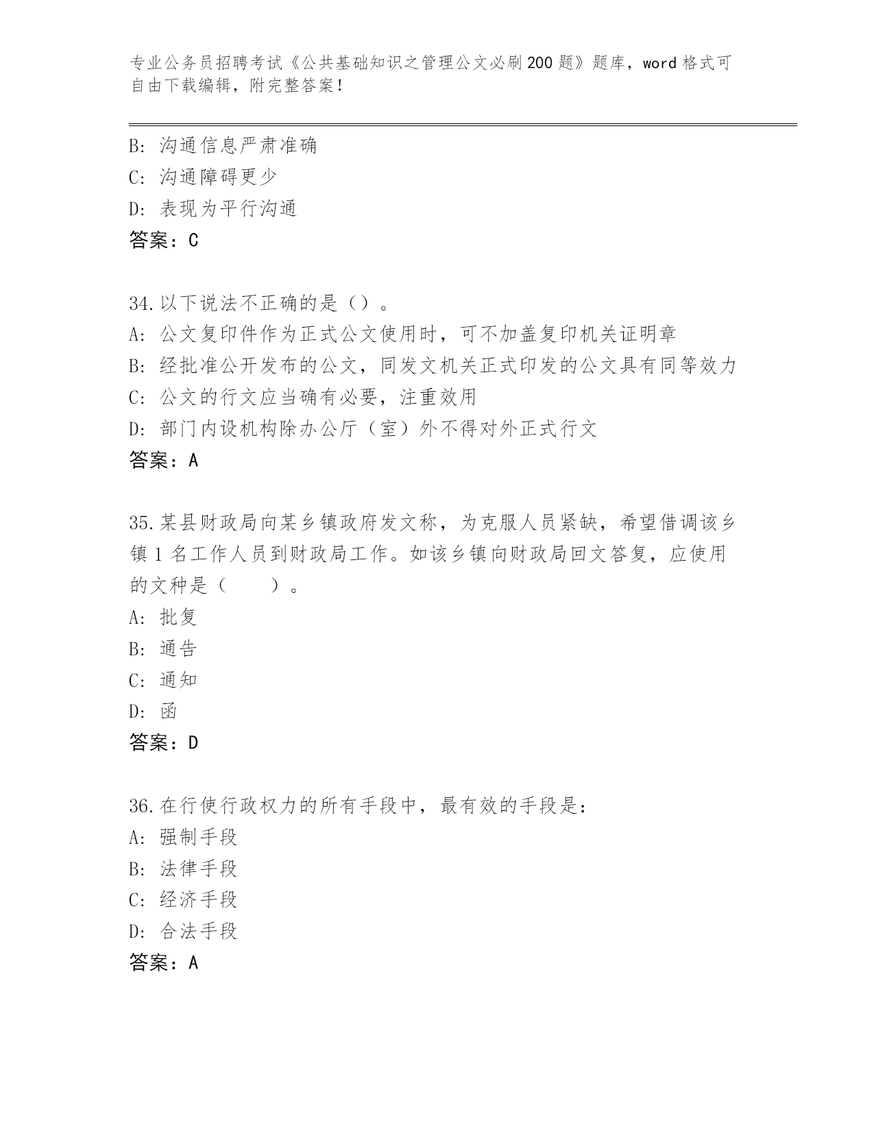 完整版甘肃省公务员招聘考试《公共基础知识之管理公文必刷200题》带答案(典型题)