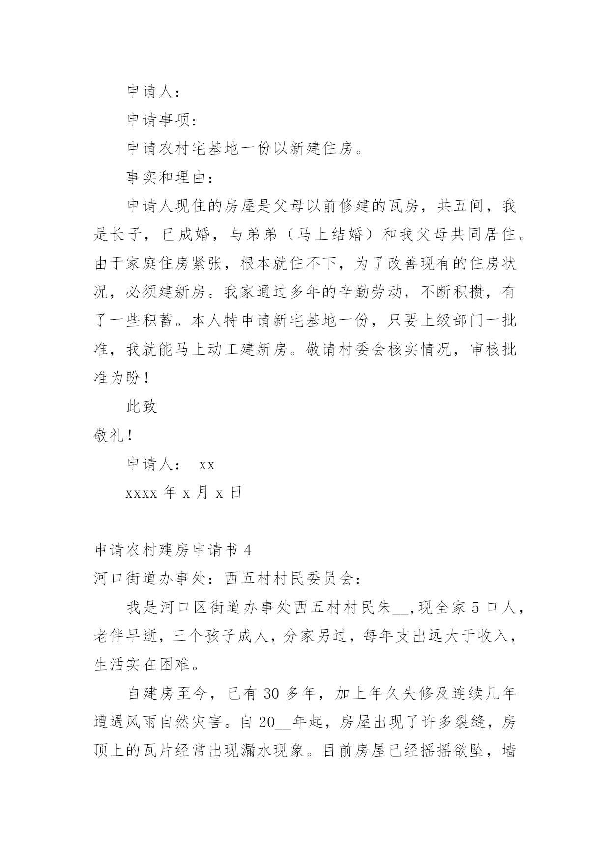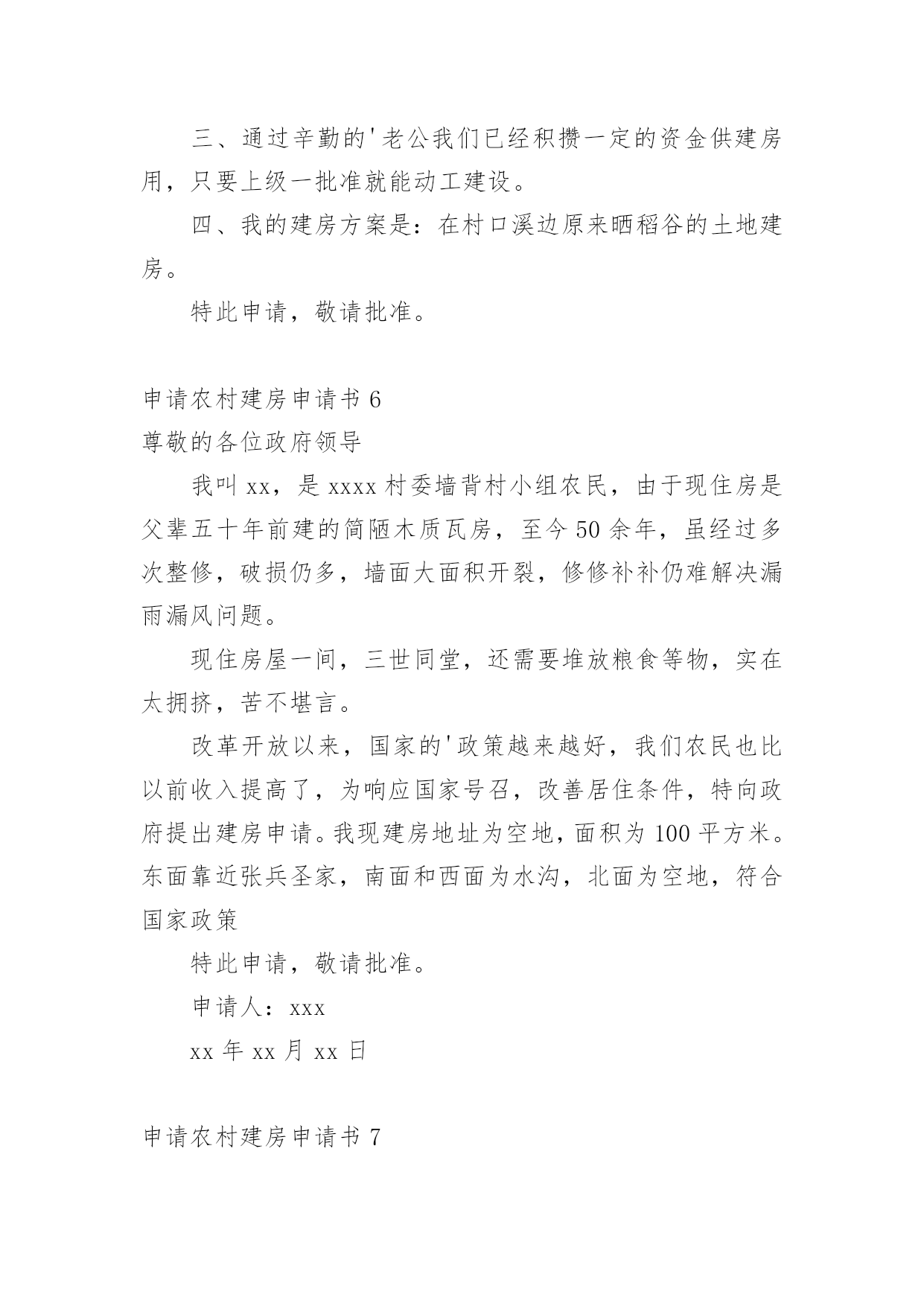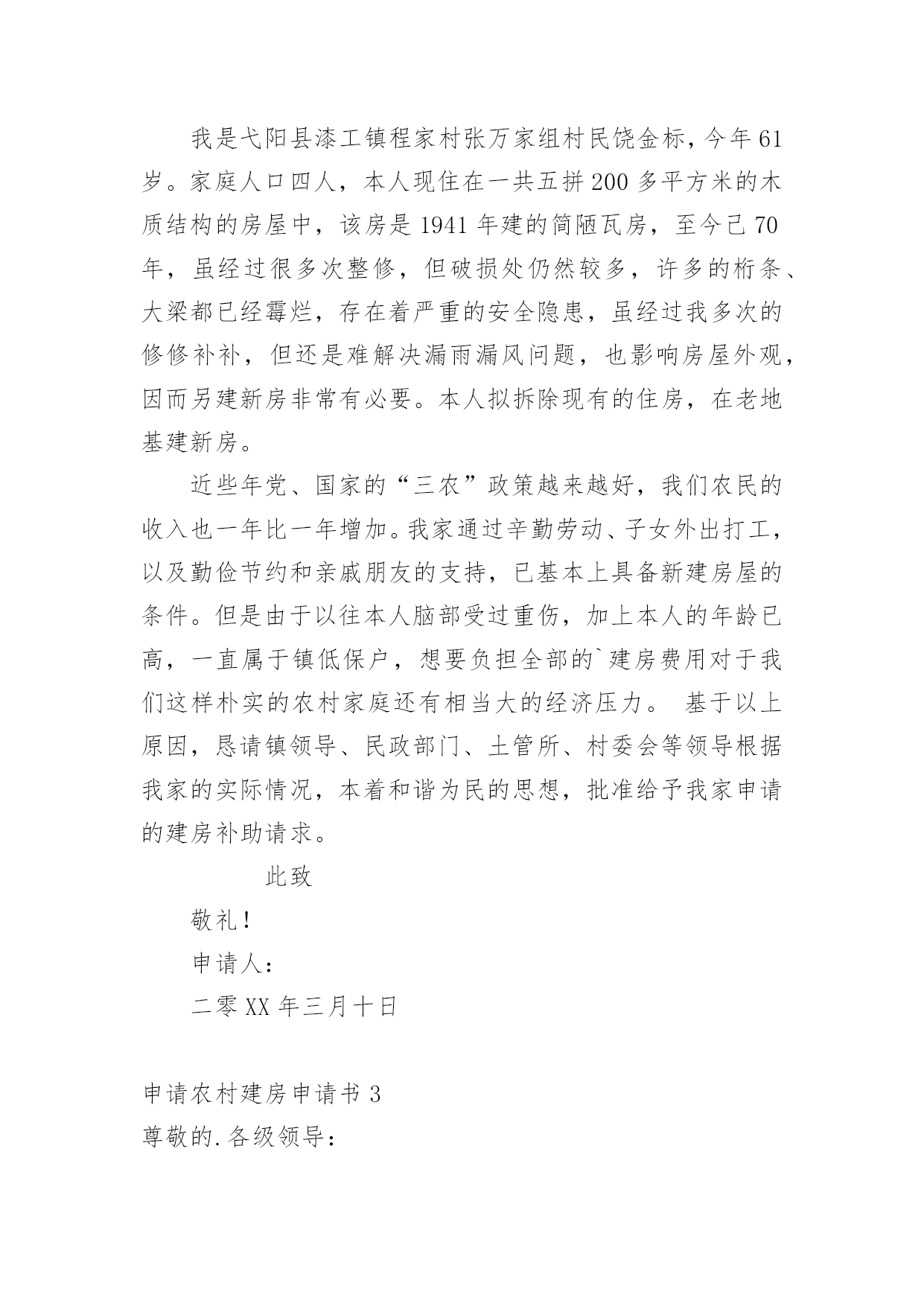 申请农村建房申请书在市场经济发展迅速的今天,申请书与我们不再陌生,申请书是我们平时提出请求的一种书信。写起申请书来就毫无头绪?以下是小编整理的申请农村建房申请书,希望对大家有所帮助。申请农村建房申请书1国土资源中心所:我人系乡(镇)村组村民,现年岁,家中现有人口人,现有住房平方米。现因特向上级国土部门申请批地建房。申请面积为平方米,地类属,大地名小地名,其四抵分别是:东抵;南抵;西抵:;北抵。四抵清楚,权属无争议,恳请上级国土资源管理部门给予批准为盼。特此报告申请人:电话:年月日村民代表签字:(80%以上农户)组长签字盖章:村委会签字盖章:村协信息监察员意见(签名):申请农村建房申请书2漆工镇土管所领导:我是弋阳县漆工镇程家村张万家组村民饶金标,今年61岁。家庭人口四人,本人现住在一共五拼200多平方米的木质结构的房屋中,该房是1941年建的简陋瓦房,至今己70年,虽经过很多次整修,但破损处仍然较多,许多的桁条、大梁都已经霉烂,存在着严重的安全隐患,虽经过我多次的修修补补,但还是难解决漏雨漏风问题,也影响房屋外观,因而另建新房非常有必要。本人拟拆除现有的住房,在老地基建新房。近些年党、国家的“三农”政策越来越好,我们农民的收入也一年比一年增加。我家通过辛勤劳动、子女外出打工,以及勤俭节约和亲戚朋友的支持,已基本上具备新建房屋的条件。但是由于以往本人脑部受过重伤,加上本人的年龄已高,一直属于镇低保户,想要负担全部的`建房费用对于我们这样朴实的农村家庭还有相当大的经济压力。基于以上原因,恳请镇领导、民政部门、土管所、村委会等领导根据我家的实际情况,本着和谐为民的思想,批准给予我家申请的建房补助请求。此致敬礼!申请人:二零XX年三月十日申请农村建房申请书3尊敬的.各级领导:申请人:申请事项:申请农村宅基地一份以新建住房。事实和理由:申请人现住的房屋是父母以前修建的瓦房,共五间,我是长子,已成婚,与弟弟(马上结婚)和我父母共同居住。由于家庭住房紧张,根本就住不下,为了改善现有的住房状况,必须建新房。我家通过多年的辛勤劳动,不断积攒,有了一些积蓄。本人特申请新宅基地一份,只要上级部门一批准,我就能马上动工建新房。敬请村委会核实情况,审核批准为盼!此致敬礼!申请人:xxxxxx年x月x日申请农村建房申请书4河口街道办事处:西五村村民委员会:我是河口区街道办事处西五村村民朱__,现全家5口人,老伴早逝,三个孩子成人,分家另过,每年支出远大于收入,生活实在困难。自建房至今,已有30多年,加上年久失修及连续几年遭遇风雨自然灾害。自20__年起,房屋出现了许多裂缝,房顶上的瓦片经常出现漏水现象。目前房屋已经摇摇欲坠,墙体开裂、倾斜,瓦片脱落,险象环生,已经成了危房,不能住人了,危及我的生命安全。所以我是多么想把我家的住房改造一下,可以让我住进比较安心的房子,不必担心房子倒塌的问题。目前由于年老体弱,无经济来源,改造资金短缺,暂时无法重新建房。现欣闻政府的`有关惠民政策,及保护人民群众的生命财产安全,恳请村委及办事处及时核查危房险情,帮助向上级申请给予危房改造救助资金为盼。我保证,我申请的补助只是为了改善我家的住房问题,绝对不进行其他与这无关的事情,恳请领导批准!特此申请。此致敬礼申请人:朱__20__年9月26日申请农村建房申请书5xxxxx土地规划局:我是xxx乡xxx村xxxx村民xxx外孙女xxx。老人现年xx岁,膝下无儿女,抚养我做孩子,老人生活现已无法自理,由我赡养。由于以下几个原因,我申请新建住房。一、老房子已居住多年,历经风雨,xxx墙体已经倒坍,无法居住。因而申请新建房屋非常必要。二、我已成家,老公为外地农村户口,常年居住xxxxxxxx与我一同赡养老人,育有一女儿,一家四口迫切需要住房。三、通过辛勤的'老公我们已经积攒一定的资金供建房用,只要上级一批准就能动工建设。四、我的建房方案是:在村口溪边原来晒稻谷的土地建房。特此申请,敬请批准。申请农村建房申请书6尊敬的各位政府领导我叫xx,是xxxx村委墙背村小组农民,由于现住房是父辈五十年前建的简陋木质瓦房,至今50余年,虽经过多次整修,破损仍多,墙面大面积开裂,修修补补仍难解决漏雨漏风问题。现住房屋一间,三世同堂,还需要堆放粮食等物,实在太拥挤,苦不堪言。改革开放以来,国家的'政策越来越好,我们农民也比以前收入提高了,为响应国家号召,改善居住条件,特向政府提出建房申请。我现建房地址为空地,面积为100平方米。东面靠近张兵圣家,南面和西面为水沟,北面为空地,符合国家政策特此申请,敬请批准。申请人:xxxxx年xx月xx日申请农村建房申请书7申请人:XXXX年X月X日1、土墙(a)墙体产生倾斜,其倾斜量超过层高1.6/100。(b)墙体风化、硝化深度达墙厚的1/4以上:或有墙脚长度