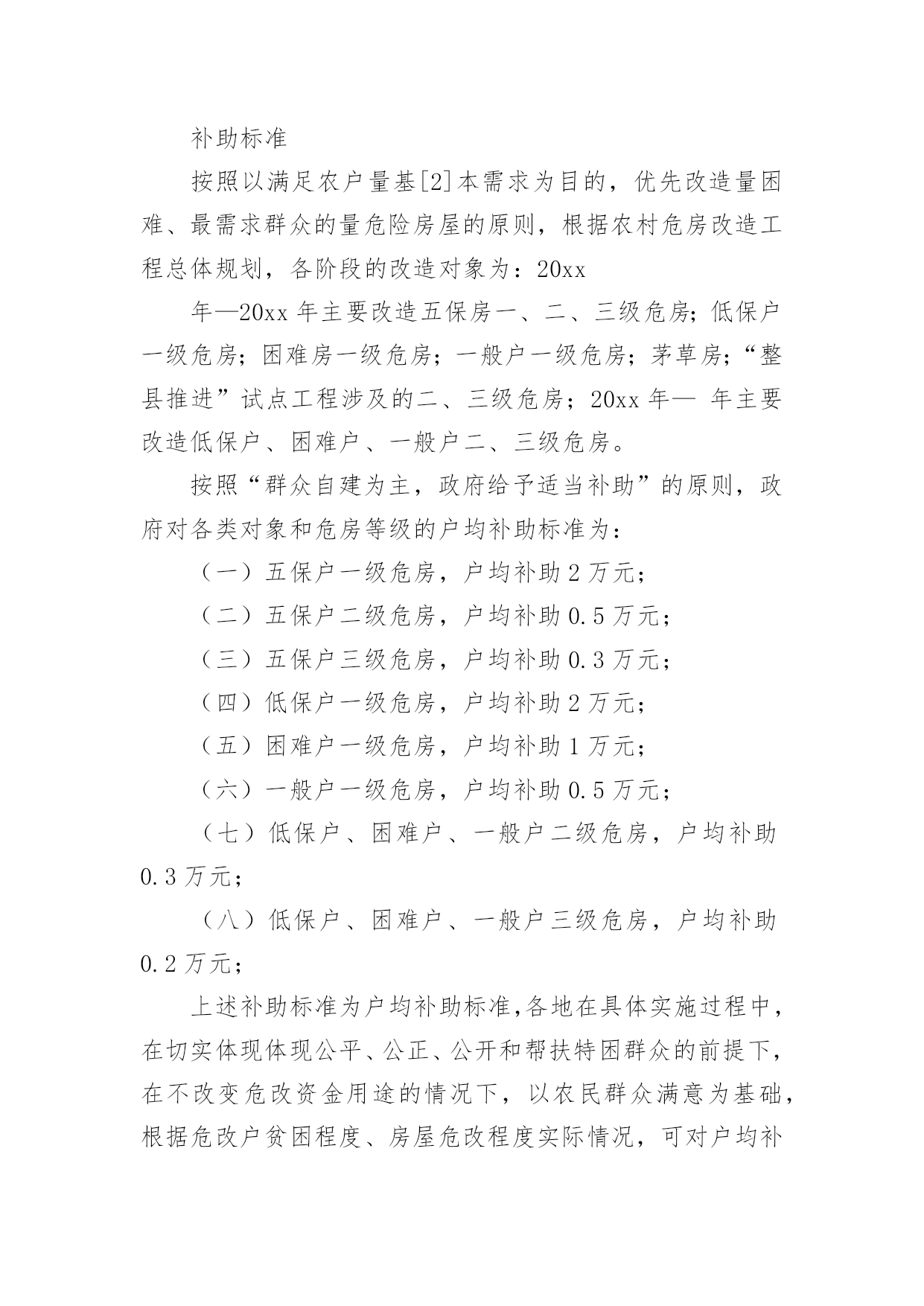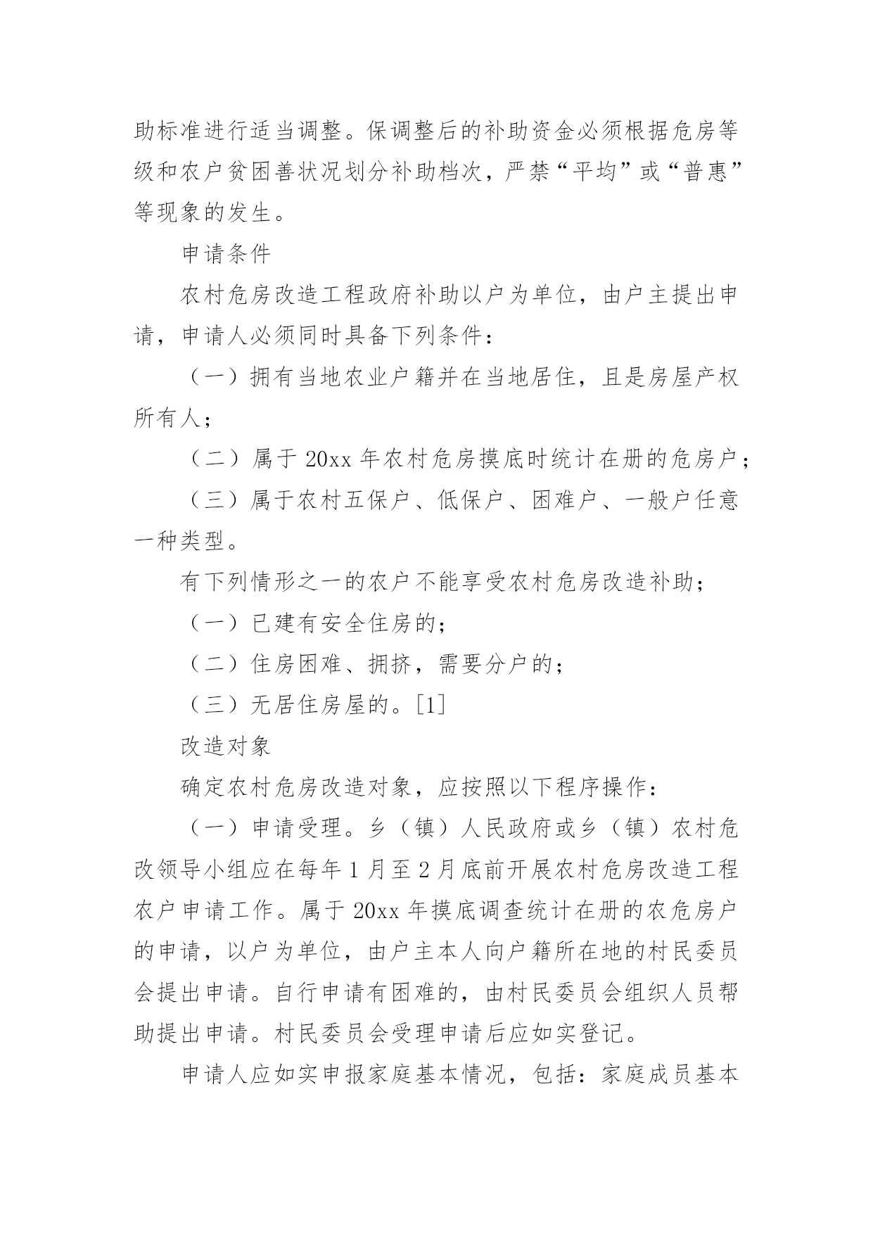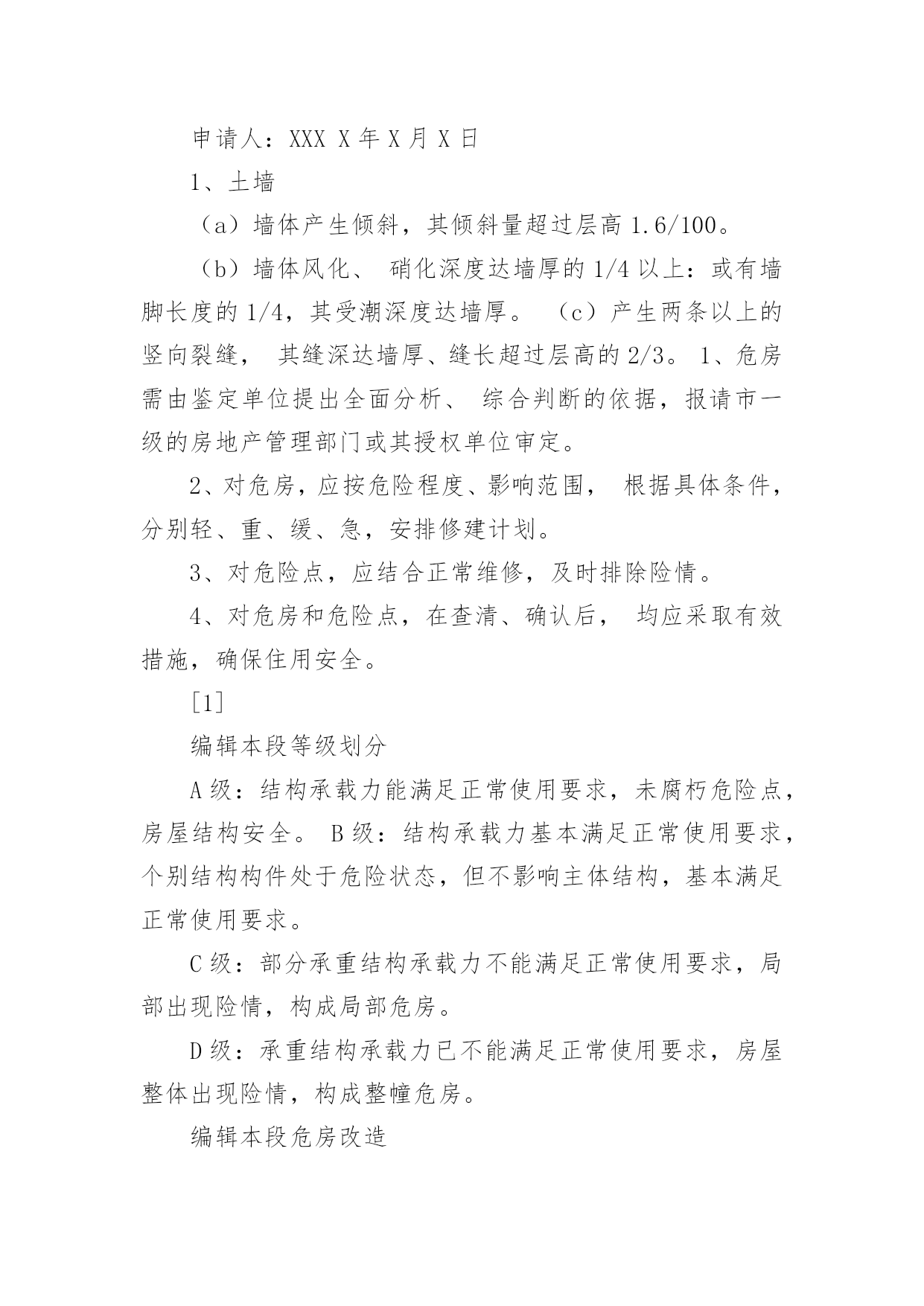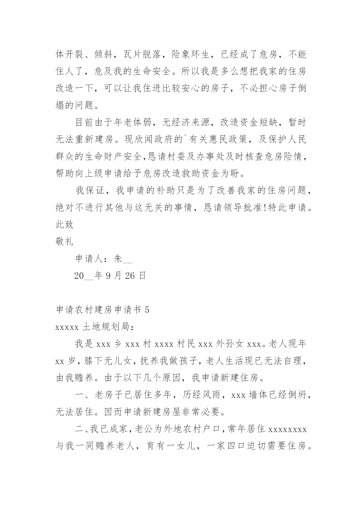 申请农村建房申请书在市场经济发展迅速的今天,申请书与我们不再陌生,申请书是我们平时提出请求的一种书信。写起申请书来就毫无头绪?以下是小编整理的申请农村建房申请书,希望对大家有所帮助。申请农村建房申请书1国土资源中心所:我人系乡(镇)村组村民,现年岁,家中现有人口人,现有住房平方米。现因特向上级国土部门申请批地建房。申请面积为平方米,地类属,大地名小地名,其四抵分别是:东抵;南抵;西抵:;北抵。四抵清楚,权属无争议,恳请上级国土资源管理部门给予批准为盼。特此报告申请人:电话:年月日村民代表签字:(80%以上农户)组长签字盖章:村委会签字盖章:村协信息监察员意见(签名):申请农村建房申请书2漆工镇土管所领导:我是弋阳县漆工镇程家村张万家组村民饶金标,今年61岁。家庭人口四人,本人现住在一共五拼200多平方米的木质结构的房屋中,该房是1941年建的简陋瓦房,至今己70年,虽经过很多次整修,但破损处仍然较多,许多的桁条、大梁都已经霉烂,存在着严重的安全隐患,虽经过我多次的修修补补,但还是难解决漏雨漏风问题,也影响房屋外观,因而另建新房非常有必要。本人拟拆除现有的住房,在老地基建新房。近些年党、国家的“三农”政策越来越好,我们农民的收入也一年比一年增加。我家通过辛勤劳动、子女外出打工,以及勤俭节约和亲戚朋友的支持,已基本上具备新建房屋的条件。但是由于以往本人脑部受过重伤,加上本人的年龄已高,一直属于镇低保户,想要负担全部的`建房费用对于我们这样朴实的农村家庭还有相当大的经济压力。基于以上原因,恳请镇领导、民政部门、土管所、村委会等领导根据我家的实际情况,本着和谐为民的思想,批准给予我家申请的建房补助请求。此致敬礼!申请人:二零XX年三月十日申请农村建房申请书3尊敬的.各级领导:申请人:申请事项:申请农村宅基地一份以新建住房。事实和理由:申请人现住的房屋是父母以前修建的瓦房,共五间,我是长子,已成婚,与弟弟(马上结婚)和我父母共同居住。由于家庭住房紧张,根本就住不下,为了改善现有的住房状况,必须建新房。我家通过多年的辛勤劳动,不断积攒,有了一些积蓄。本人特申请新宅基地一份,只要上级部门一批准,我就能马上动工建新房。敬请村委会核实情况,审核批准为盼!此致敬礼!申请人:xxxxxx年x月x日申请农村建房申请书4河口街道办事处:西五村村民委员会:我是河口区街道办事处西五村村民朱__,现全家5口人,老伴早逝,三个孩子成人,分家另过,每年支出远大于收入,生活实在困难。自建房至今,已有30多年,加上年久失修及连续几年遭遇风雨自然灾害。自20__年起,房屋出现了许多裂缝,房顶上的瓦片经常出现漏水现象。目前房屋已经摇摇欲坠,墙体开裂、倾斜,瓦片脱落,险象环生,已经成了危房,不能住人了,危及我的生命安全。所以我是多么想把我家的住房改造一下,可以让我住进比较安心的房子,不必担心房子倒塌的问题。目前由于年老体弱,无经济来源,改造资金短缺,暂时无法重新建房。现欣闻政府的`有关惠民政策,及保护人民群众的生命财产安全,恳请村委及办事处及时核查危房险情,帮助向上级申请给予危房改造救助资金为盼。我保证,我申请的补助只是为了改善我家的住房问题,绝对不进行其他与这无关的事情,恳请领导批准!特此申请。此致敬礼申请人:朱__20__年9月26日申请农村建房申请书5xxxxx土地规划局:我是xxx乡xxx村xxxx村民xxx外孙女xxx。老人现年xx岁,膝下无儿女,抚养我做孩子,老人生活现已无法自理,由我赡养。由于以下几个原因,我申请新建住房。一、老房子已居住多年,历经风雨,xxx墙体已经倒坍,无法居住。因而申请新建房屋非常必要。二、我已成家,老公为外地农村户口,常年居住xxxxxxxx与我一同赡养老人,育有一女儿,一家四口迫切需要住房。三、通过辛勤的'老公我们已经积攒一定的资金供建房用,只要上级一批准就能动工建设。四、我的建房方案是:在村口溪边原来晒稻谷的土地建房。特此申请,敬请批准。申请农村建房申请书6尊敬的各位政府领导我叫xx,是xxxx村委墙背村小组农民,由于现住房是父辈五十年前建的简陋木质瓦房,至今50余年,虽经过多次整修,破损仍多,墙面大面积开裂,修修补补仍难解决漏雨漏风问题。现住房屋一间,三世同堂,还需要堆放粮食等物,实在太拥挤,苦不堪言。改革开放以来,国家的'政策越来越好,我们农民也比以前收入提高了,为响应国家号召,改善居住条件,特向政府提出建房申请。我现建房地址为空地,面积为100平方米。东面靠近张兵圣家,南面和西面为水沟,北面为空地,符合国家政策特此申请,敬请批准。申请人:xxxxx年xx月xx日申请农村建房申请书7申请人:XXXX年X月X日1、土墙(a)墙体产生倾斜,其倾斜量超过层高1.6/100。(b)墙体风化、硝化深度达墙厚的1/4以上:或有墙脚长度
