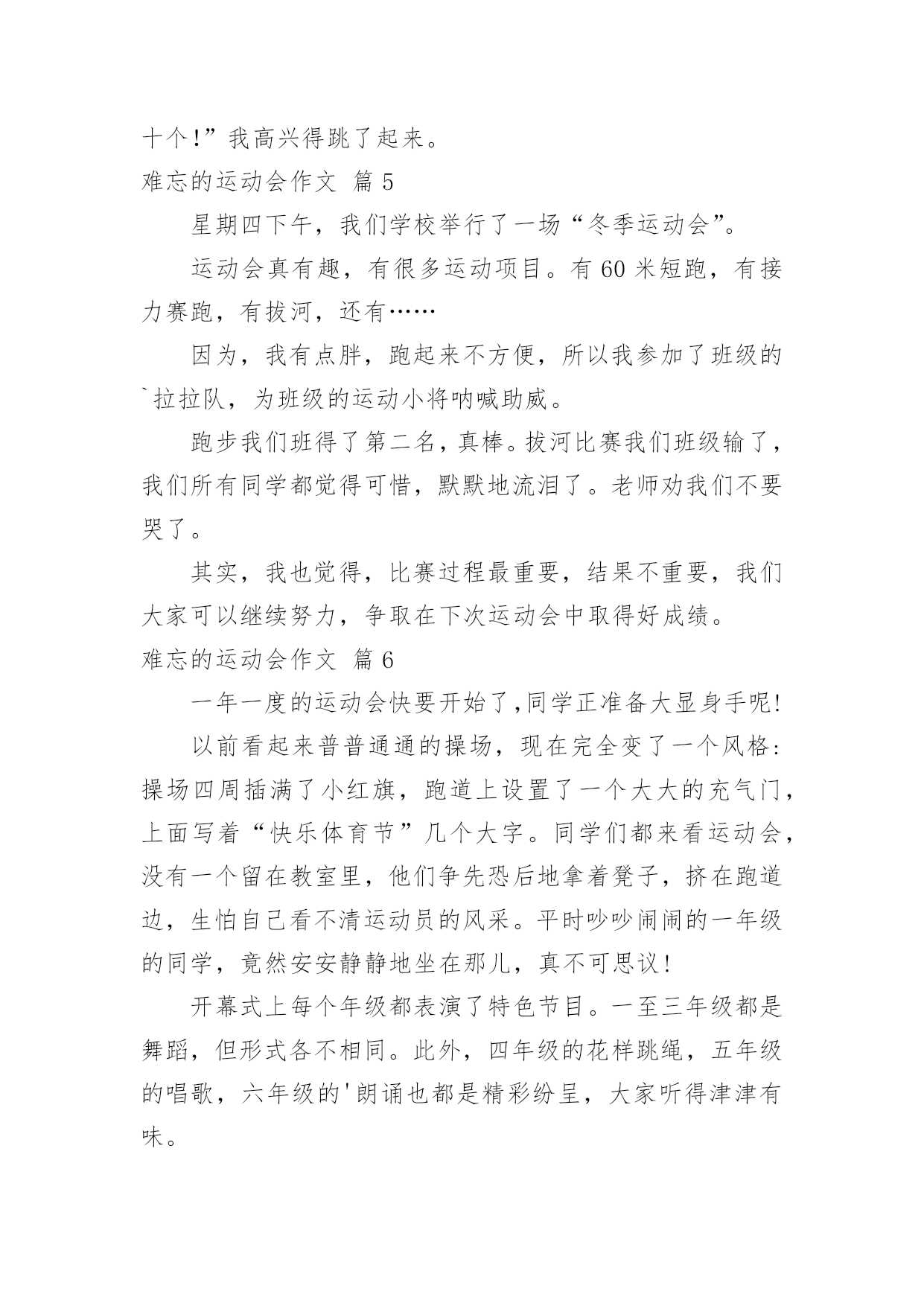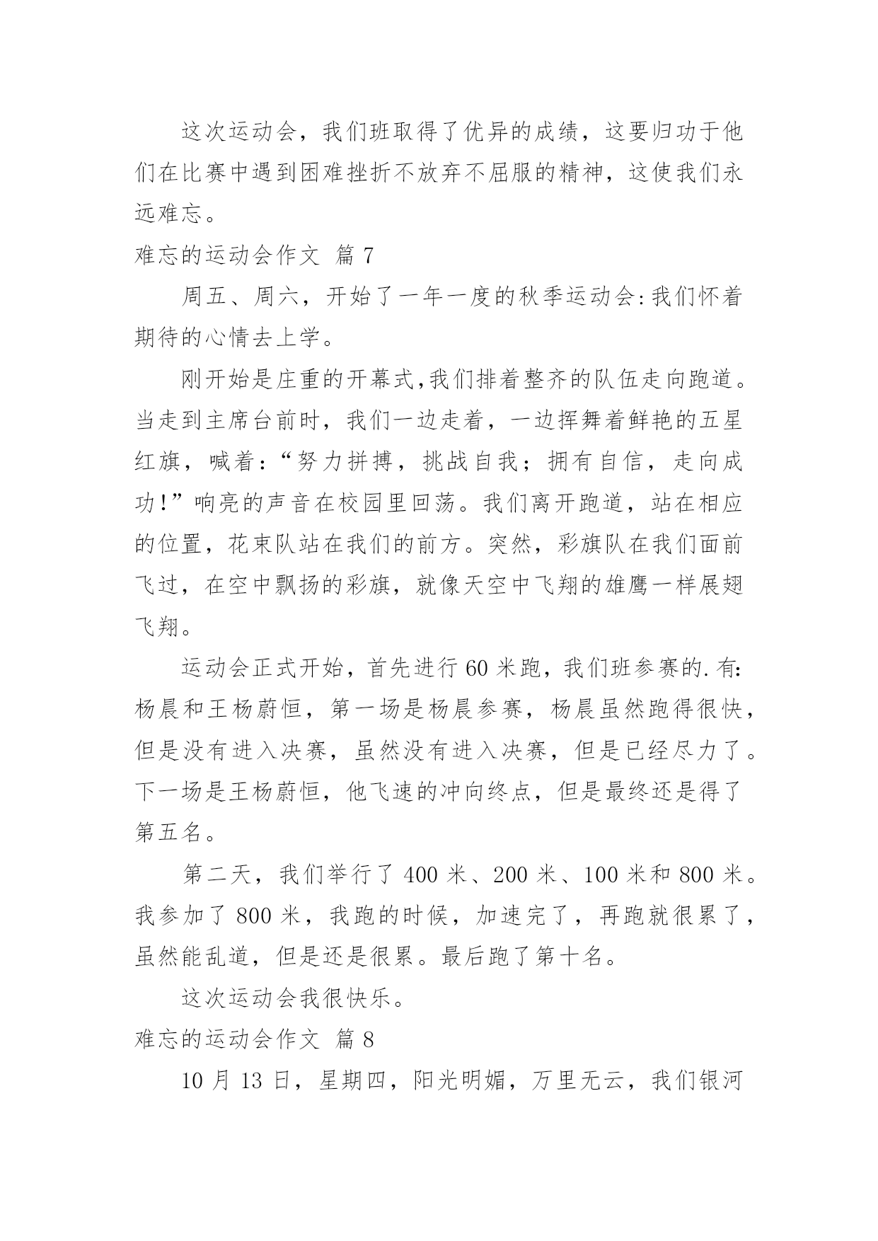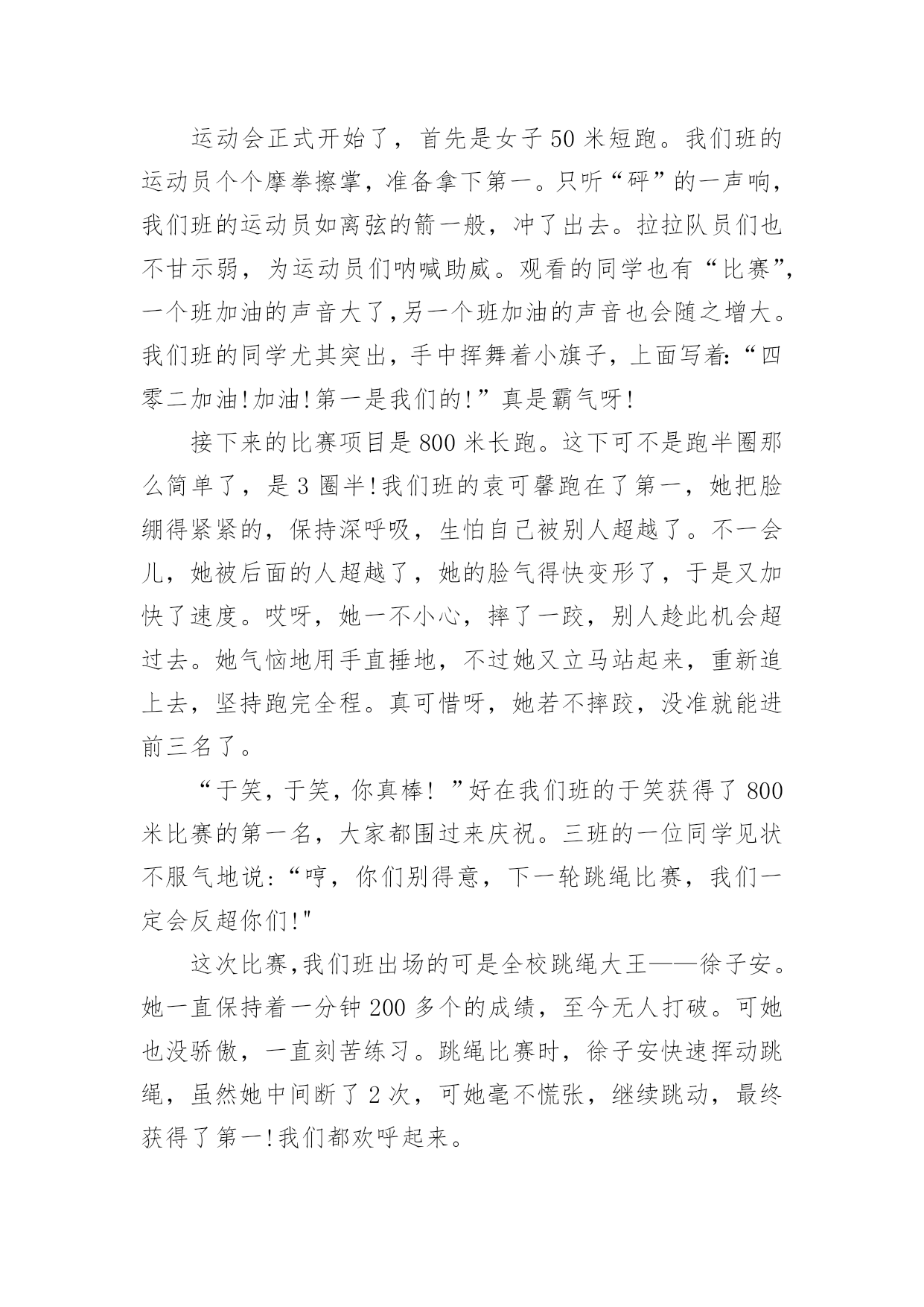 难忘的运动会作文难忘的运动会作文(精品)在平平淡淡的日常中,大家都尝试过写作文吧,作文是一种言语活动,具有高度的综合性和创造性。如何写一篇有思想、有文采的作文呢?下面是小编为大家整理的难忘的运动会作文8篇,欢迎阅读,希望大家能够喜欢。难忘的运动会作文篇1就在星期四,我迎来了在我进入中学后的第一个“盛会”——运动会。虽然它没有奥运会那般宏伟的气势,也没有那宽广的场地,然而它的激情与紧张的气氛却毫不逊色于奥运会。在上午,我们举行了隆重的开幕式。一支支由班级组成的方阵踏着整齐的步伐走进了场地。当走近主席台时,方阵发出了一声声坚定而响亮的口号,这些口号代表着每一位同学以及老师的自豪。鼓号队的同学们吹着动听的音乐,敲着洪亮的鼓也入场了。接着是腰鼓队,场面非常地严肃,这宏伟的气势引来了不少路人,就连有些助动车也驻足而观。当所有的方阵队伍都到位后,由我校的校长和运动员代表上台发言。她们的精彩发言,使台下报以雷鸣般的掌声。最后由李校长宣布了运动会的开幕,台下又一次掌声。开幕式结束后,我们六年级又进行了广播操比赛。虽然广播操我们才刚刚学会,可每个人都尽了自己最大的努力。一分耕耘,一份收获,我相信在这次的广播操比赛中,我们能取得不错的.名次。虽然站了一上午,大家都很累,但是我们脸上仍然挂着微笑,因为这次开幕式的成功,都是因为前几天我们刻苦的训练。这让我懂得了一个道理:只要你肯付出,就会有回报。吃过午饭,我们的运动会便正式开始了,大家都别提有多高兴了,我们马上就要见证同学们的实力了。比赛时,各个班为比赛选手呐喊助威,选手们也为了不辜负大家的希望,都拼尽了全力,最终都取得了不错的成绩。当然输了也不要紧,明年再来,只要刻苦训练,一定能取得好成绩的。最吸引我们眼球的还是老师与老师之间的较量。老师们将在一条跑道上经历三个项目,分别是跳绳、踢毽子和拍球。选手们一共分成三组,是同学与老师的合作接力。在这场比赛中,老师们都各展才华,友谊第一,比赛第二。虽然别班的老师输给了我们,可大家脸上还是挂着幸福的微笑。运动会圆满闭幕了。在这次运动会上,大家都玩得很开心,我们一起期待着下一次的运动会。难忘的运动会作文篇2开运动会啦!开运动会啦!我们盼望日久的20xx年秋季运动会于9月27日在学校操场举行。首先进行的是开幕式表演,我很高兴成为了学校花束队的.一员,我们迈着整齐的步伐,手拿花束从主席台前走过,我心里既紧张又兴奋。接下来是军训汇报演出。下午运动会比赛项目开始了,在运动场上,运动员们你争我赶,互不相让,尤其是男子4*100米接力赛竞争的非常激烈。参加比赛的运动员想飞马一样奔驰在跑道上。最后一棒张舒砚,“加油”“加油”大家仿佛要通过大声的喊叫把自己的全部力气都传给赛场上的运动员。哈哈我们赢得了第一名。大家拥抱在一起欢呼着,“胜利啦,胜利啦!”难忘的运动会作文篇3一年一度的运动会开始了,同学们都很紧张,因为如果输了就拿不到“快乐杯”了!但大家还是很激动,每天放学后,体育健将们都留下来练习:有的练习跳远,有的练习跑步,还有的在练习踢球。一眼望去操场上挤满了人,真是热闹极了。经过了长久的练习,大家都变得信心十足。运动会这天,第一轮是田径赛跑。我们班选出了小杜同学和小雨同学,每一位选手站在起跑线上做好准备,大家精神抖擞,不停地做着热身运动。在裁判一声令下,比赛开始了。小杜同学跑得非常快,和猎豹一样的速度,运动员们的目光一直盯着终点,他们摆开手臂,腿就像是加了燃料的加速器一样,选手们都不甘示弱,一下子你超过我,一下子我超过他,又像是赶去救人的.超人似的,场下的观众纷纷为自己班喊加油,此刻我的心也被狠狠地提了起来,虽然我不是运动员,但是看到他们在场上那么努力奔跑的样子,仿佛自己也像长了一双翅膀,要用力往前冲。经过激烈的赛跑,最终小杜同学冲刺成功,我们班夺得了第一名,场下响起雷鸣般的掌声。再看旁边的足球赛,足球小将们穿着统一的运动服。先是我们队发球,足球一下子往左,一下子往右,像个听话的小宝宝在足球运动员脚下跳跃,结果对方组太厉害,眼疾手快半路拦截了足球,接下来轮到对方的球刚要进球门的时候,幸好我们队的守门员反应快,把球拦住,裁判宣布我们队得分。足球场上斗智斗勇,分数也在不停地拔河,我的小心脏“怦怦”跳,遗憾的是,最后二班赢了,但有句老话说得好:失败是成功之母。这一次失败,激励着我们继续努力。这真是一次难忘的运动会!难忘的运动会作文篇4星期五那天举行运动会,同学们一到学校就开始练习:跳绳、踢毽子、做仰卧起坐,只听见毽子飞舞时同学的叫声、绳子有节奏地击打地面的响声。开始比赛了,我既高兴又紧张。高兴的是终于轮到我比赛了,要知道我每天做完作业第一件事就是练习跳绳、踢毽子啊!紧张的是我很担心我能做三十个仰卧起坐吗?管他三七二十一,不想了,我凝神听着裁判的命令。裁判就是教我们科学课的张老师