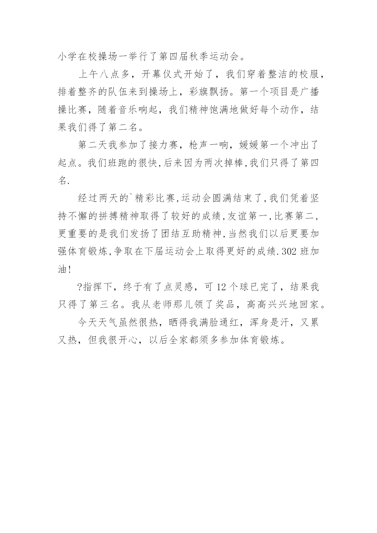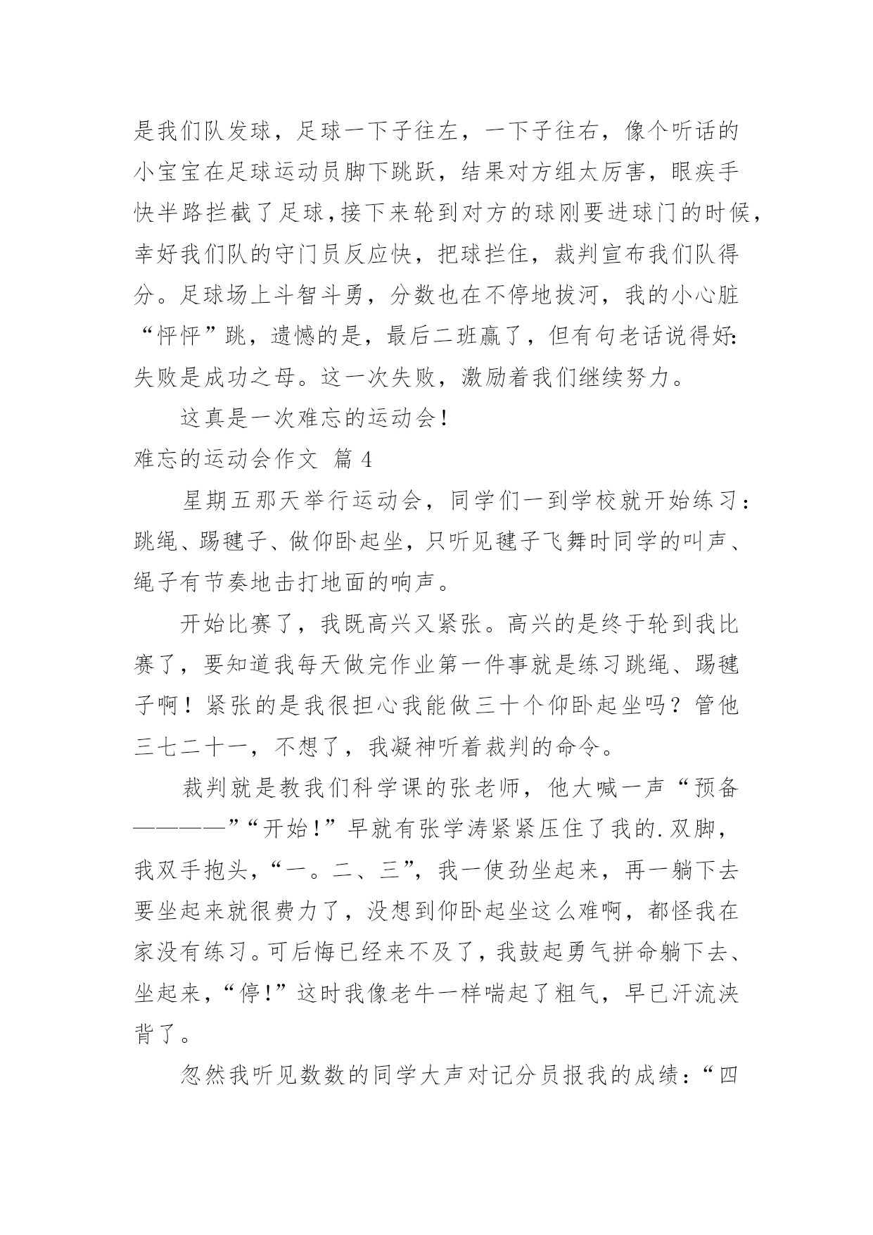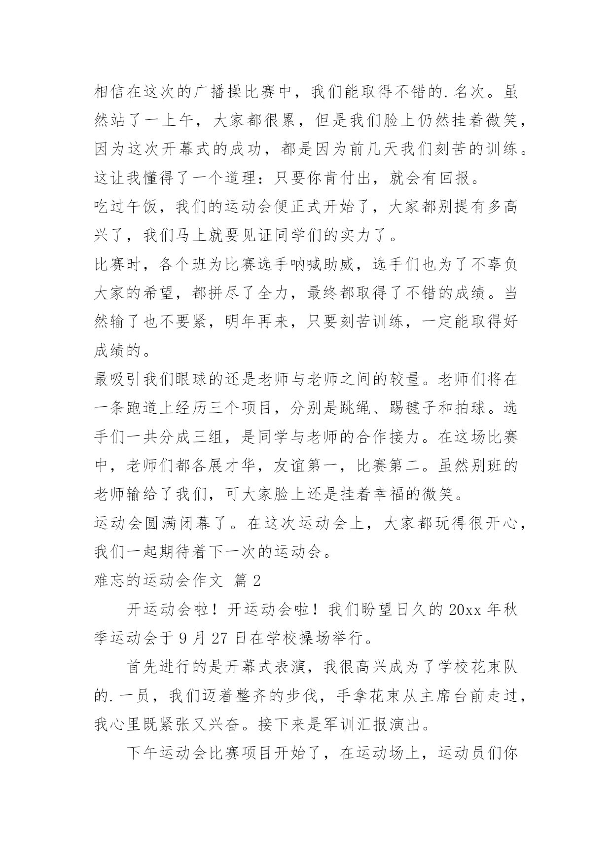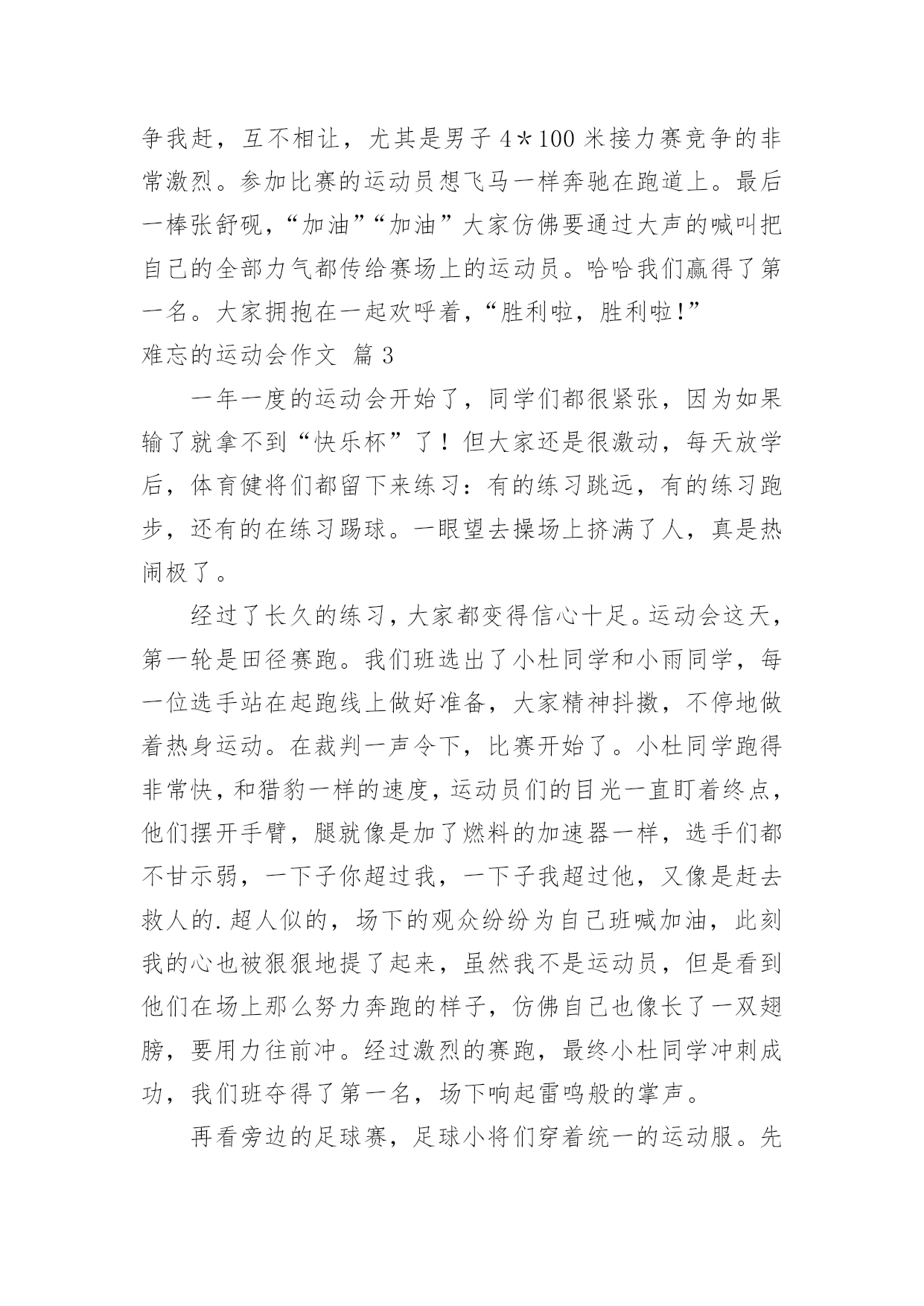 难忘的运动会作文难忘的运动会作文(精品)在平平淡淡的日常中,大家都尝试过写作文吧,作文是一种言语活动,具有高度的综合性和创造性。如何写一篇有思想、有文采的作文呢?下面是小编为大家整理的难忘的运动会作文8篇,欢迎阅读,希望大家能够喜欢。难忘的运动会作文篇1就在星期四,我迎来了在我进入中学后的第一个“盛会”——运动会。虽然它没有奥运会那般宏伟的气势,也没有那宽广的场地,然而它的激情与紧张的气氛却毫不逊色于奥运会。在上午,我们举行了隆重的开幕式。一支支由班级组成的方阵踏着整齐的步伐走进了场地。当走近主席台时,方阵发出了一声声坚定而响亮的口号,这些口号代表着每一位同学以及老师的自豪。鼓号队的同学们吹着动听的音乐,敲着洪亮的鼓也入场了。接着是腰鼓队,场面非常地严肃,这宏伟的气势引来了不少路人,就连有些助动车也驻足而观。当所有的方阵队伍都到位后,由我校的校长和运动员代表上台发言。她们的精彩发言,使台下报以雷鸣般的掌声。最后由李校长宣布了运动会的开幕,台下又一次掌声。开幕式结束后,我们六年级又进行了广播操比赛。虽然广播操我们才刚刚学会,可每个人都尽了自己最大的努力。一分耕耘,一份收获,我相信在这次的广播操比赛中,我们能取得不错的.名次。虽然站了一上午,大家都很累,但是我们脸上仍然挂着微笑,因为这次开幕式的成功,都是因为前几天我们刻苦的训练。这让我懂得了一个道理:只要你肯付出,就会有回报。吃过午饭,我们的运动会便正式开始了,大家都别提有多高兴了,我们马上就要见证同学们的实力了。比赛时,各个班为比赛选手呐喊助威,选手们也为了不辜负大家的希望,都拼尽了全力,最终都取得了不错的成绩。当然输了也不要紧,明年再来,只要刻苦训练,一定能取得好成绩的。最吸引我们眼球的还是老师与老师之间的较量。老师们将在一条跑道上经历三个项目,分别是跳绳、踢毽子和拍球。选手们一共分成三组,是同学与老师的合作接力。在这场比赛中,老师们都各展才华,友谊第一,比赛第二。虽然别班的老师输给了我们,可大家脸上还是挂着幸福的微笑。运动会圆满闭幕了。在这次运动会上,大家都玩得很开心,我们一起期待着下一次的运动会。难忘的运动会作文篇2开运动会啦!开运动会啦!我们盼望日久的20xx年秋季运动会于9月27日在学校操场举行。首先进行的是开幕式表演,我很高兴成为了学校花束队的.一员,我们迈着整齐的步伐,手拿花束从主席台前走过,我心里既紧张又兴奋。接下来是军训汇报演出。下午运动会比赛项目开始了,在运动场上,运动员们你争我赶,互不相让,尤其是男子4*100米接力赛竞争的非常激烈。参加比赛的运动员想飞马一样奔驰在跑道上。最后一棒张舒砚,“加油”“加油”大家仿佛要通过大声的喊叫把自己的全部力气都传给赛场上的运动员。哈哈我们赢得了第一名。大家拥抱在一起欢呼着,“胜利啦,胜利啦!”难忘的运动会作文篇3一年一度的运动会开始了,同学们都很紧张,因为如果输了就拿不到“快乐杯”了!但大家还是很激动,每天放学后,体育健将们都留下来练习:有的练习跳远,有的练习跑步,还有的在练习踢球。一眼望去操场上挤满了人,真是热闹极了。经过了长久的练习,大家都变得信心十足。运动会这天,第一轮是田径赛跑。我们班选出了小杜同学和小雨同学,每一位选手站在起跑线上做好准备,大家精神抖擞,不停地做着热身运动。在裁判一声令下,比赛开始了。小杜同学跑得非常快,和猎豹一样的速度,运动员们的目光一直盯着终点,他们摆开手臂,腿就像是加了燃料的加速器一样,选手们都不甘示弱,一下子你超过我,一下子我超过他,又像是赶去救人的.超人似的,场下的观众纷纷为自己班喊加油,此刻我的心也被狠狠地提了起来,虽然我不是运动员,但是看到他们在场上那么努力奔跑的样子,仿佛自己也像长了一双翅膀,要用力往前冲。经过激烈的赛跑,最终小杜同学冲刺成功,我们班夺得了第一名,场下响起雷鸣般的掌声。再看旁边的足球赛,足球小将们穿着统一的运动服。先是我们队发球,足球一下子往左,一下子往右,像个听话的小宝宝在足球运动员脚下跳跃,结果对方组太厉害,眼疾手快半路拦截了足球,接下来轮到对方的球刚要进球门的时候,幸好我们队的守门员反应快,把球拦住,裁判宣布我们队得分。足球场上斗智斗勇,分数也在不停地拔河,我的小心脏“怦怦”跳,遗憾的是,最后二班赢了,但有句老话说得好:失败是成功之母。这一次失败,激励着我们继续努力。这真是一次难忘的运动会!难忘的运动会作文篇4星期五那天举行运动会,同学们一到学校就开始练习:跳绳、踢毽子、做仰卧起坐,只听见毽子飞舞时同学的叫声、绳子有节奏地击打地面的响声。开始比赛了,我既高兴又紧张。高兴的是终于轮到我比赛了,要知道我每天做完作业第一件事就是练习跳绳、踢毽子啊!紧张的是我很担心我能做三十个仰卧起坐吗?管他三七二十一,不想了,我凝神听着裁判的命令。裁判就是教我们科学课的张老师