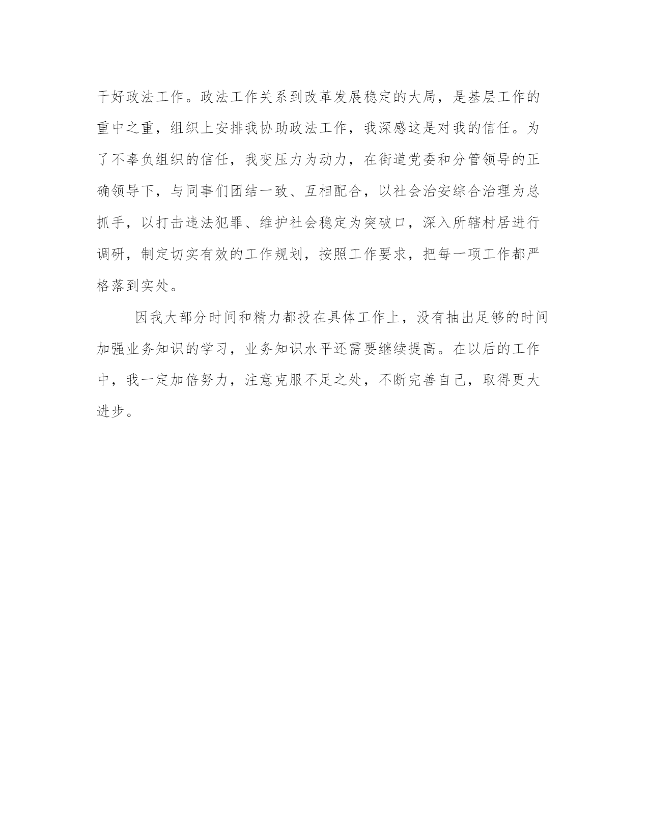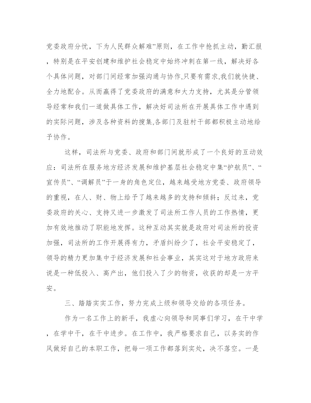 司法人员的自我鉴定范文一、不断加强学习,努力提高自己的政治素质和业务水平。学无止境,社会在发展,我们工作的环境也在不断变化,只有不断加强学习才能做到与时俱进。一是不断加强理论学习。思想是行动的先导,只有与党中央保持一致,不断加强理论学习,才能在正确的理论指导下取得工作上的进步。作为选调生,我认识到自己更应当成为先进理论、思想的学习者、宣传者和实践者。一年来我认真学习毛泽东思想、邓小平理论尤其是“三个代表”重要思想,不断提高自己的政治素质和理论水平。二是不断加强业务知识学习。由于组织和领导的信任,我被安排协助政法工作。虽然我学的专业是法律,但是理论知识和实际工作之间毕竟存在着较大差距,基层工作有着自己的特点,如果一味照搬照抄,那只会陷入本本主义的境地,做不好实际工作。街道办事处的领导和同事们都有着丰富的基层工作经验,我虚心向他们学习工作中的经验和有效的工作方法,同自己所学的专业知识结合起来,努力使自己尽快从一个“门外汉”成长为工作上的行家里手,以胜任自己的工作。在领导和同事们的帮助下,自己的业务知识得到不断充实,工作能力也有了长足进步。二、争取党政领导、协调各方关系一个部门工作业绩的取得,除自身的努力外,更重要的是要看党委政府的支持力度,还要看部门间的协作关系。为此,我们按照“上为党委政府分忧,下为人民群众解难”原则,在工作中抢抓主动,勤汇报,特别是在平安创建和维护社会稳定中始终冲刺在第一线,解决好各个具体问题,对部门间经常加强沟通与协作,只要有需求,我们就快捷、全力地配合。从而赢得了党委政府的满意和大力支持,尤其是分管领导经常和我们一道做具体工作,解决好司法所在开展具体工作中遇到的实际问题,涉及各种资料的搜集,各部门及驻村干部都积极主动地给予协作。这样,司法所与党委、政府和部门间就形成了一个良好的互动效应:司法所在服务地方经济发展和维护基层社会稳定中集“护航员”、“宣传员”、“调解员”于一身的角色定位,越来越受地方党委、政府领导的重视,在人、财、物上给予了越来越多的支持和倾斜;反过来,党委政府的关心、支持又进一步激发了司法所工作人员的工作热情,更加有效地推动了职能地发挥。这种互动其实就是政府对司法所的投资加强,司法所的工作开展得有力,矛盾纠纷少了,社会平安稳定了,领导的精力更加集中于经济发展和社会事业,其实这对于地方政府来说是一种低投入、高产出,他们投入了少的物资,收获的却是一方平安。三、踏踏实实工作,努力完成上级和领导交给的各项任务。作为一名工作上的新手,我虚心向领导和同事们学习,在干中学,在学中干,在干中进步。在工作中,我严格要求自己,以务实的作风做好自己的本职工作,把每一项工作都落到实处,决不落空。一是干好政法工作。政法工作关系到改革发展稳定的大局,是基层工作的重中之重,组织上安排我协助政法工作,我深感这是对我的信任。为了不辜负组织的信任,我变压力为动力,在街道党委和分管领导的正确领导下,与同事们团结一致、互相配合,以社会治安综合治理为总抓手,以打击违法犯罪、维护社会稳定为突破口,深入所辖村居进行调研,制定切实有效的工作规划,按照工作要求,把每一项工作都严格落到实处。因我大部分时间和精力都投在具体工作上,没有抽出足够的时间加强业务知识的学习,业务知识水平还需要继续提高。在以后的工作中,我一定加倍努力,注意克服不足之处,不断完善自己,取得更大进步。