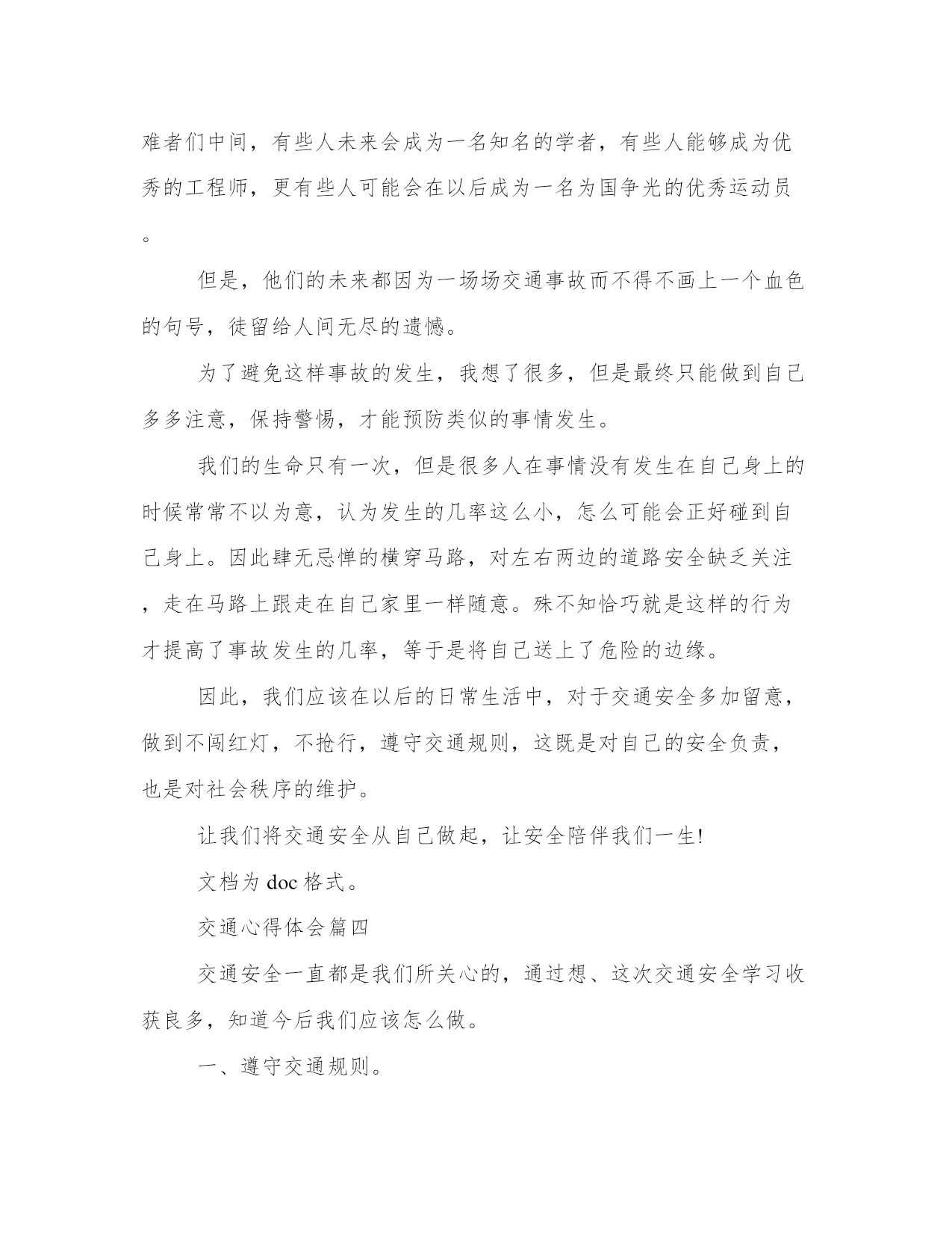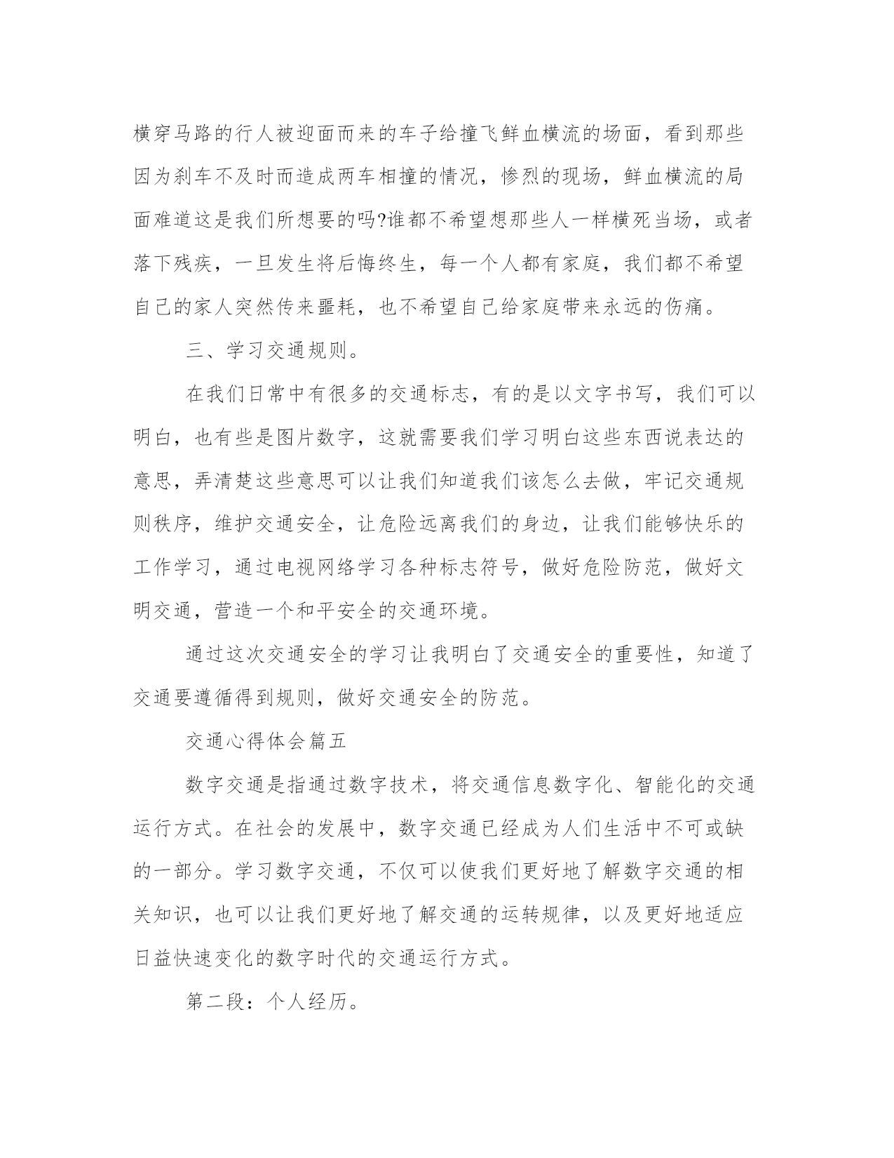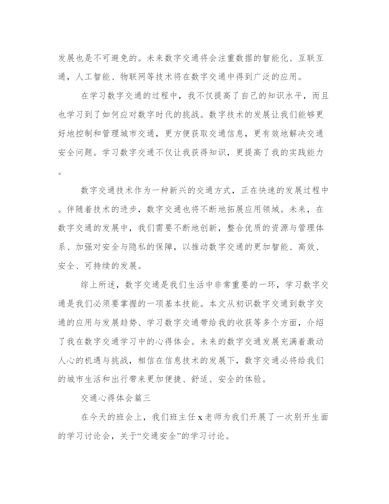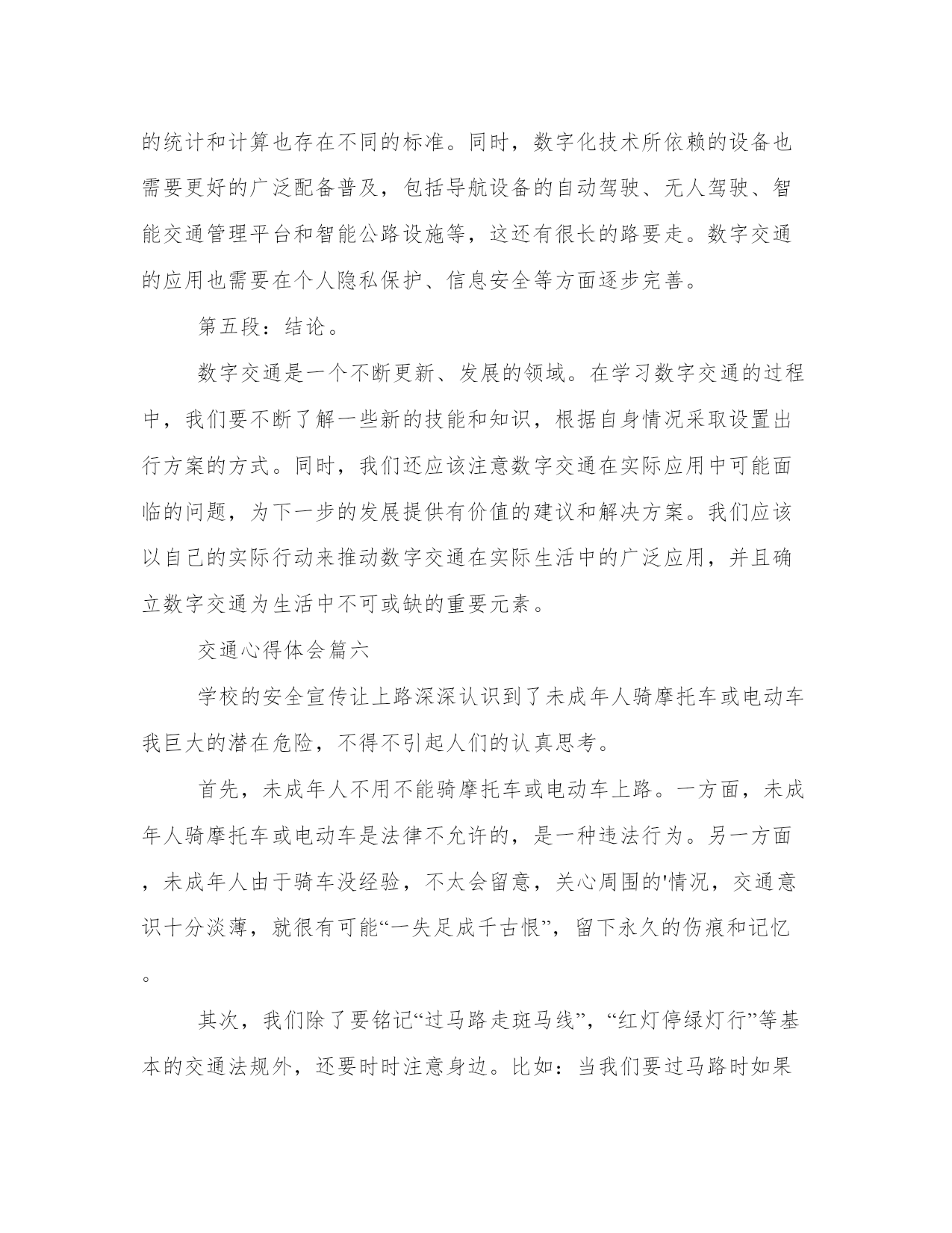 交通心得体会(通用10篇)当我们经历一段特殊的时刻,或者完成一项重要的任务时,我们会通过反思和总结来获取心得体会。心得体会是我们对于所经历的事件、经验和教训的总结和反思。下面我帮大家找寻并整理了一些优秀的心得体会范文,我们一起来了解一下吧。交通心得体会篇一当今社会,车多人多,尽管公安部门费尽了苦心,但还有交通事故频频发生。听了交通安全讲座之后,我对交通安全知识又掌握了许多。讲座总共分为四个方面,一是交通安全的重要性。同学们,你们知道吗?我们武陟县是交通事故隐患大县,去年大大小小交通事故有1485起,造成死亡人数27人,受伤人数726人,损失财产991万元。光20__年至现在,就有563起交通事故发生,最多一天高达五十多起。这一个个惊人的数字说明了交通安全的重要性。二是交通危害,交通危害猛如虎,如果发生事故,会造成当事人当场死亡或受伤,甚至危害到群众安全。这不仅对社会风气有所伤害,还给亲人造成沉重的打击。三是造成交通的事故的原因,多数人都是因为赶时间才造成超速、闯红灯等违法行为,就在4月21日晚上,就有6人违法。所以,我们应多为自己的`安全着想,不要因为赶时间从而造成事故的发生。最后是交通事故预防,也是最重要的一点。在平时,我们就应多学习一些交通安全知识,街道一般分为三道,分别是机动车道、非机动车道、人行道,走时都要靠右行。告诉大家一个悲剧:前不久,就在小原村,有三个高年级同学在马路上,边聊边走,有一个人自行车技术非常高,他一直在那里来回跑,正当他得意忘形的时候,一辆大货车突然冲来,造成那个人当场死亡。这就是不遵守交通法规的后果,我们可不敢学他。所以,同学们,让我们争当交通安全小天使吧!交通心得体会篇二数字交通是指以数字技术为基础,结合交通运输及相关行业的信息化、网络化应用,实现交通灵活、安全、智能化的一种交通系统。随着数字技术的不断发展,数字交通已经成为交通运输领域的未来发展趋势。学习数字交通的重要性日益显现,本文将探讨我在学习数字交通中的心得体会。在学习数字交通的初期,我对数字交通的概念和应用都不太清晰。通过多方面的学习,我认识到数字交通是一种先进的交通方式,它充分结合了现代信息技术和交通运输领域的特点,能够提高交通运输效率,降低交通事故率,提升城市交通环境质量。第三段:数字交通的应用与发展趋势。随着数字技术的发展,数字交通已经应用到了多个领域中,其中最为明显的是移动支付、智能公交等应用。同时,数字交通的进一步发展也是不可避免的。未来数字交通将会注重数据的智能化、互联互通,人工智能、物联网等技术将在数字交通中得到广泛的应用。在学习数字交通的过程中,我不仅提高了自己的知识水平,而且也学习到了如何应对数字时代的挑战。数字技术的发展让我们能够更好地控制和管理城市交通,更方便获取交通信息,更有效地解决交通安全问题。学习数字交通不仅让我获得知识,更提高了我的实践能力。数字交通技术作为一种新兴的交通方式,正在快速的发展过程中。伴随着技术的进步,数字交通也将不断地拓展应用领域。未来,在数字交通的发展中,我们需要不断地创新,整合优质的资源与管理体系、加强对安全与隐私的保障,以推动数字交通的更加智能、高效、安全、可持续的发展。综上所述,数字交通是我们生活中非常重要的一环,学习数字交通是我们必须要掌握的一项基本技能。本文从初识数字交通到数字交通的应用与发展趋势、学习数字交通带给我的收获等多个方面,介绍了我在数字交通学习中的心得体会。未来的数字交通发展充满着激动人心的机遇与挑战,相信在信息技术的发展下,数字交通必将给我们的城市生活和出行带来更加便捷、舒适、安全的体验。交通心得体会篇三在今天的班会上,我们班主任x老师为我们开展了一次别开生面的学习讨论会,关于“交通安全”的学习讨论。这让平日里满脑子想着学业的我们稍微放下负担,开始顺着班主任的话对交通安全进行学习和讨论。班主任先是给我们放了一些纪录片,可以看出视角是各个路口的监控摄像头,跟着摄像头的视角我们看到了一场场的车祸,每次车祸班主任都会顺着视频上的介绍进行一些讲解。一开始,我们班上态度还没有严肃起来,看着这些视频心里有些好笑,抱着玩闹的心情看着这些事故灾难。但是很快,甚至没用老师教训,我们就在一场又一场灿烈的车祸和死伤者家人崩溃哭泣的面容中收敛了心情,脸上渐渐变得严肃,班级的气氛也变得安静压抑起来。看到那些看似好笑的画面时,我们也因为能够感同身受,体会到视频里人的痛苦而不再做声。随着班主任的.不断诉说,我们心里对交通安全这一思想理念的概念越发清楚,甚至于看到那些大型货车会有一些惧怕的心理了。一条条鲜活的生命,就因为一时的大意或者没能注意到意外的到来而消逝,最后留给人间的只有这让人无比叹息的警示视频和亲人朋友们的崩溃大哭。这一场场悲剧的发生实在是让我