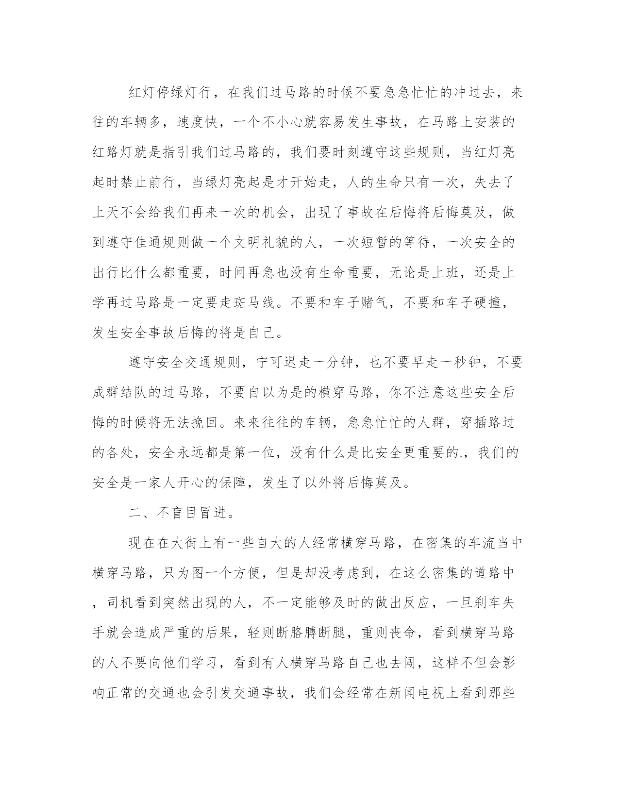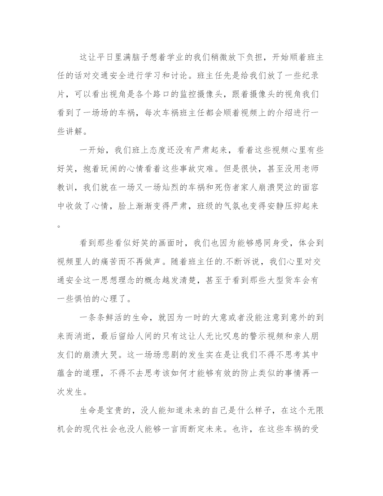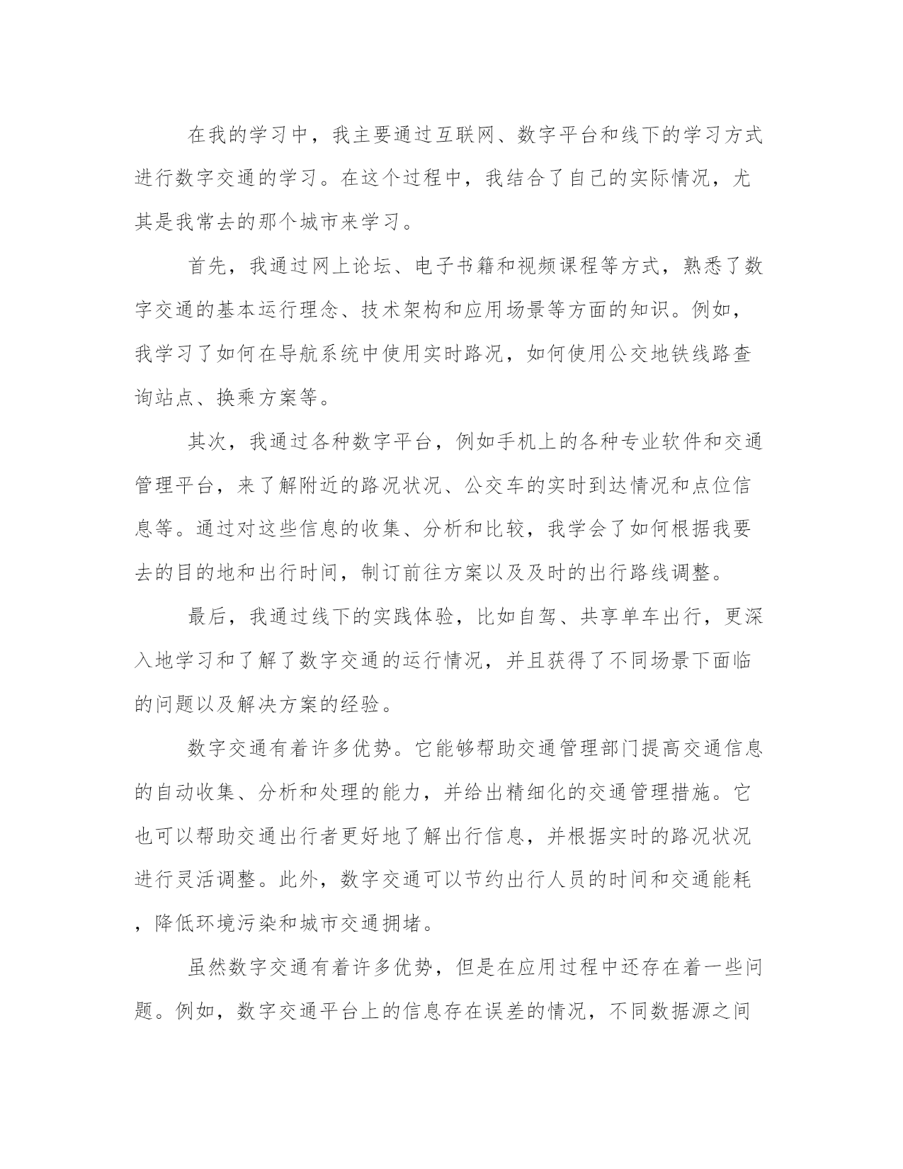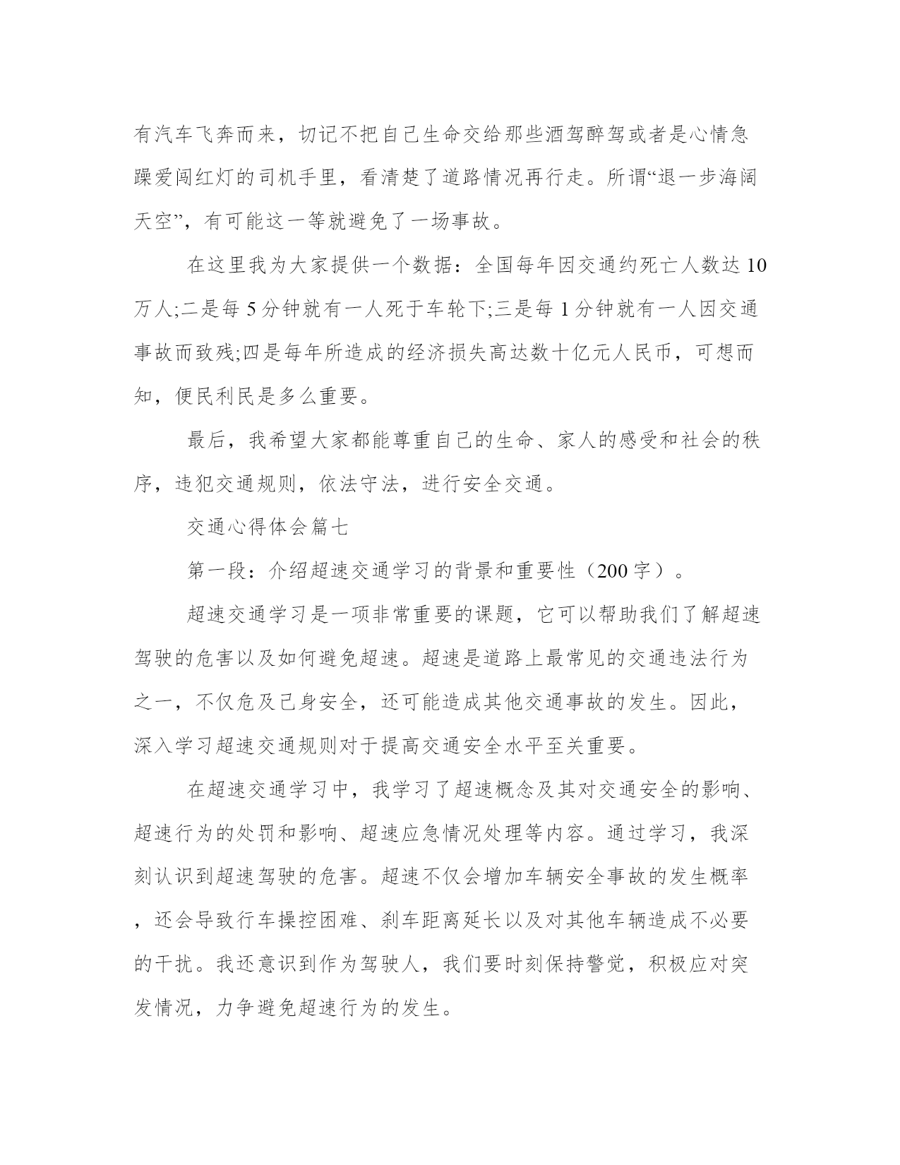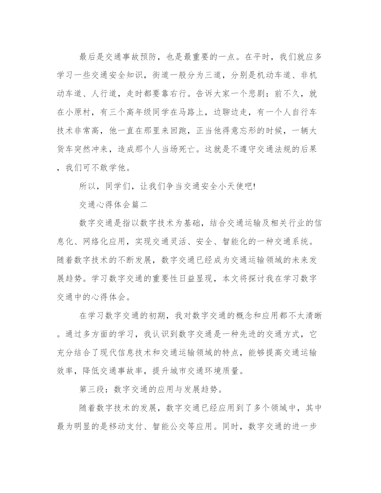 交通心得体会(通用10篇)当我们经历一段特殊的时刻,或者完成一项重要的任务时,我们会通过反思和总结来获取心得体会。心得体会是我们对于所经历的事件、经验和教训的总结和反思。下面我帮大家找寻并整理了一些优秀的心得体会范文,我们一起来了解一下吧。交通心得体会篇一当今社会,车多人多,尽管公安部门费尽了苦心,但还有交通事故频频发生。听了交通安全讲座之后,我对交通安全知识又掌握了许多。讲座总共分为四个方面,一是交通安全的重要性。同学们,你们知道吗?我们武陟县是交通事故隐患大县,去年大大小小交通事故有1485起,造成死亡人数27人,受伤人数726人,损失财产991万元。光20__年至现在,就有563起交通事故发生,最多一天高达五十多起。这一个个惊人的数字说明了交通安全的重要性。二是交通危害,交通危害猛如虎,如果发生事故,会造成当事人当场死亡或受伤,甚至危害到群众安全。这不仅对社会风气有所伤害,还给亲人造成沉重的打击。三是造成交通的事故的原因,多数人都是因为赶时间才造成超速、闯红灯等违法行为,就在4月21日晚上,就有6人违法。所以,我们应多为自己的`安全着想,不要因为赶时间从而造成事故的发生。最后是交通事故预防,也是最重要的一点。在平时,我们就应多学习一些交通安全知识,街道一般分为三道,分别是机动车道、非机动车道、人行道,走时都要靠右行。告诉大家一个悲剧:前不久,就在小原村,有三个高年级同学在马路上,边聊边走,有一个人自行车技术非常高,他一直在那里来回跑,正当他得意忘形的时候,一辆大货车突然冲来,造成那个人当场死亡。这就是不遵守交通法规的后果,我们可不敢学他。所以,同学们,让我们争当交通安全小天使吧!交通心得体会篇二数字交通是指以数字技术为基础,结合交通运输及相关行业的信息化、网络化应用,实现交通灵活、安全、智能化的一种交通系统。随着数字技术的不断发展,数字交通已经成为交通运输领域的未来发展趋势。学习数字交通的重要性日益显现,本文将探讨我在学习数字交通中的心得体会。在学习数字交通的初期,我对数字交通的概念和应用都不太清晰。通过多方面的学习,我认识到数字交通是一种先进的交通方式,它充分结合了现代信息技术和交通运输领域的特点,能够提高交通运输效率,降低交通事故率,提升城市交通环境质量。第三段:数字交通的应用与发展趋势。随着数字技术的发展,数字交通已经应用到了多个领域中,其中最为明显的是移动支付、智能公交等应用。同时,数字交通的进一步发展也是不可避免的。未来数字交通将会注重数据的智能化、互联互通,人工智能、物联网等技术将在数字交通中得到广泛的应用。在学习数字交通的过程中,我不仅提高了自己的知识水平,而且也学习到了如何应对数字时代的挑战。数字技术的发展让我们能够更好地控制和管理城市交通,更方便获取交通信息,更有效地解决交通安全问题。学习数字交通不仅让我获得知识,更提高了我的实践能力。数字交通技术作为一种新兴的交通方式,正在快速的发展过程中。伴随着技术的进步,数字交通也将不断地拓展应用领域。未来,在数字交通的发展中,我们需要不断地创新,整合优质的资源与管理体系、加强对安全与隐私的保障,以推动数字交通的更加智能、高效、安全、可持续的发展。综上所述,数字交通是我们生活中非常重要的一环,学习数字交通是我们必须要掌握的一项基本技能。本文从初识数字交通到数字交通的应用与发展趋势、学习数字交通带给我的收获等多个方面,介绍了我在数字交通学习中的心得体会。未来的数字交通发展充满着激动人心的机遇与挑战,相信在信息技术的发展下,数字交通必将给我们的城市生活和出行带来更加便捷、舒适、安全的体验。交通心得体会篇三在今天的班会上,我们班主任x老师为我们开展了一次别开生面的学习讨论会,关于“交通安全”的学习讨论。这让平日里满脑子想着学业的我们稍微放下负担,开始顺着班主任的话对交通安全进行学习和讨论。班主任先是给我们放了一些纪录片,可以看出视角是各个路口的监控摄像头,跟着摄像头的视角我们看到了一场场的车祸,每次车祸班主任都会顺着视频上的介绍进行一些讲解。一开始,我们班上态度还没有严肃起来,看着这些视频心里有些好笑,抱着玩闹的心情看着这些事故灾难。但是很快,甚至没用老师教训,我们就在一场又一场灿烈的车祸和死伤者家人崩溃哭泣的面容中收敛了心情,脸上渐渐变得严肃,班级的气氛也变得安静压抑起来。看到那些看似好笑的画面时,我们也因为能够感同身受,体会到视频里人的痛苦而不再做声。随着班主任的.不断诉说,我们心里对交通安全这一思想理念的概念越发清楚,甚至于看到那些大型货车会有一些惧怕的心理了。一条条鲜活的生命,就因为一时的大意或者没能注意到意外的到来而消逝,最后留给人间的只有这让人无比叹息的警示视频和亲人朋友们的崩溃大哭。这一场场悲剧的发生实在是让我