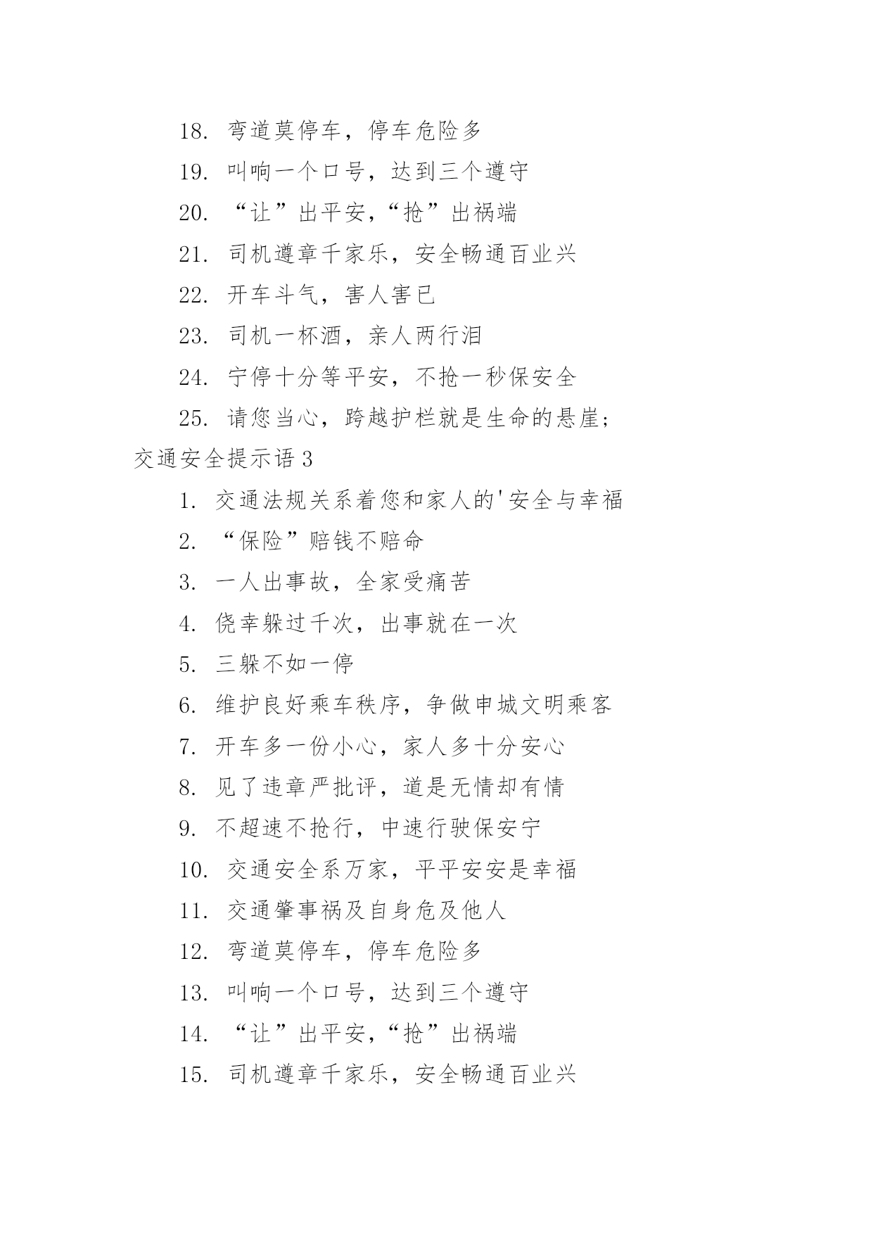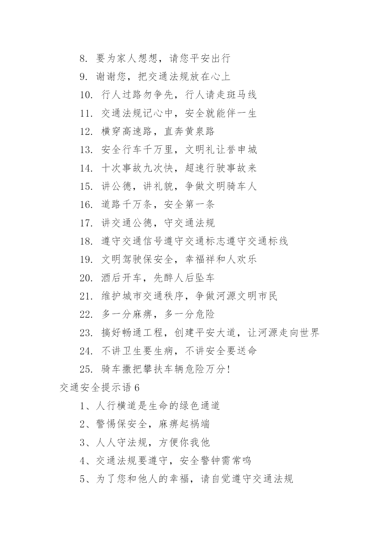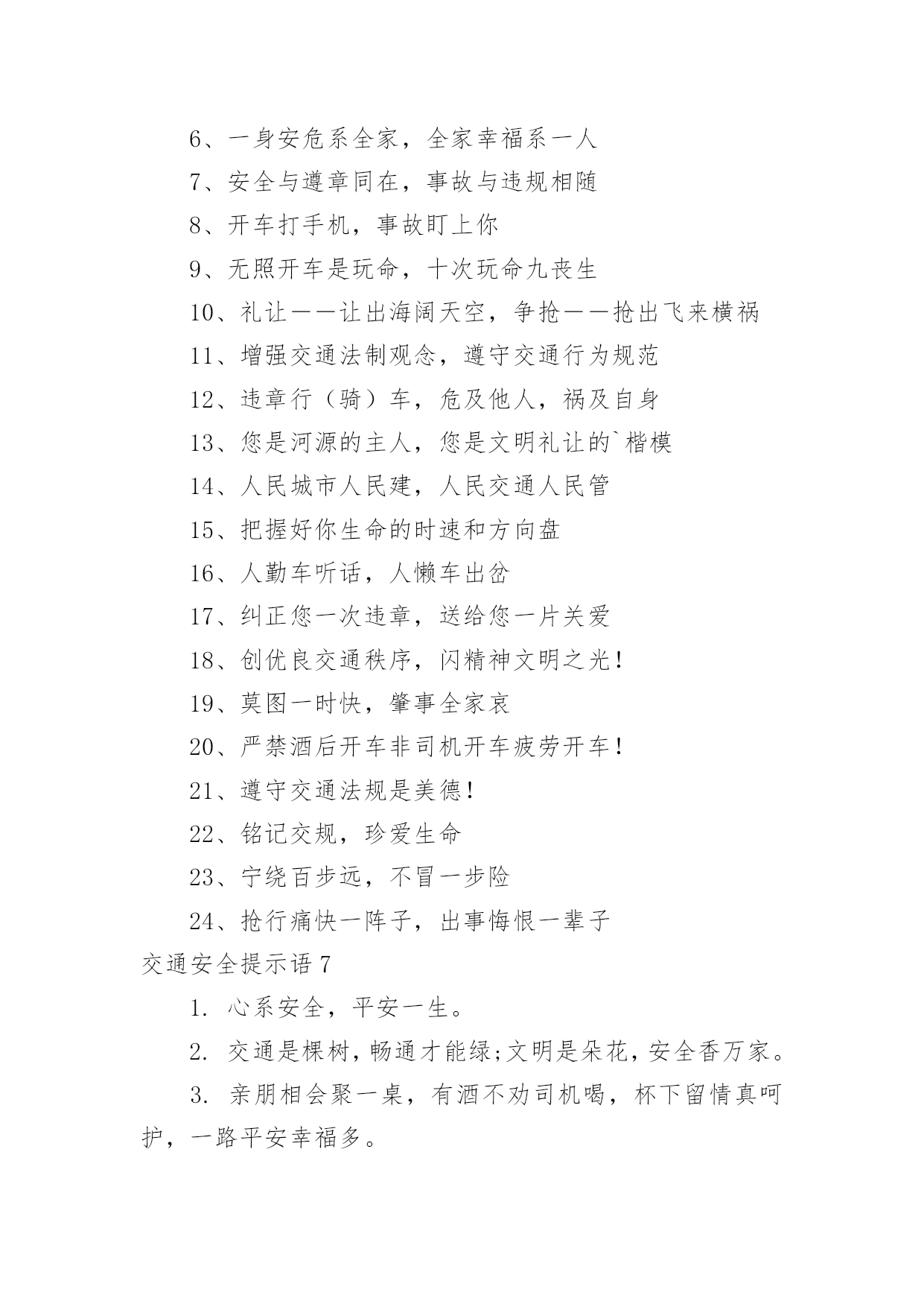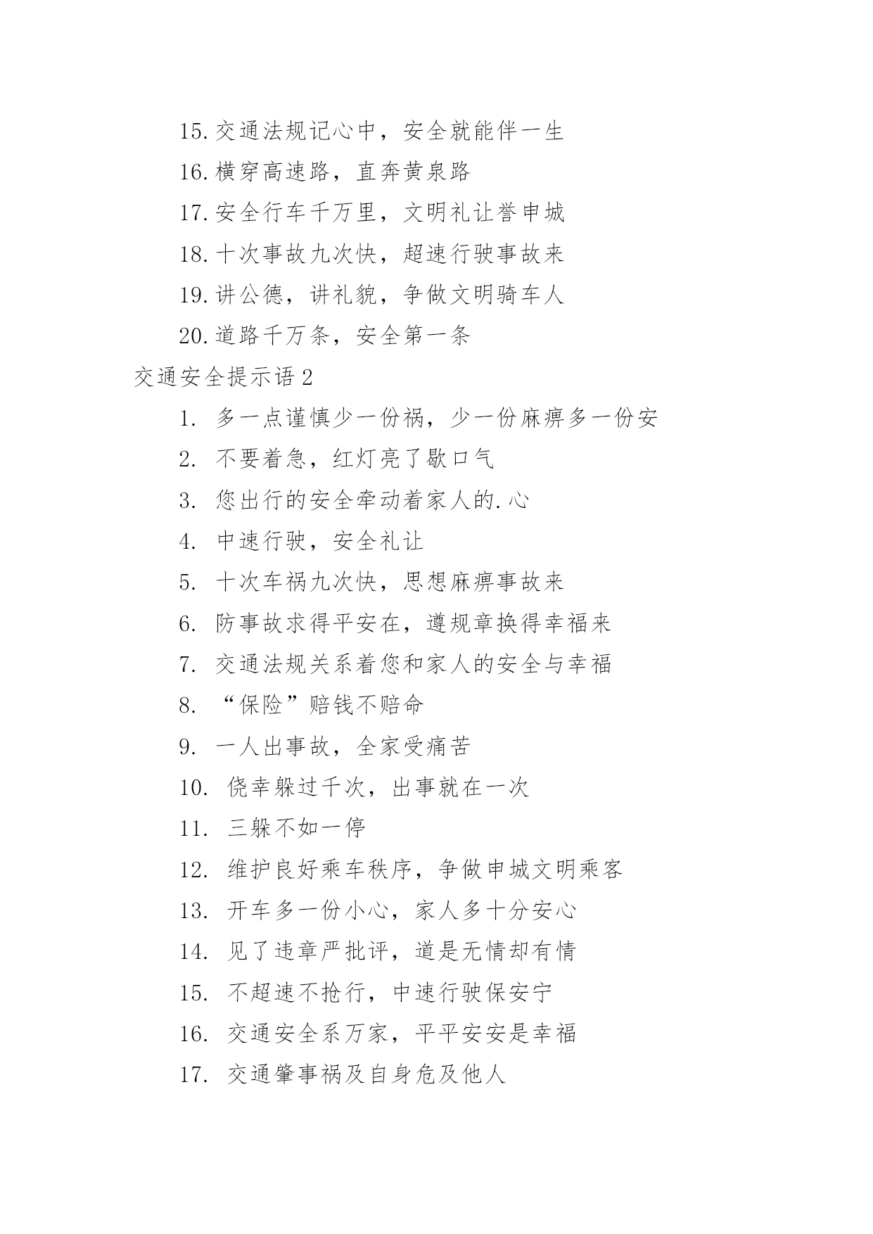 交通安全提示语交通安全提示语[优秀15篇]在社会一步步向前发展的今天,大家都接触过提示语吧,由字数相等并且押韵的两句话或多句话作为提示语。那要怎么写好提示语呢?下面是小编帮大家整理的交通安全提示语,希望对大家有所帮助。交通安全提示语11.人民城市人民建,人民交通人民管2.把握好你生命的时速和方向盘3.人勤车听话,人懒车出岔4.纠正您一次违章,送给您一片关爱5.创优良交通秩序,闪精神文明之光!6.莫图一时快,肇事全家哀7.严禁酒后开车非司机开车疲劳开车!8.遵守交通法规是美德!9.铭记交规,珍爱生命10.宁绕百步远,不冒一步险11.抢行痛快一阵子,出事悔恨一辈子12.要为家人想想,请您平安出行13.谢谢您,把交通法规放在心上14.行人过路勿争先,行人请走斑马线15.交通法规记心中,安全就能伴一生16.横穿高速路,直奔黄泉路17.安全行车千万里,文明礼让誉申城18.十次事故九次快,超速行驶事故来19.讲公德,讲礼貌,争做文明骑车人20.道路千万条,安全第一条交通安全提示语21.多一点谨慎少一份祸,少一份麻痹多一份安2.不要着急,红灯亮了歇口气3.您出行的安全牵动着家人的.心4.中速行驶,安全礼让5.十次车祸九次快,思想麻痹事故来6.防事故求得平安在,遵规章换得幸福来7.交通法规关系着您和家人的安全与幸福8.“保险”赔钱不赔命9.一人出事故,全家受痛苦10.侥幸躲过千次,出事就在一次11.三躲不如一停12.维护良好乘车秩序,争做申城文明乘客13.开车多一份小心,家人多十分安心14.见了违章严批评,道是无情却有情15.不超速不抢行,中速行驶保安宁16.交通安全系万家,平平安安是幸福17.交通肇事祸及自身危及他人18.弯道莫停车,停车危险多19.叫响一个口号,达到三个遵守20.“让”出平安,“抢”出祸端21.司机遵章千家乐,安全畅通百业兴22.开车斗气,害人害已23.司机一杯酒,亲人两行泪24.宁停十分等平安,不抢一秒保安全25.请您当心,跨越护栏就是生命的悬崖;交通安全提示语31.交通法规关系着您和家人的'安全与幸福2.“保险”赔钱不赔命3.一人出事故,全家受痛苦4.侥幸躲过千次,出事就在一次5.三躲不如一停6.维护良好乘车秩序,争做申城文明乘客7.开车多一份小心,家人多十分安心8.见了违章严批评,道是无情却有情9.不超速不抢行,中速行驶保安宁10.交通安全系万家,平平安安是幸福11.交通肇事祸及自身危及他人12.弯道莫停车,停车危险多13.叫响一个口号,达到三个遵守14.“让”出平安,“抢”出祸端15.司机遵章千家乐,安全畅通百业兴16.开车斗气,害人害已17.司机一杯酒,亲人两行泪18.宁停十分等平安,不抢一秒保安全19.请您当心,跨越护栏就是生命的悬崖;20.麻痹是事故的祸根!交通安全提示语4不比快只求稳,平安回家才是本。不喝酒,多睡眠,行车上路才安全;守法规,遵法纪,生命保障最实际。不怕车多人多,就怕安全意识滑坡。共守交通法规,同享一片安宁。拐弯路面尚危险,降速行驶好相闪,虽然车辆有投险,安全意识不得减。和谐泉州万家欢乐,文明交通一路平安。红灯亮时,管好你的脚步;绿灯亮时,管好你的速度!忽视交法吃苦头,胡乱穿行栽跟头,文明出行尝甜头。驾车不喝酒,路上好行走。驾车专心,家人宽心,路人放心,安全是金。交通法规记心中,安全驾驶万事通。你出力,我出力,文明交通齐努力;你添彩,我添彩,和谐社会更精彩。你赶我赶,赶出无情车祸。你让我让,让出有序交通。你让我让让出温馨,你抢我抢抢出祸端。平安出行每一步,关爱生命每一天,交通安全心中记,幸福生活比蜜甜。亲人有交代,系好安全带,开车不比赛,平安时刻在。让则通,通则畅!人人关心交通安全,路路小心伴您平安。事故皆因大意起,安全驾驶要牢记!手拉手打造文明交通,心连心创建和谐社会。违法通行,安全为零。温馨红黄绿,和谐人车路。文明礼让展现你的'素质,平安出行保障您的安全。文明行车,让我们的城市温馨一点;安全驾驶,让你我的家人放心一些。文明行车千里共婵娟,遵纪守法万家得团圆。系上安全带,对己对人是关爱。狭路相逢“让”者胜,两车相顶“退”者赢。向左走,向右走,交规谨遵守;往前看,往后看,安全长相伴。交通安全提示语51.创优良交通秩序,闪精神文明之光!2.莫图一时快,肇事全家哀3.严禁酒后开车非司机开车疲劳开车!4.遵守交通法规是美德!5.铭记交规,珍爱生命6.宁绕百步远,不冒一步险7.抢行痛快一阵子,出事悔恨一辈子8.要为家人想想,请您平安出行9.谢谢您,把交通法规放在心上10.行人过路勿争先,行人请走斑马线11.交通法规记心中,安全就能伴一生12.横穿高速路,直奔黄泉路13.安全行车千万里,文明礼让誉申城14.十次事故九次快,超速行驶事故来15.讲公德,讲礼貌,争做文明骑车人16.道路千万条,安全第一条