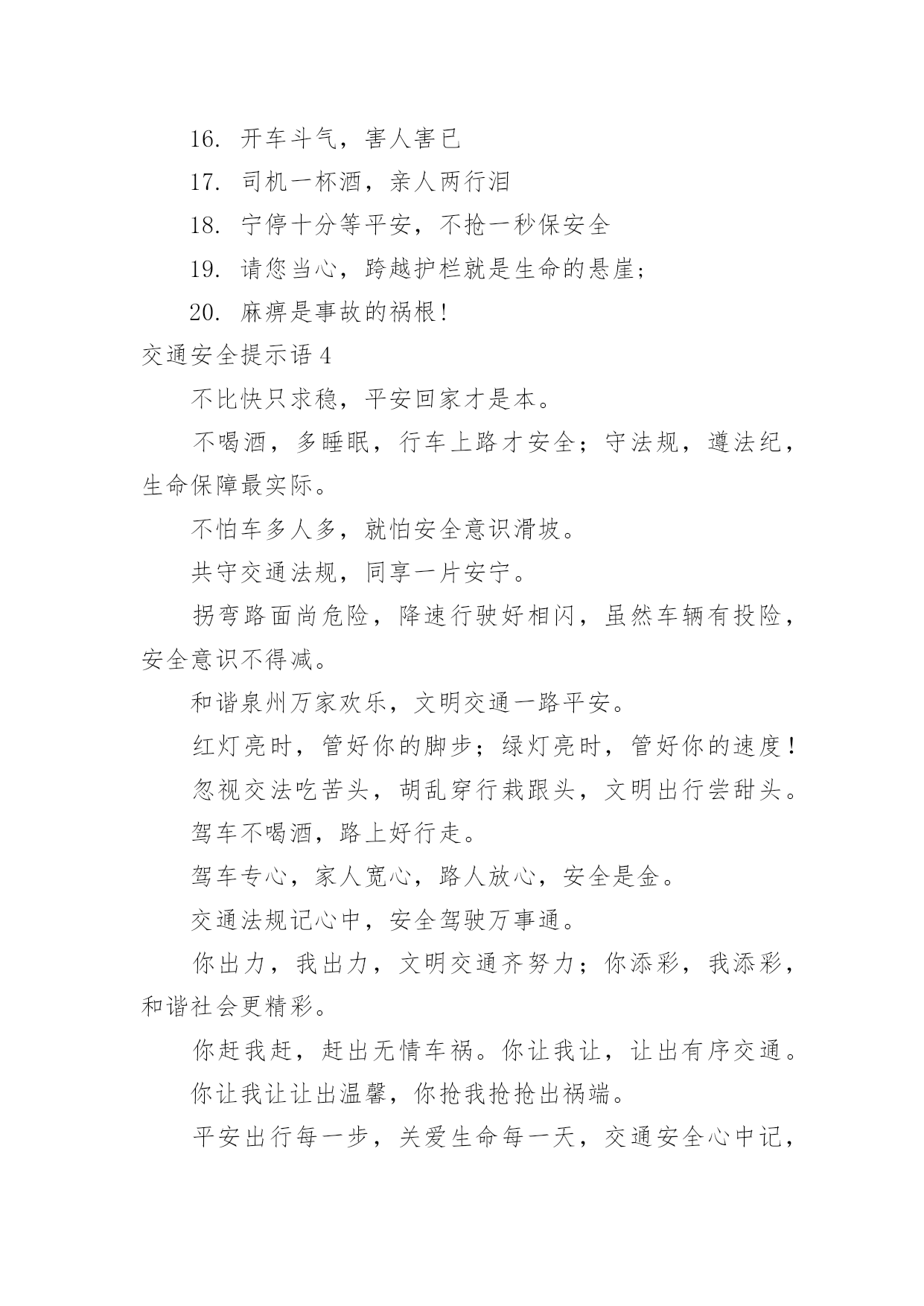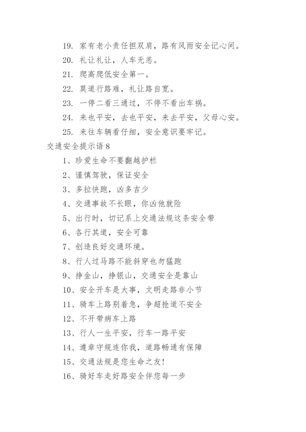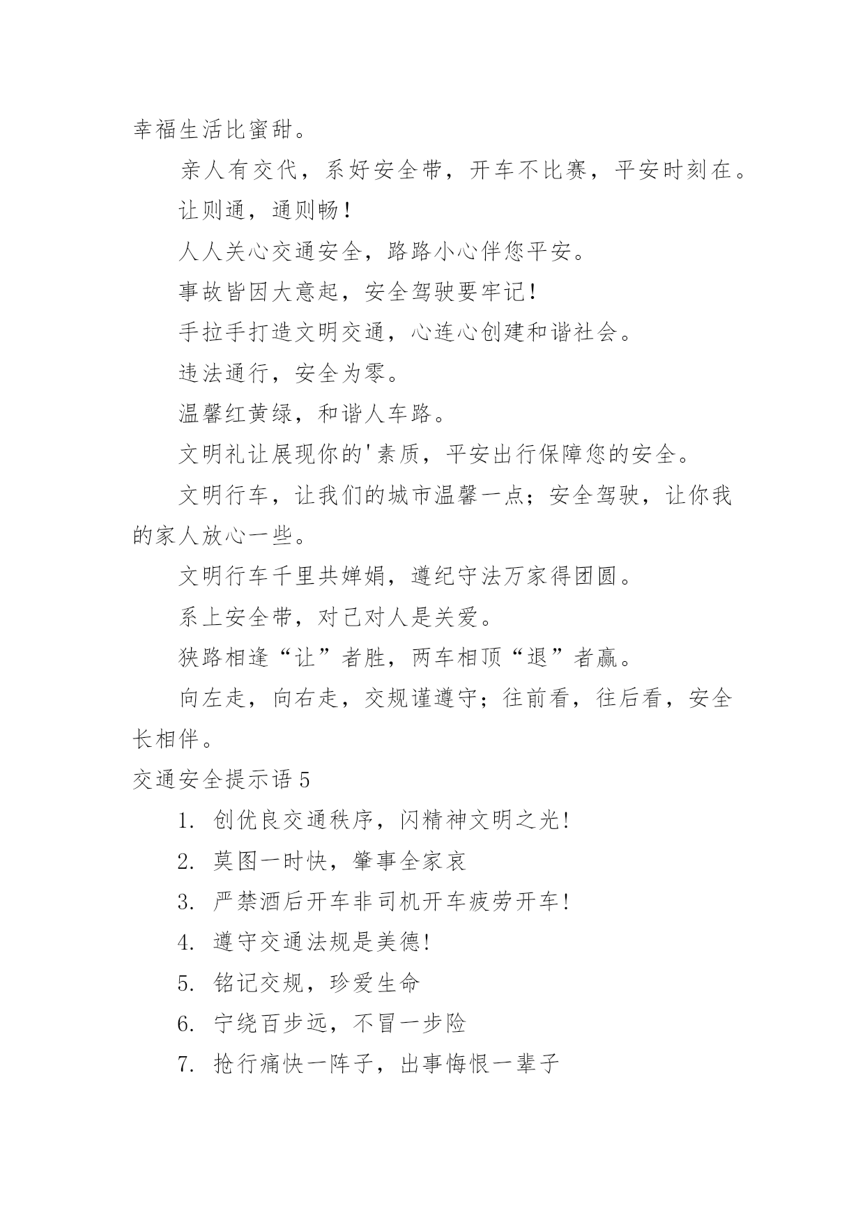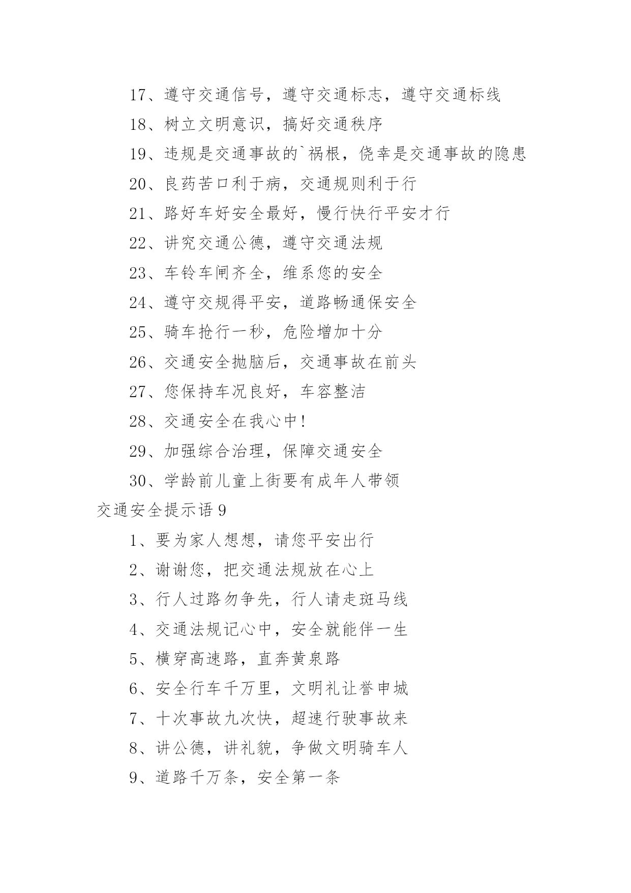 交通安全提示语交通安全提示语[优秀15篇]在社会一步步向前发展的今天,大家都接触过提示语吧,由字数相等并且押韵的两句话或多句话作为提示语。那要怎么写好提示语呢?下面是小编帮大家整理的交通安全提示语,希望对大家有所帮助。交通安全提示语11.人民城市人民建,人民交通人民管2.把握好你生命的时速和方向盘3.人勤车听话,人懒车出岔4.纠正您一次违章,送给您一片关爱5.创优良交通秩序,闪精神文明之光!6.莫图一时快,肇事全家哀7.严禁酒后开车非司机开车疲劳开车!8.遵守交通法规是美德!9.铭记交规,珍爱生命10.宁绕百步远,不冒一步险11.抢行痛快一阵子,出事悔恨一辈子12.要为家人想想,请您平安出行13.谢谢您,把交通法规放在心上14.行人过路勿争先,行人请走斑马线15.交通法规记心中,安全就能伴一生16.横穿高速路,直奔黄泉路17.安全行车千万里,文明礼让誉申城18.十次事故九次快,超速行驶事故来19.讲公德,讲礼貌,争做文明骑车人20.道路千万条,安全第一条交通安全提示语21.多一点谨慎少一份祸,少一份麻痹多一份安2.不要着急,红灯亮了歇口气3.您出行的安全牵动着家人的.心4.中速行驶,安全礼让5.十次车祸九次快,思想麻痹事故来6.防事故求得平安在,遵规章换得幸福来7.交通法规关系着您和家人的安全与幸福8.“保险”赔钱不赔命9.一人出事故,全家受痛苦10.侥幸躲过千次,出事就在一次11.三躲不如一停12.维护良好乘车秩序,争做申城文明乘客13.开车多一份小心,家人多十分安心14.见了违章严批评,道是无情却有情15.不超速不抢行,中速行驶保安宁16.交通安全系万家,平平安安是幸福17.交通肇事祸及自身危及他人18.弯道莫停车,停车危险多19.叫响一个口号,达到三个遵守20.“让”出平安,“抢”出祸端21.司机遵章千家乐,安全畅通百业兴22.开车斗气,害人害已23.司机一杯酒,亲人两行泪24.宁停十分等平安,不抢一秒保安全25.请您当心,跨越护栏就是生命的悬崖;交通安全提示语31.交通法规关系着您和家人的'安全与幸福2.“保险”赔钱不赔命3.一人出事故,全家受痛苦4.侥幸躲过千次,出事就在一次5.三躲不如一停6.维护良好乘车秩序,争做申城文明乘客7.开车多一份小心,家人多十分安心8.见了违章严批评,道是无情却有情9.不超速不抢行,中速行驶保安宁10.交通安全系万家,平平安安是幸福11.交通肇事祸及自身危及他人12.弯道莫停车,停车危险多13.叫响一个口号,达到三个遵守14.“让”出平安,“抢”出祸端15.司机遵章千家乐,安全畅通百业兴16.开车斗气,害人害已17.司机一杯酒,亲人两行泪18.宁停十分等平安,不抢一秒保安全19.请您当心,跨越护栏就是生命的悬崖;20.麻痹是事故的祸根!交通安全提示语4不比快只求稳,平安回家才是本。不喝酒,多睡眠,行车上路才安全;守法规,遵法纪,生命保障最实际。不怕车多人多,就怕安全意识滑坡。共守交通法规,同享一片安宁。拐弯路面尚危险,降速行驶好相闪,虽然车辆有投险,安全意识不得减。和谐泉州万家欢乐,文明交通一路平安。红灯亮时,管好你的脚步;绿灯亮时,管好你的速度!忽视交法吃苦头,胡乱穿行栽跟头,文明出行尝甜头。驾车不喝酒,路上好行走。驾车专心,家人宽心,路人放心,安全是金。交通法规记心中,安全驾驶万事通。你出力,我出力,文明交通齐努力;你添彩,我添彩,和谐社会更精彩。你赶我赶,赶出无情车祸。你让我让,让出有序交通。你让我让让出温馨,你抢我抢抢出祸端。平安出行每一步,关爱生命每一天,交通安全心中记,幸福生活比蜜甜。亲人有交代,系好安全带,开车不比赛,平安时刻在。让则通,通则畅!人人关心交通安全,路路小心伴您平安。事故皆因大意起,安全驾驶要牢记!手拉手打造文明交通,心连心创建和谐社会。违法通行,安全为零。温馨红黄绿,和谐人车路。文明礼让展现你的'素质,平安出行保障您的安全。文明行车,让我们的城市温馨一点;安全驾驶,让你我的家人放心一些。文明行车千里共婵娟,遵纪守法万家得团圆。系上安全带,对己对人是关爱。狭路相逢“让”者胜,两车相顶“退”者赢。向左走,向右走,交规谨遵守;往前看,往后看,安全长相伴。交通安全提示语51.创优良交通秩序,闪精神文明之光!2.莫图一时快,肇事全家哀3.严禁酒后开车非司机开车疲劳开车!4.遵守交通法规是美德!5.铭记交规,珍爱生命6.宁绕百步远,不冒一步险7.抢行痛快一阵子,出事悔恨一辈子8.要为家人想想,请您平安出行9.谢谢您,把交通法规放在心上10.行人过路勿争先,行人请走斑马线11.交通法规记心中,安全就能伴一生12.横穿高速路,直奔黄泉路13.安全行车千万里,文明礼让誉申城14.十次事故九次快,超速行驶事故来15.讲公德,讲礼貌,争做文明骑车人16.道路千万条,安全第一条
