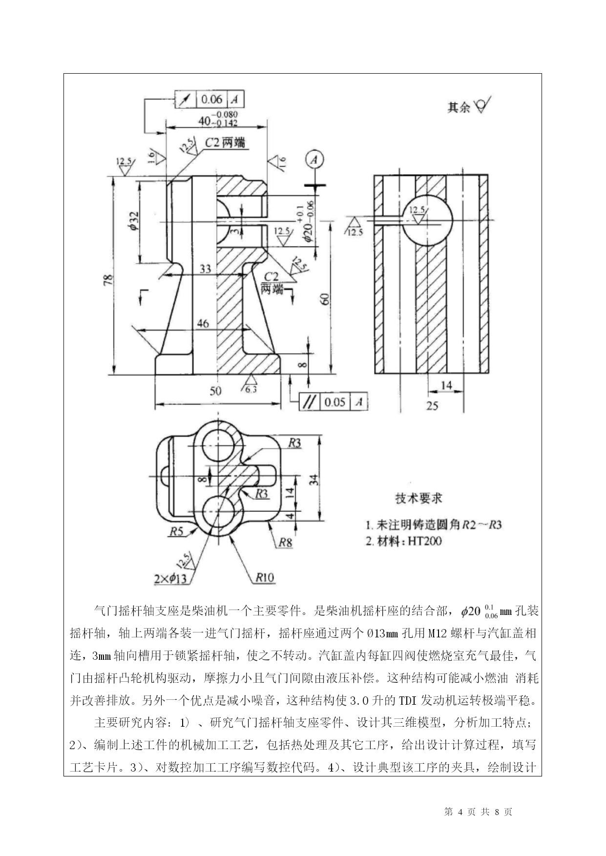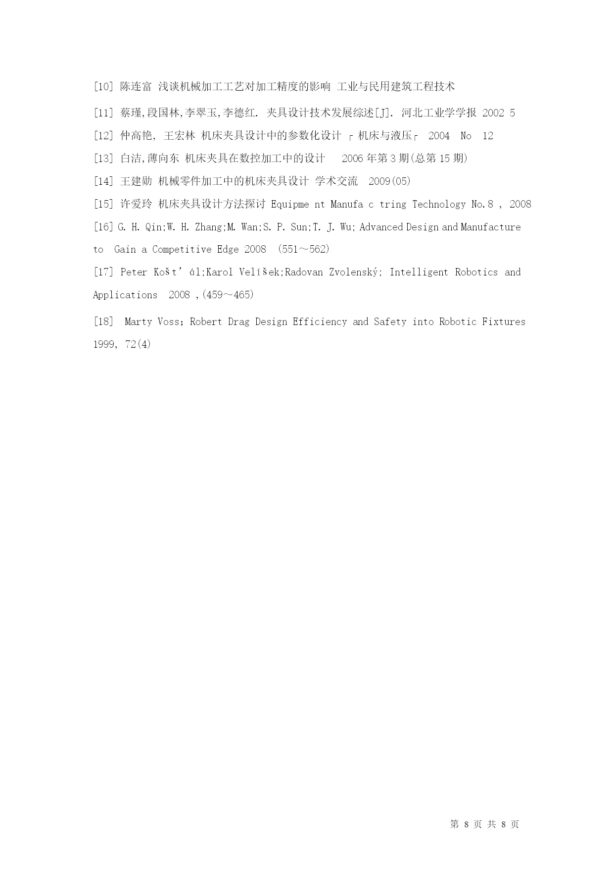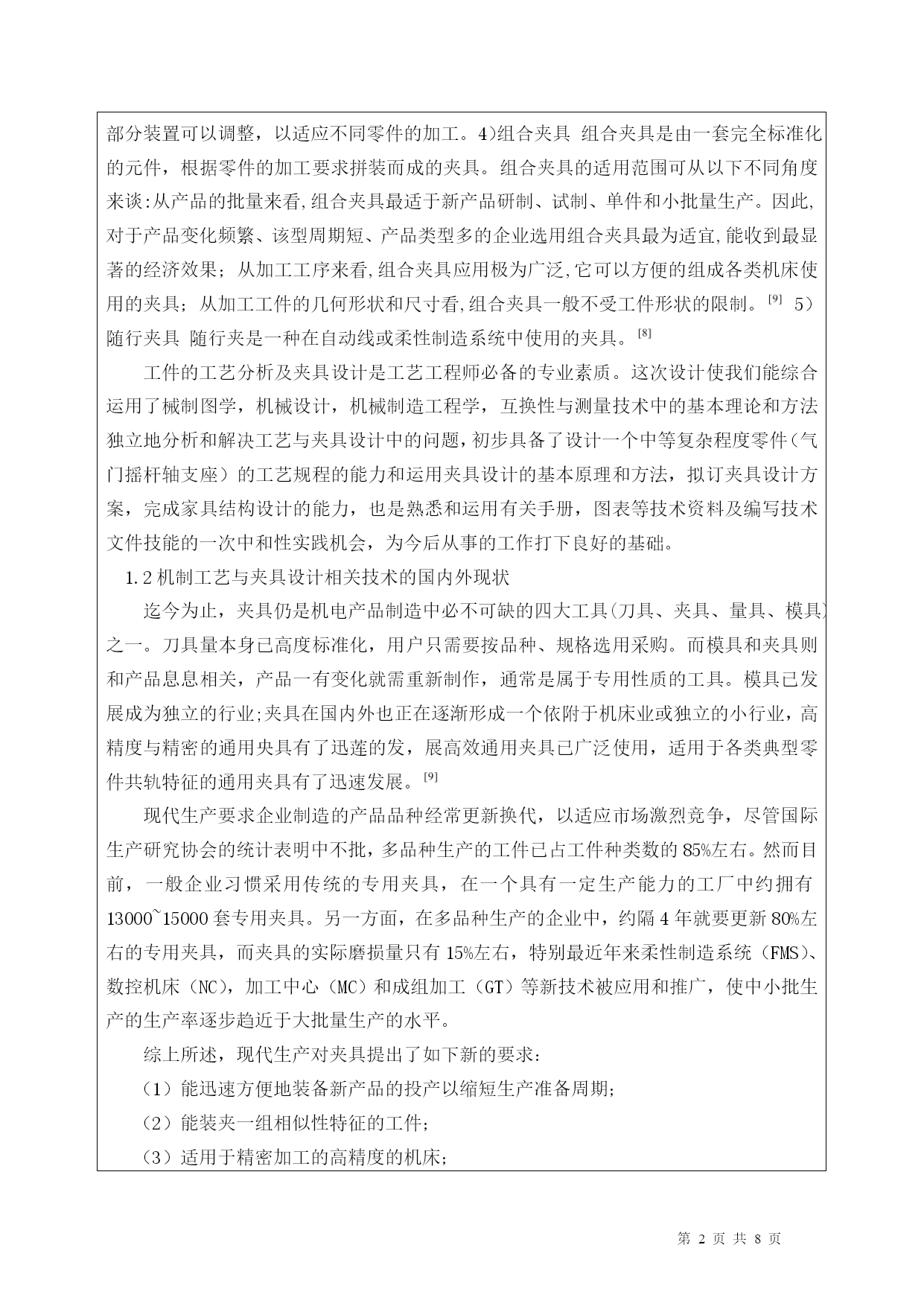第PAGE\*MERGEFORMAT8页共NUMPAGES\*MERGEFORMAT8页毕业设计(论文)综述1.1题目背景题目背景和及研究意义制造业是一个国家的立国之本,是一个国家的民族产业和支柱产业,也是反映一个国家经济实力的重要标志,是为国家创造财富的重要产业。制造技术支持着制造业的发展,当今制造技术的发展使传统制造业革新了他原来的面目,制造工艺与夹具同样取得了较快发展。所谓工艺,是使各种原材料、半成品成为产品的方法和过程。进行机械加工工艺设计是保证产品质量、节约能源、降低成本的重要手段,是企业进行生产准备,计划调度、加工操作、生产安全、技术检测和健全劳动组织的重要依据,也是企业上品种、上质量、上水平,加速产品更新,提高经济效益的技术保证。机械零件加工精度是机械零件加工质量的核心部分。零件的加工精度是指零件完工后的实际几何参数(尺寸、形状和相互位置)对理想几何参数的符合程度,符合程度越高。机械加工工艺对加工精度的影响主要体现在加工工艺的受力变形、加工工艺的几何精度以及工艺系统的热变形三个方面。加工精度包括:尺寸精度,形状精度,位置精度。提高加工及高度的措施归纳为:减少误差法;误差补偿法(误差抵消法);误差转移法;就地加工法;误差平均法。而夹具的出现可靠地保证加工精度,提高整体工作效率,减轻劳动强度,充分发挥和扩大机床的工艺性能。机床夹具设计是工艺装备设计中的一个重要组成部分,是保证产品质量和提高劳动生产率的一项重要技术措施。在设计过程中应深人实际,进行调查研究,吸取国内外的先进技术,制定出合理的设计方案,再进行具体的设计。夹具是制造系统的重要组成部分,是机械制造中的一项重要工艺装备。工件在机床上进行加工时,为了保证加工精度和提高生产效率,必须使工件相对刀具占有正确位置,完成之一功能的辅助装置成为机床夹具。它的主要用于保证产品的加工质量、减轻劳动强度、辅助产品检测、展示、运输等。不论是传统制造,还是现代制造系统,夹具都是十分重要的。因此,好的夹具设计可以提高产品劳动生产率,保证和提高加工精度,降低生产成本等,还可以扩大机床的使用范围,从而使产品在保证精度的前提下提高效率、降低成本。当今激烈的市场竞争和企业信息化的要求,企业对夹具的设计及制造提出了更高的要求。机床夹具按其使用范围可分为以下五种基本类型:1)通用夹具通用夹具具有一定的通用性。2)专用夹具专用夹具是针对某一种工件的某一个工序而专门设计的。3)通用可调整夹具和成组夹具通用可调整夹具和成组夹具的特点是夹具的部分元件可以更换,部分装置可以调整,以适应不同零件的加工。4)组合夹具组合夹具是由一套完全标准化的元件,根据零件的加工要求拼装而成的夹具。组合夹具的适用范围可从以下不同角度来谈:从产品的批量来看,组合夹具最适于新产品研制、试制、单件和小批量生产。因此,对于产品变化频繁、该型周期短、产品类型多的企业选用组合夹具最为适宜,能收到最显著的经济效果;从加工工序来看,组合夹具应用极为广泛,它可以方便的组成各类机床使用的夹具;从加工工件的几何形状和尺寸看,组合夹具一般不受工件形状的限制。5)随行夹具随行夹是一种在自动线或柔性制造系统中使用的夹具。工件的工艺分析及夹具设计是工艺工程师必备的专业素质。这次设计使我们能综合运用了械制图学,机械设计,机械制造工程学,互换性与测量技术中的基本理论和方法独立地分析和解决工艺与夹具设计中的问题,初步具备了设计一个中等复杂程度零件(气门摇杆轴支座)的工艺规程的能力和运用夹具设计的基本原理和方法,拟订夹具设计方案,完成家具结构设计的能力,也是熟悉和运用有关手册,图表等技术资料及编写技术文件技能的一次中和性实践机会,为今后从事的工作打下良好的基础。1.2机制工艺与夹具设计相关技术的国内外现状迄今为止,夹具仍是机电产品制造中必不可缺的四大工具(刀具、夹具、量具、模具)之一。刀具量本身已高度标准化,用户只需要按品种、规格选用采购。而模具和夹具则和产品息息相关,产品一有变化就需重新制作,通常是属于专用性质的工具。模具已发展成为独立的行业;夹具在国内外也正在逐渐形成一个依附于机床业或独立的小行业,高精度与精密的通用央具有了迅莲的发,展高效通用夹具已广泛使用,适用于各类典型零件共轨特征的通用夹具有了迅速发展。现代生产要求企业制造的产品品种经常更新换代,以适应市场激烈竞争,尽管国际生产研究协会的统计表明中不批,多品种生产的工件已占工件种类数的85%左右。然而目前,一般企业习惯采用传统的专用夹具,在一个具有一定生产能力的工厂中约拥有13000~15000套专用夹具。另一方面,在多品种生产的企业中,约隔4年就要更新80%左右的专用夹具,而夹具的实际磨损量只有15%左右,特别最近年来柔性制造系统(FMS)、数控机床(NC),加工