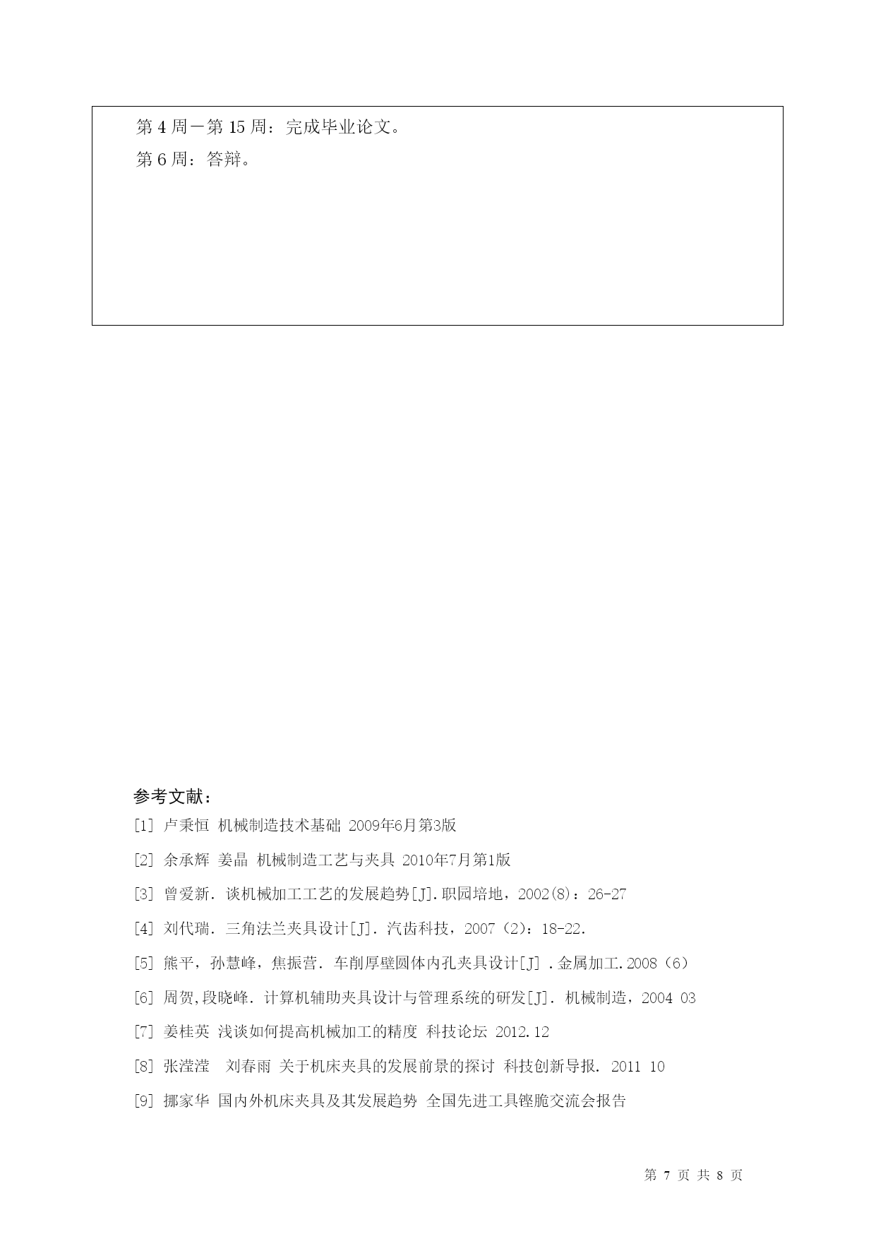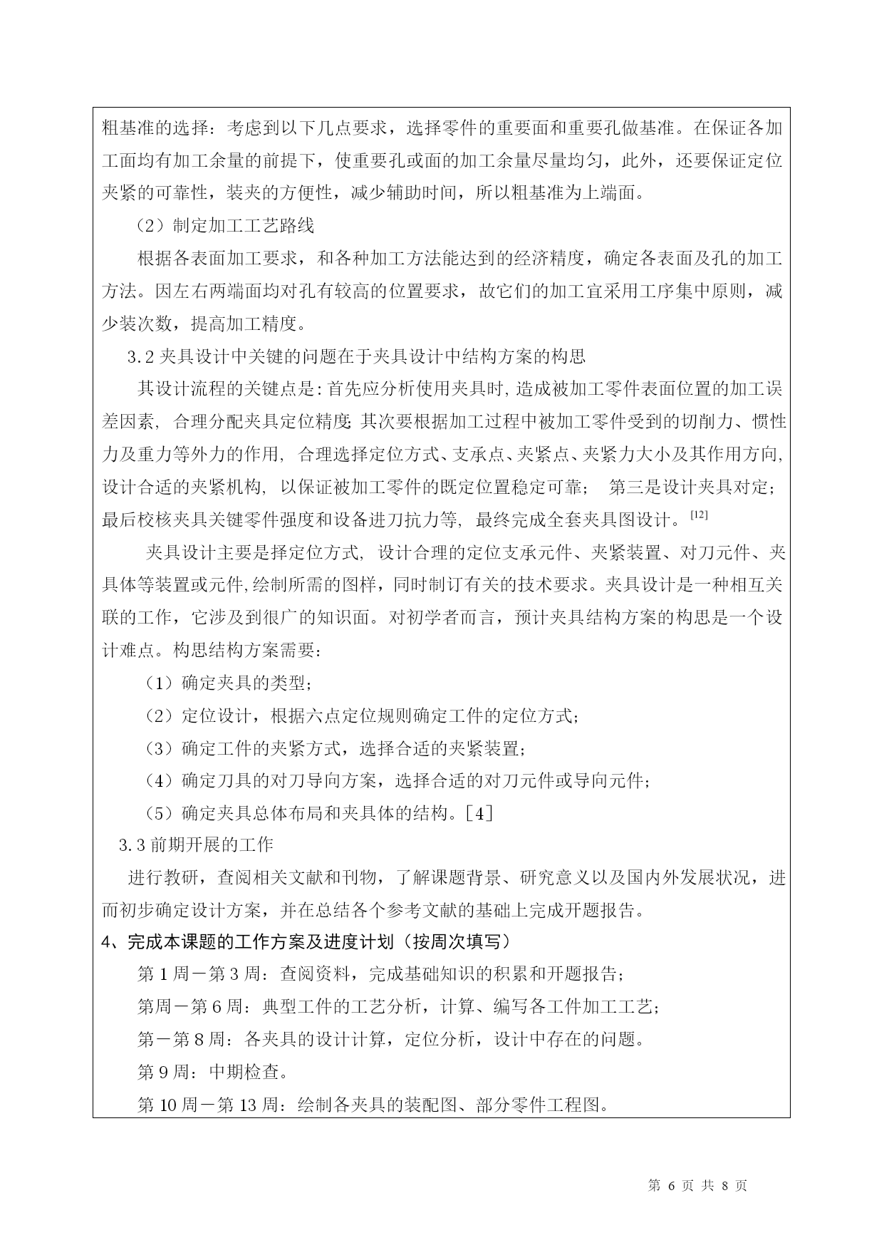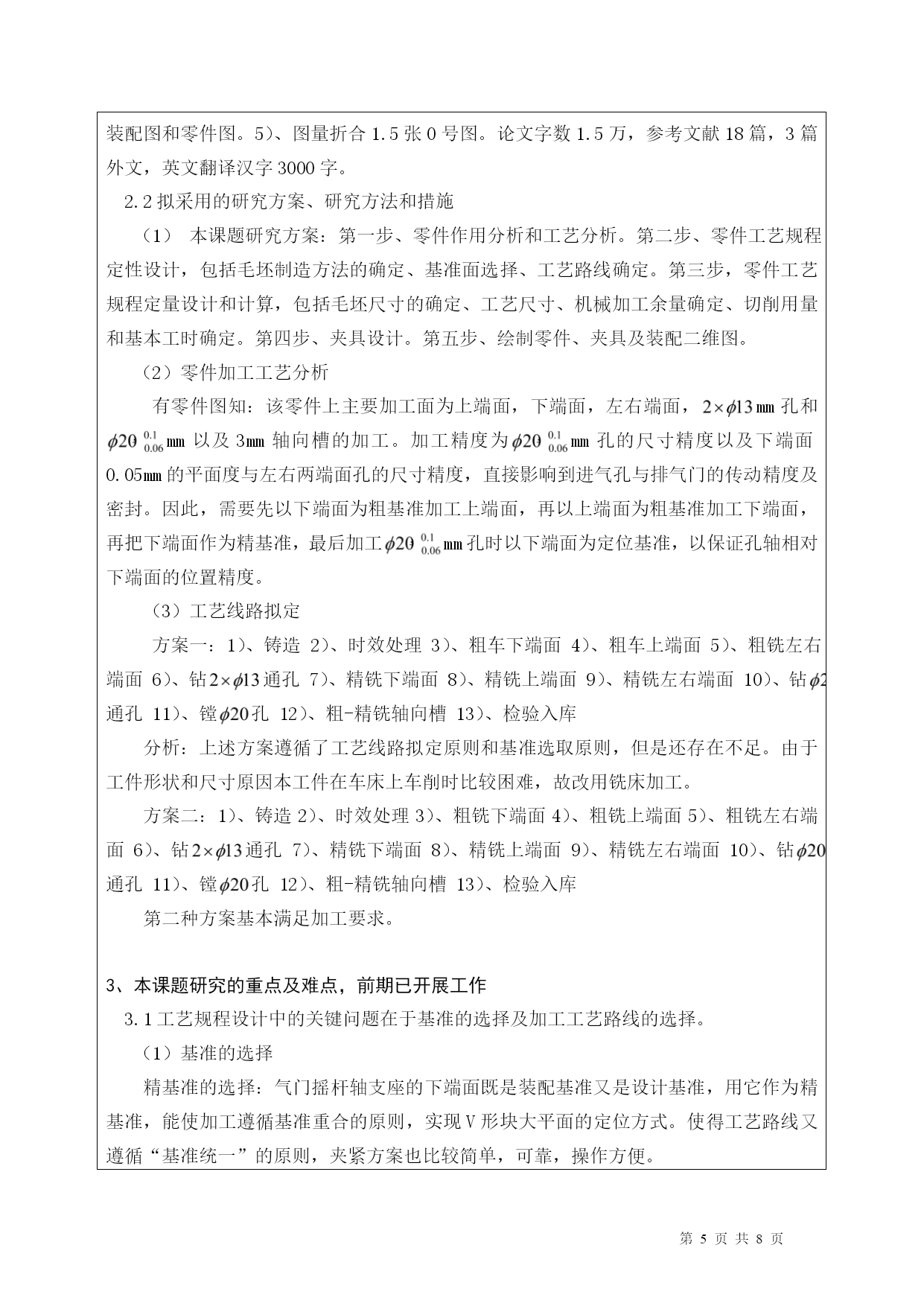 第PAGE\*MERGEFORMAT8页共NUMPAGES\*MERGEFORMAT8页毕业设计(论文)综述1.1题目背景题目背景和及研究意义制造业是一个国家的立国之本,是一个国家的民族产业和支柱产业,也是反映一个国家经济实力的重要标志,是为国家创造财富的重要产业。制造技术支持着制造业的发展,当今制造技术的发展使传统制造业革新了他原来的面目,制造工艺与夹具同样取得了较快发展。所谓工艺,是使各种原材料、半成品成为产品的方法和过程。进行机械加工工艺设计是保证产品质量、节约能源、降低成本的重要手段,是企业进行生产准备,计划调度、加工操作、生产安全、技术检测和健全劳动组织的重要依据,也是企业上品种、上质量、上水平,加速产品更新,提高经济效益的技术保证。机械零件加工精度是机械零件加工质量的核心部分。零件的加工精度是指零件完工后的实际几何参数(尺寸、形状和相互位置)对理想几何参数的符合程度,符合程度越高。机械加工工艺对加工精度的影响主要体现在加工工艺的受力变形、加工工艺的几何精度以及工艺系统的热变形三个方面。加工精度包括:尺寸精度,形状精度,位置精度。提高加工及高度的措施归纳为:减少误差法;误差补偿法(误差抵消法);误差转移法;就地加工法;误差平均法。而夹具的出现可靠地保证加工精度,提高整体工作效率,减轻劳动强度,充分发挥和扩大机床的工艺性能。机床夹具设计是工艺装备设计中的一个重要组成部分,是保证产品质量和提高劳动生产率的一项重要技术措施。在设计过程中应深人实际,进行调查研究,吸取国内外的先进技术,制定出合理的设计方案,再进行具体的设计。夹具是制造系统的重要组成部分,是机械制造中的一项重要工艺装备。工件在机床上进行加工时,为了保证加工精度和提高生产效率,必须使工件相对刀具占有正确位置,完成之一功能的辅助装置成为机床夹具。它的主要用于保证产品的加工质量、减轻劳动强度、辅助产品检测、展示、运输等。不论是传统制造,还是现代制造系统,夹具都是十分重要的。因此,好的夹具设计可以提高产品劳动生产率,保证和提高加工精度,降低生产成本等,还可以扩大机床的使用范围,从而使产品在保证精度的前提下提高效率、降低成本。当今激烈的市场竞争和企业信息化的要求,企业对夹具的设计及制造提出了更高的要求。机床夹具按其使用范围可分为以下五种基本类型:1)通用夹具通用夹具具有一定的通用性。2)专用夹具专用夹具是针对某一种工件的某一个工序而专门设计的。3)通用可调整夹具和成组夹具通用可调整夹具和成组夹具的特点是夹具的部分元件可以更换,部分装置可以调整,以适应不同零件的加工。4)组合夹具组合夹具是由一套完全标准化的元件,根据零件的加工要求拼装而成的夹具。组合夹具的适用范围可从以下不同角度来谈:从产品的批量来看,组合夹具最适于新产品研制、试制、单件和小批量生产。因此,对于产品变化频繁、该型周期短、产品类型多的企业选用组合夹具最为适宜,能收到最显著的经济效果;从加工工序来看,组合夹具应用极为广泛,它可以方便的组成各类机床使用的夹具;从加工工件的几何形状和尺寸看,组合夹具一般不受工件形状的限制。5)随行夹具随行夹是一种在自动线或柔性制造系统中使用的夹具。工件的工艺分析及夹具设计是工艺工程师必备的专业素质。这次设计使我们能综合运用了械制图学,机械设计,机械制造工程学,互换性与测量技术中的基本理论和方法独立地分析和解决工艺与夹具设计中的问题,初步具备了设计一个中等复杂程度零件(气门摇杆轴支座)的工艺规程的能力和运用夹具设计的基本原理和方法,拟订夹具设计方案,完成家具结构设计的能力,也是熟悉和运用有关手册,图表等技术资料及编写技术文件技能的一次中和性实践机会,为今后从事的工作打下良好的基础。1.2机制工艺与夹具设计相关技术的国内外现状迄今为止,夹具仍是机电产品制造中必不可缺的四大工具(刀具、夹具、量具、模具)之一。刀具量本身已高度标准化,用户只需要按品种、规格选用采购。而模具和夹具则和产品息息相关,产品一有变化就需重新制作,通常是属于专用性质的工具。模具已发展成为独立的行业;夹具在国内外也正在逐渐形成一个依附于机床业或独立的小行业,高精度与精密的通用央具有了迅莲的发,展高效通用夹具已广泛使用,适用于各类典型零件共轨特征的通用夹具有了迅速发展。现代生产要求企业制造的产品品种经常更新换代,以适应市场激烈竞争,尽管国际生产研究协会的统计表明中不批,多品种生产的工件已占工件种类数的85%左右。然而目前,一般企业习惯采用传统的专用夹具,在一个具有一定生产能力的工厂中约拥有13000~15000套专用夹具。另一方面,在多品种生产的企业中,约隔4年就要更新80%左右的专用夹具,而夹具的实际磨损量只有15%左右,特别最近年来柔性制造系统(FMS)、数控机床(NC),加工