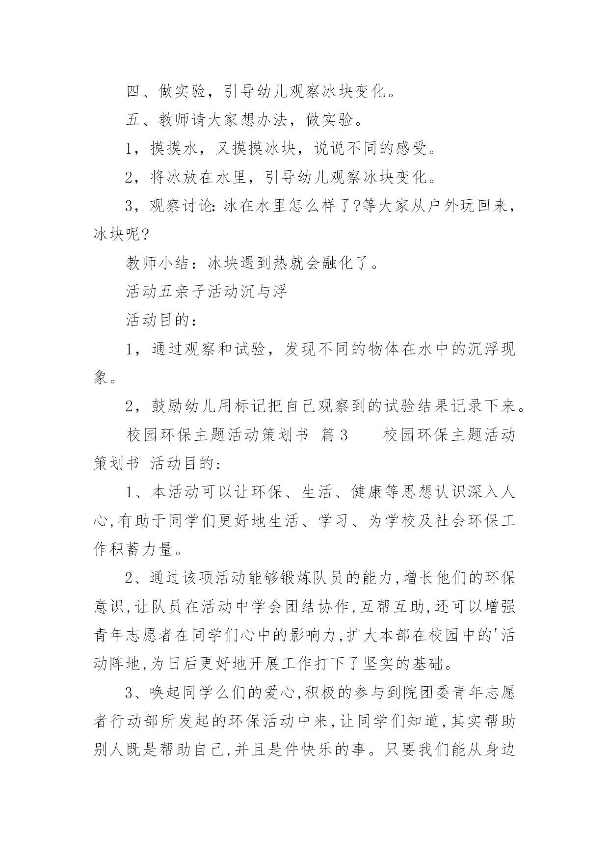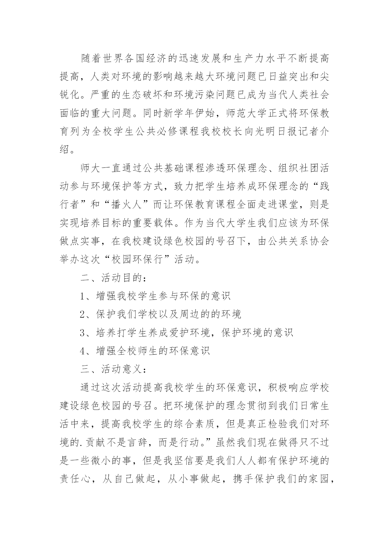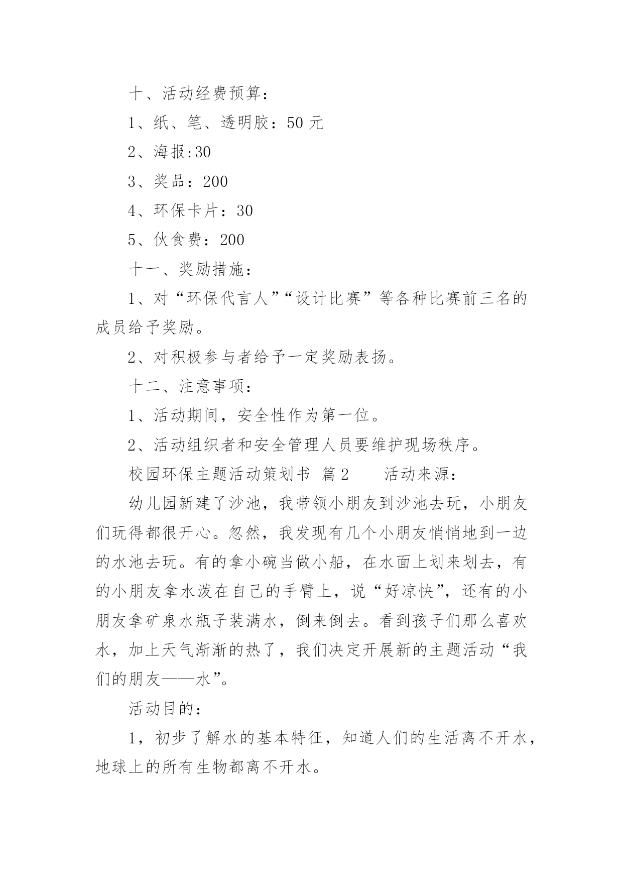 校园环保主题活动策划书校园环保主题活动策划书6篇时间过得真快,一段时间的工作已经告一段落了,我们的工作将会有更高的难度,更高的工作目标,何不赶紧趁现在写写策划书。好的策划书是什么样的呢?以下是小编收集整理的校园环保主题活动策划书,供大家参考借鉴,希望可以帮助到有需要的朋友。校园环保主题活动策划书篇1一、活动背景:地球是人类的母亲,保护环境,匹夫有责,所以我们要爱护每一片绿叶,爱护每一棵小草,爱护每一朵鲜花。爱护地球,保护环境,绿化校园,热爱学习,珍惜青春。为了营造一个“文明、卫生,健康”的校园环境,学生会记者团举办校园环保活动。二、活动目的:美化校园的环境卫生,提高学生的保护环境的'意识,提高动手能力。三、活动主题:保护环境,从我做起四、活动时间:xx年xx月五、活动地点:校园内六、活动对象:学校全体成员七、活动策划单位:校报记者团八:活动内容:1、积极为本次活动进行宣传,各个组织出版面进行宣传。2、在宣传栏进行文字宣传。3、海报宣传活动。4、举办环保活动,选举“校园环境保护代言人”。5、举办环保袋、矿泉水瓶的设计比赛。6、制作环保卡片,在活动期间分发给参加者留念。7、由学生会召开各班学生代表交流会议,了解各班代表对校园卫生的看法,提高他们对环境卫生的重视程度,深入探讨进一步改进我系的卫生工作。8、将社员分组,按小组分配任务清理校园垃圾广告。9、对校园(特别是草坪)全面清扫10、举办可回收物品收集活动,将收集可用垃圾,对可利用的垃圾再次利用处理并进行设计作品。九、活动方法:1、在学校的卫生区及花园草地内设立环保小标语、警示牌、温馨提示。2、对卫生区进行彻底清扫,并对各班进行检查。指出优缺点,相互学习,相互改进,共同提高。3、会员在校园收集到的垃圾,卖掉后作为奖品的资金。十、活动经费预算:1、纸、笔、透明胶:50元2、海报:303、奖品:2004、环保卡片:305、伙食费:200十一、奖励措施:1、对“环保代言人”“设计比赛”等各种比赛前三名的成员给予奖励。2、对积极参与者给予一定奖励表扬。十二、注意事项:1、活动期间,安全性作为第一位。2、活动组织者和安全管理人员要维护现场秩序。校园环保主题活动策划书篇2活动来源:幼儿园新建了沙池,我带领小朋友到沙池去玩,小朋友们玩得都很开心。忽然,我发现有几个小朋友悄悄地到一边的水池去玩。有的拿小碗当做小船,在水面上划来划去,有的小朋友拿水泼在自己的手臂上,说“好凉快”,还有的小朋友拿矿泉水瓶子装满水,倒来倒去。看到孩子们那么喜欢水,加上天气渐渐的热了,我们决定开展新的主题活动“我们的朋友——水”。活动目的:1,初步了解水的基本特征,知道人们的生活离不开水,地球上的所有生物都离不开水。2,激发幼儿乐于亲近水,接触水,热爱干净水环境的美好愿望。并能关注周围的水环境。3,鼓励幼儿发动身边的人一起积极参加各项水的游戏和试验。家长参与:1,在生活中寻找节约用水的方法,养成节约用水的习惯。2,和孩子一起做有关水的小试验和小游戏,发展孩子动手动脑的能力。活动方案:活动一儿歌《水》目的:1,激发幼儿对水的兴趣,知道地球上有各种各样的水。2,发展幼儿的语言表达能力。准备:根据儿歌内容准备相关的图片过程:1,完整的欣赏儿歌《水》小小的水是泪水,大大的水是海水,跳舞的水是喷泉,健康的水是汗水,浑浑的水是泥水,静静的水是湖水,甜甜的水西瓜水,喷涌的水自来水。观察图片并讨论,图片上有什么?他们是什么样的?3,看图帮助幼儿理解儿歌,学习儿歌。4,学习编儿歌,并引发幼儿思考,你还看到什么样的水?他们是什么水?5,小结,结束。活动记录:幼儿很喜欢这首关于水的儿歌,并大声的念儿歌。在创编儿歌的过程中,还启发幼儿仿编内容组合成一首新儿歌。例如:“甜甜的水是苹果水,苦苦的水是药水,香香的水是香水,我擦的水是宝宝金水,晚上我喝的是牛奶水,最怕医生吊盐水。”活动二生活游戏:喝水目标:1让幼儿了解不喝水的危害。2引导幼儿知道排队接水,不拥挤。准备:水杯人手一个、饮用水、画有裂嘴唇的图片。过程:1集体饮水前,教师出示画裂口嘴唇的图片,并讲故事《小嘴唇裂口了》。讨论:口渴了怎么办?要怎样接水?一次要喝多少水才够?2老师和个别幼儿表演排队接水,引导幼儿分组喝水时不拥挤。接完水后,双手拿水杯回座位,防止水洒到地上。3幼儿分组接水饮。4为幼儿制作喝水记录表,提醒幼儿喝水之后在记录表里做个记号。鼓励幼儿多喝水。活动三:科学活动——水娃娃的魔术活动目标:1、尝试运用多种感官初步感知:糖、奶粉、果珍粉能溶化在水里,感受水的“变化”现象。2、能将自己在活动中的发现大胆地表述出来。3、愿意参与实验活动,对科学实验有兴趣。准备:1、一杯糖水,标记指示图,磁铁板一块2、装有温开水的饮水桶奶粉、果珍、白糖若干盘,小勺、水杯人手一个,盖布四块。过程:一、观