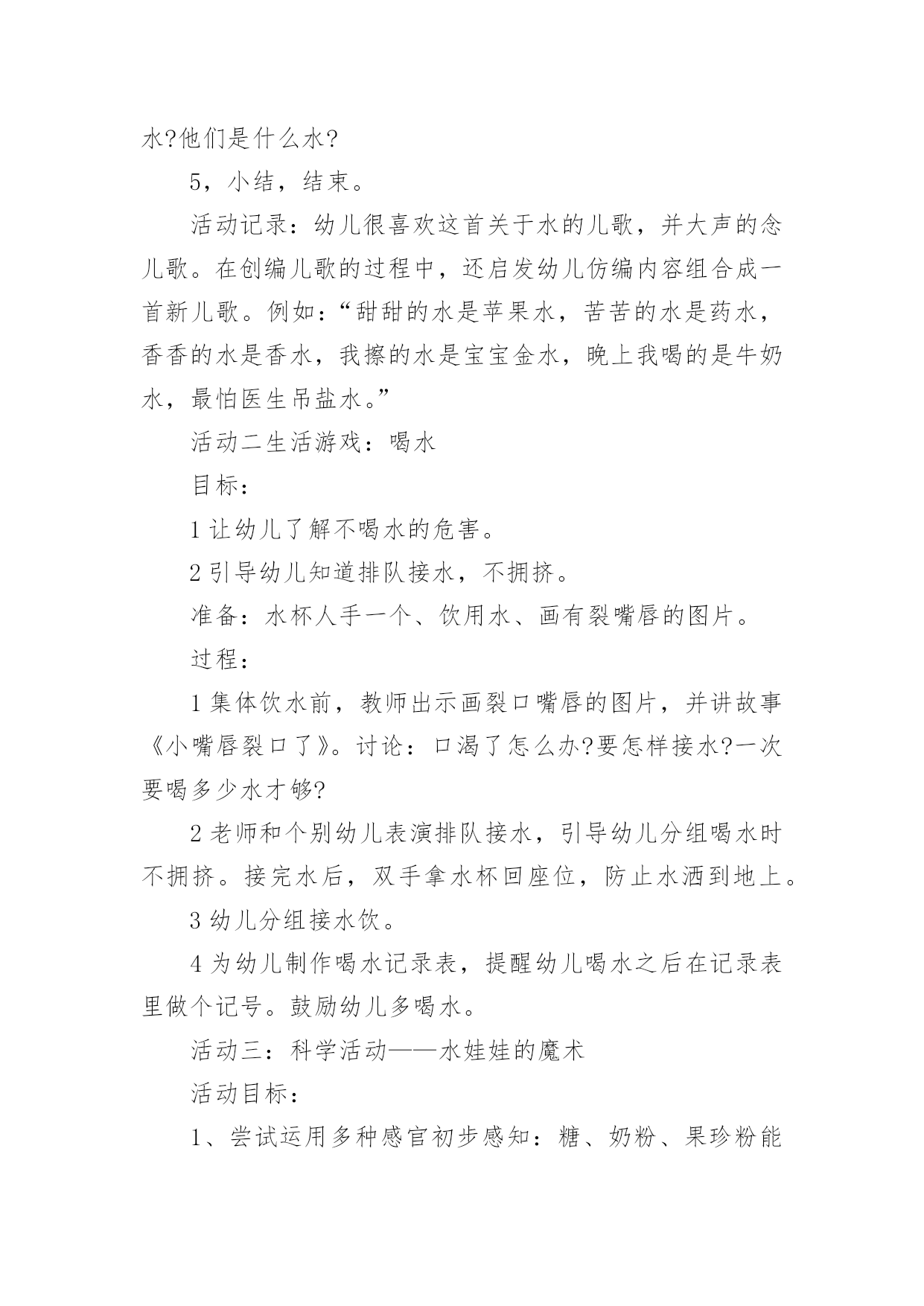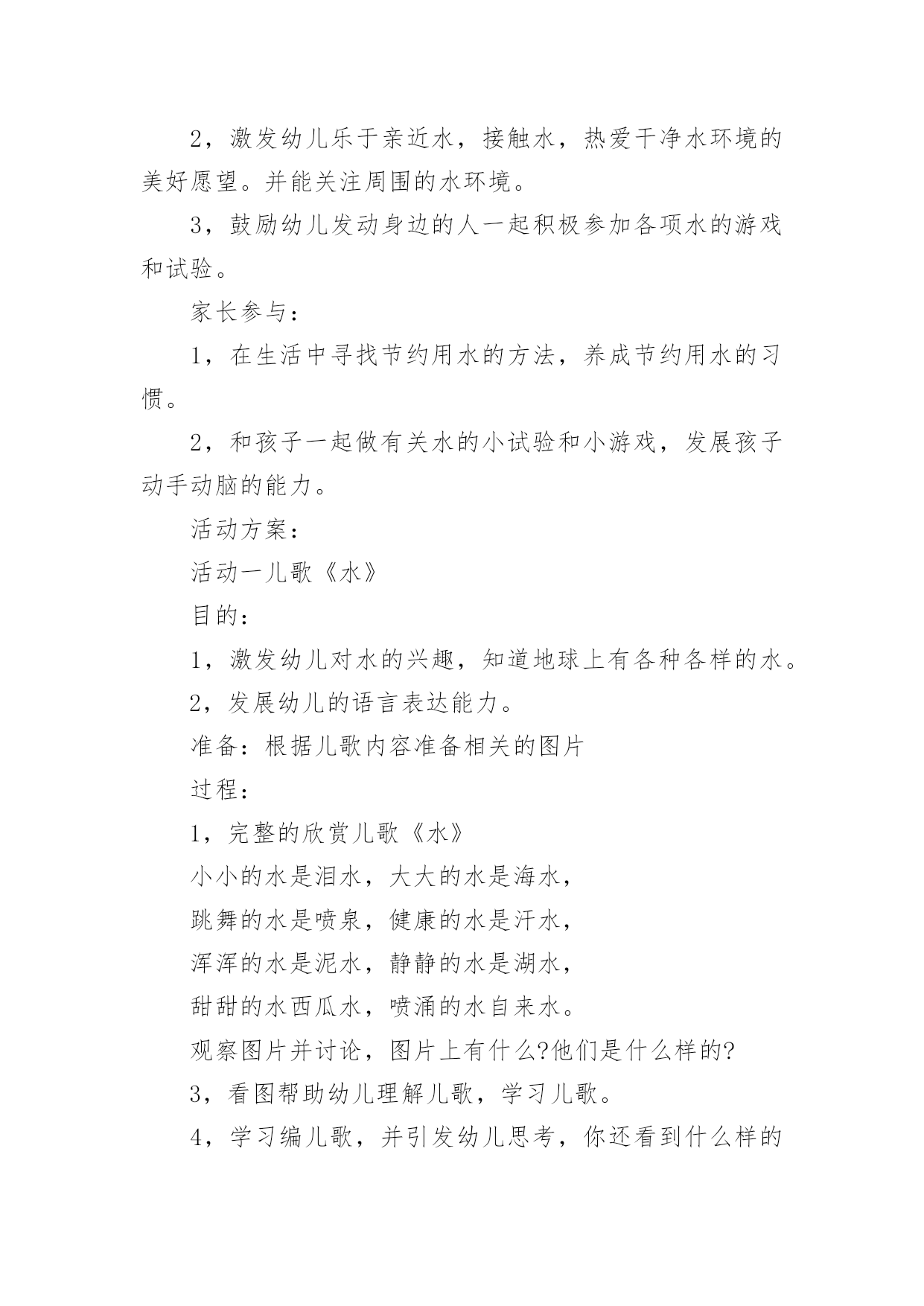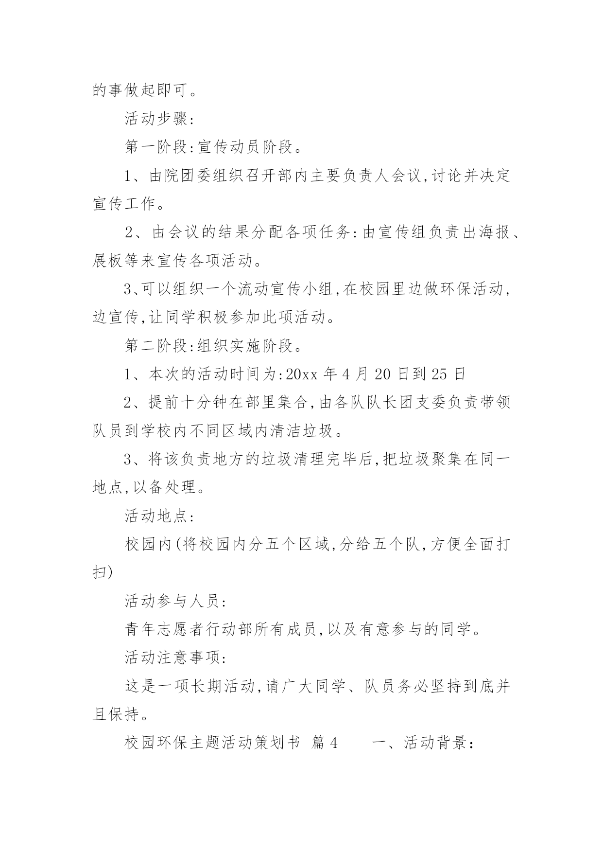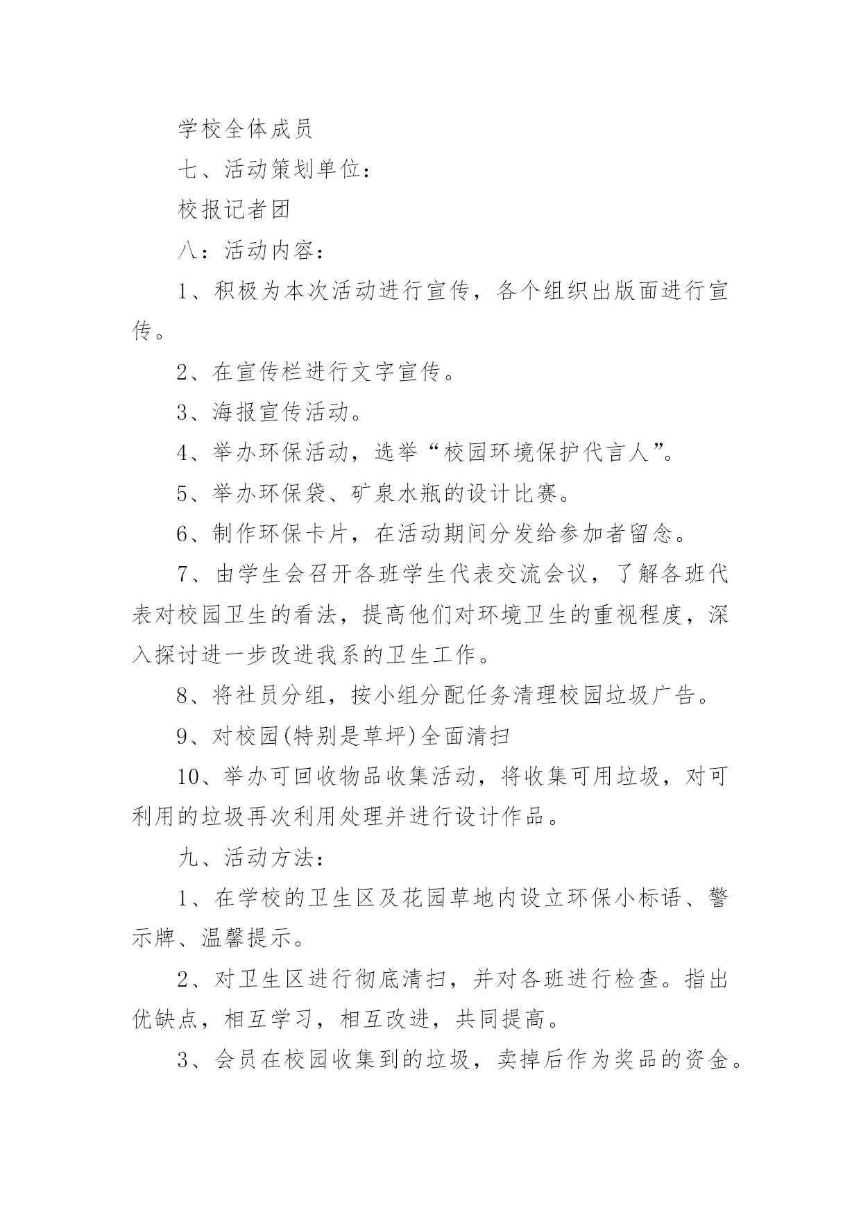 校园环保主题活动策划书校园环保主题活动策划书6篇时间过得真快,一段时间的工作已经告一段落了,我们的工作将会有更高的难度,更高的工作目标,何不赶紧趁现在写写策划书。好的策划书是什么样的呢?以下是小编收集整理的校园环保主题活动策划书,供大家参考借鉴,希望可以帮助到有需要的朋友。校园环保主题活动策划书篇1一、活动背景:地球是人类的母亲,保护环境,匹夫有责,所以我们要爱护每一片绿叶,爱护每一棵小草,爱护每一朵鲜花。爱护地球,保护环境,绿化校园,热爱学习,珍惜青春。为了营造一个“文明、卫生,健康”的校园环境,学生会记者团举办校园环保活动。二、活动目的:美化校园的环境卫生,提高学生的保护环境的'意识,提高动手能力。三、活动主题:保护环境,从我做起四、活动时间:xx年xx月五、活动地点:校园内六、活动对象:学校全体成员七、活动策划单位:校报记者团八:活动内容:1、积极为本次活动进行宣传,各个组织出版面进行宣传。2、在宣传栏进行文字宣传。3、海报宣传活动。4、举办环保活动,选举“校园环境保护代言人”。5、举办环保袋、矿泉水瓶的设计比赛。6、制作环保卡片,在活动期间分发给参加者留念。7、由学生会召开各班学生代表交流会议,了解各班代表对校园卫生的看法,提高他们对环境卫生的重视程度,深入探讨进一步改进我系的卫生工作。8、将社员分组,按小组分配任务清理校园垃圾广告。9、对校园(特别是草坪)全面清扫10、举办可回收物品收集活动,将收集可用垃圾,对可利用的垃圾再次利用处理并进行设计作品。九、活动方法:1、在学校的卫生区及花园草地内设立环保小标语、警示牌、温馨提示。2、对卫生区进行彻底清扫,并对各班进行检查。指出优缺点,相互学习,相互改进,共同提高。3、会员在校园收集到的垃圾,卖掉后作为奖品的资金。十、活动经费预算:1、纸、笔、透明胶:50元2、海报:303、奖品:2004、环保卡片:305、伙食费:200十一、奖励措施:1、对“环保代言人”“设计比赛”等各种比赛前三名的成员给予奖励。2、对积极参与者给予一定奖励表扬。十二、注意事项:1、活动期间,安全性作为第一位。2、活动组织者和安全管理人员要维护现场秩序。校园环保主题活动策划书篇2活动来源:幼儿园新建了沙池,我带领小朋友到沙池去玩,小朋友们玩得都很开心。忽然,我发现有几个小朋友悄悄地到一边的水池去玩。有的拿小碗当做小船,在水面上划来划去,有的小朋友拿水泼在自己的手臂上,说“好凉快”,还有的小朋友拿矿泉水瓶子装满水,倒来倒去。看到孩子们那么喜欢水,加上天气渐渐的热了,我们决定开展新的主题活动“我们的朋友——水”。活动目的:1,初步了解水的基本特征,知道人们的生活离不开水,地球上的所有生物都离不开水。2,激发幼儿乐于亲近水,接触水,热爱干净水环境的美好愿望。并能关注周围的水环境。3,鼓励幼儿发动身边的人一起积极参加各项水的游戏和试验。家长参与:1,在生活中寻找节约用水的方法,养成节约用水的习惯。2,和孩子一起做有关水的小试验和小游戏,发展孩子动手动脑的能力。活动方案:活动一儿歌《水》目的:1,激发幼儿对水的兴趣,知道地球上有各种各样的水。2,发展幼儿的语言表达能力。准备:根据儿歌内容准备相关的图片过程:1,完整的欣赏儿歌《水》小小的水是泪水,大大的水是海水,跳舞的水是喷泉,健康的水是汗水,浑浑的水是泥水,静静的水是湖水,甜甜的水西瓜水,喷涌的水自来水。观察图片并讨论,图片上有什么?他们是什么样的?3,看图帮助幼儿理解儿歌,学习儿歌。4,学习编儿歌,并引发幼儿思考,你还看到什么样的水?他们是什么水?5,小结,结束。活动记录:幼儿很喜欢这首关于水的儿歌,并大声的念儿歌。在创编儿歌的过程中,还启发幼儿仿编内容组合成一首新儿歌。例如:“甜甜的水是苹果水,苦苦的水是药水,香香的水是香水,我擦的水是宝宝金水,晚上我喝的是牛奶水,最怕医生吊盐水。”活动二生活游戏:喝水目标:1让幼儿了解不喝水的危害。2引导幼儿知道排队接水,不拥挤。准备:水杯人手一个、饮用水、画有裂嘴唇的图片。过程:1集体饮水前,教师出示画裂口嘴唇的图片,并讲故事《小嘴唇裂口了》。讨论:口渴了怎么办?要怎样接水?一次要喝多少水才够?2老师和个别幼儿表演排队接水,引导幼儿分组喝水时不拥挤。接完水后,双手拿水杯回座位,防止水洒到地上。3幼儿分组接水饮。4为幼儿制作喝水记录表,提醒幼儿喝水之后在记录表里做个记号。鼓励幼儿多喝水。活动三:科学活动——水娃娃的魔术活动目标:1、尝试运用多种感官初步感知:糖、奶粉、果珍粉能溶化在水里,感受水的“变化”现象。2、能将自己在活动中的发现大胆地表述出来。3、愿意参与实验活动,对科学实验有兴趣。准备:1、一杯糖水,标记指示图,磁铁板一块2、装有温开水的饮水桶奶粉、果珍、白糖若干盘,小勺、水杯人手一个,盖布四块。过程:一、观