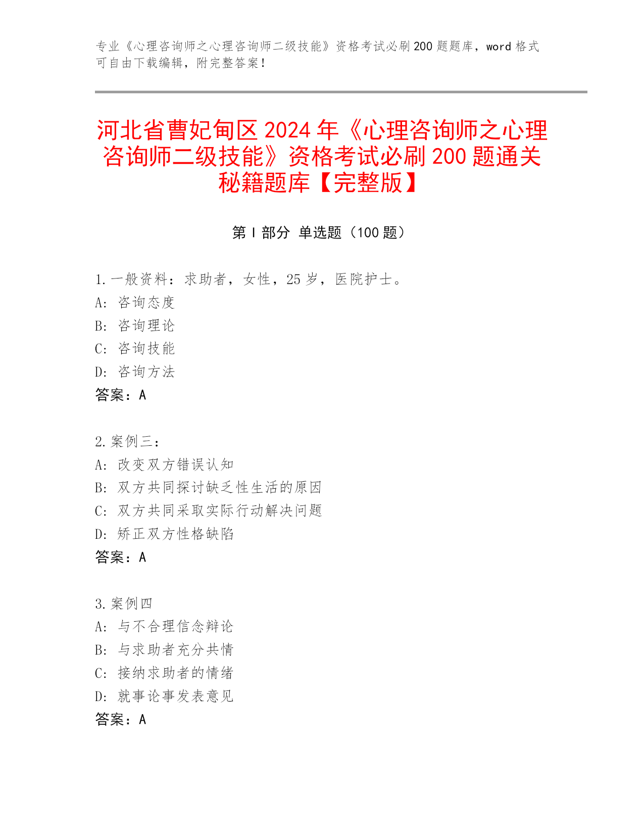 河北省曹妃甸区2024年《心理咨询师之心理咨询师二级技能》资格考试必刷200题通关秘籍题库【完整版】