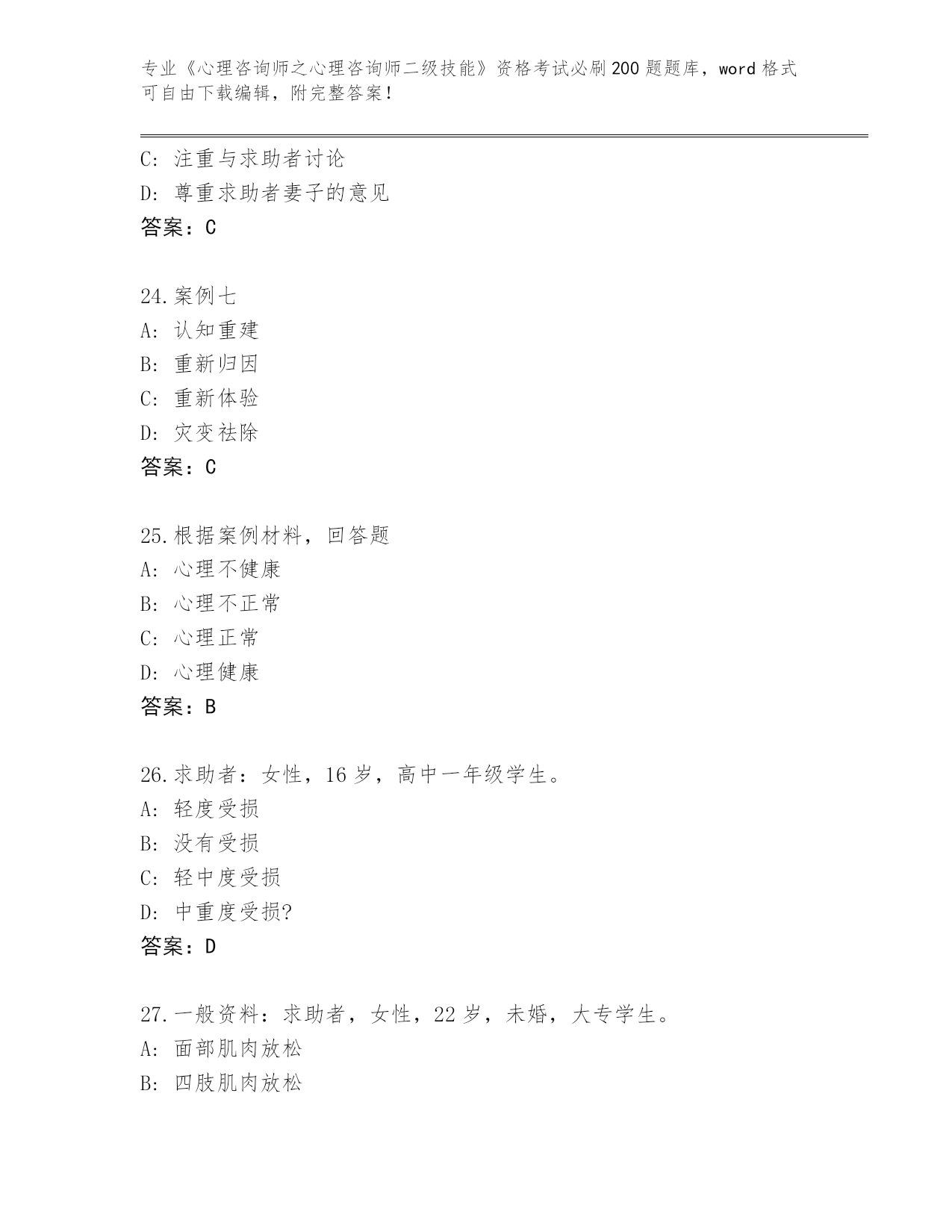 河北省曹妃甸区2024年《心理咨询师之心理咨询师二级技能》考试必刷200题完整版答案下载