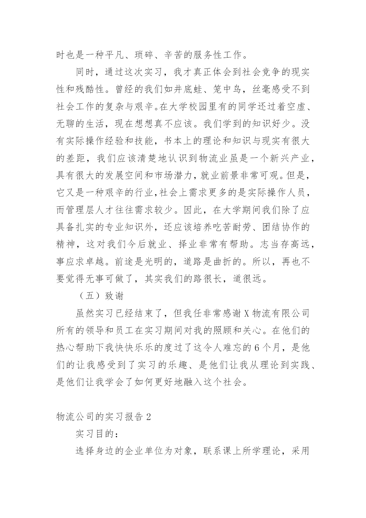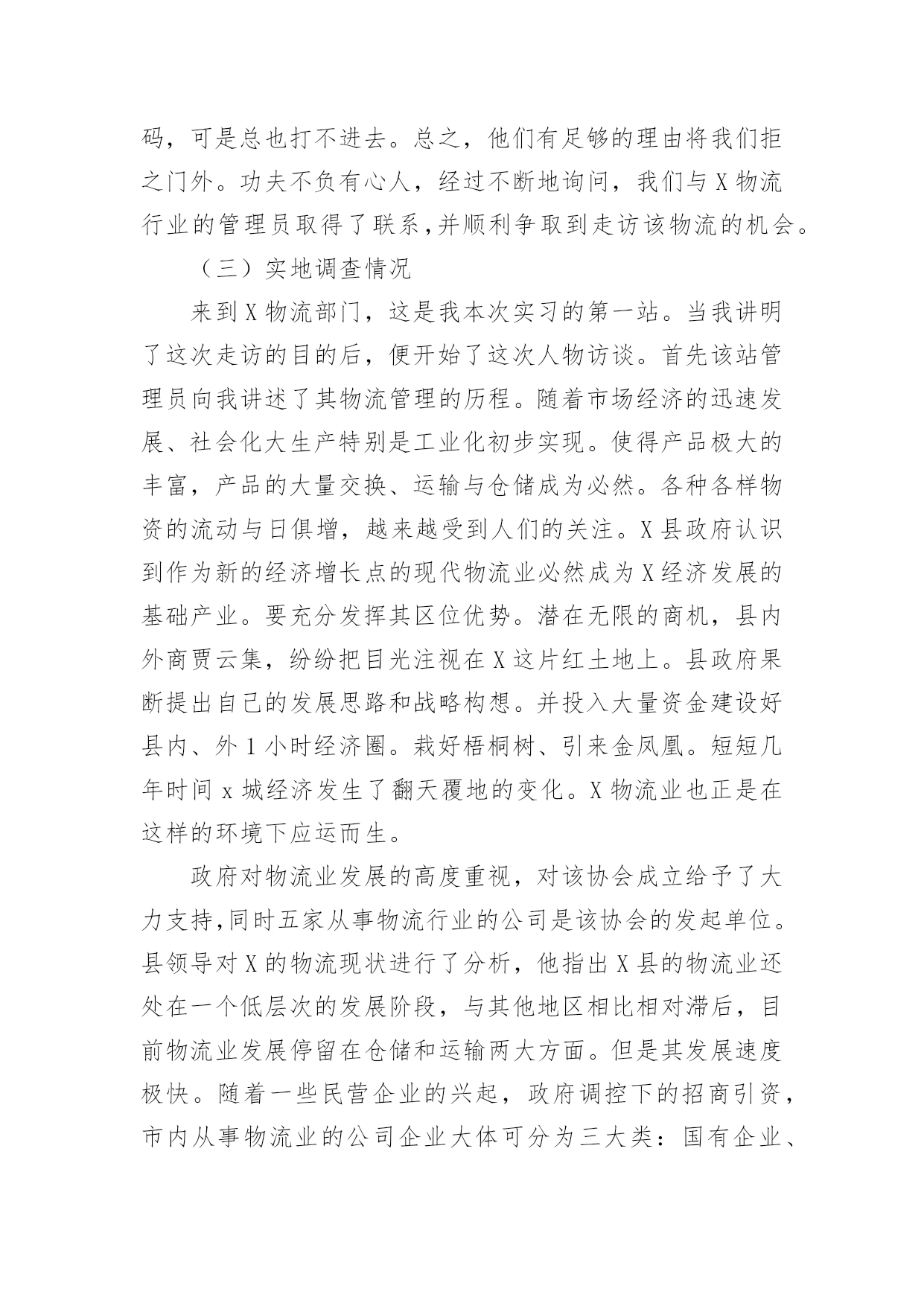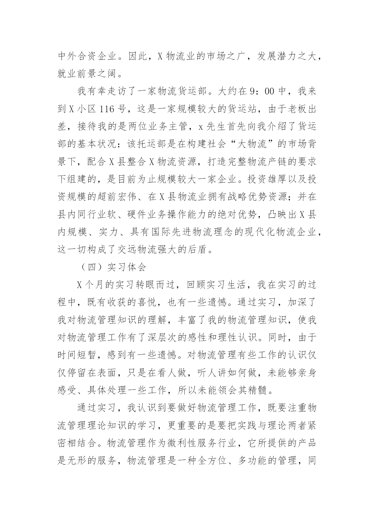 物流公司的实习报告我们眼下的社会,我们都不可避免地要接触到报告,报告中涉及到专业性术语要解释清楚。那么,报告到底怎么写才合适呢?以下是小编精心整理的物流公司的实习报告,欢迎大家借鉴与参考,希望对大家有所帮助。物流公司的实习报告1一、实习目的:选择身边的企业单位为对象,联系课上所学理论,采用实地考察跟踪其物流全过程的方法,对盛和物流业发展现状进行初步了解。培养实际调研能力,尝试检验所学知识,并从实际中进一步学习了解物流的内涵与外延。二、实习方式:采用实地调研的方式,具体采用了面对面的访谈了解、过程跟踪调查和侧面行为观察的方式。出动全组成员合理分工,每人负责不同侧面的内容,协同合作,调查后集体讨论分析,并总结实习报告。三、实习时间:四、实习地点:X有限公司五、实习步骤:(一)前期准备工作1、到X物流公司报道。2、在X物流公司,听取物流管理的意见,并拟定实习方式、调查对象。3、通过登录网站、查阅报纸、杂志等方式寻找调查对象,并争取专业物流公司或单位的支持和协助。到系办公室开介绍信。4、准备数码相机、笔记本等实习所需物品。(二)开展实习活动1、走访X县物流行业。2、参观、调查X物流公司。3、走访X物流部门。4、开展具体物流管理工作。(三)后期总结工作收集并整理资料,对物流情况分析并定稿。六、实习内容:(一)实习准备工作我在明确了这次实习的目的、方法及注意事项后。从摄影、记录、财务、安全保障、撰稿方面进行了详细的部署,确定了实习方式、调查对象,并拟定实习计划。(二)走访调查物流部门寻找调查对象,通过登录网站、查阅报纸、杂志等方式寻找专业物流公司,在X物流网上我们搜到几家物流公司,但当我们致电争取公司支持和协助时,却一次次遭到拒绝和打击。其中有的公司很干脆:没时间接待;有的单位老总出差,没人可以做主接待我们;有的要申请总经理的同意,可是就没了答复;还有的是我千辛万苦找到一家老总的手机号码,可是总也打不进去。总之,他们有足够的理由将我们拒之门外。功夫不负有心人,经过不断地询问,我们与X物流行业的管理员取得了联系,并顺利争取到走访该物流的机会。(三)实地调查情况来到X物流部门,这是我本次实习的第一站。当我讲明了这次走访的目的后,便开始了这次人物访谈。首先该站管理员向我讲述了其物流管理的历程。随着市场经济的迅速发展、社会化大生产特别是工业化初步实现。使得产品极大的丰富,产品的大量交换、运输与仓储成为必然。各种各样物资的流动与日俱增,越来越受到人们的关注。X县政府认识到作为新的经济增长点的现代物流业必然成为X经济发展的基础产业。要充分发挥其区位优势。潜在无限的商机,县内外商贾云集,纷纷把目光注视在X这片红土地上。县政府果断提出自己的发展思路和战略构想。并投入大量资金建设好县内、外1小时经济圈。栽好梧桐树、引来金凤凰。短短几年时间x城经济发生了翻天覆地的变化。X物流业也正是在这样的环境下应运而生。政府对物流业发展的高度重视,对该协会成立给予了大力支持,同时五家从事物流行业的公司是该协会的发起单位。县领导对X的物流现状进行了分析,他指出X县的物流业还处在一个低层次的发展阶段,与其他地区相比相对滞后,目前物流业发展停留在仓储和运输两大方面。但是其发展速度极快。随着一些民营企业的兴起,政府调控下的招商引资,市内从事物流业的公司企业大体可分为三大类:国有企业、中外合资企业。因此,X物流业的市场之广,发展潜力之大,就业前景之阔。我有幸走访了一家物流货运部。大约在9:00中,我来到X小区116号,这是一家规模较大的货运站,由于老板出差,接待我的是两位业务主管,x先生首先向我介绍了货运部的基本状况:该托运部是在构建社会“大物流”的市场背景下,配合X县整合X物流资源,打造完整物流产链的要求下组建的,是目前为止规模较大一家企业。投资雄厚以及投资规模的超前宏伟、在X县物流业拥有战略优势资源;并在县内同行业软、硬件业务操作能力的绝对优势,凸映出X县内规模、实力、具有国际先进物流理念的现代化物流企业,这一切构成了交远物流强大的后盾。(四)实习体会X个月的实习转眼而过,回顾实习生活,我在实习的过程中,既有收获的喜悦,也有一些遗憾。通过实习,加深了我对物流管理知识的理解,丰富了我的物流管理知识,使我对物流管理工作有了深层次的感性和理性认识。同时,由于时间短暂,感到有一些遗憾。对物流管理有些工作的认识仅仅停留在表面,只是在看人做,听人讲如何做,未能够亲身感受、具体处理一些工作,所以未能领会其精髓。通过实习,我认识到要做好物流管理工作,既要注重物流管理理论知识的学习,更重要的是要把实践与理论两者紧密相结合。物流管理作为微利性服务行业,它所提供的产品是无形的服务,物流管理是一种全方位、多功能的管理,同时也是一种平凡、琐碎、辛苦的服务性工作。同时,通过这次实习,我才真正体会到社会
