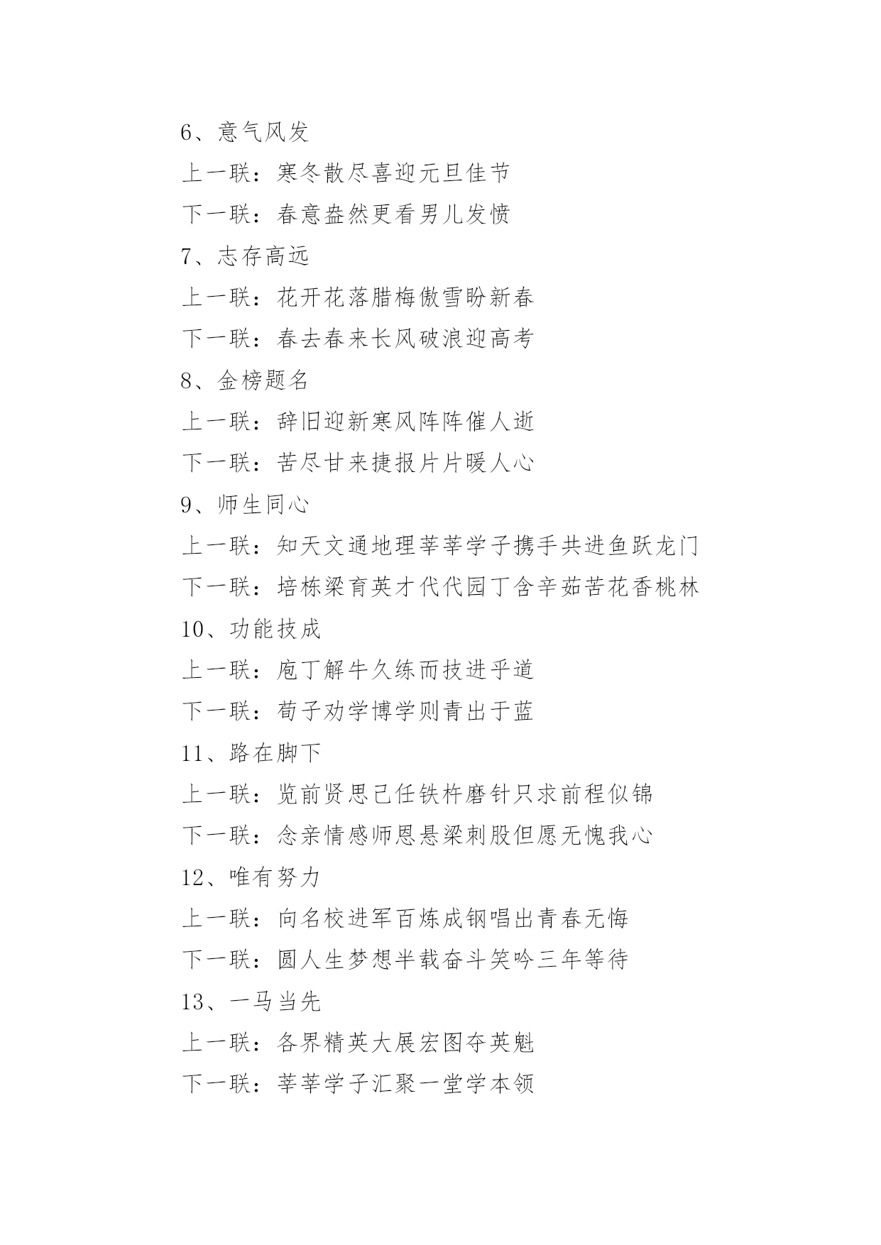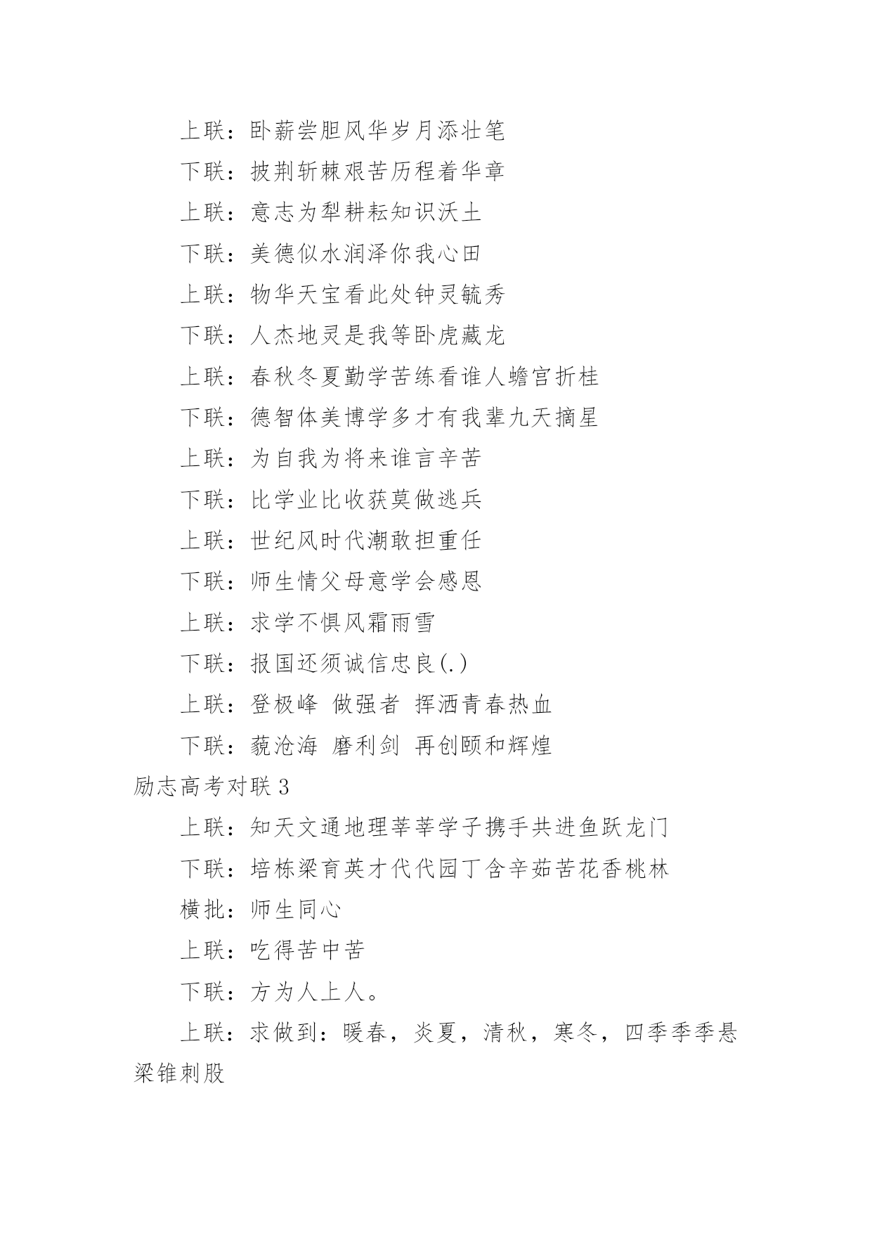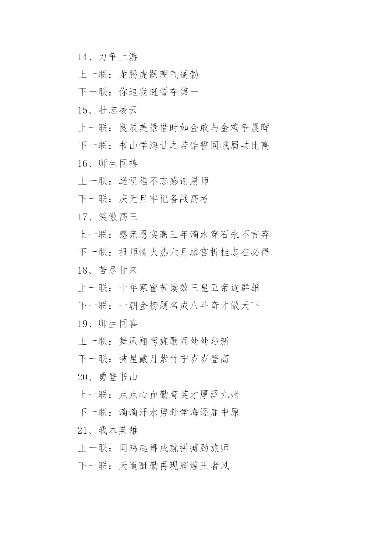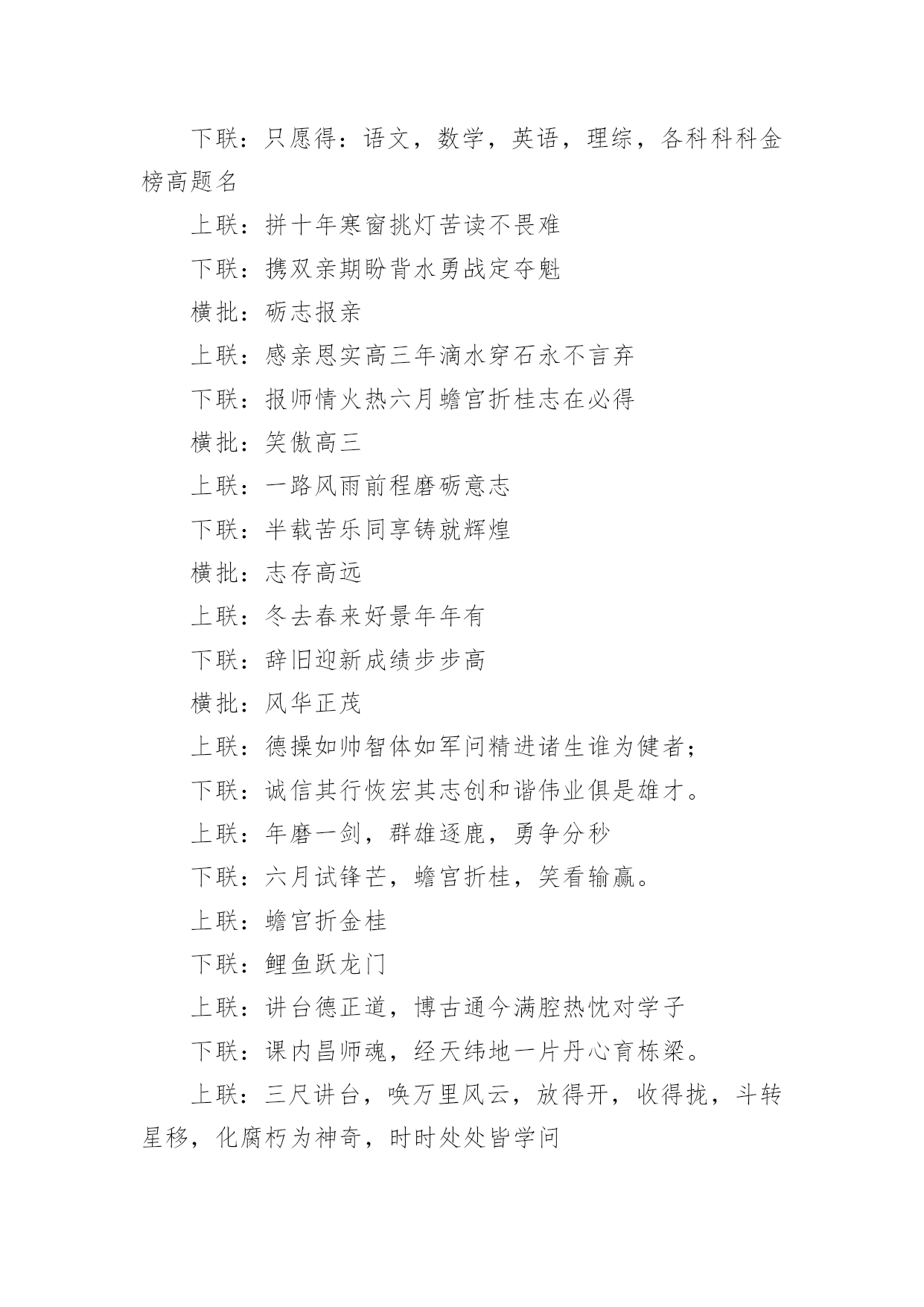 励志高考对联励志高考对联15篇在平平淡淡的.日常中,大家都知道一些经典的对联吧,对联在自身发展过程中,又吸收了古体诗、散文、词曲等的特点。那么如何把对联写出新花样呢?下面是小编为大家收集的励志高考对联,欢迎阅读与收藏。励志高考对联11、众志成城上一联:卧虎藏龙地豪气干云秣马砺兵锋芒尽露下一联:披星戴月时书香盈耳含英咀华学业必成2、砺志报亲上一联:拼十年寒窗挑灯苦读不畏难下一联:携双亲期盼背水勇战定夺魁3、笑书人生上一联:滴水穿石战高考如歌岁月应无悔下一联:乘风破浪展雄才折桂蟾宫当有时4、意气风发上一联:时光如梭看我少年学子六月追风去下一联:云帆直挂令那美丽人生明朝入眼来5、风华正茂上一联:冬去春来好景年年有下一联:辞旧迎新成绩步步高6、意气风发上一联:寒冬散尽喜迎元旦佳节下一联:春意盎然更看男儿发愤7、志存高远上一联:花开花落腊梅傲雪盼新春下一联:春去春来长风破浪迎高考8、金榜题名上一联:辞旧迎新寒风阵阵催人逝下一联:苦尽甘来捷报片片暖人心9、师生同心上一联:知天文通地理莘莘学子携手共进鱼跃龙门下一联:培栋梁育英才代代园丁含辛茹苦花香桃林10、功能技成上一联:庖丁解牛久练而技进乎道下一联:荀子劝学博学则青出于蓝11、路在脚下上一联:览前贤思己任铁杵磨针只求前程似锦下一联:念亲情感师恩悬梁刺股但愿无愧我心12、唯有努力上一联:向名校进军百炼成钢唱出青春无悔下一联:圆人生梦想半载奋斗笑吟三年等待13、一马当先上一联:各界精英大展宏图夺英魁下一联:莘莘学子汇聚一堂学本领14、力争上游上一联:龙腾虎跃朝气蓬勃下一联:你追我赶誓夺第一15、壮志凌云上一联:良辰美景惜时如金敢与金鸡争晨晖下一联:书山学海甘之若饴誓同峨眉共比高16、师生同禧上一联:送祝福不忘感谢恩师下一联:庆元旦牢记备战高考17、笑傲高三上一联:感亲恩实高三年滴水穿石永不言弃下一联:报师情火热六月蟾宫折桂志在必得18、苦尽甘来上一联:十年寒窗苦读效三皇五帝逐群雄下一联:一朝金榜题名成八斗奇才傲天下19、师生同喜上一联:舞风翔鸾旌歌闹处处迎新下一联:披星戴月紫竹宁岁岁登高20、勇登书山上一联:点点心血勤育英才厚泽九州下一联:滴滴汗水勇赴学海逐鹿中原21、我本英雄上一联:闻鸡起舞成就拼搏劲旅师下一联:天道酬勤再现辉煌王者风22、舍我其谁上一联:群雄逐鹿鹿死谁手尚待一朝试锋芒下一联:万木争春春在何处但将今夕放眼量23、天南海北上一联:十年苦读一朝决胜负换来笑逐颜开下一联:数载艰辛六月定乾坤赢得似锦前程24、奋发图强上一联:自强不息怀壮志以长行下一联:厚德载物携梦想而抚凌25、向名校进军上一联:送报晓金鸡看今年硕果飘香迎佳绩下一联:迎吉祥犬吠待明朝笑傲高考创辉煌26、乐在其中上一联:梅花香自苦寒来下一联:熬头喜在汗水中27、备战高考上一联:六十同窗同甘共苦拼搏从此时下一联:十二春秋风雨兼程成败在今年28、美梦成真上一联:怀揣大学美梦迎接新年号角下一联:彰显青春活力挥洒苦涩汗水29、自强不息上一联:辞乙酉难忘闻鸡起舞下一联:迎丙戌仍需刺股悬梁30、壮志雄心上一联:胆性卓然骨硬志坚不留乌江之憾下一联:风华正茂豪气冲天应建定鼎之功31、前程似锦上一联:勇攀书山甘洒汗水放飞心中梦想下一联:泛游学海竞逐群雄一朝金榜题名32、志存高远上一联:一路风雨前程磨砺意志下一联:半载苦乐同享铸就辉煌励志高考对联2上联:一卷诗书满腹才华试问天下谁为王者下联:万丈豪情千秋伟业敢对苍穹我是英雄上联:燕赵多壮士十年铸剑肯盼明朝建功业下联:颐和有雄才一心读书力争大考展宏图上联:携一缕春风伴一窗明月颐和苦读当属我下联:抱万种情思翔万里云天华夏风流要争先上联:难也易也苦也乐也人人奋勇精神健下联:强者弱者进者退者日日攻坚斗志高上联:青春多壮志鹏程万里登绝顶下联:人生需奋斗翱翔九霄击云端上联:励志笃学求古今智慧下联:厚德敦行做中华栋梁上联:学无止境何处是境下联:生逢其时贵在惜时上联:卧薪尝胆风华岁月添壮笔下联:披荆斩棘艰苦历程着华章上联:意志为犁耕耘知识沃土下联:美德似水润泽你我心田上联:物华天宝看此处钟灵毓秀下联:人杰地灵是我等卧虎藏龙上联:春秋冬夏勤学苦练看谁人蟾宫折桂下联:德智体美博学多才有我辈九天摘星上联:为自我为将来谁言辛苦下联:比学业比收获莫做逃兵上联:世纪风时代潮敢担重任下联:师生情父母意学会感恩上联:求学不惧风霜雨雪下联:报国还须诚信忠良(.)上联:登极峰做强者挥洒青春热血下联:藐沧海磨利剑再创颐和辉煌励志高考对联3上联:知天文通地理莘莘学子携手共进鱼跃龙门下联:培栋梁育英才代代园丁含辛茹苦花香桃林横批:师生同心上联:吃得苦中苦下联:方为人上人。上联:求做到:暖春,炎夏,清秋,寒冬,四季季季悬梁锥刺股下联:只愿得:语文,数学,英语,理综,各科科科金榜高题名上联:拼十年寒窗挑灯苦读不畏难下联:携双亲期盼