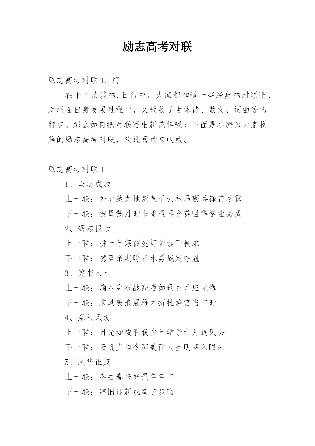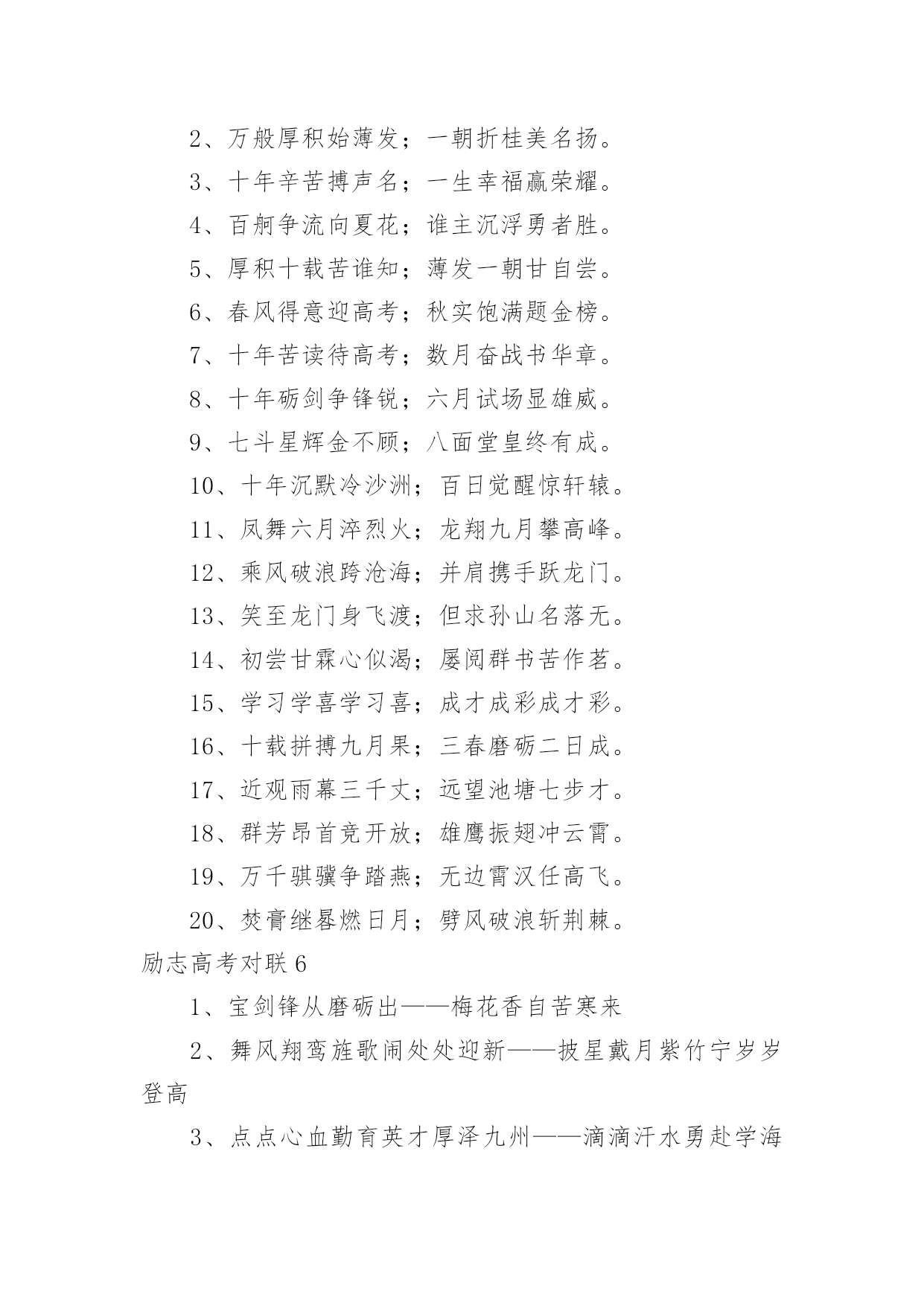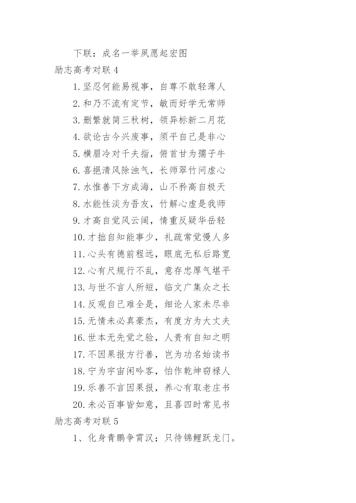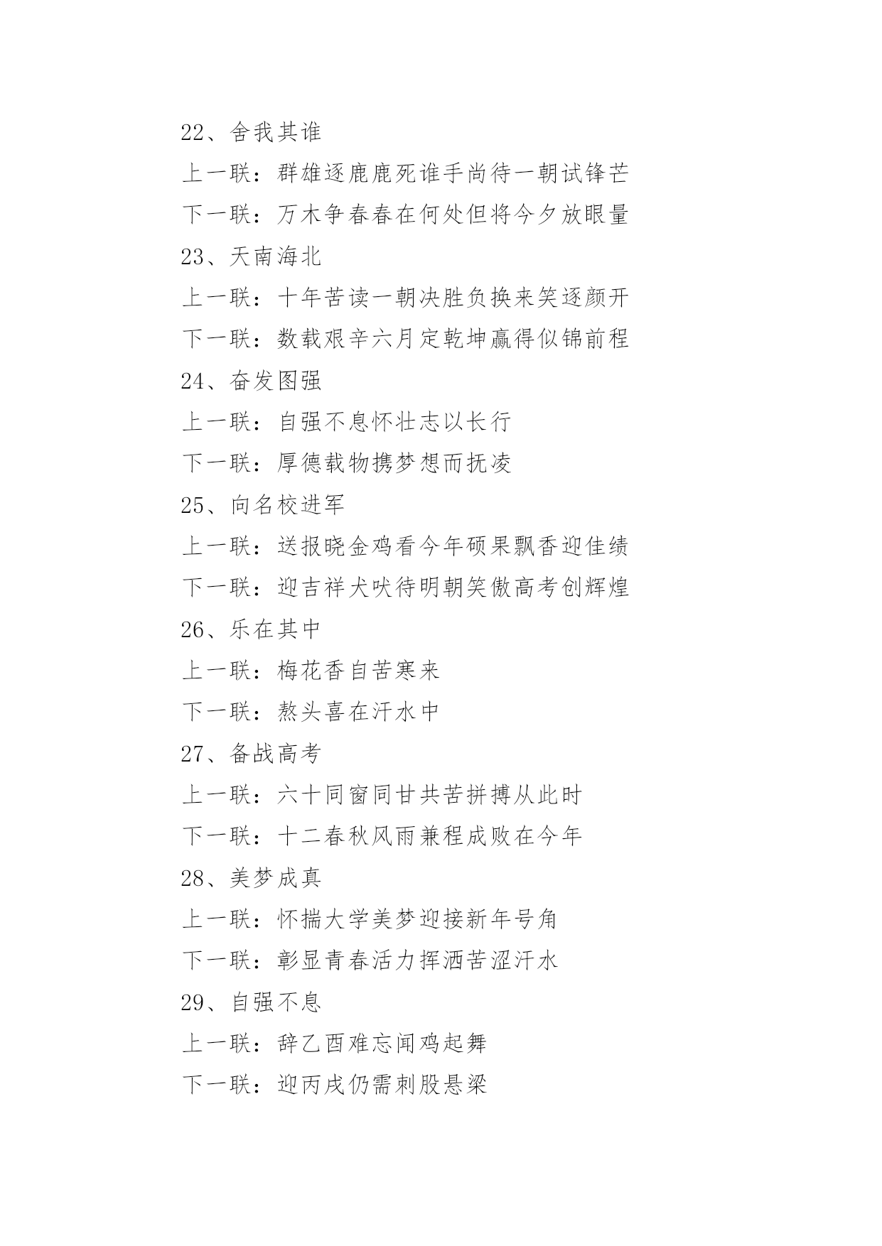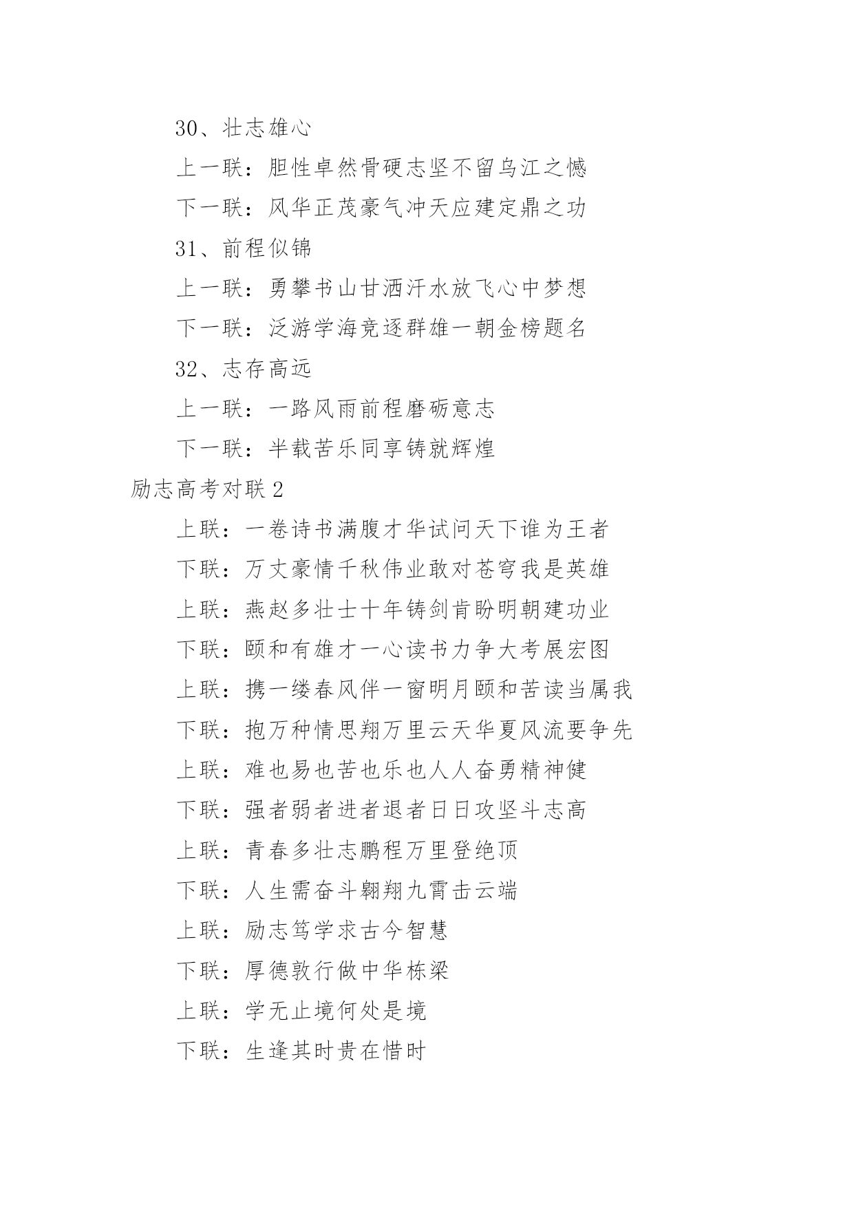 励志高考对联励志高考对联15篇在平平淡淡的.日常中,大家都知道一些经典的对联吧,对联在自身发展过程中,又吸收了古体诗、散文、词曲等的特点。那么如何把对联写出新花样呢?下面是小编为大家收集的励志高考对联,欢迎阅读与收藏。励志高考对联11、众志成城上一联:卧虎藏龙地豪气干云秣马砺兵锋芒尽露下一联:披星戴月时书香盈耳含英咀华学业必成2、砺志报亲上一联:拼十年寒窗挑灯苦读不畏难下一联:携双亲期盼背水勇战定夺魁3、笑书人生上一联:滴水穿石战高考如歌岁月应无悔下一联:乘风破浪展雄才折桂蟾宫当有时4、意气风发上一联:时光如梭看我少年学子六月追风去下一联:云帆直挂令那美丽人生明朝入眼来5、风华正茂上一联:冬去春来好景年年有下一联:辞旧迎新成绩步步高6、意气风发上一联:寒冬散尽喜迎元旦佳节下一联:春意盎然更看男儿发愤7、志存高远上一联:花开花落腊梅傲雪盼新春下一联:春去春来长风破浪迎高考8、金榜题名上一联:辞旧迎新寒风阵阵催人逝下一联:苦尽甘来捷报片片暖人心9、师生同心上一联:知天文通地理莘莘学子携手共进鱼跃龙门下一联:培栋梁育英才代代园丁含辛茹苦花香桃林10、功能技成上一联:庖丁解牛久练而技进乎道下一联:荀子劝学博学则青出于蓝11、路在脚下上一联:览前贤思己任铁杵磨针只求前程似锦下一联:念亲情感师恩悬梁刺股但愿无愧我心12、唯有努力上一联:向名校进军百炼成钢唱出青春无悔下一联:圆人生梦想半载奋斗笑吟三年等待13、一马当先上一联:各界精英大展宏图夺英魁下一联:莘莘学子汇聚一堂学本领14、力争上游上一联:龙腾虎跃朝气蓬勃下一联:你追我赶誓夺第一15、壮志凌云上一联:良辰美景惜时如金敢与金鸡争晨晖下一联:书山学海甘之若饴誓同峨眉共比高16、师生同禧上一联:送祝福不忘感谢恩师下一联:庆元旦牢记备战高考17、笑傲高三上一联:感亲恩实高三年滴水穿石永不言弃下一联:报师情火热六月蟾宫折桂志在必得18、苦尽甘来上一联:十年寒窗苦读效三皇五帝逐群雄下一联:一朝金榜题名成八斗奇才傲天下19、师生同喜上一联:舞风翔鸾旌歌闹处处迎新下一联:披星戴月紫竹宁岁岁登高20、勇登书山上一联:点点心血勤育英才厚泽九州下一联:滴滴汗水勇赴学海逐鹿中原21、我本英雄上一联:闻鸡起舞成就拼搏劲旅师下一联:天道酬勤再现辉煌王者风22、舍我其谁上一联:群雄逐鹿鹿死谁手尚待一朝试锋芒下一联:万木争春春在何处但将今夕放眼量23、天南海北上一联:十年苦读一朝决胜负换来笑逐颜开下一联:数载艰辛六月定乾坤赢得似锦前程24、奋发图强上一联:自强不息怀壮志以长行下一联:厚德载物携梦想而抚凌25、向名校进军上一联:送报晓金鸡看今年硕果飘香迎佳绩下一联:迎吉祥犬吠待明朝笑傲高考创辉煌26、乐在其中上一联:梅花香自苦寒来下一联:熬头喜在汗水中27、备战高考上一联:六十同窗同甘共苦拼搏从此时下一联:十二春秋风雨兼程成败在今年28、美梦成真上一联:怀揣大学美梦迎接新年号角下一联:彰显青春活力挥洒苦涩汗水29、自强不息上一联:辞乙酉难忘闻鸡起舞下一联:迎丙戌仍需刺股悬梁30、壮志雄心上一联:胆性卓然骨硬志坚不留乌江之憾下一联:风华正茂豪气冲天应建定鼎之功31、前程似锦上一联:勇攀书山甘洒汗水放飞心中梦想下一联:泛游学海竞逐群雄一朝金榜题名32、志存高远上一联:一路风雨前程磨砺意志下一联:半载苦乐同享铸就辉煌励志高考对联2上联:一卷诗书满腹才华试问天下谁为王者下联:万丈豪情千秋伟业敢对苍穹我是英雄上联:燕赵多壮士十年铸剑肯盼明朝建功业下联:颐和有雄才一心读书力争大考展宏图上联:携一缕春风伴一窗明月颐和苦读当属我下联:抱万种情思翔万里云天华夏风流要争先上联:难也易也苦也乐也人人奋勇精神健下联:强者弱者进者退者日日攻坚斗志高上联:青春多壮志鹏程万里登绝顶下联:人生需奋斗翱翔九霄击云端上联:励志笃学求古今智慧下联:厚德敦行做中华栋梁上联:学无止境何处是境下联:生逢其时贵在惜时上联:卧薪尝胆风华岁月添壮笔下联:披荆斩棘艰苦历程着华章上联:意志为犁耕耘知识沃土下联:美德似水润泽你我心田上联:物华天宝看此处钟灵毓秀下联:人杰地灵是我等卧虎藏龙上联:春秋冬夏勤学苦练看谁人蟾宫折桂下联:德智体美博学多才有我辈九天摘星上联:为自我为将来谁言辛苦下联:比学业比收获莫做逃兵上联:世纪风时代潮敢担重任下联:师生情父母意学会感恩上联:求学不惧风霜雨雪下联:报国还须诚信忠良(.)上联:登极峰做强者挥洒青春热血下联:藐沧海磨利剑再创颐和辉煌励志高考对联3上联:知天文通地理莘莘学子携手共进鱼跃龙门下联:培栋梁育英才代代园丁含辛茹苦花香桃林横批:师生同心上联:吃得苦中苦下联:方为人上人。上联:求做到:暖春,炎夏,清秋,寒冬,四季季季悬梁锥刺股下联:只愿得:语文,数学,英语,理综,各科科科金榜高题名上联:拼十年寒窗挑灯苦读不畏难下联:携双亲期盼