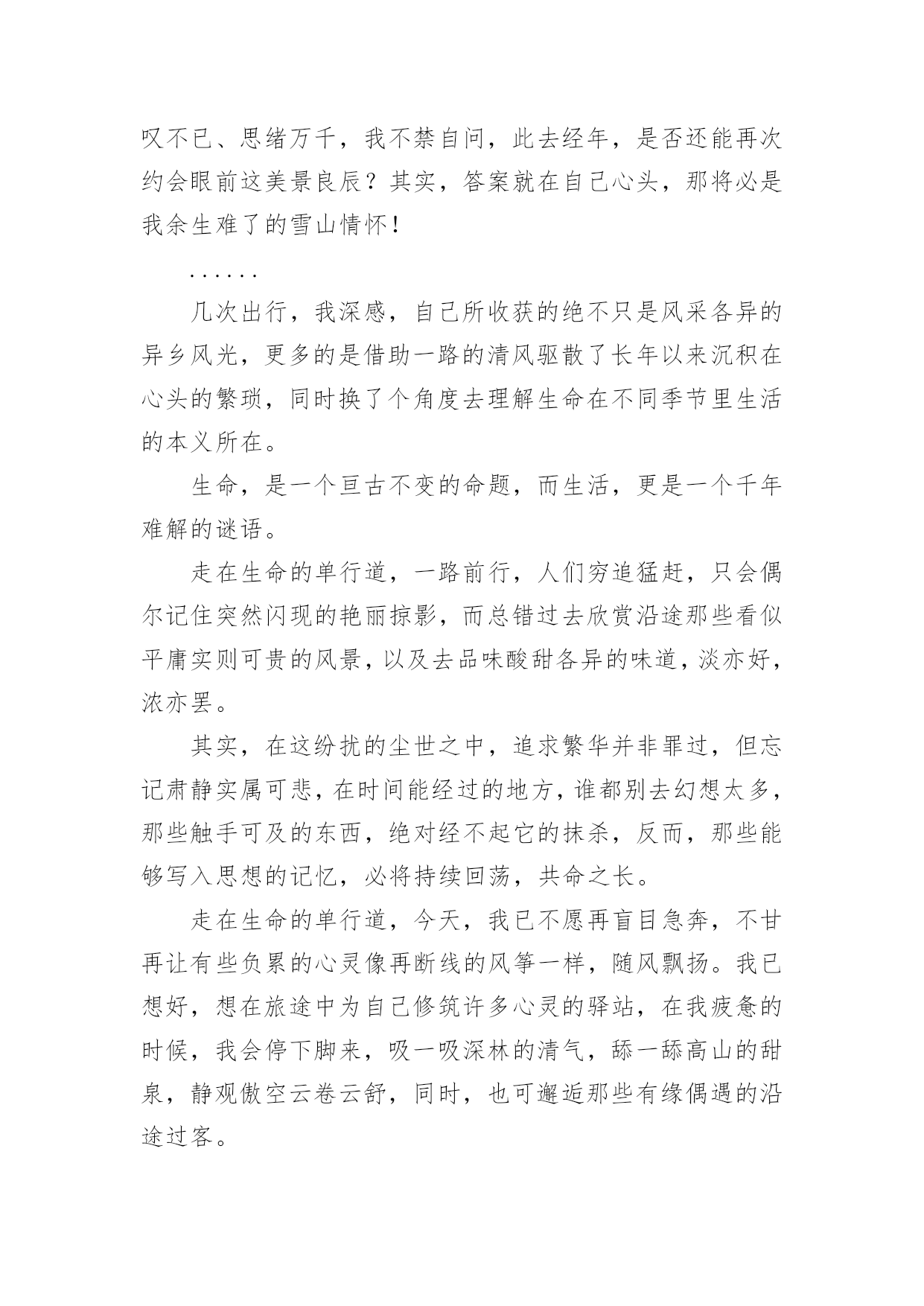 浅谈旅游的优美散文浅谈旅游的优美散文当岁月的年轮在额头轻轻划下几道印痕,当写满无数青春记忆的照片已渐渐发黄,不惑的时光也随之悄然而至,无法回避,也不可抗拒,宛如是岁月和生命的约定,约定在某个特殊的季节里交融,去萌生生活的另一种选择。自那开始,总觉得没有那么多快意,当然,也谈不上失意,喜欢在鸟语花香的闲庭里轻脚慢步,不再总是揣着一颗紧张及惶恐的心急速前行;不愿再屏蔽在狭小的空间里来回奔跑,而是逐渐爱上旅游,爱上带着飘逸的心轻装上阵,在不同的时间里去感受各异的他乡风情。对,旅游。爱上它其实也不需要讲出太多的缘由,只想在烦杂不安的时候去放飞心情,在忐忑飘忽的时候去沉淀思绪,去寻找心灵的某种寄托。心灵的寄托,有时就需从陌生的地方去寻找。于是,在一个性情极度懒散的老友陪伴下,我开启了心灵的旅程。先是领略到最具现代都市气息的上海,继而又感受了有“东方夏威夷”之美称的'热带滨海城市三亚和桂林那得天独厚的自然景观,当然,印象最深的还是这次,在玉龙雪山,终于目睹雪域高原的壮景,现场时而云带束腰,时而碧空万里,心境顿时豁然开朗,在雪峰和卷云碰撞的那一瞬间,能深切地体会到李娜长喉中远古呼唤的声音和千年祈盼的奇观,那漫天飞舞的飘雪和气势磅礴的冰川无不令人感叹不已、思绪万千,我不禁自问,此去经年,是否还能再次约会眼前这美景良辰?其实,答案就在自己心头,那将必是我余生难了的雪山情怀!......几次出行,我深感,自己所收获的绝不只是风采各异的异乡风光,更多的是借助一路的清风驱散了长年以来沉积在心头的繁琐,同时换了个角度去理解生命在不同季节里生活的本义所在。生命,是一个亘古不变的命题,而生活,更是一个千年难解的谜语。走在生命的单行道,一路前行,人们穷追猛赶,只会偶尔记住突然闪现的艳丽掠影,而总错过去欣赏沿途那些看似平庸实则可贵的风景,以及去品味酸甜各异的味道,淡亦好,浓亦罢。其实,在这纷扰的尘世之中,追求繁华并非罪过,但忘记肃静实属可悲,在时间能经过的地方,谁都别去幻想太多,那些触手可及的东西,绝对经不起它的抹杀,反而,那些能够写入思想的记忆,必将持续回荡,共命之长。走在生命的单行道,今天,我已不愿再盲目急奔,不甘再让有些负累的心灵像再断线的风筝一样,随风飘扬。我已想好,想在旅途中为自己修筑许多心灵的驿站,在我疲惫的时候,我会停下脚来,吸一吸深林的清气,舔一舔高山的甜泉,静观傲空云卷云舒,同时,也可邂逅那些有缘偶遇的沿途过客。